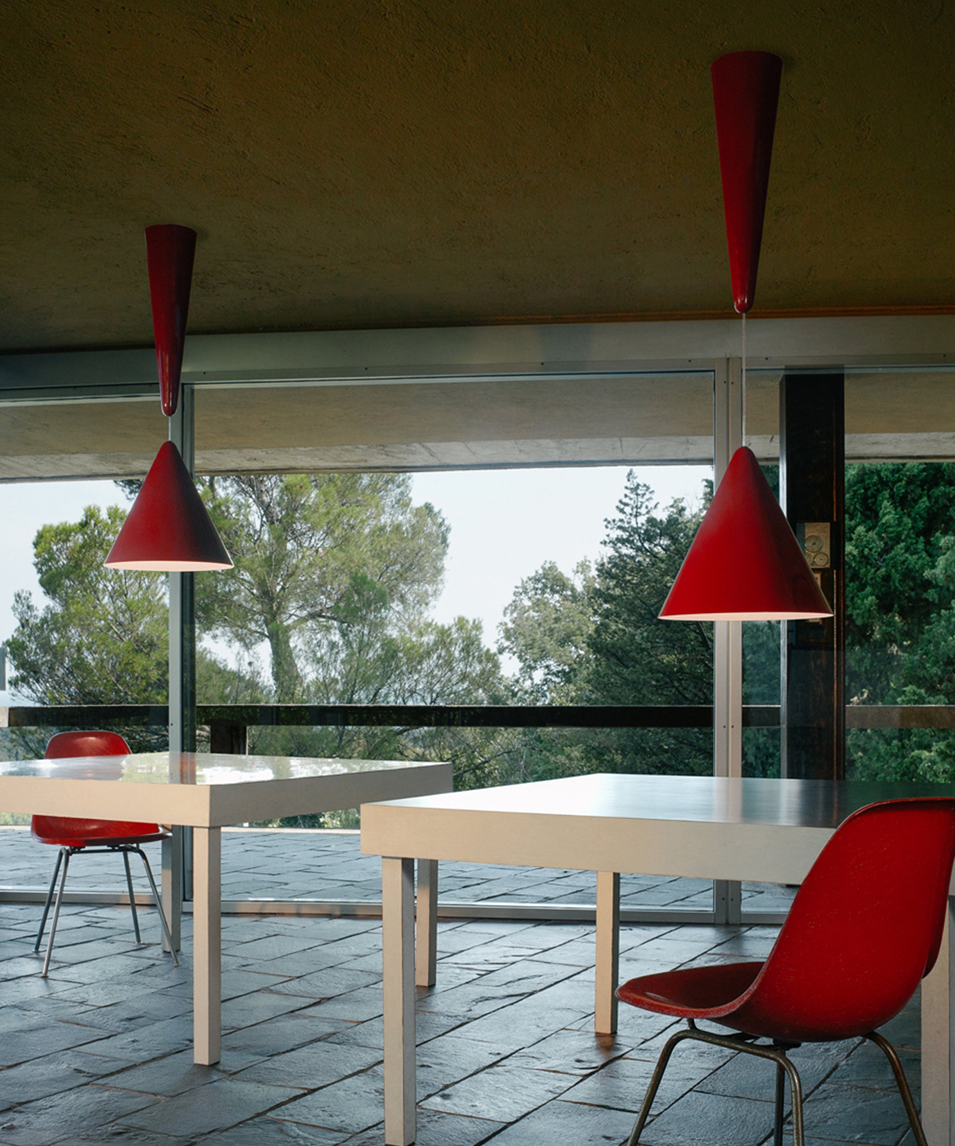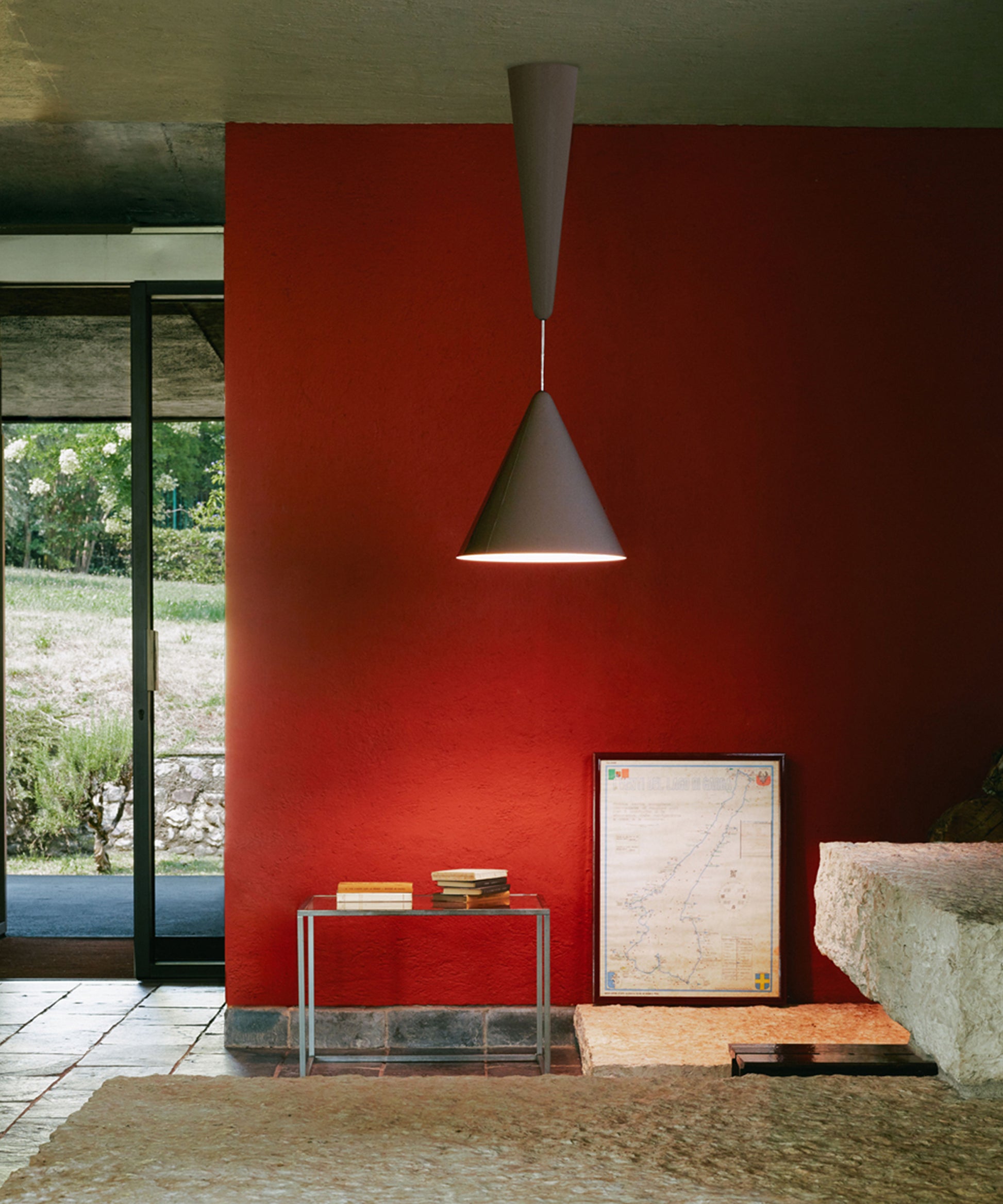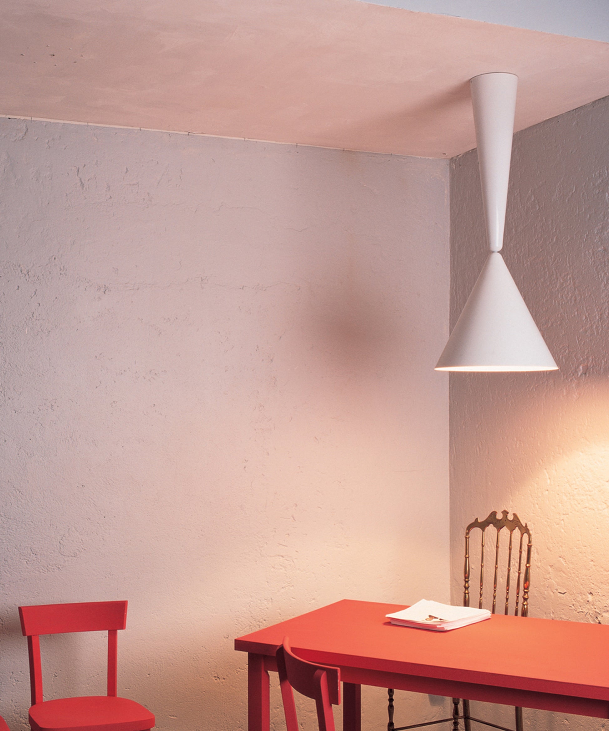 The re-edition design is made of aluminum with external paint in 3 finish options: shiny white, beaver brown, and cherry red, while the inside of the diffuser is a glossy white finish. The diffuser may be adjustable vertically using its cable reel within the ceiling canopy. Behind the Design: Much like the game that inspired its name, Achille imagined a light that could move up and down via a pulley system, so that the user could adjust its height to their preference by extending or shortening the distance between the two cones. "A hanging lamp composed of two cones – one contains the light source; the other fixed to the ceiling, conceals a spool mechanism." - Giovanna Castiglioni