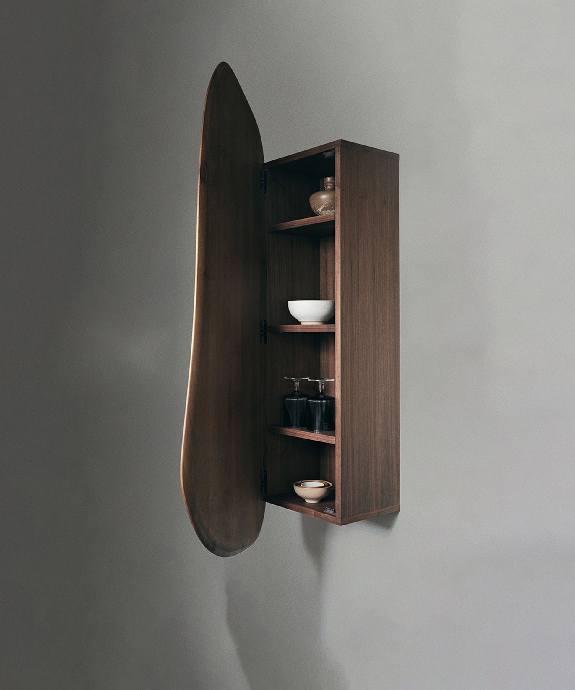 As a reference to the distinctive shape of the cabinet door, which appears to be floating when hung on the wall, the Feve Wall Cabinet gets its name from the French word for the bean. The slim, decorative cabinet presents an ideal storage solution for precious treasures and can be used throughout the home, from storing jewelry in the bedroom to glasses or small bowls in the dining room.