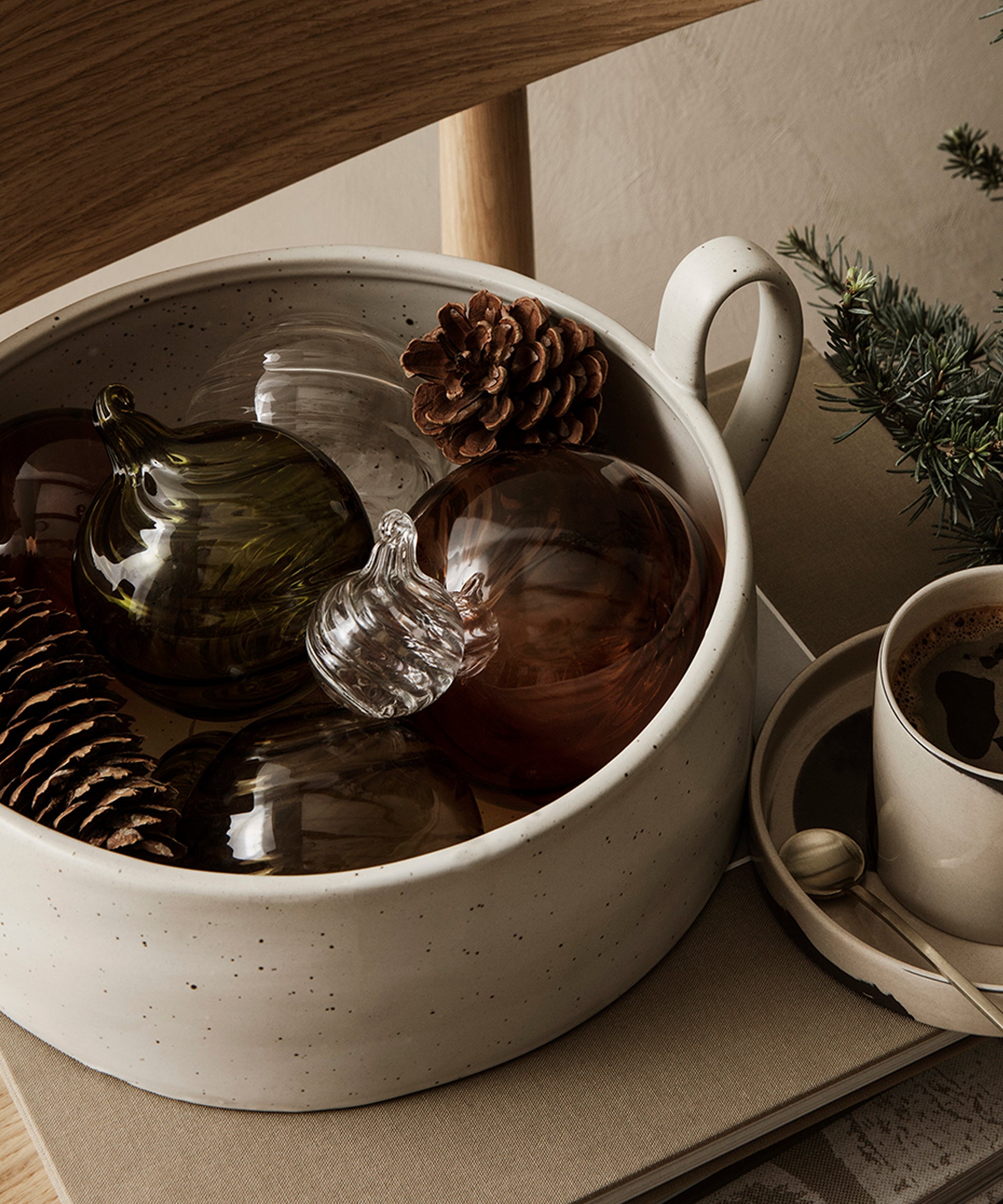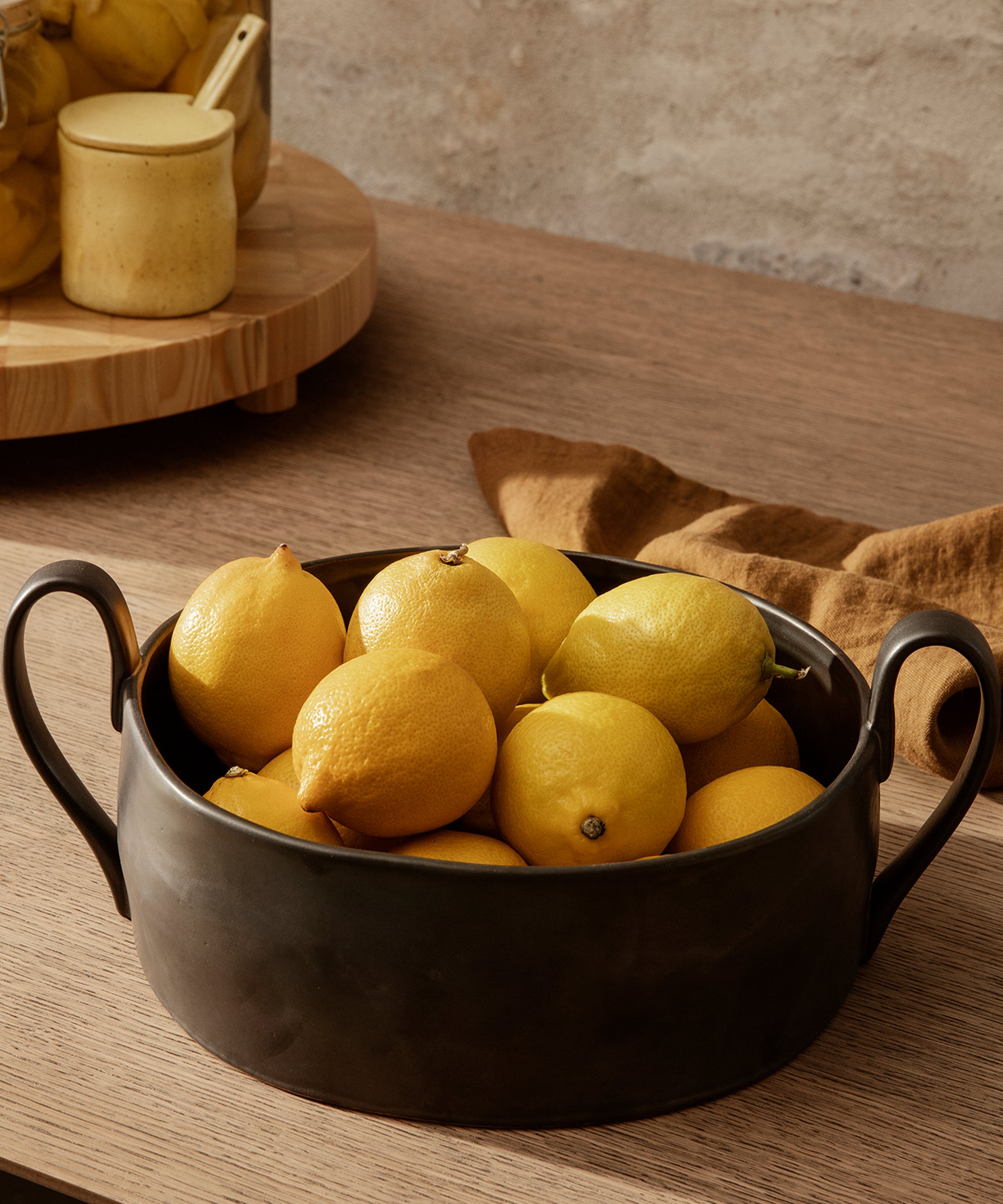 All the items are detailed with a semi-matte glaze for a unique expression. The simple, clean lines of this large bowl are offset with two distinctive elongated handles that are sure to make this the central piece of any table setting.Produced by the Copenhagen-based studio Ferm Living.