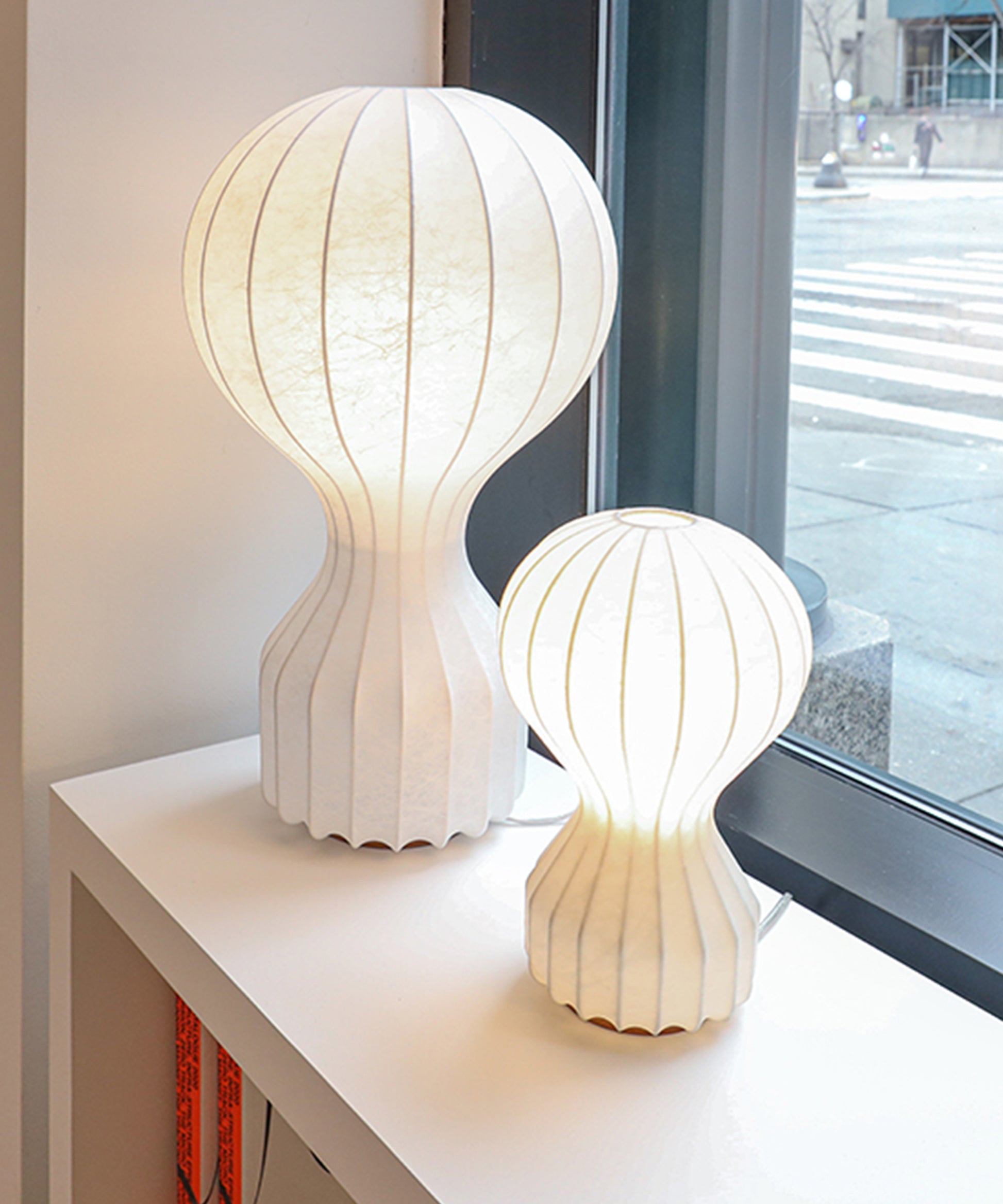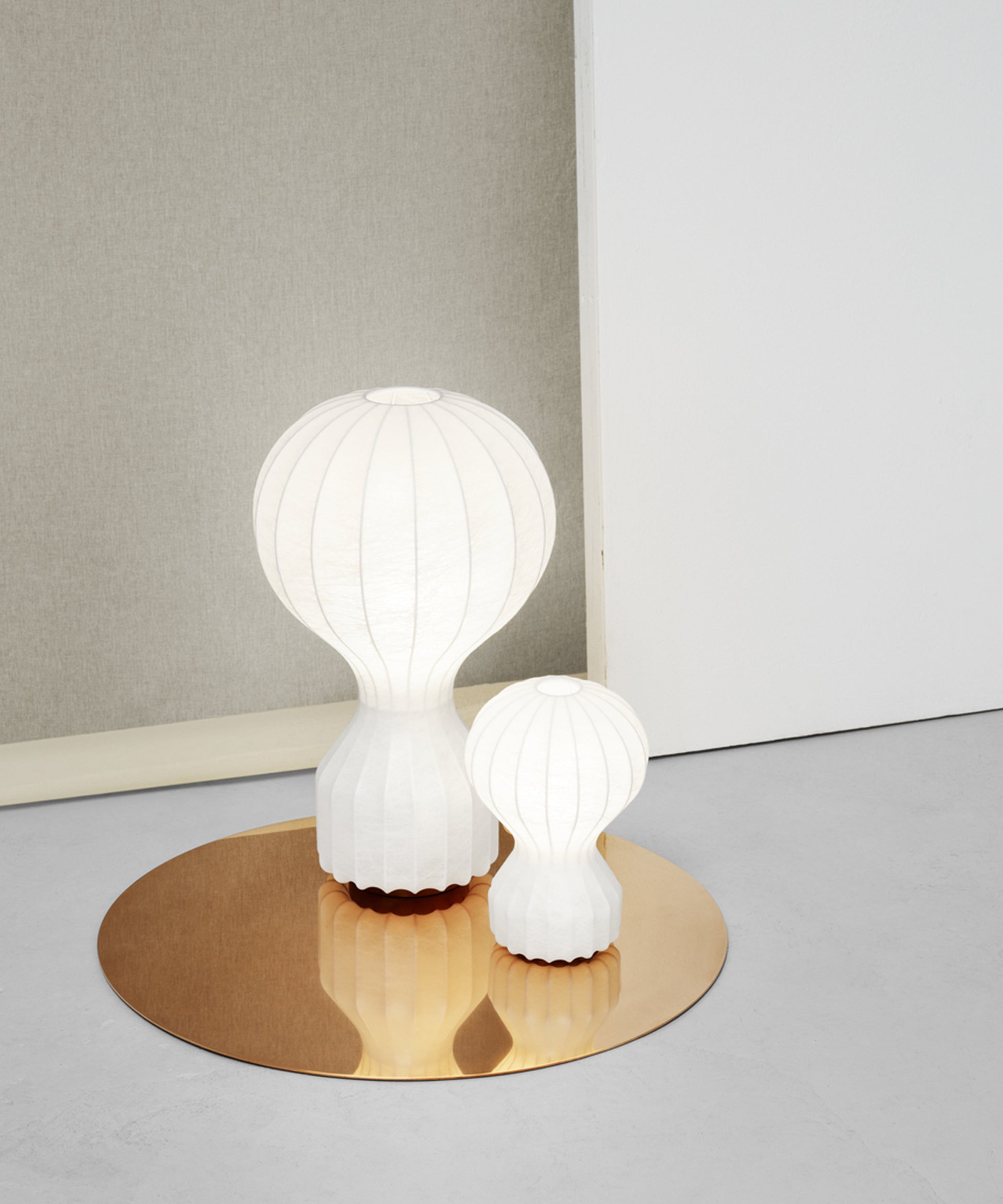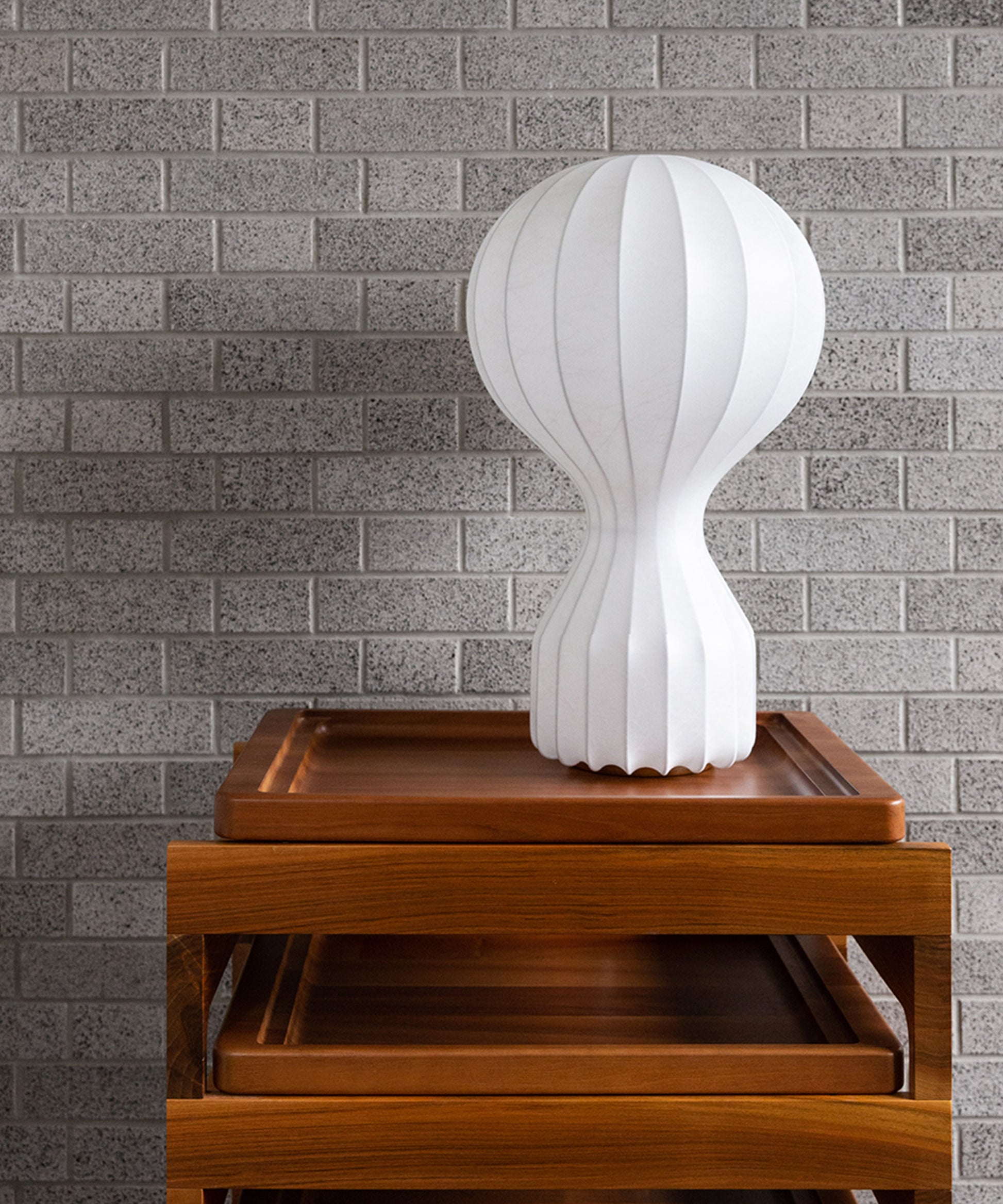 Named after "cat," Gatto is a Castiglioni brother 1960 cocoon creation that sits softly on any table, offering a glowing diffused light.
