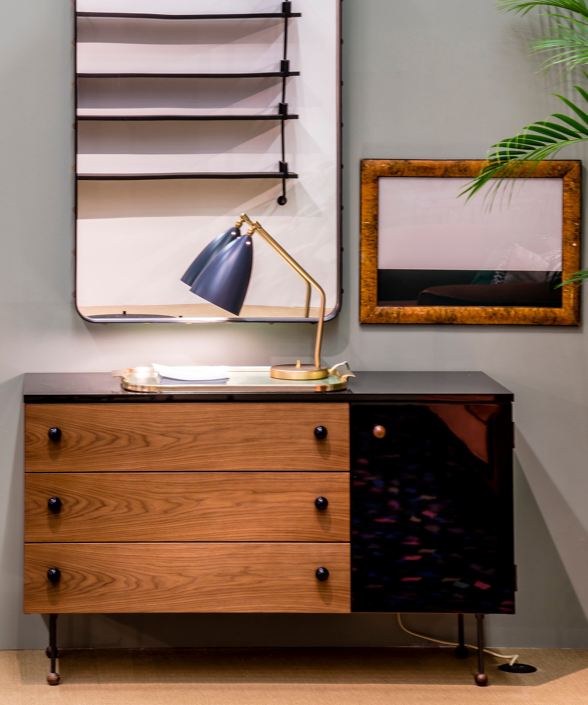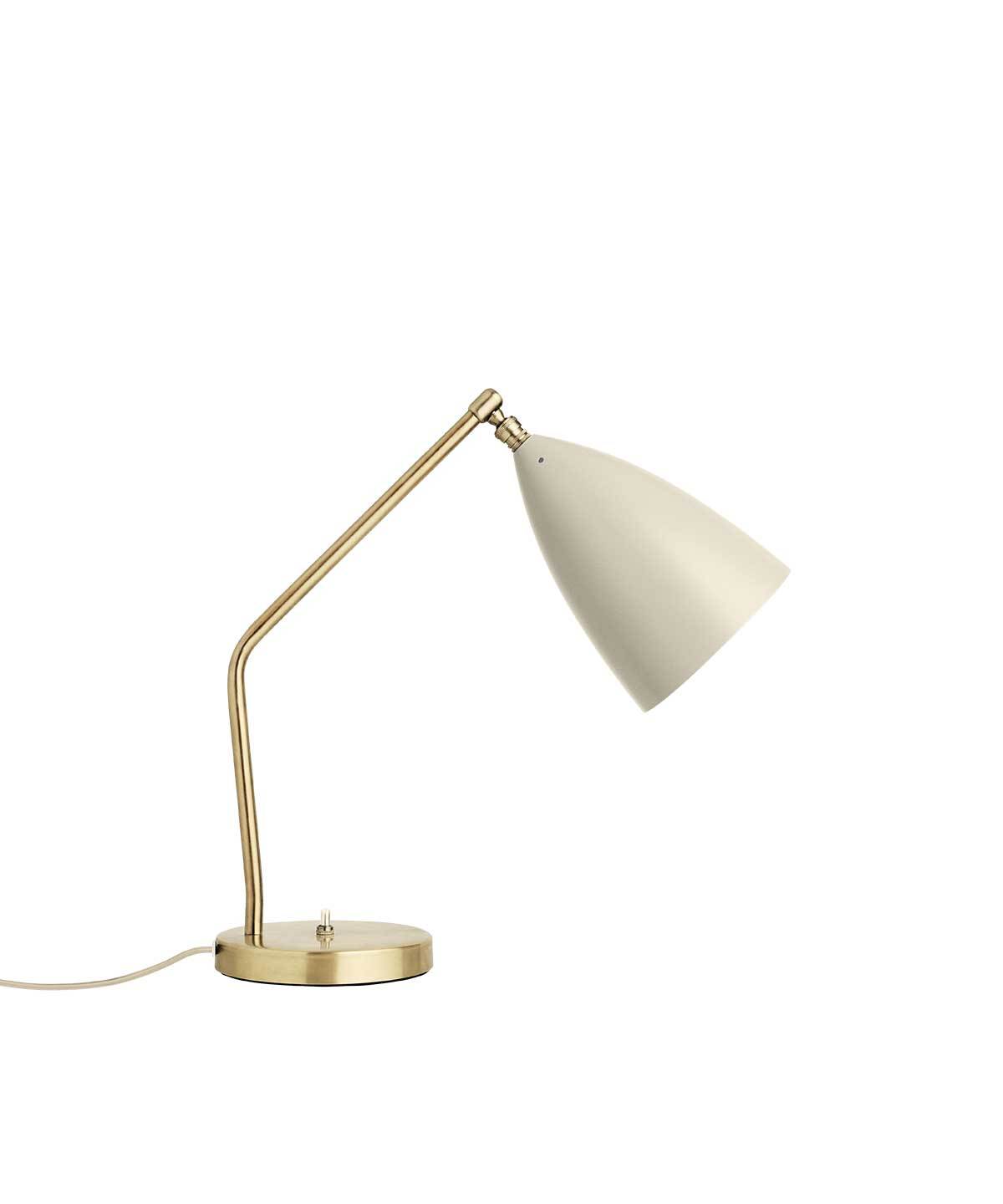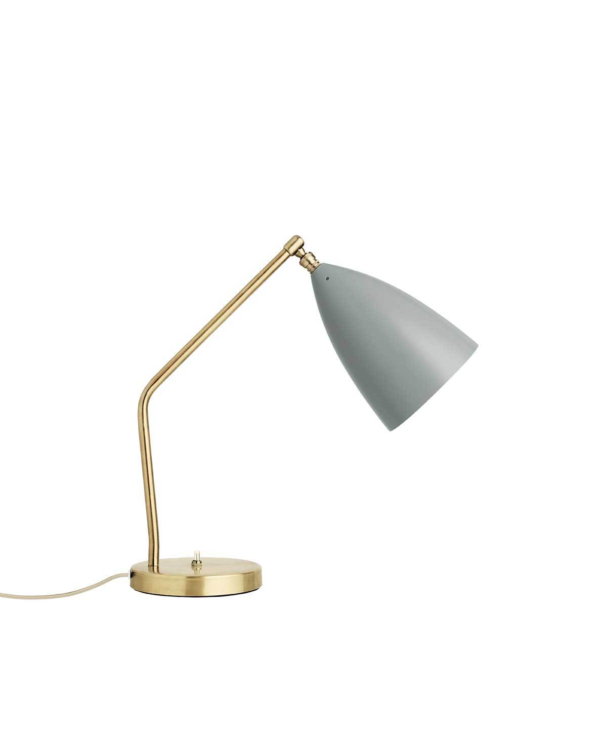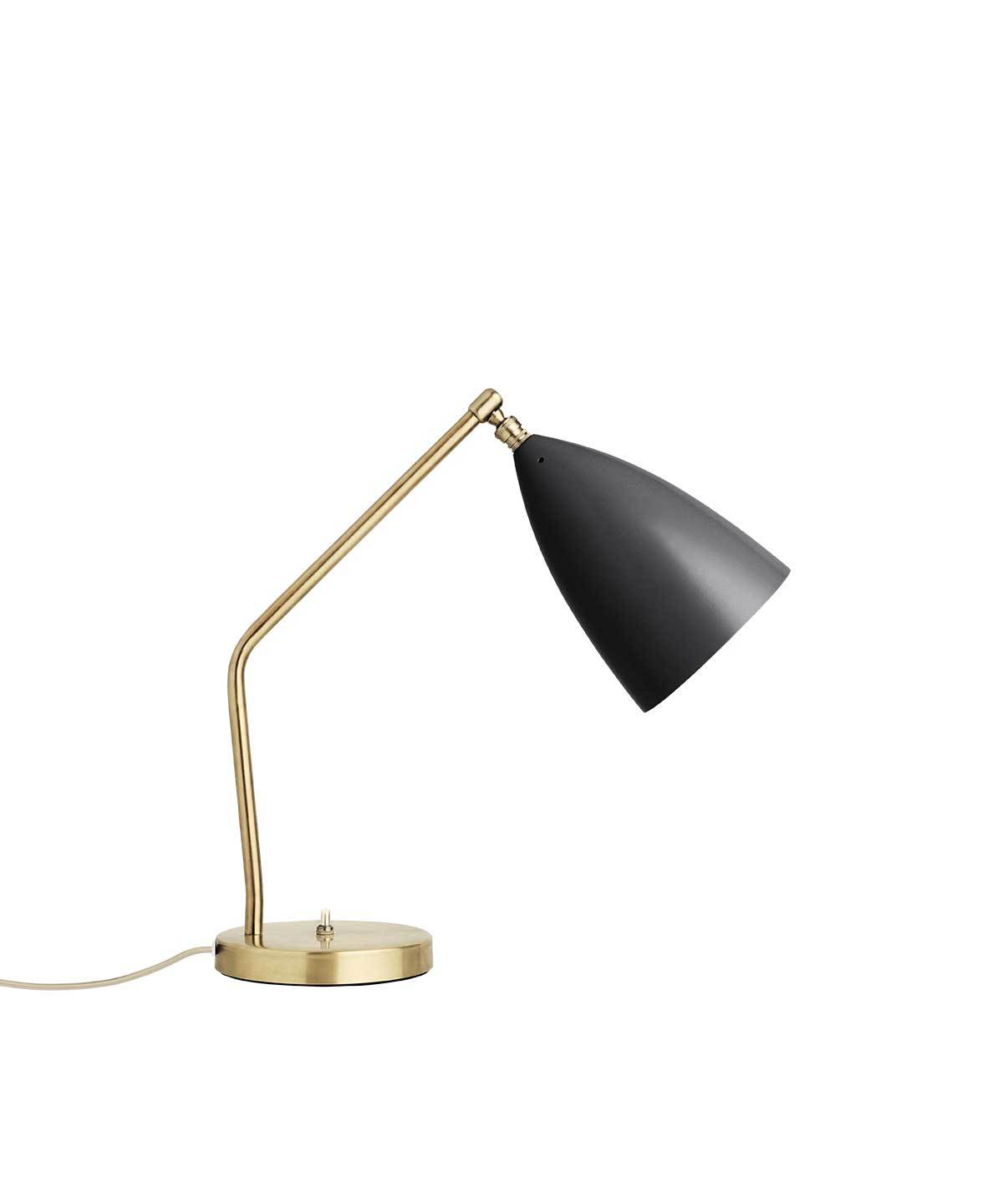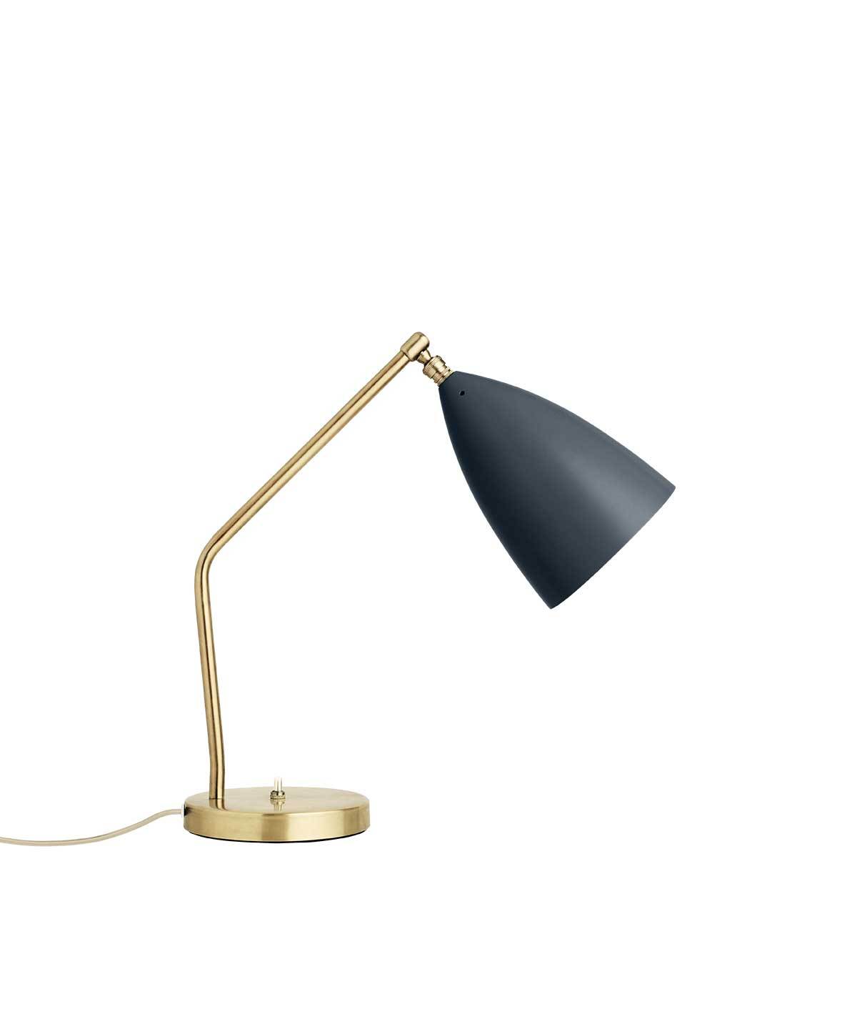 Inspired by the elegance of its namesake, the Grasshopper lamp is Greta Grossman's most celebrated design. The angled brass base makes this a perfect task lamp for a desk or workspace. The lamp_s powder-coated steel shade is elongated, and can be adjusted to change the direction of light as needed. On/off switch located on lamp base.