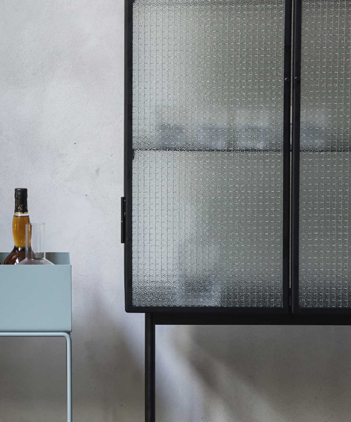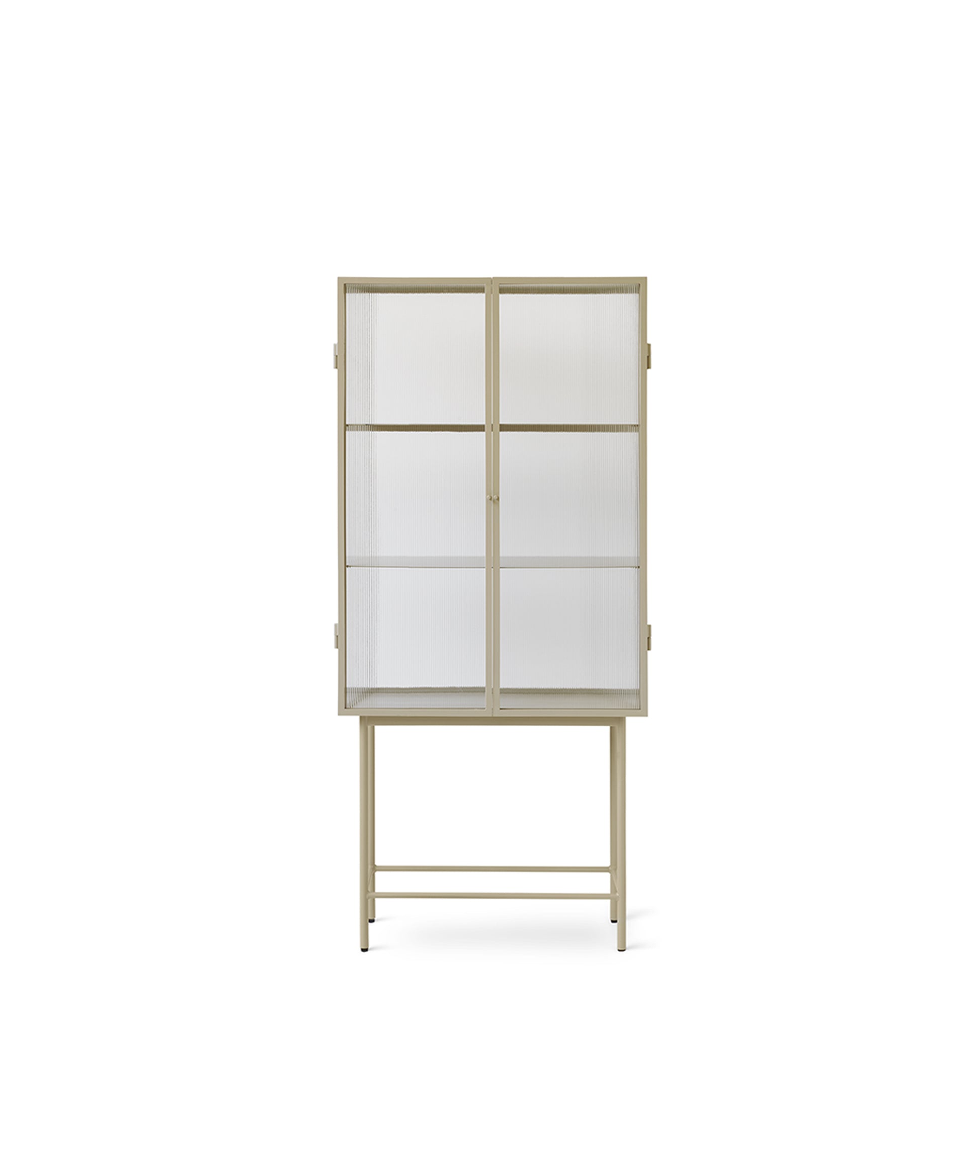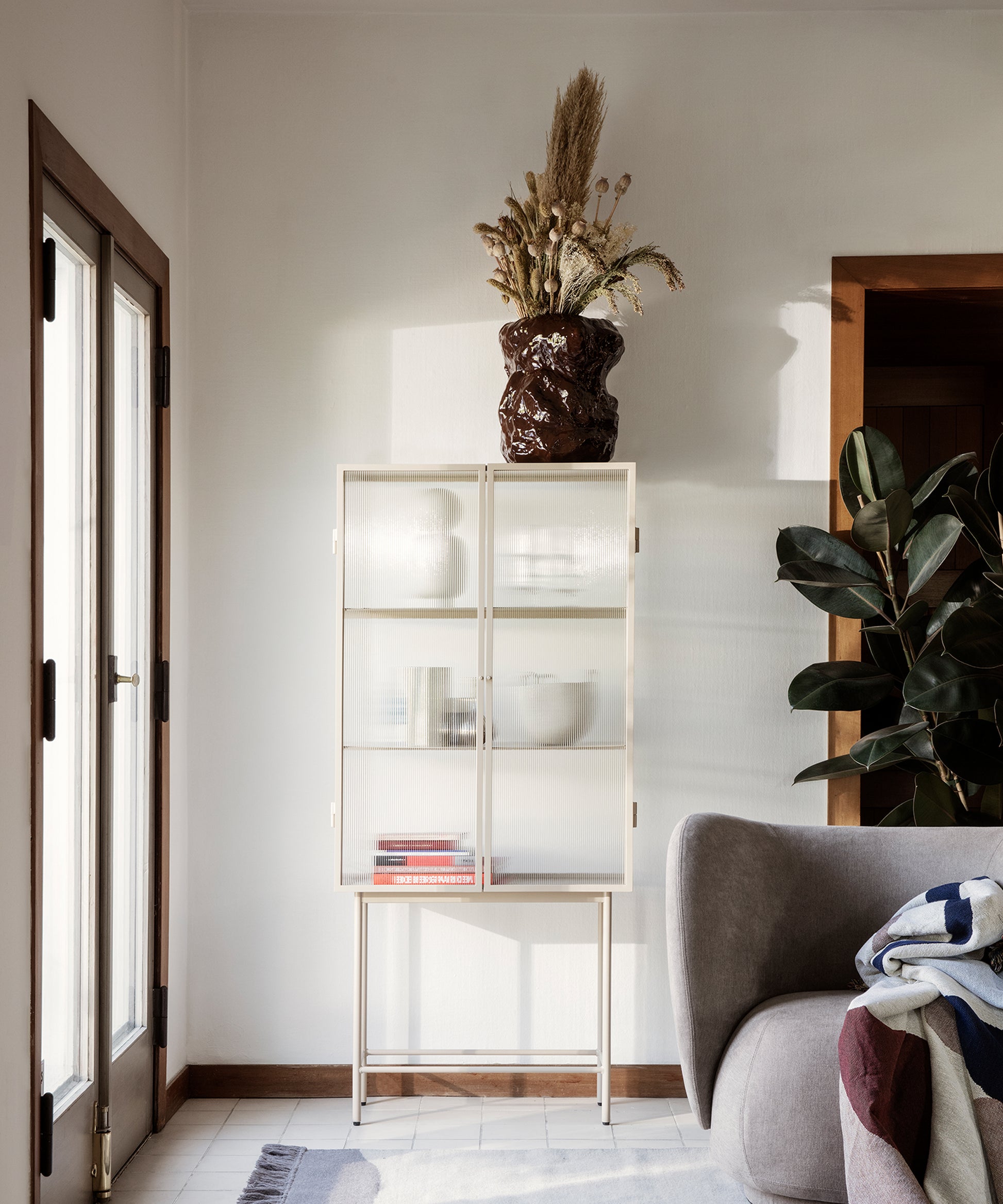 Perfect for the bathroom, living room, or dining room, the Haze Vitrine's glass doors close seamlessly and quietly thanks to magnets, and open to reveal powder-coated metal shelves.