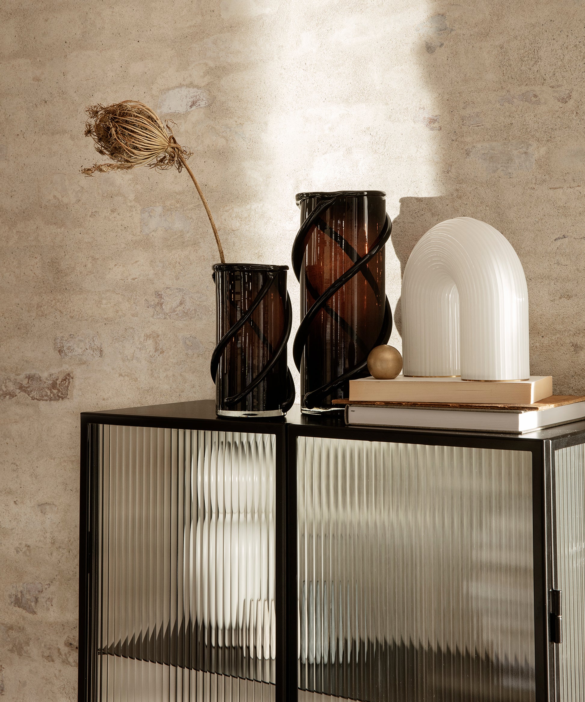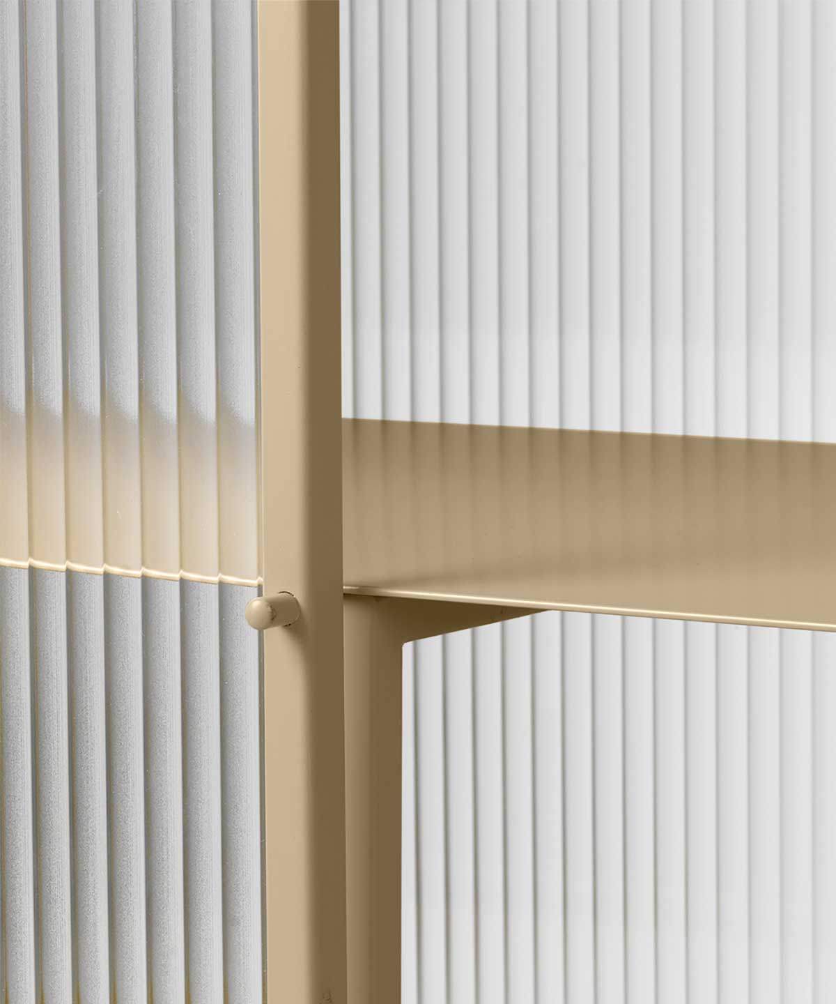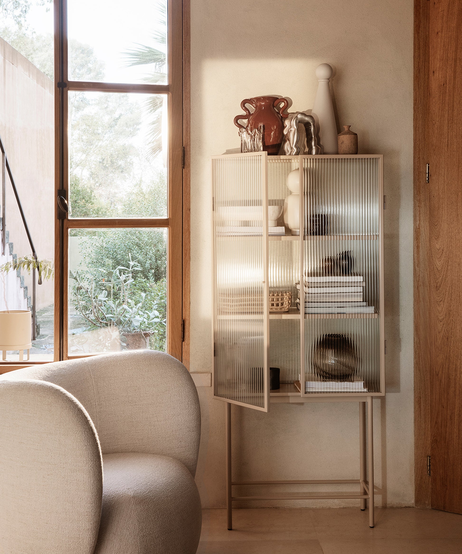 Perfect for the bathroom, living room, or dining room, the Haze Vitrine's glass doors close seamlessly and quietly thanks to magnets, and open to reveal powder-coated metal shelves.