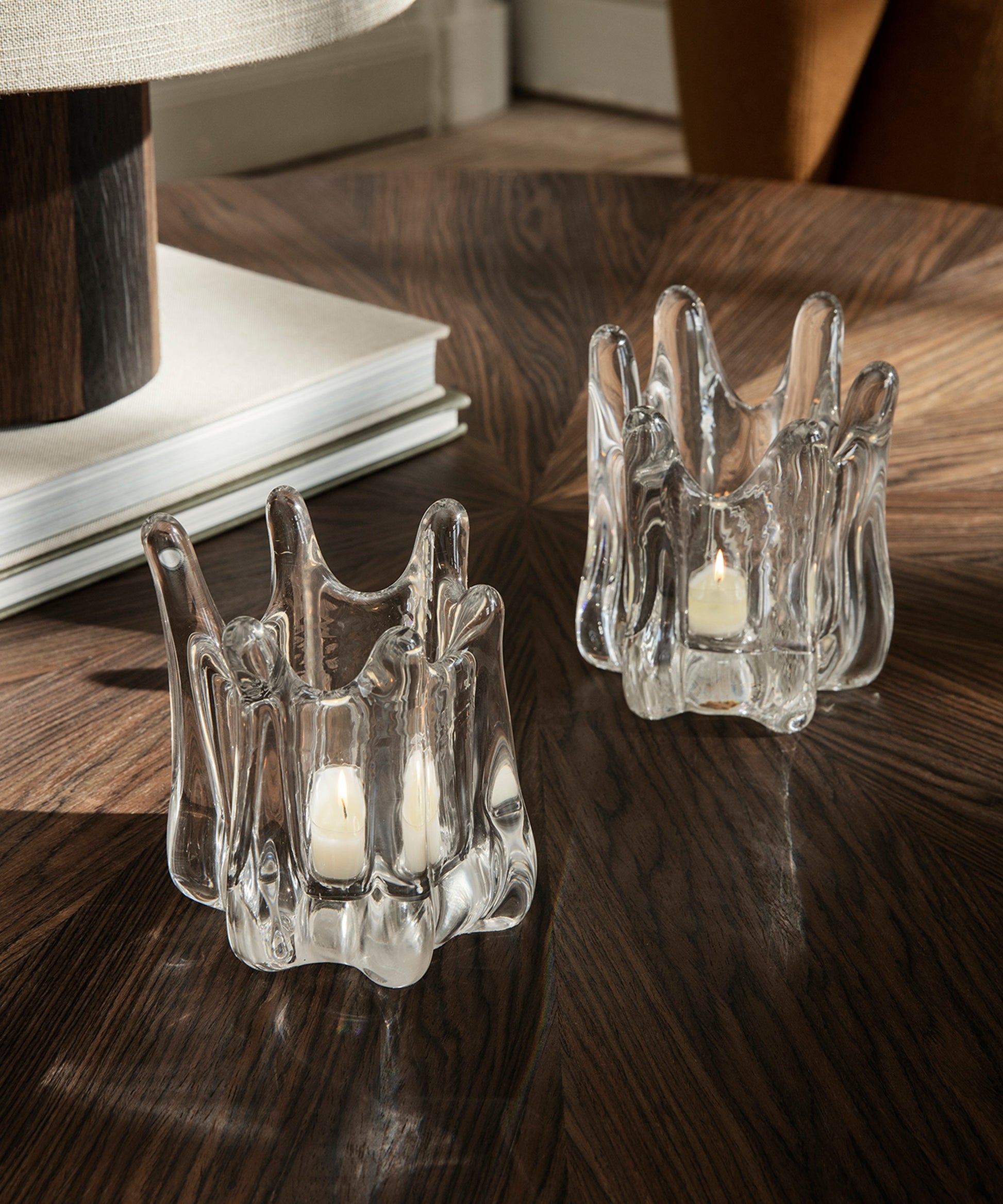 Mouthblown from solid glass, the Holo Tealight Candle Holder has a fluid, organic form that has been sculpted by human hands, stretching and shaping the elevated spires during the melting process and ensuring that each individual piece is unique. Fits a standard tea light candle.