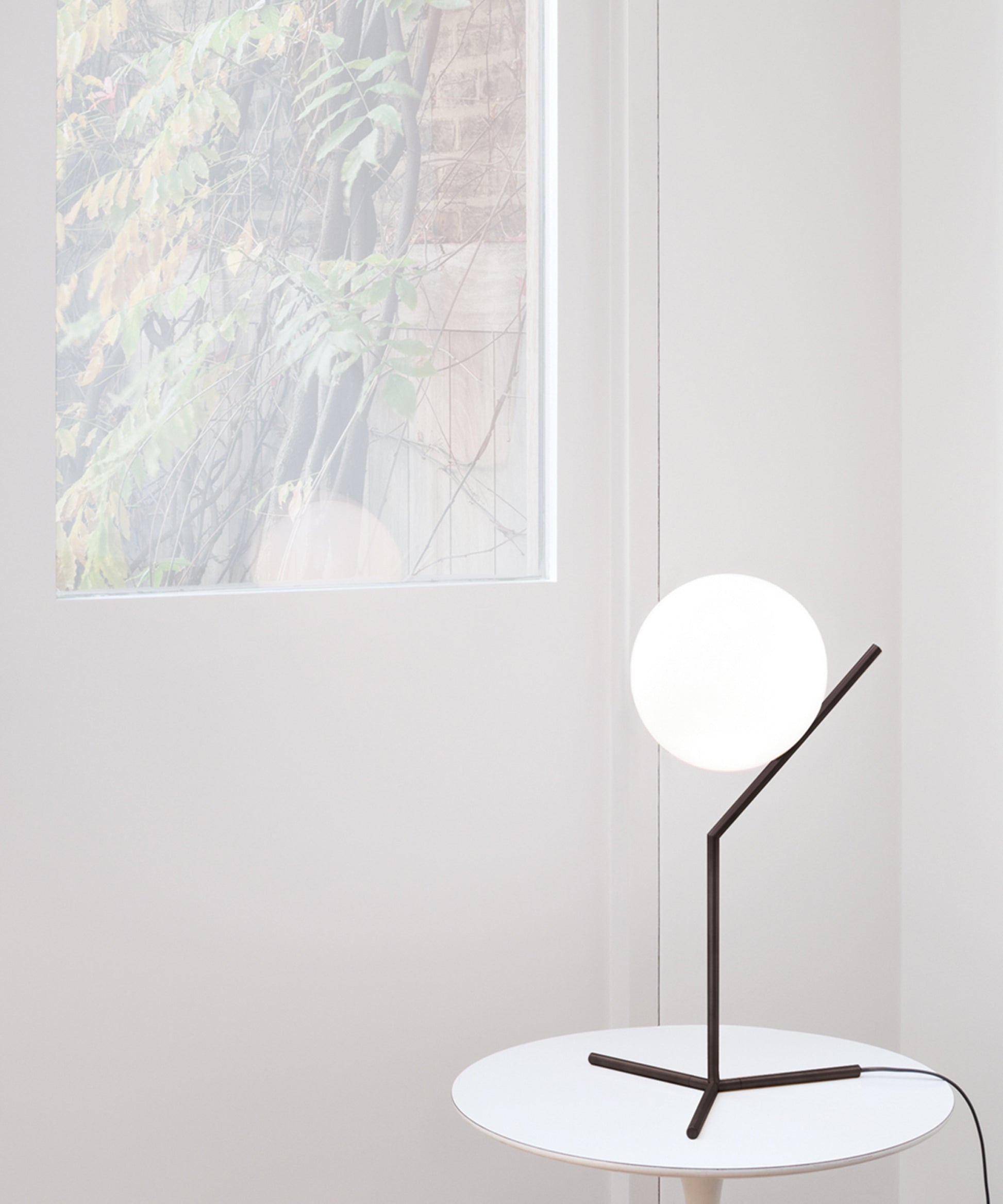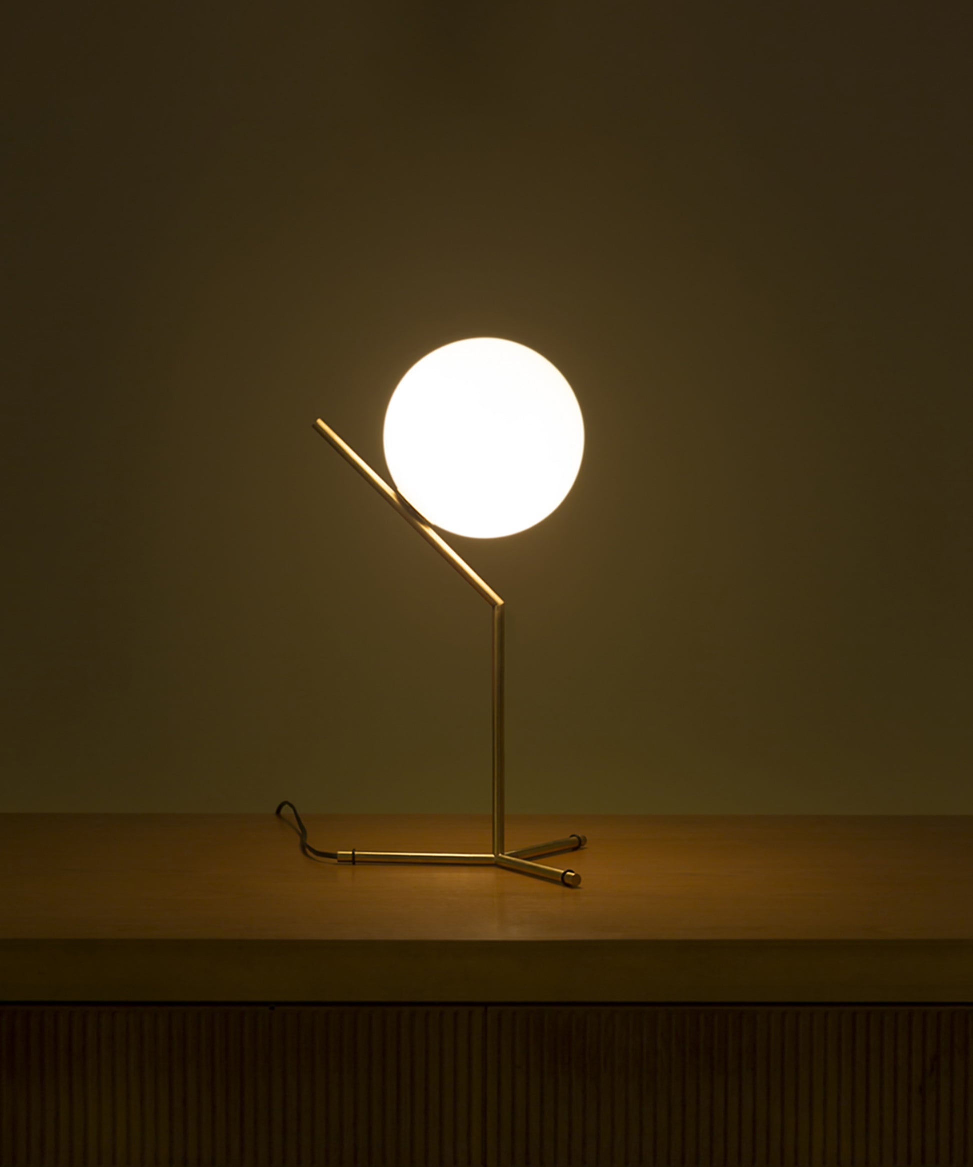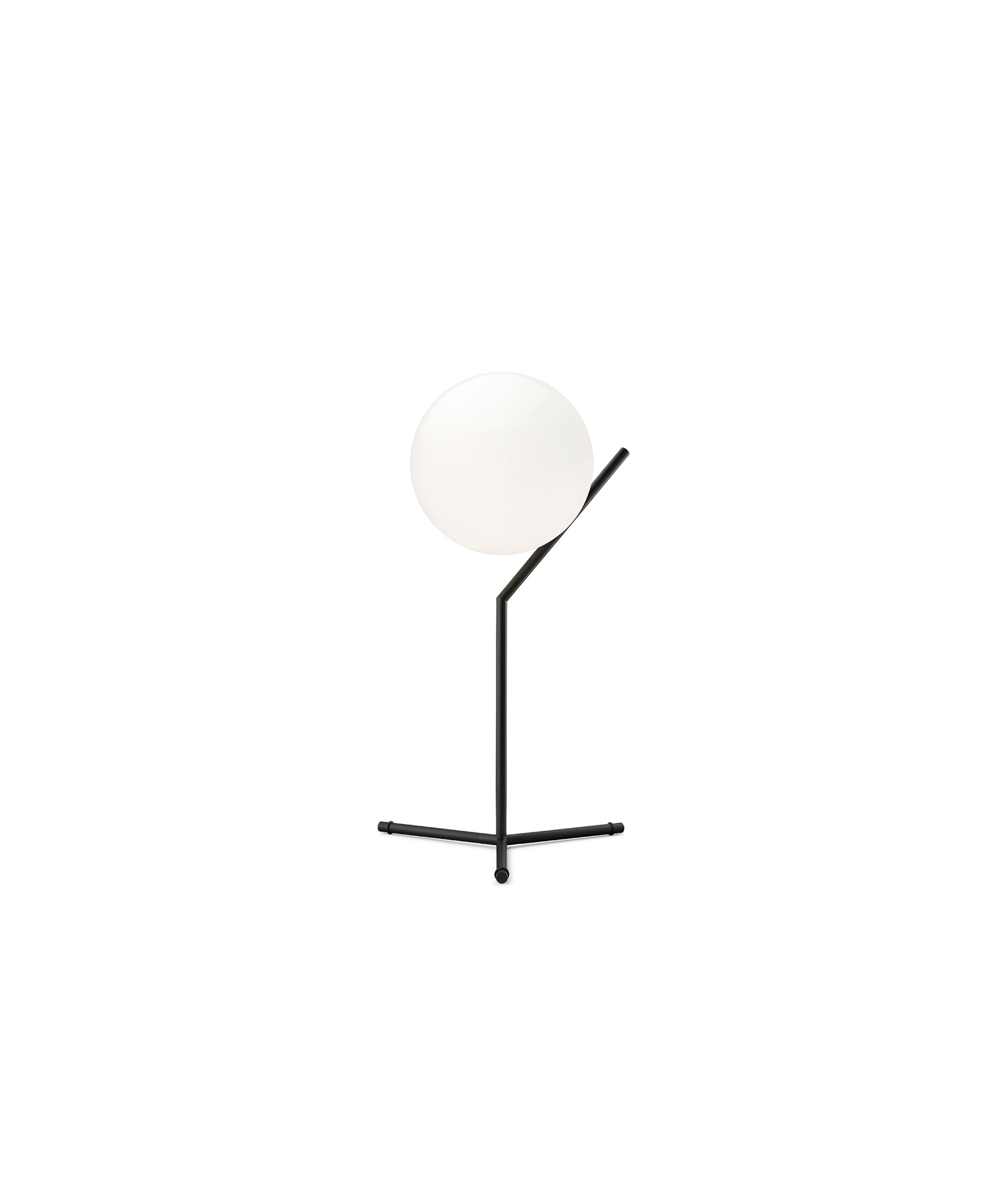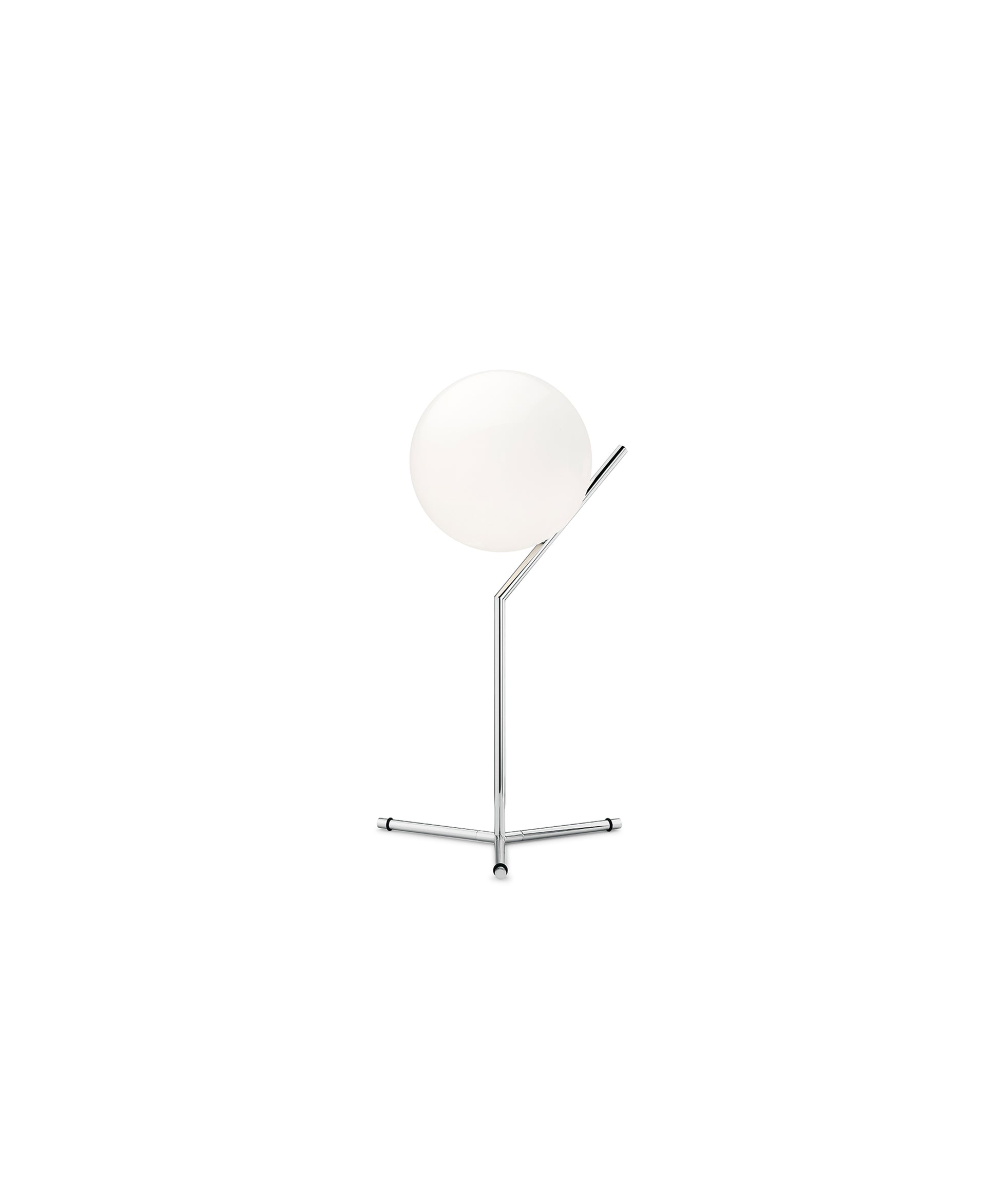 It provides diffused light through a mouth-blown opaline sphere, which is held up by a brass-plated steel frame. There is a dimmer on the power cord. IC Lights table lamp comes in three models in black, brass, or chrome finish:- IC Lights T1 High: height 20.8"; base width 12.6"- IC Lights T1 Low: height 15"; base width 6.9"- IC Lights T2: height 13.7"; base width 11" Discover the complete IC Lights collection here. The inspiration behind the design: Poise is powerful: That's the message Michael Anastassiades offers with his IC Light Series. From the skillful balance of the sphere and baton that invokes thoughts of a dexterous juggler's act to the lamp's name-IC, a reference to the identity code used to evaluate immigrants entering the UK-the designer makes a commanding statement.