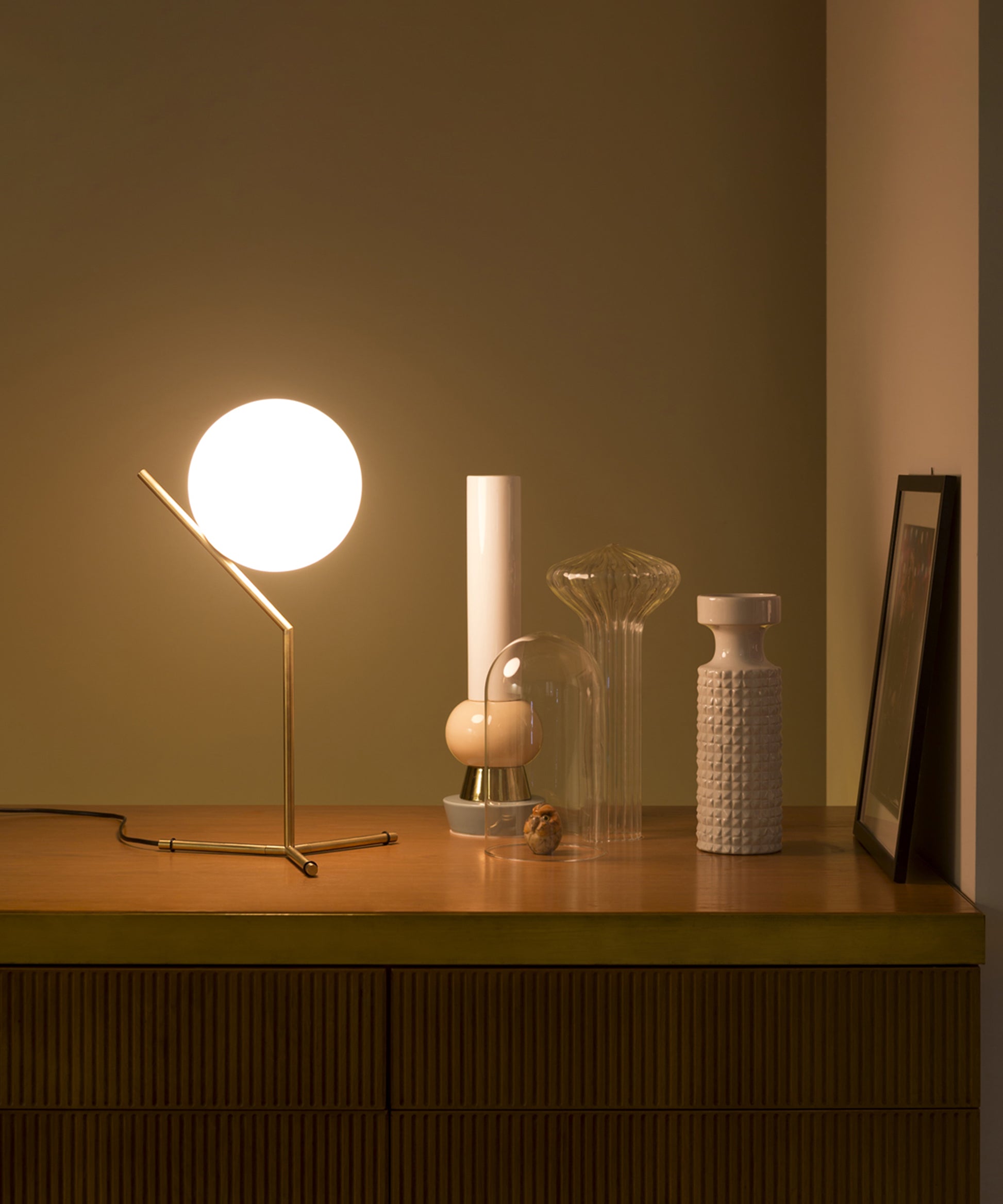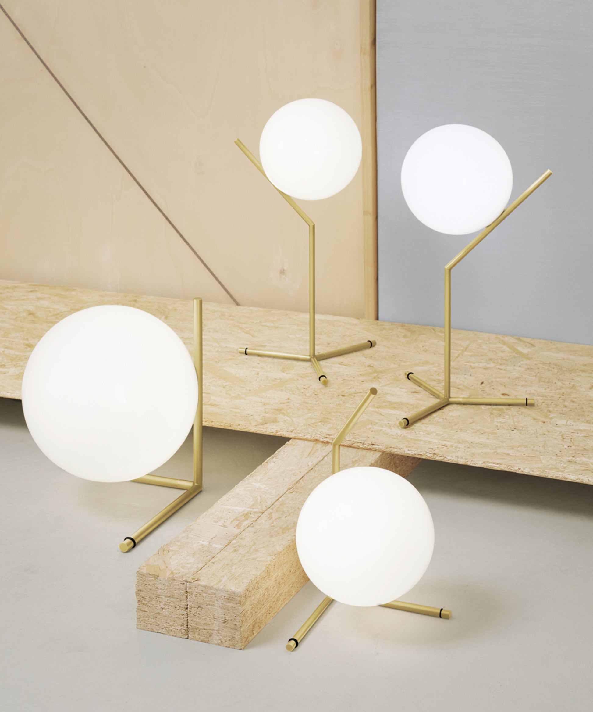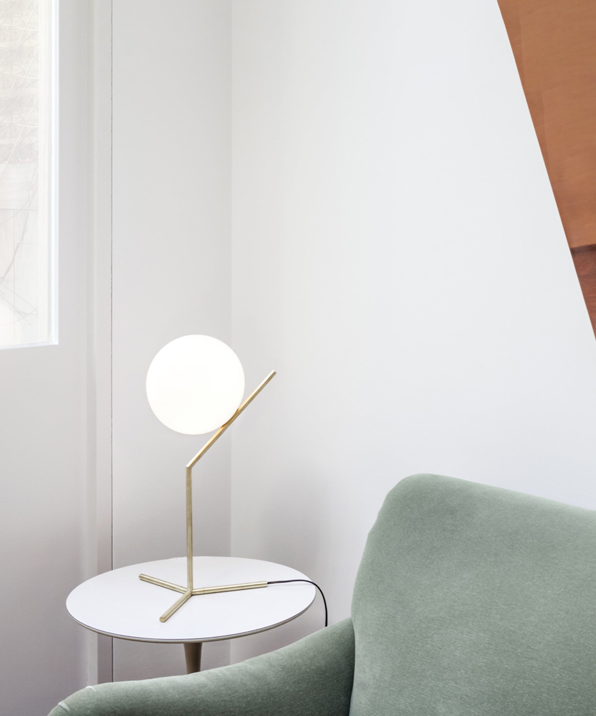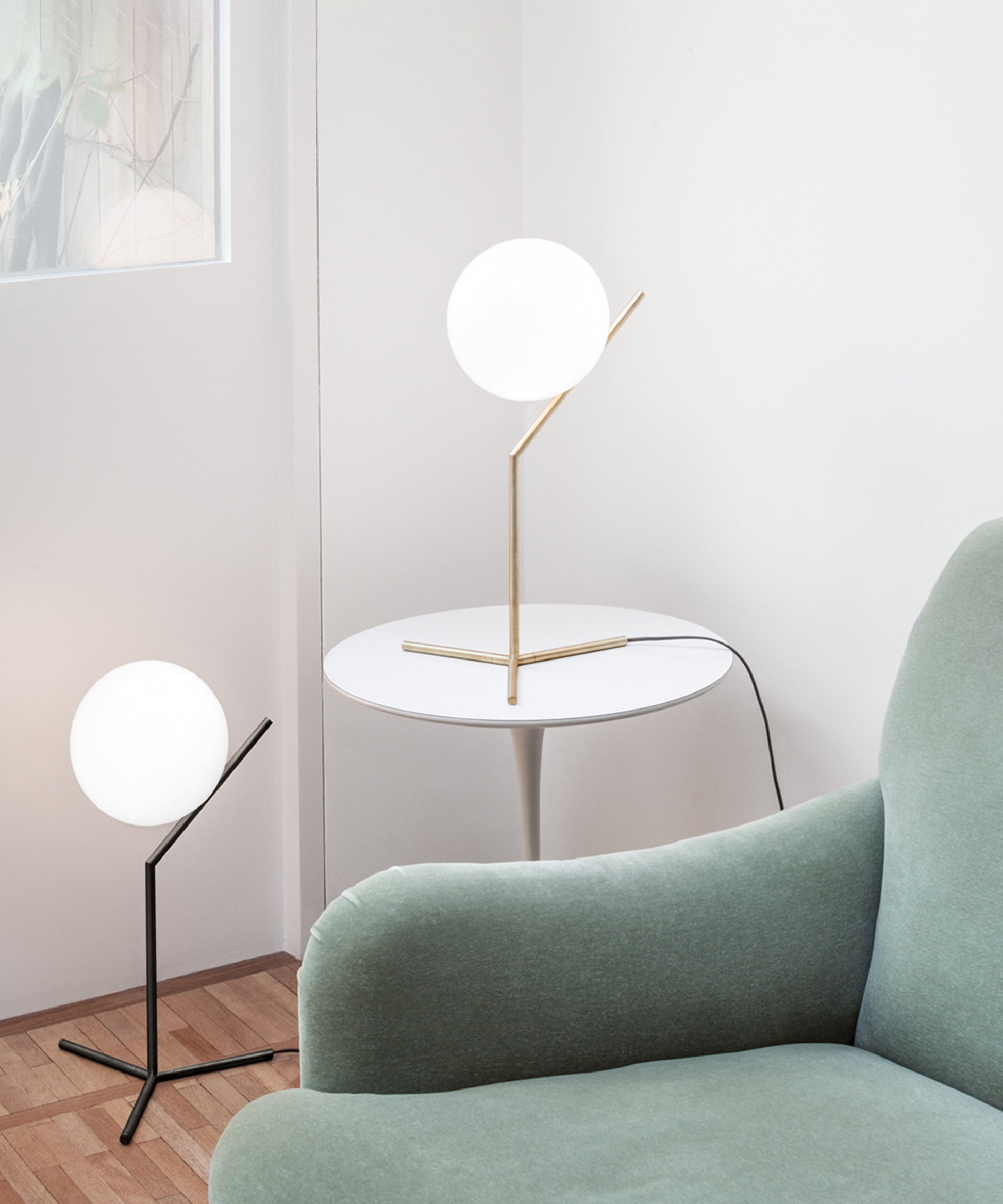 It provides diffused light through a mouth-blown opaline sphere, which is held up by a brass-plated steel frame. There is a dimmer on the power cord. IC Lights table lamp comes in three models in black, brass, or chrome finish:- IC Lights T1 High: height 20.8"; base width 12.6"- IC Lights T1 Low: height 15"; base width 6.9"- IC Lights T2: height 13.7"; base width 11" Discover the complete IC Lights collection here. The inspiration behind the design: Poise is powerful: That's the message Michael Anastassiades offers with his IC Light Series. From the skillful balance of the sphere and baton that invokes thoughts of a dexterous juggler's act to the lamp's name-IC, a reference to the identity code used to evaluate immigrants entering the UK-the designer makes a commanding statement.