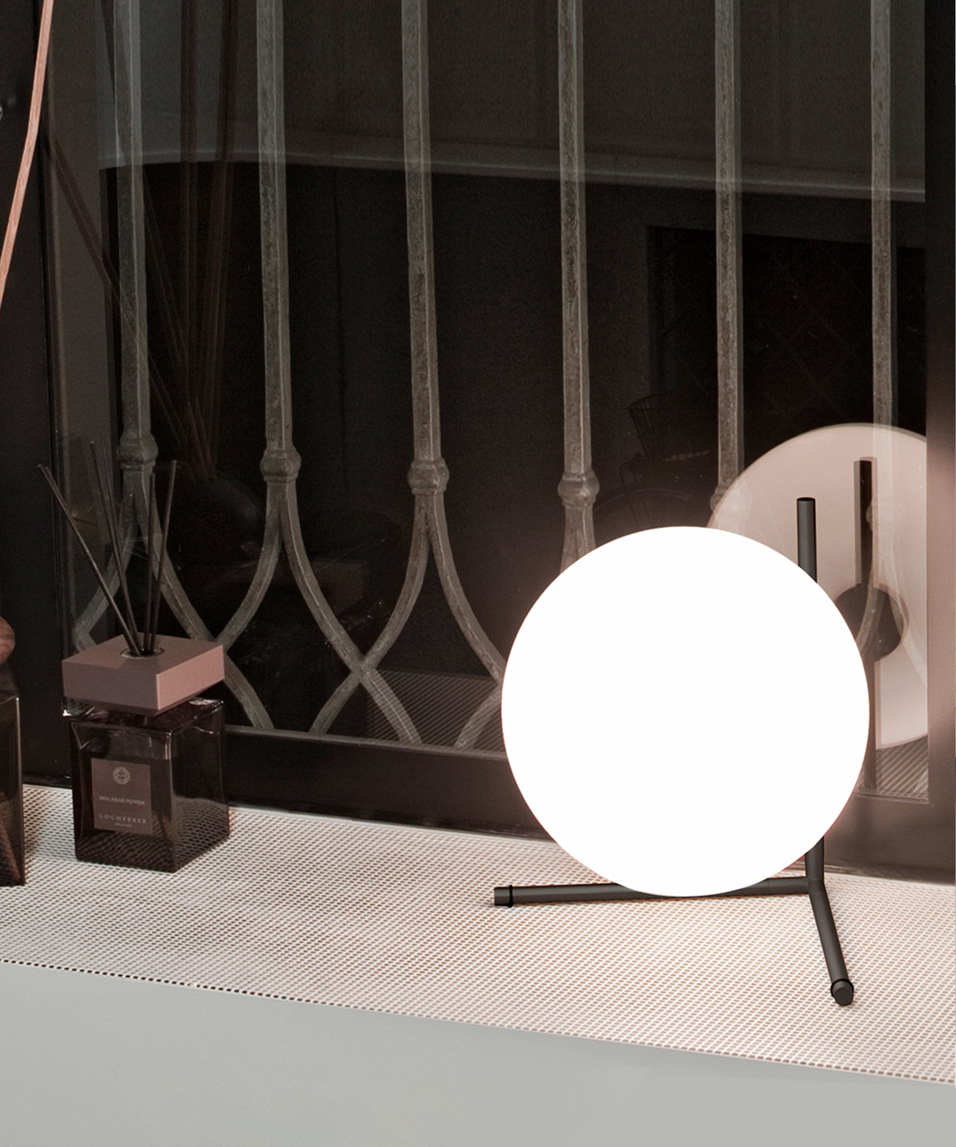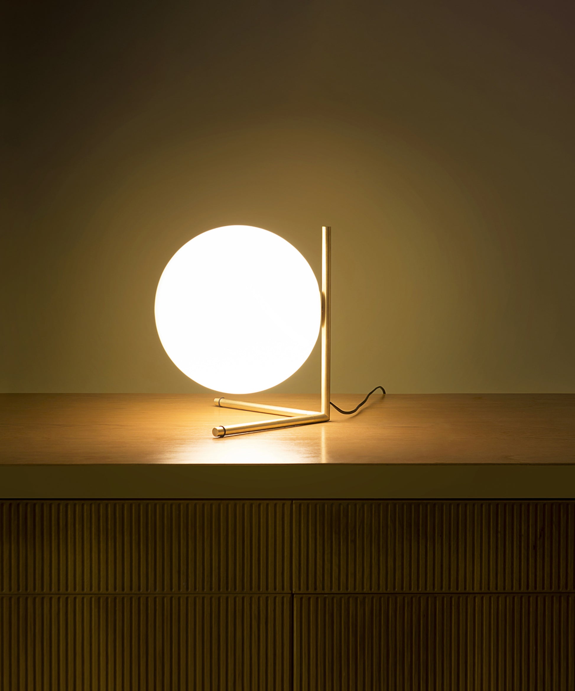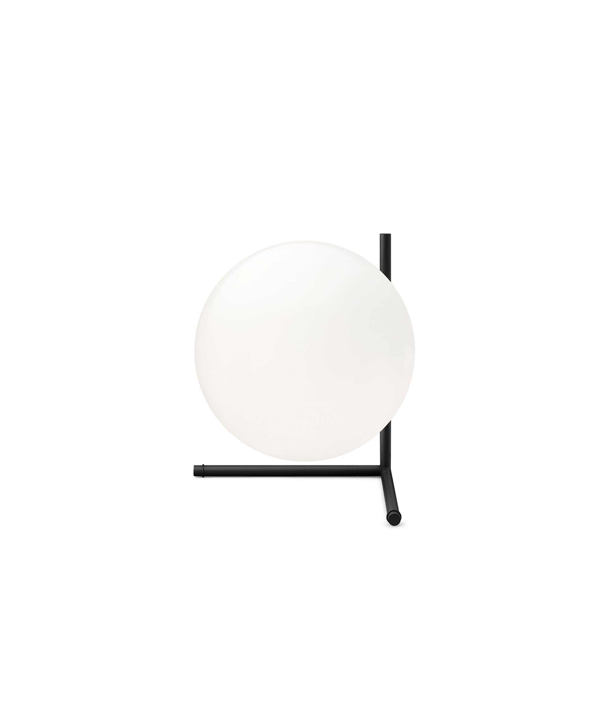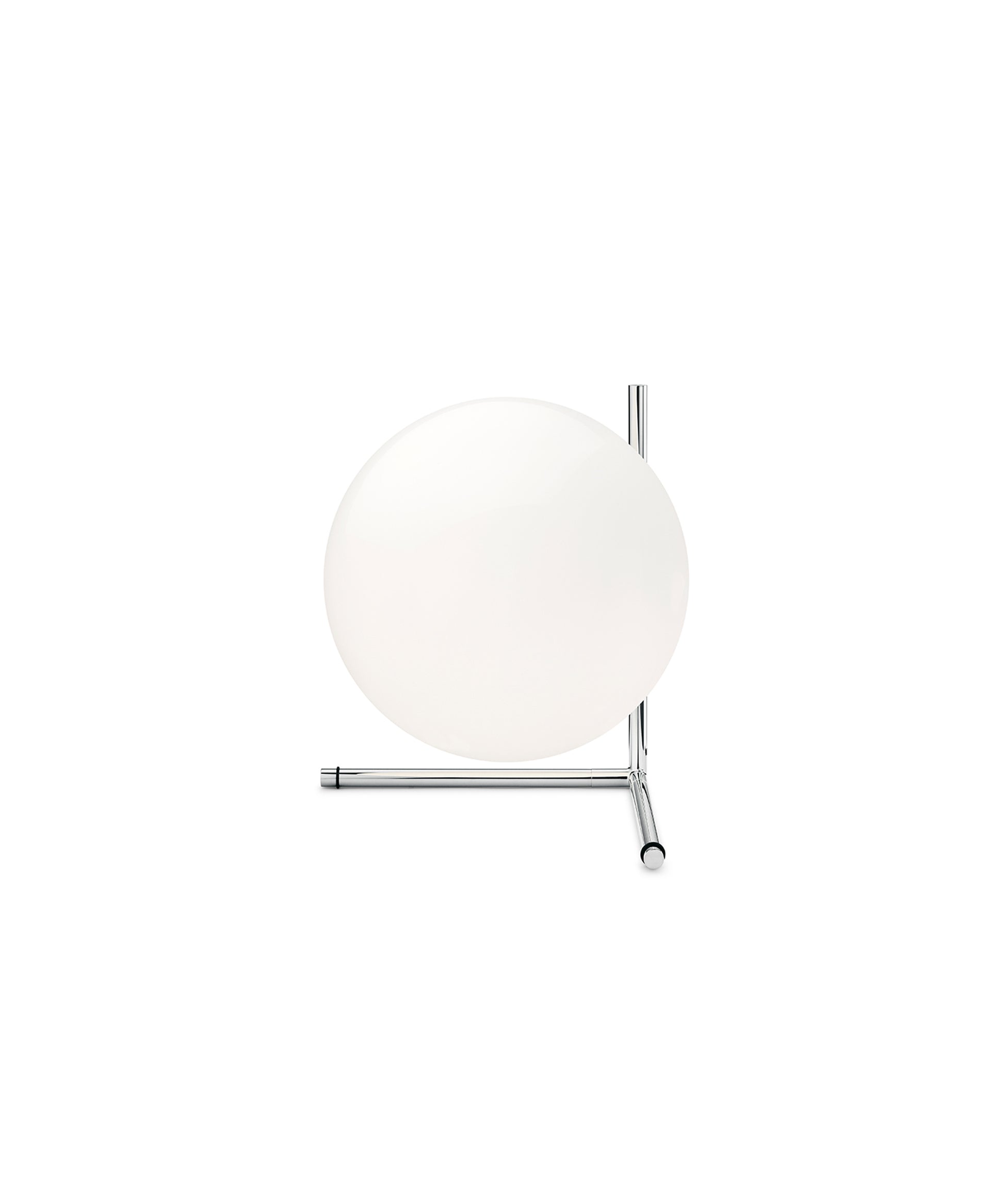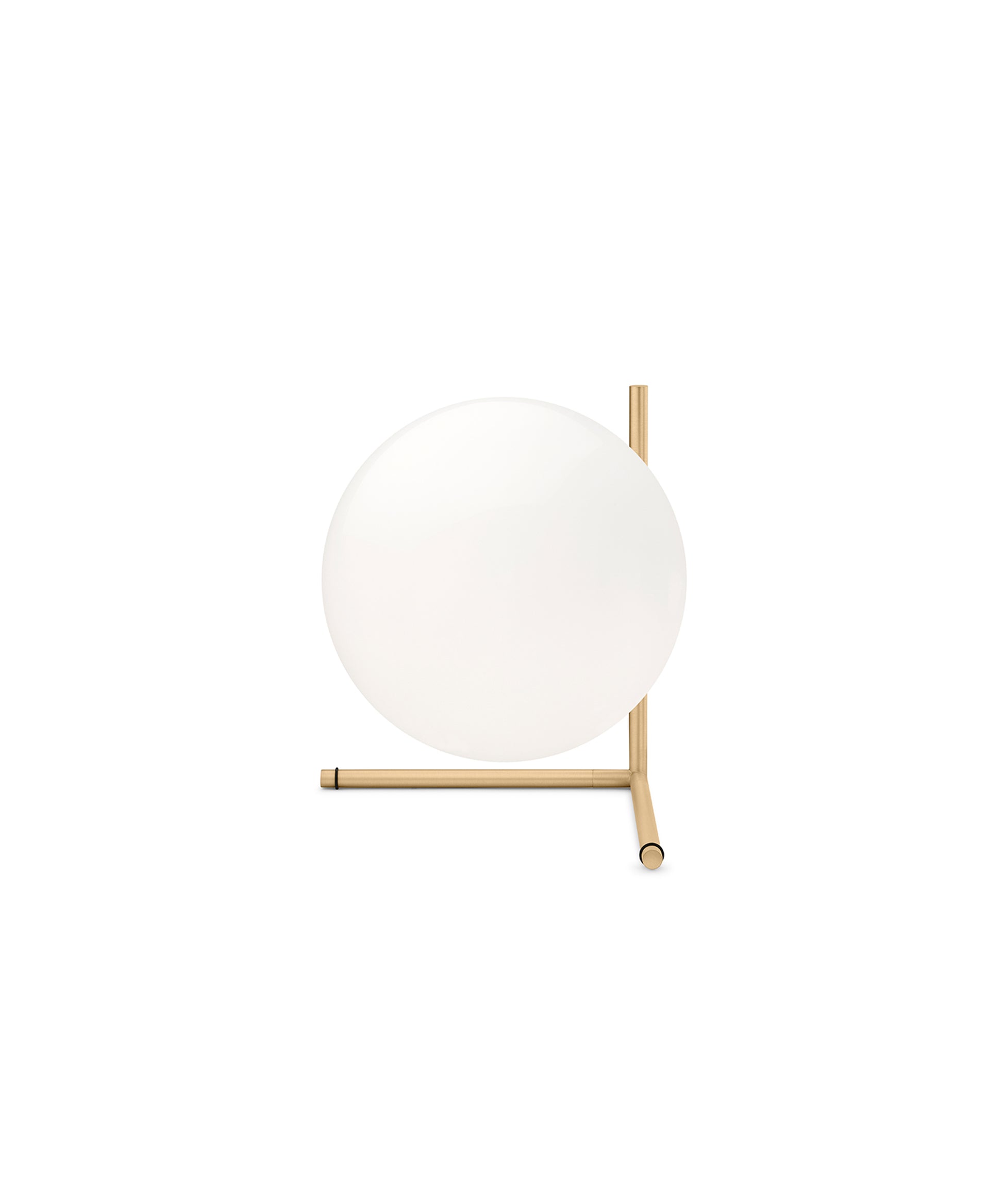 It provides diffused light through a mouth-blown opaline sphere, which is held up by a brass-plated steel frame. There is a dimmer on the power cord. IC Lights table lamp comes in three models in black, brass, or chrome finish:- IC Lights T1 High: height 20.8"; base width 12.6"- IC Lights T1 Low: height 15"; base width 6.9"- IC Lights T2: height 13.7"; base width 11" Discover the complete IC Lights collection here. The inspiration behind the design: Poise is powerful: That's the message Michael Anastassiades offers with his IC Light Series. From the skillful balance of the sphere and baton that invokes thoughts of a dexterous juggler's act to the lamp's name-IC, a reference to the identity code used to evaluate immigrants entering the UK-the designer makes a commanding statement.