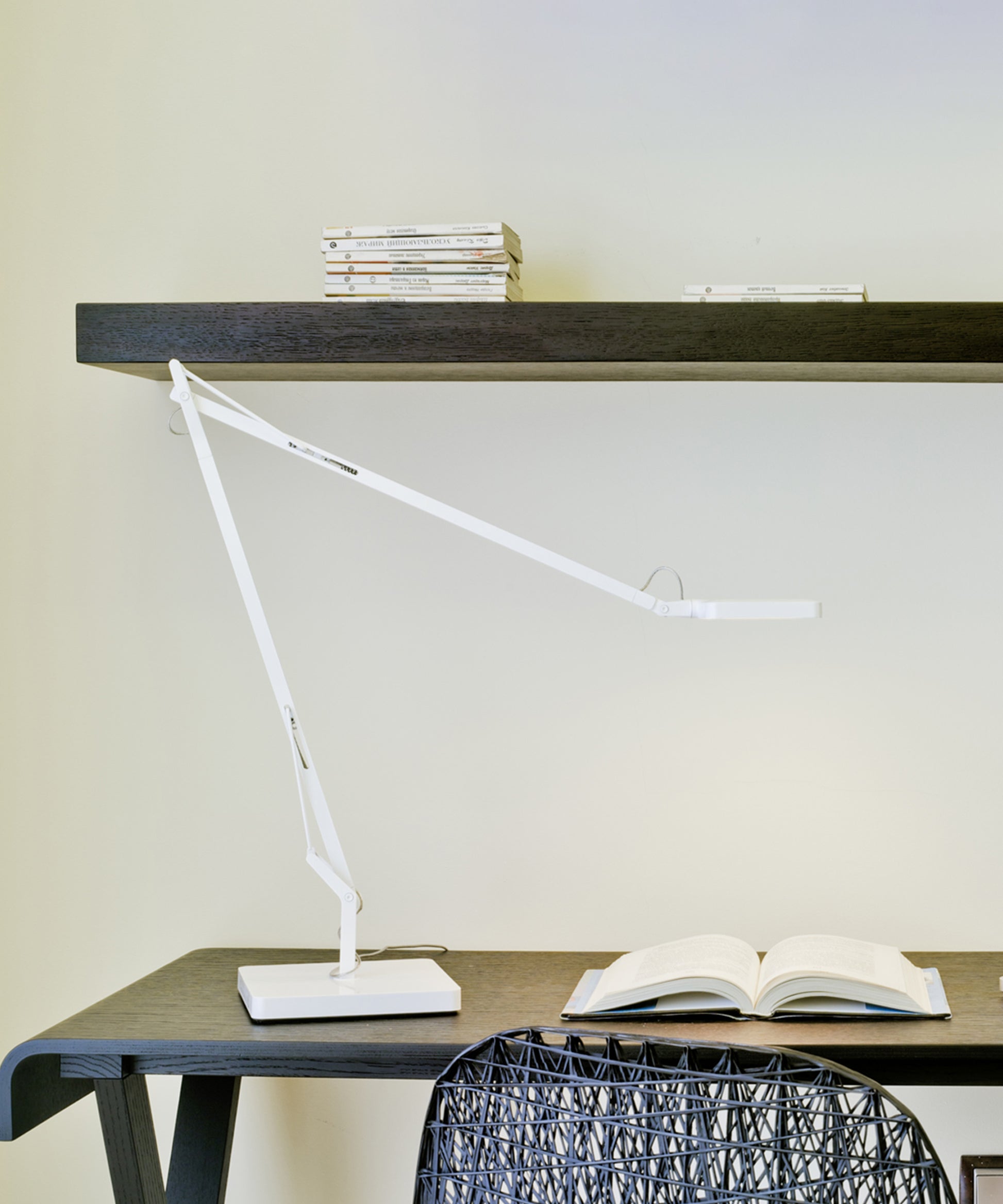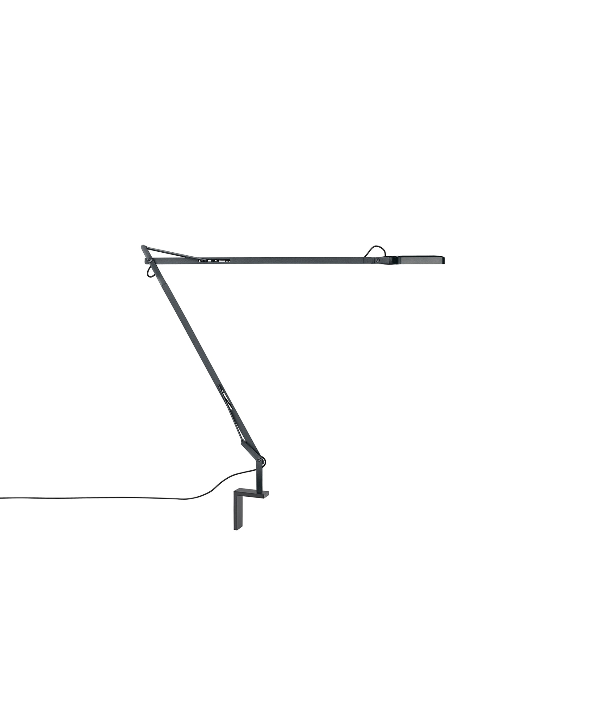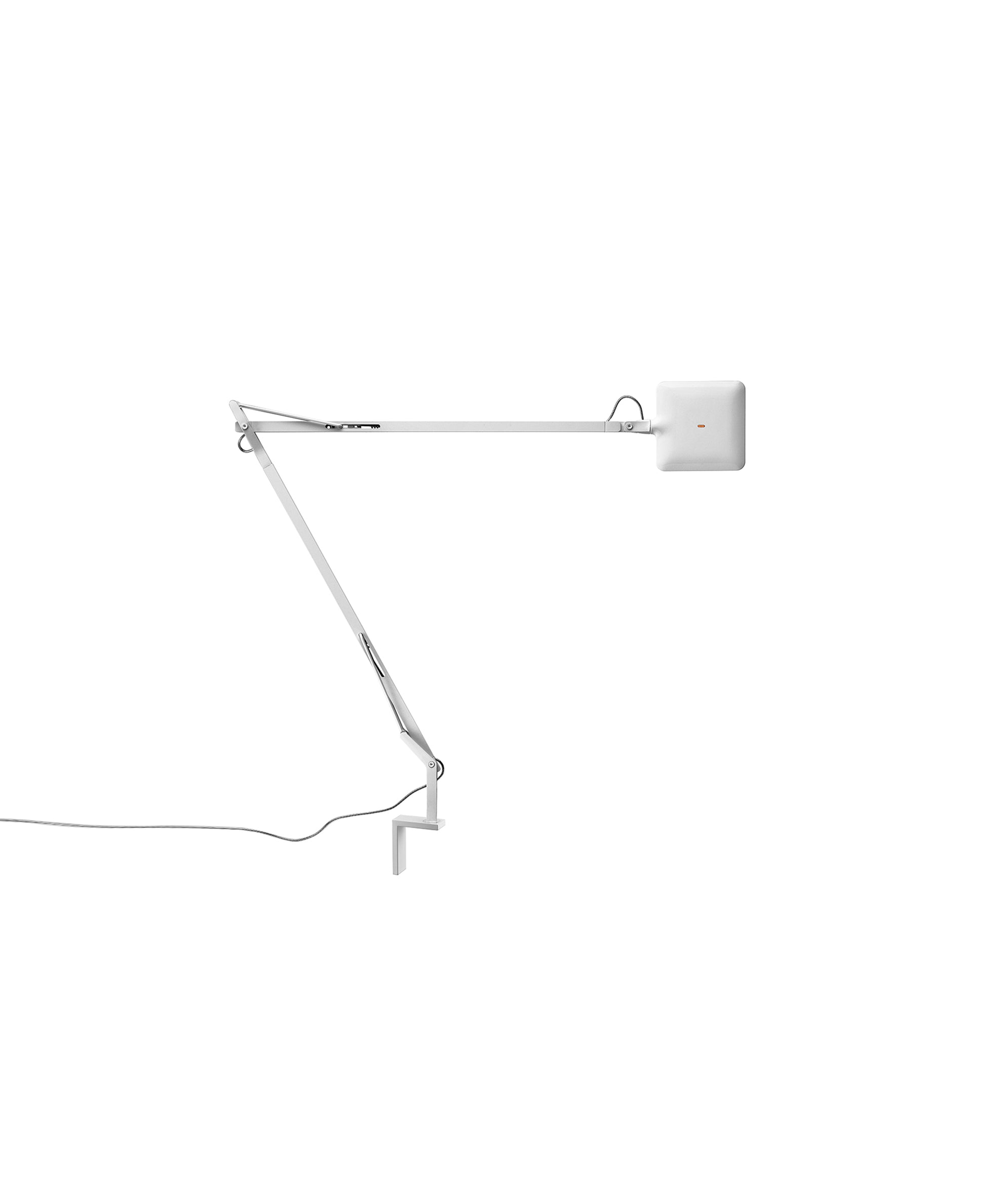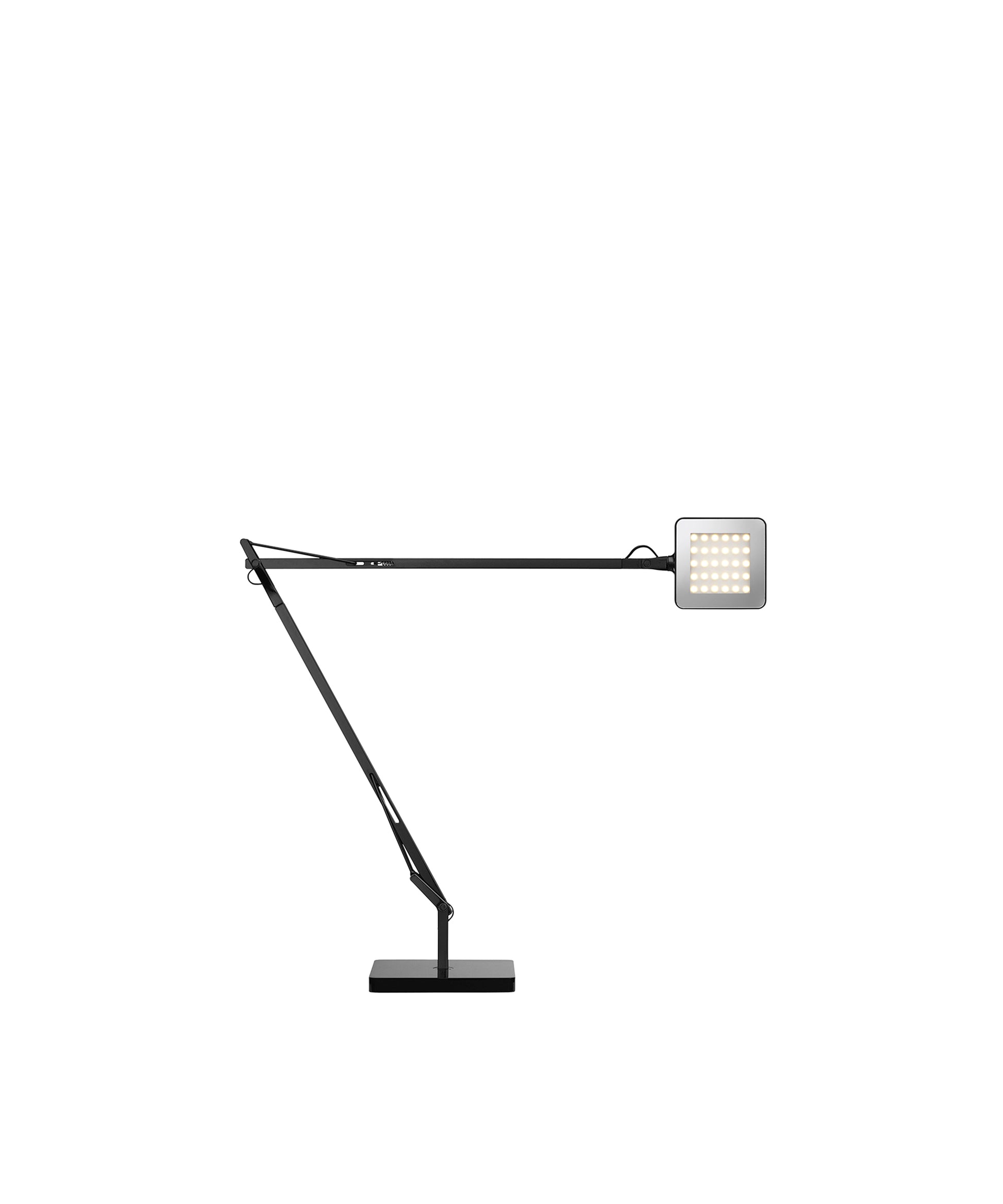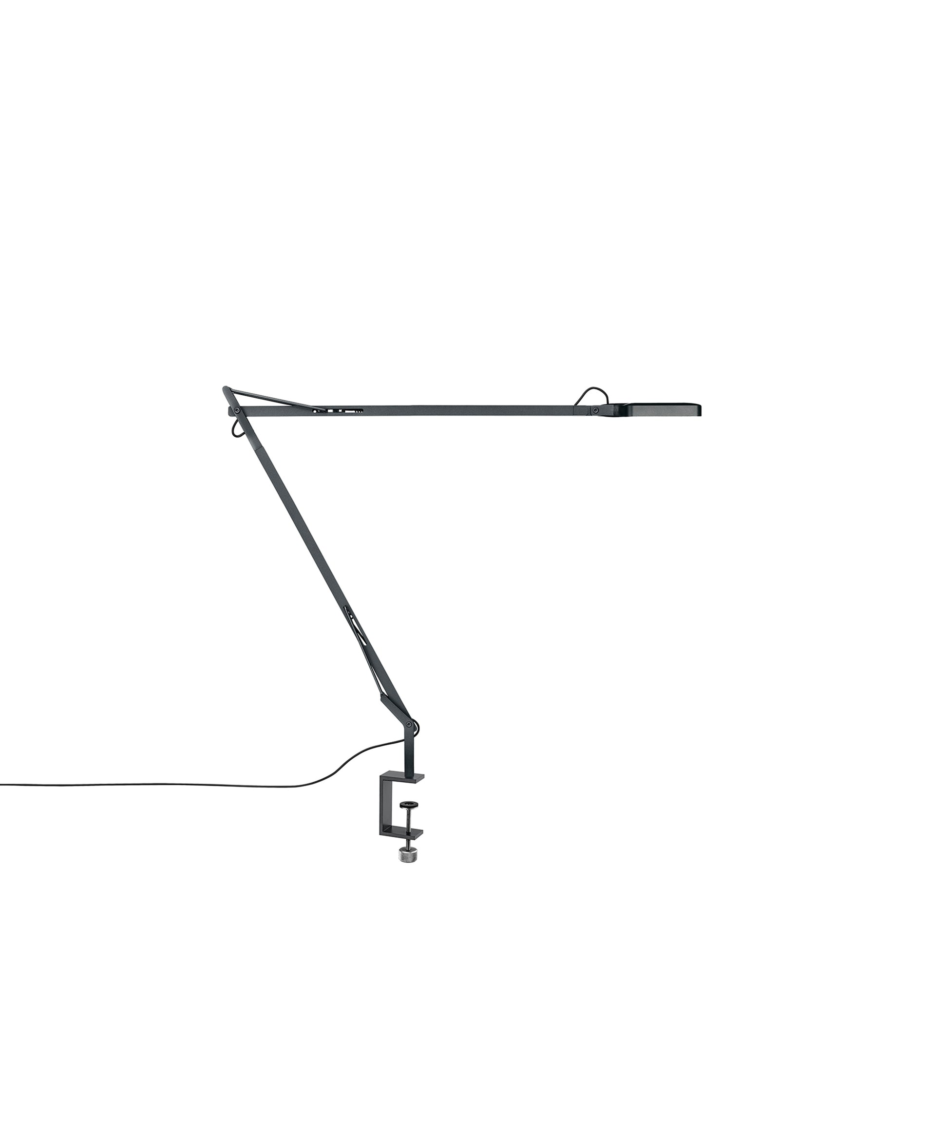 The three-step on/off switch utilizes Soft Touch technology, and the base cover is an injection-printed PC (polycarbonate). The head is directional, the counterweight is an iron cut painted through a process of cataphoresis. The base separates from the lamp body, held in place with a safety-locking pin. Inspired by a love of industrial design, creators Antonio Citterio and Toan Nguyen developed the Kelvin family to blend seemingly simple structures with the most innovative technologies and materials.