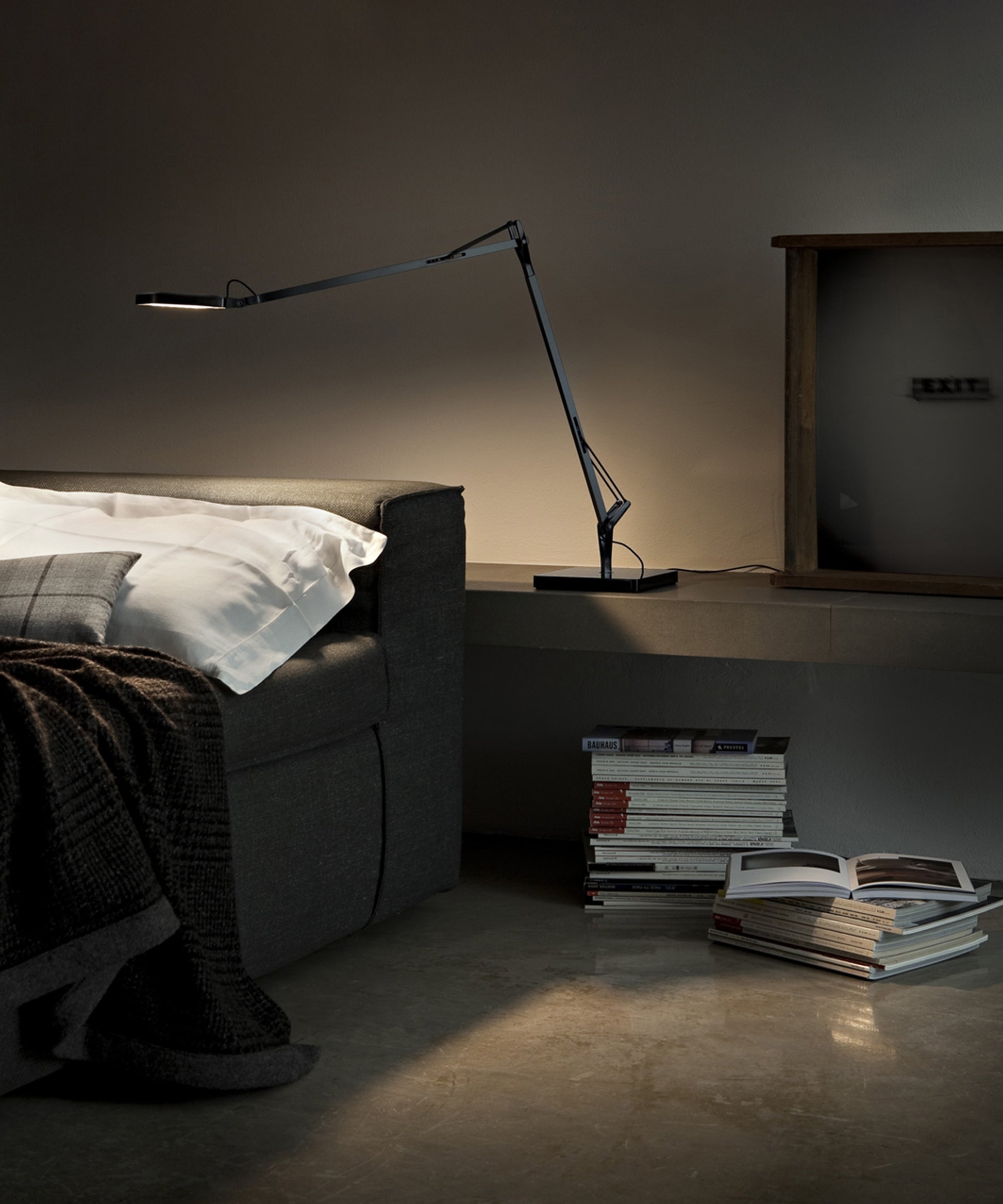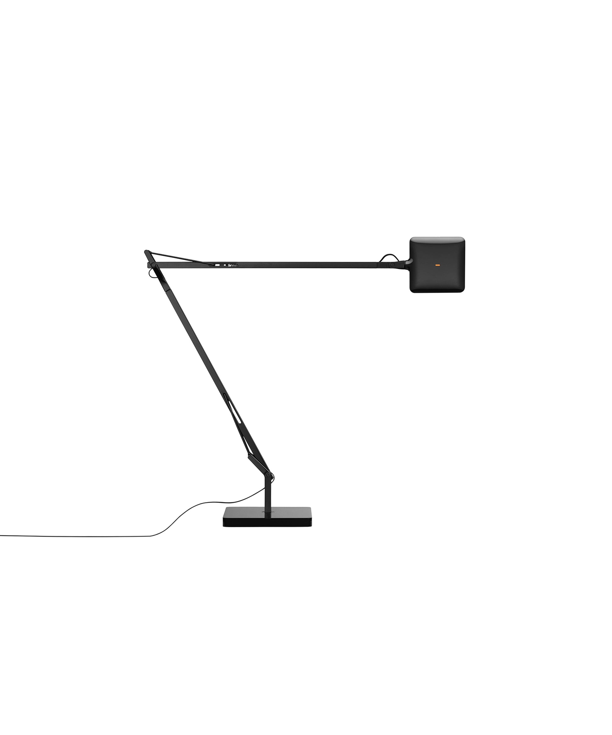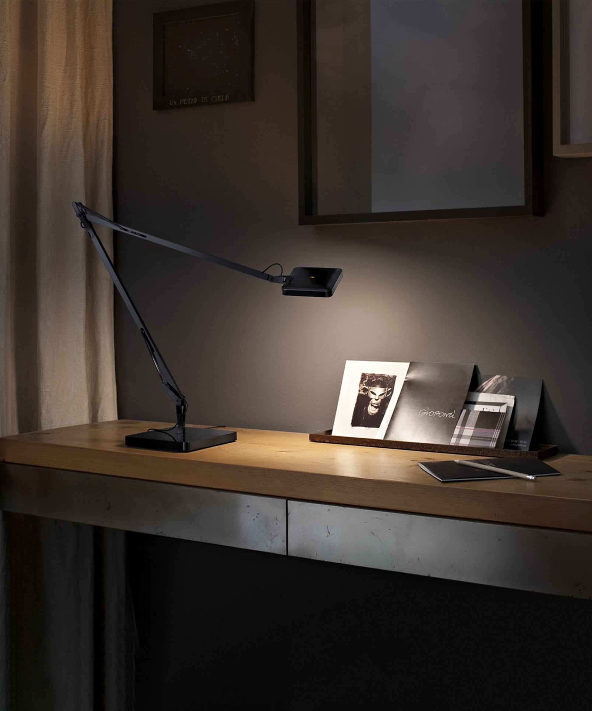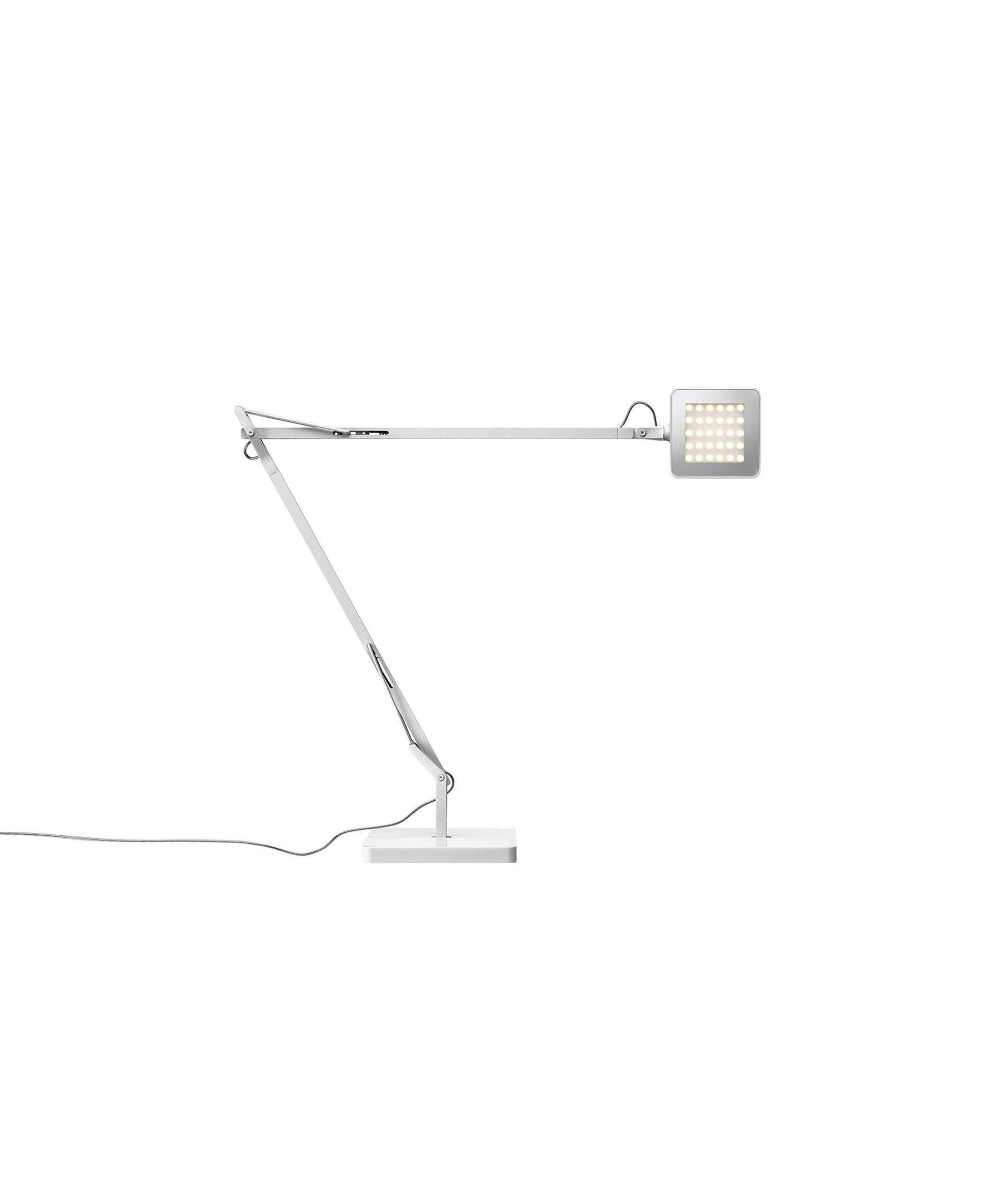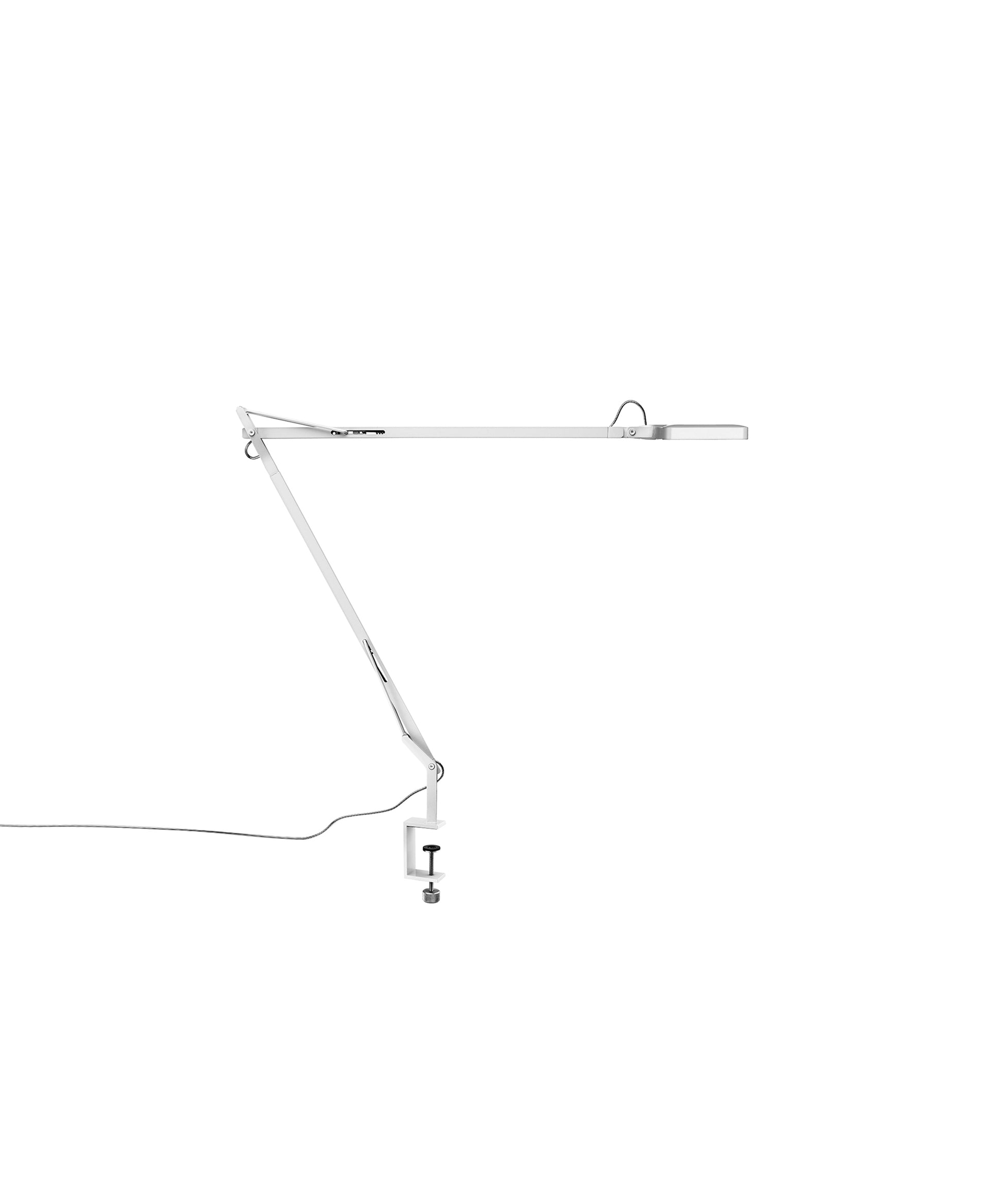 The three-step on/off switch utilizes Soft Touch technology, and the base cover is an injection-printed PC (polycarbonate). The head is directional, the counterweight is an iron cut painted through a process of cataphoresis. The base separates from the lamp body, held in place with a safety-locking pin. Inspired by a love of industrial design, creators Antonio Citterio and Toan Nguyen developed the Kelvin family to blend seemingly simple structures with the most innovative technologies and materials.