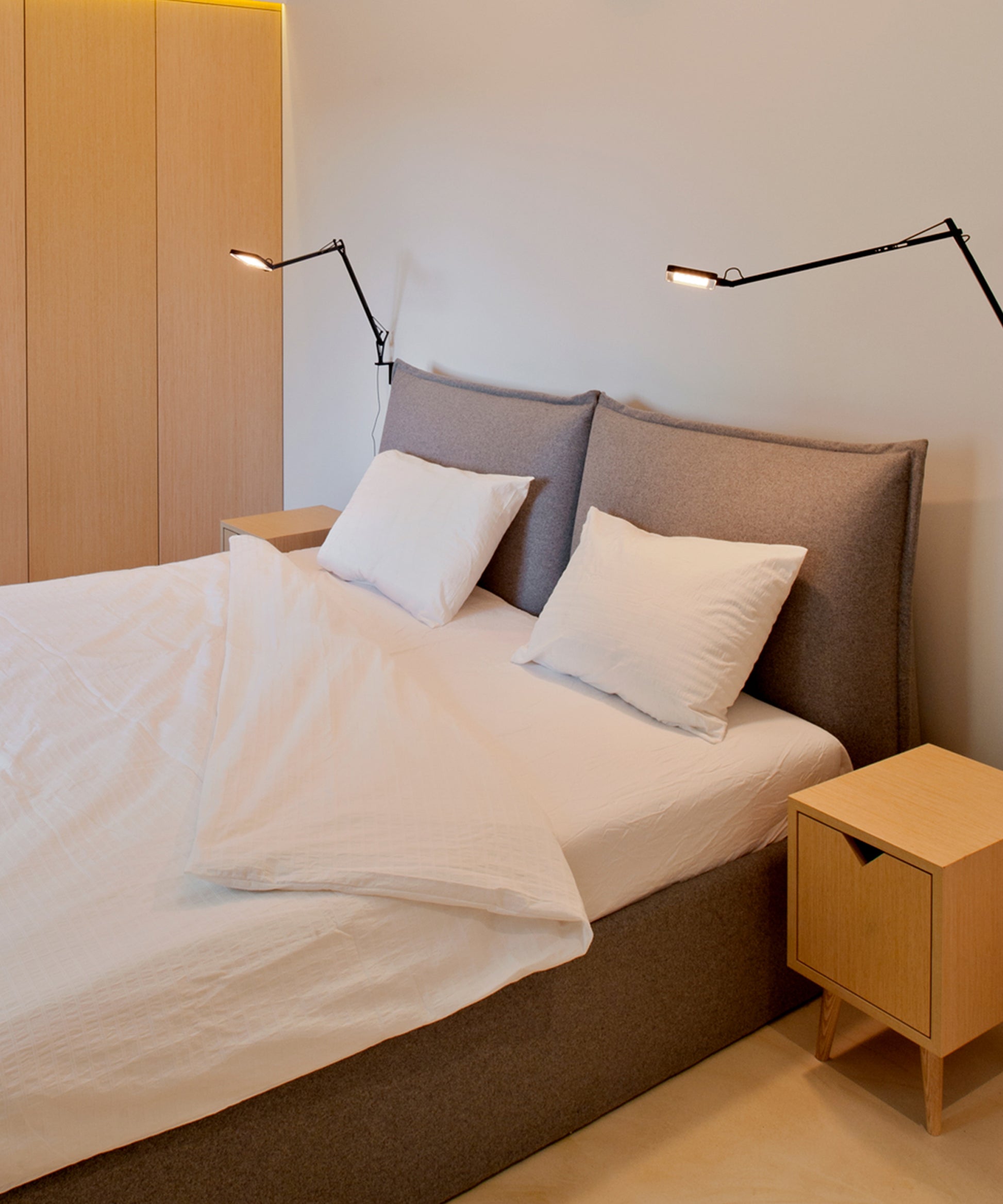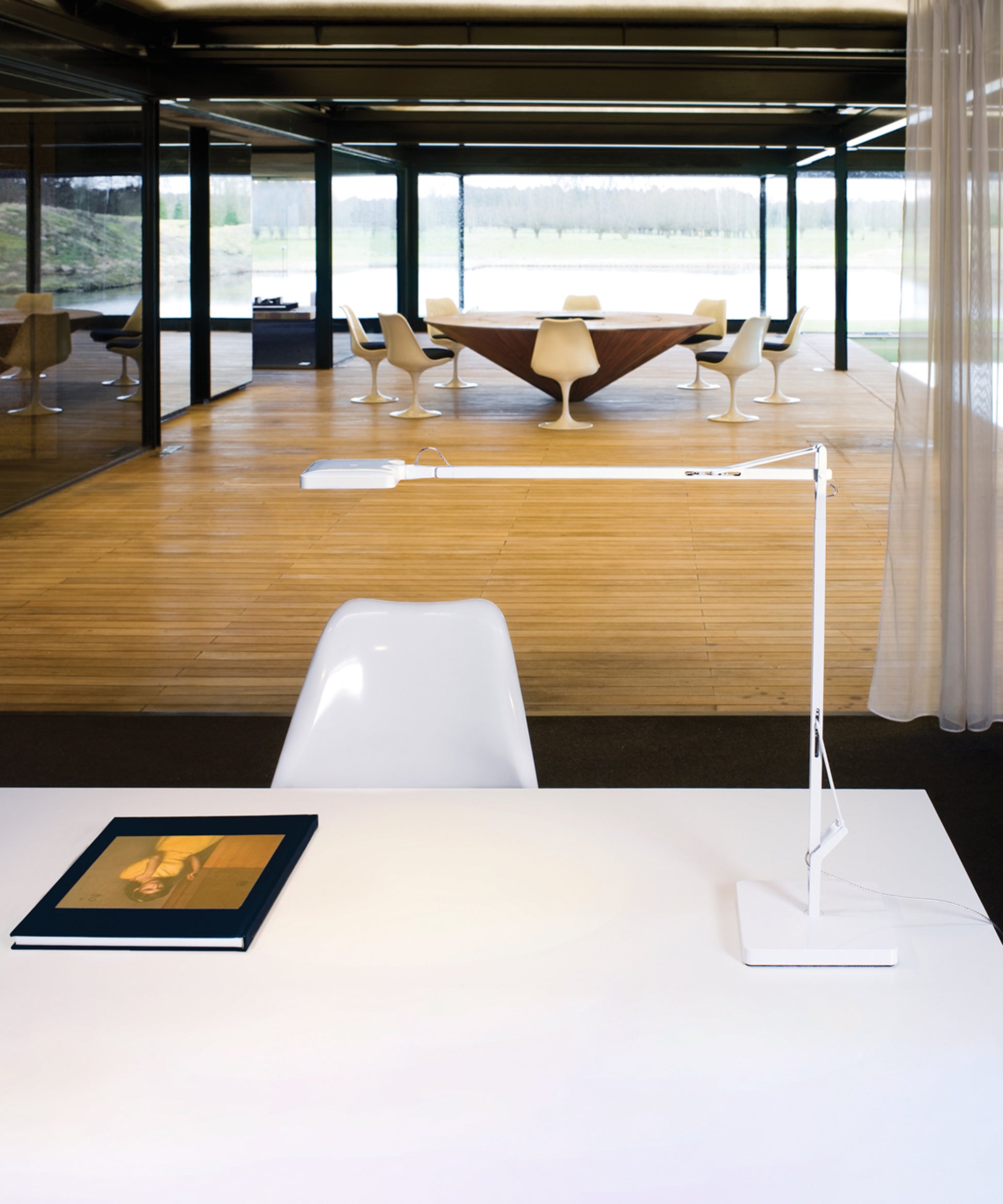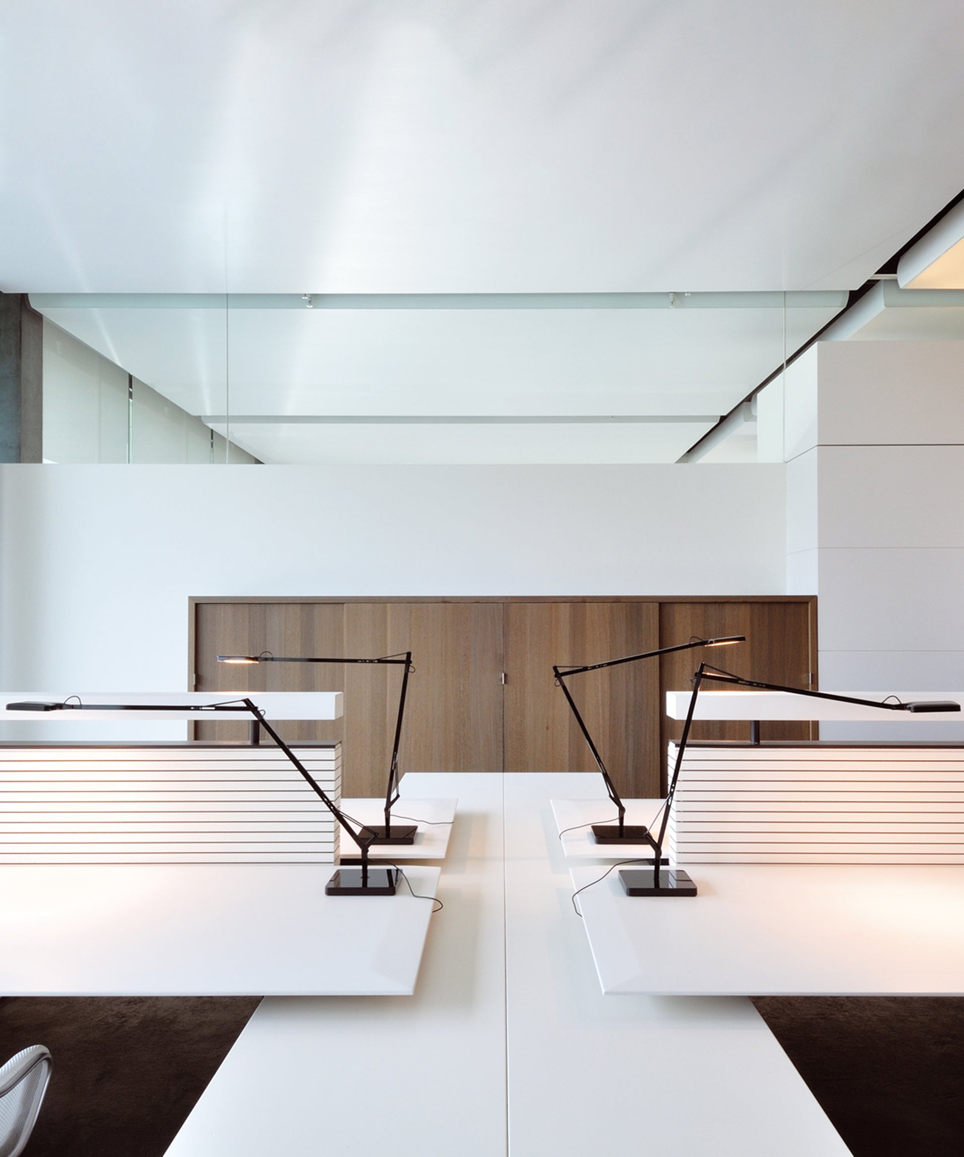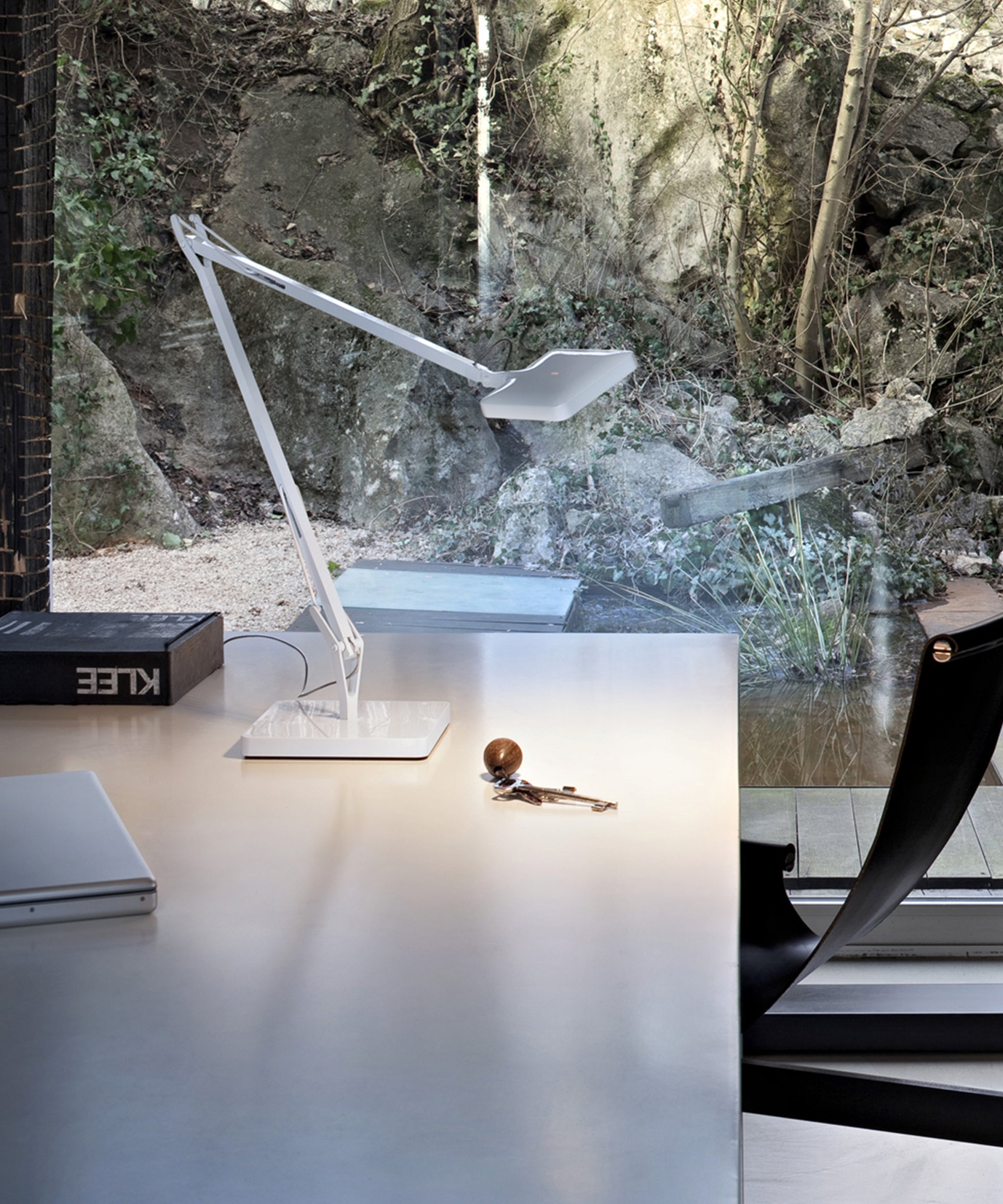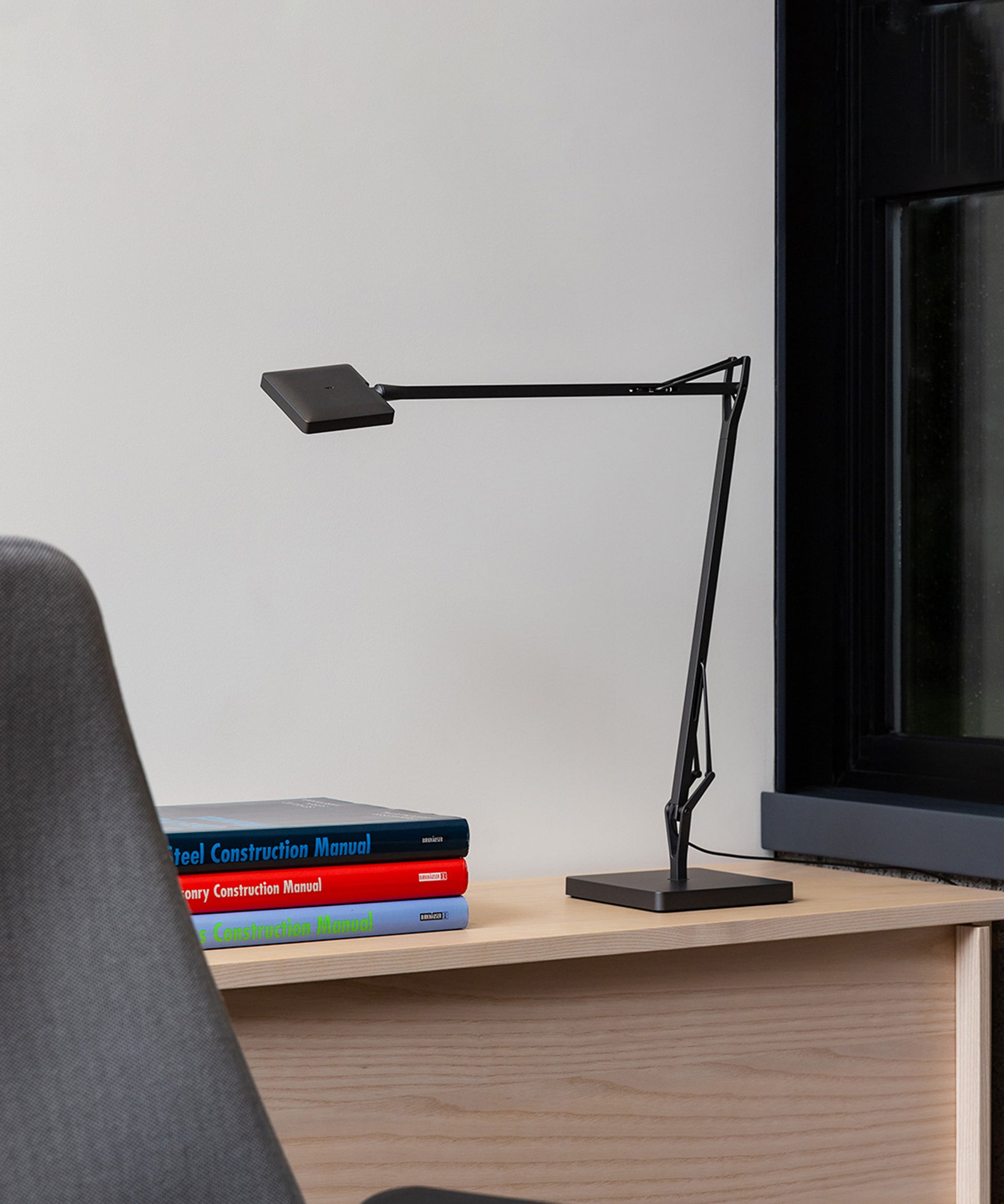 The three-step on/off switch utilizes Soft Touch technology, and the base cover is an injection-printed PC (polycarbonate). The head is directional, the counterweight is an iron cut painted through a process of cataphoresis. The base separates from the lamp body, held in place with a safety-locking pin. Inspired by a love of industrial design, creators Antonio Citterio and Toan Nguyen developed the Kelvin family to blend seemingly simple structures with the most innovative technologies and materials.
