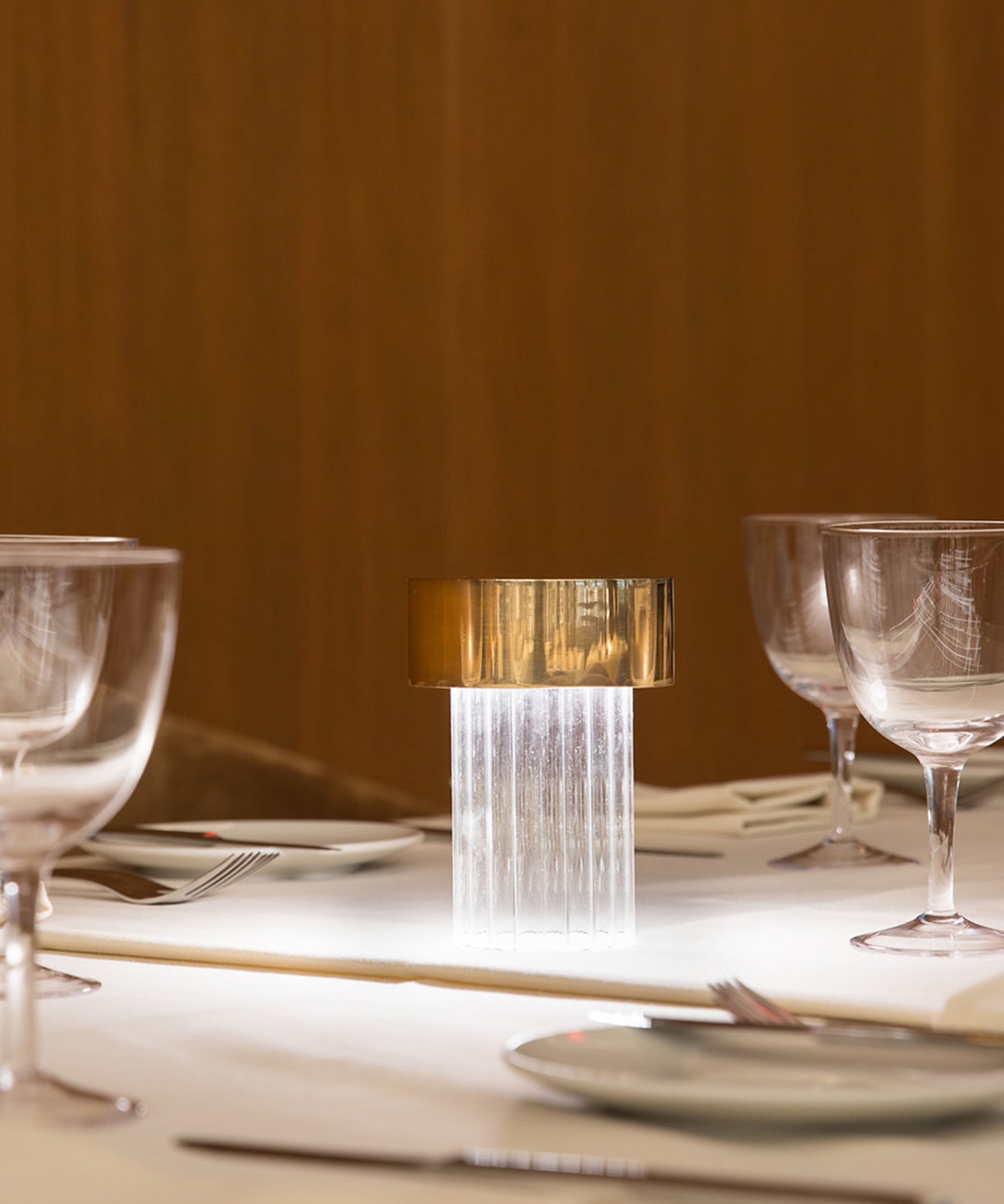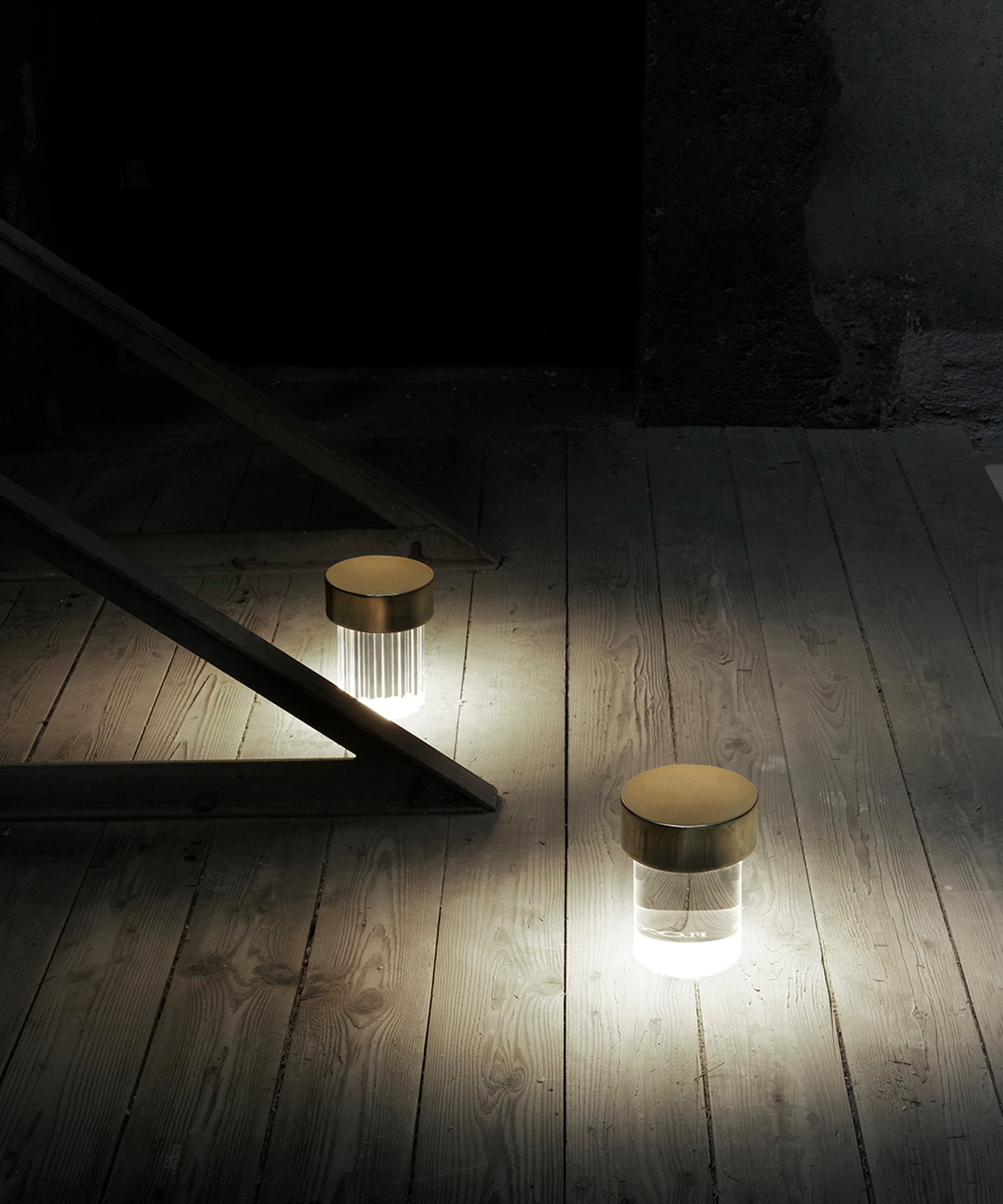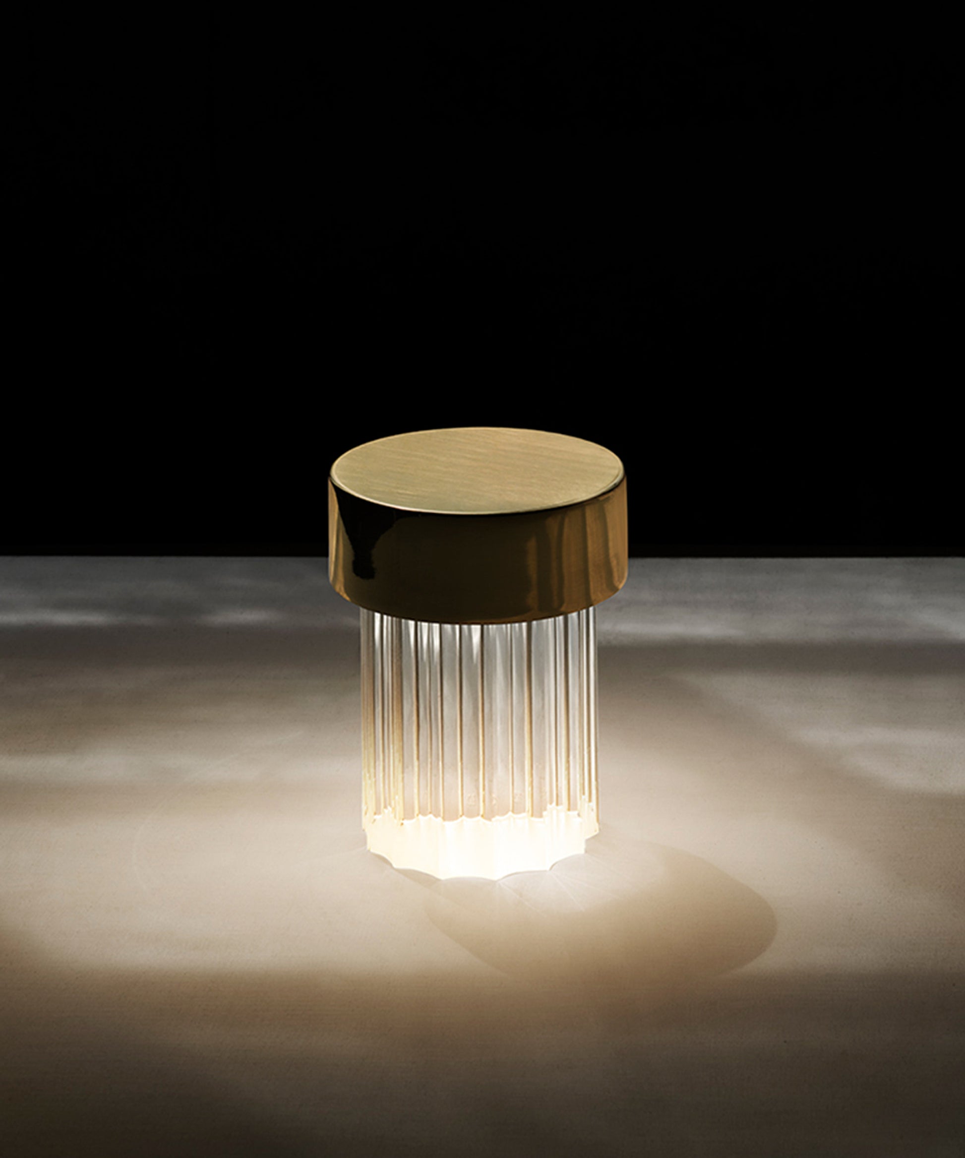 It is a rechargeable, portable table lamp that diffuses light through a transparent solid crystal base whose shape makes reference to the architectural typology of the ancient column. The top cover comes in a combination of different metal and color finishes: stainless steel, brass, satin copper, or matte green. Features Indoor use only: Copper & Brass Outdoor and indoor use: Stainless Steel & Matte Green Autonomous usage lasts between 6 hours (at full power) and 24 hours Charges via USB-C 3-step dimmer: 100% intensity, 50% intensity, 3% intensity "Nightshift" mode - Dims directly to 3% intensity when pressing and holding the optical sensor.