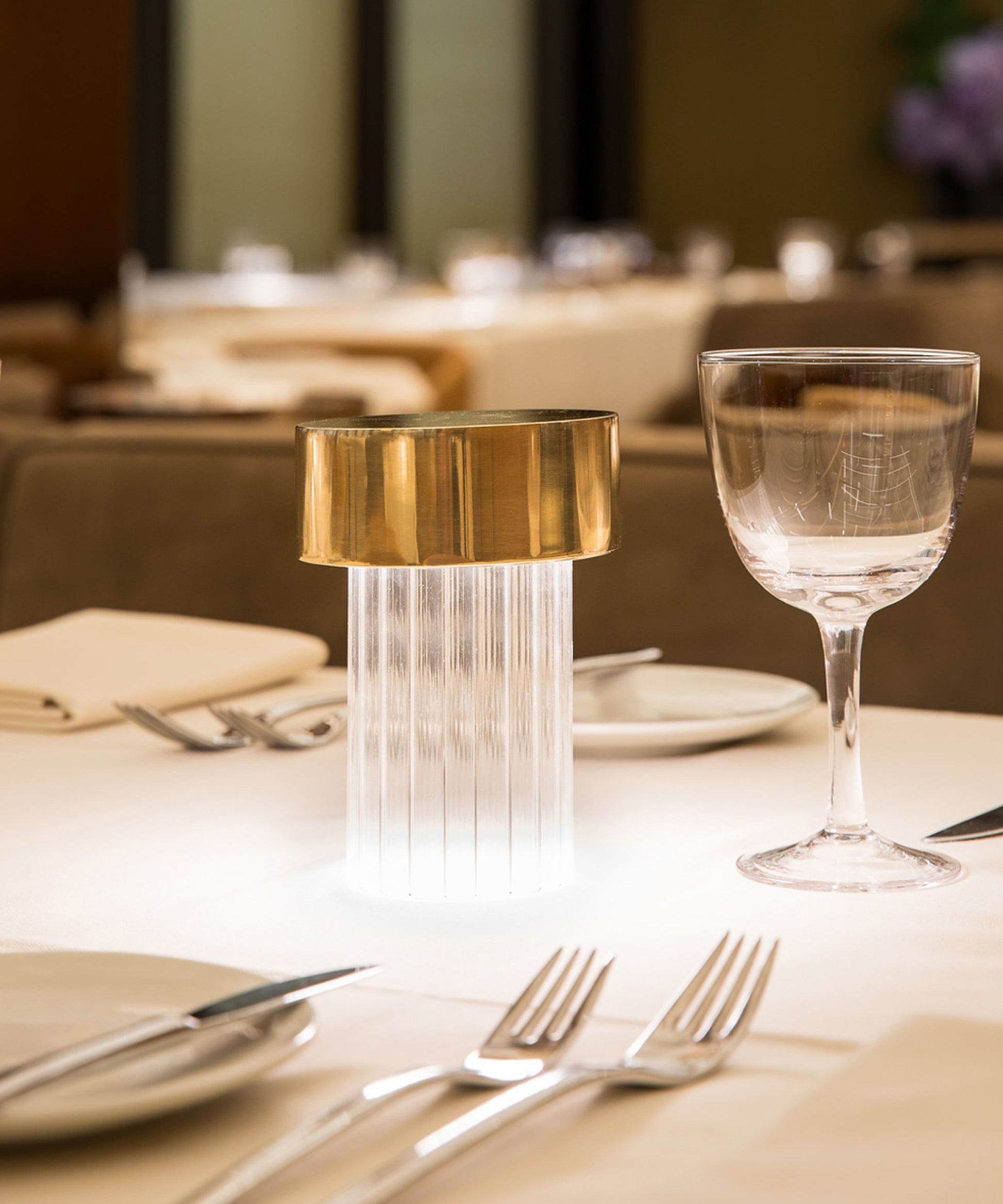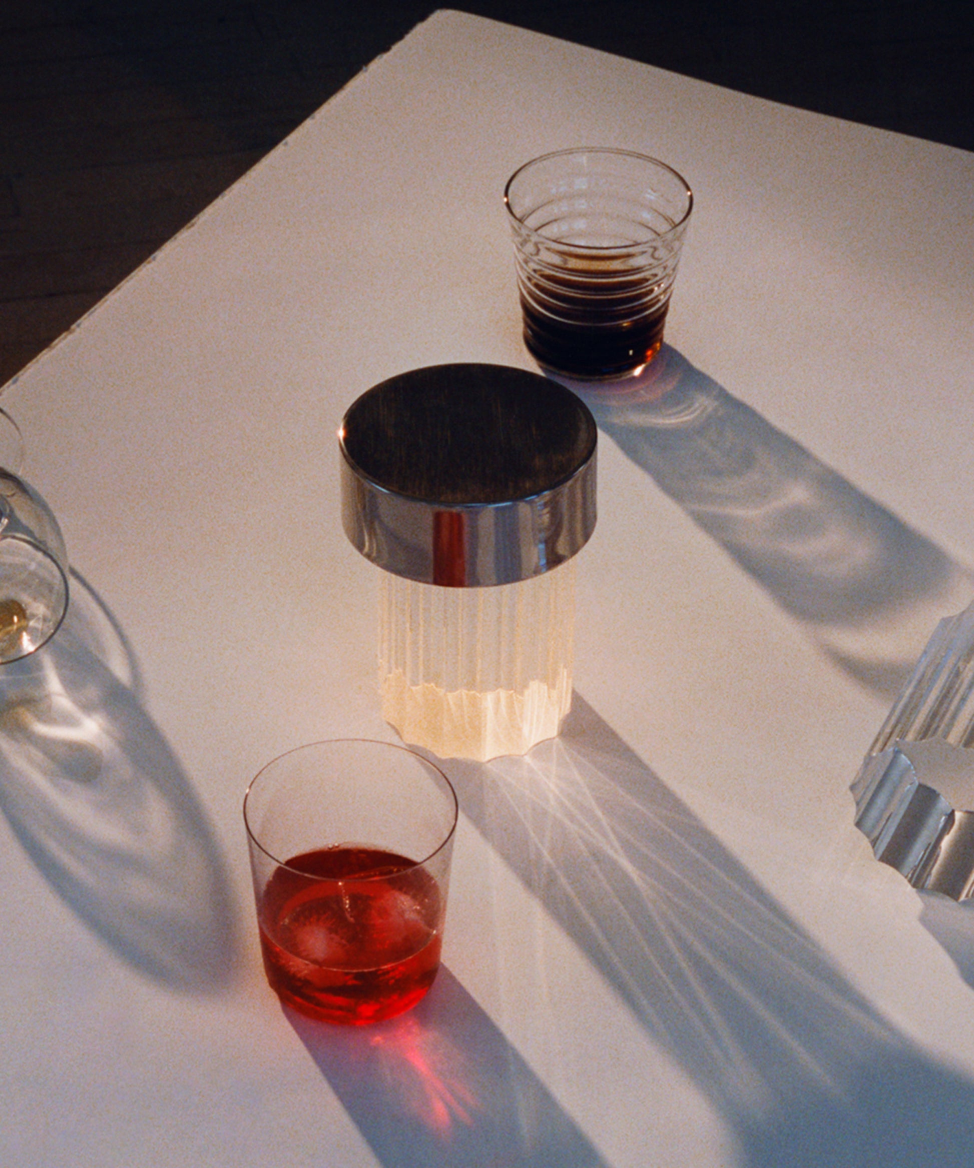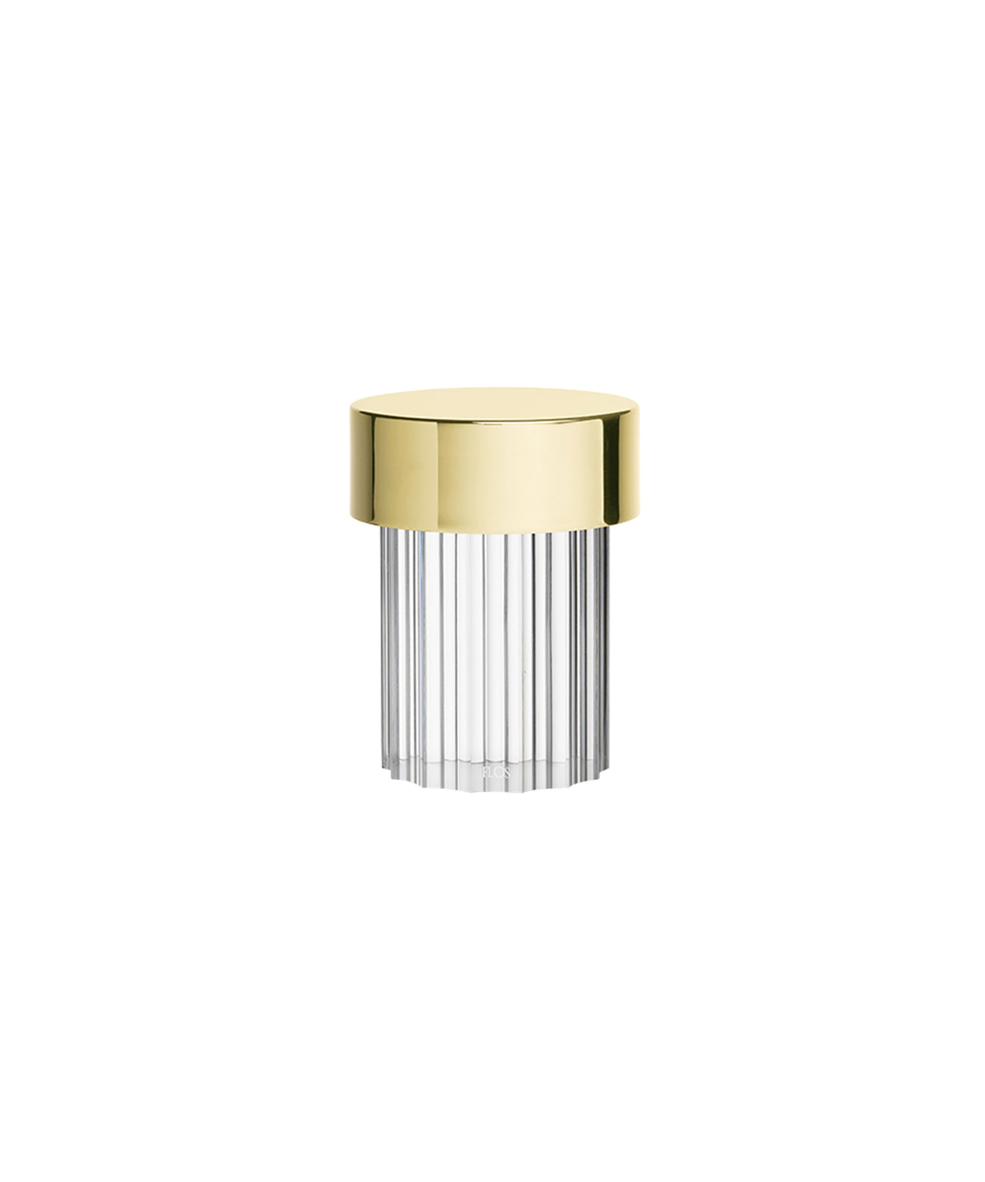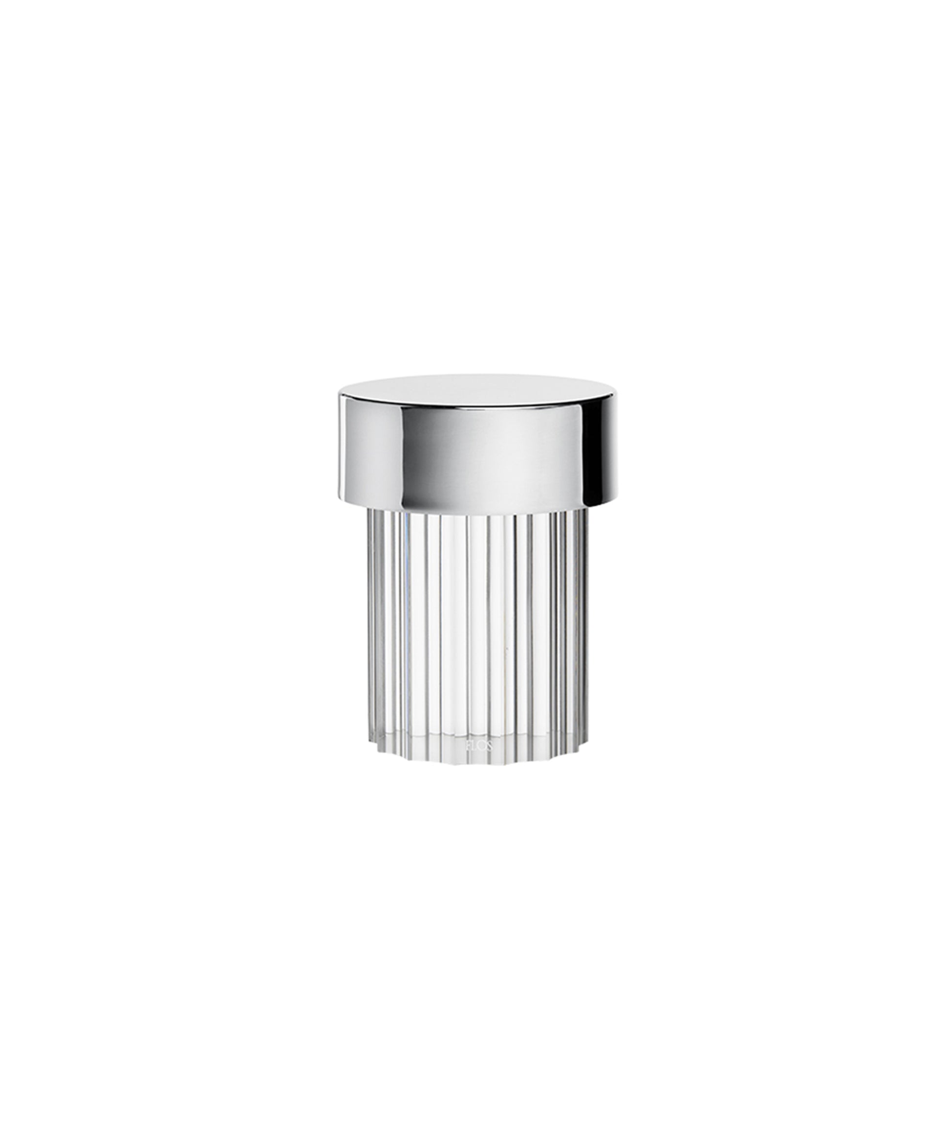 It is a rechargeable, portable table lamp that diffuses light through a transparent solid crystal base whose shape makes reference to the architectural typology of the ancient column. The top cover comes in a combination of different metal and color finishes: stainless steel, brass, satin copper, or matte green. Features Indoor use only: Copper & Brass Outdoor and indoor use: Stainless Steel & Matte Green Autonomous usage lasts between 6 hours (at full power) and 24 hours Charges via USB-C 3-step dimmer: 100% intensity, 50% intensity, 3% intensity "Nightshift" mode - Dims directly to 3% intensity when pressing and holding the optical sensor.