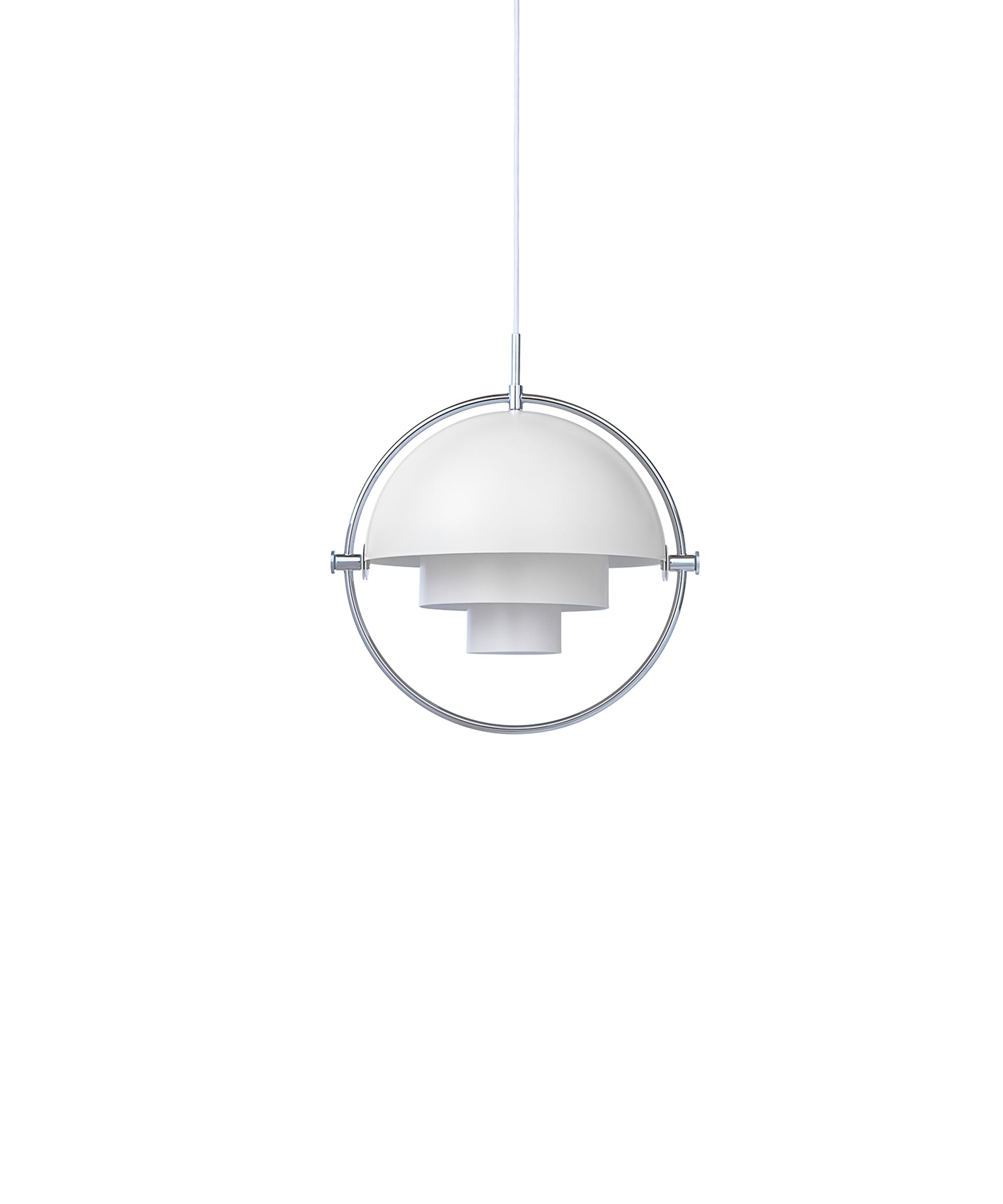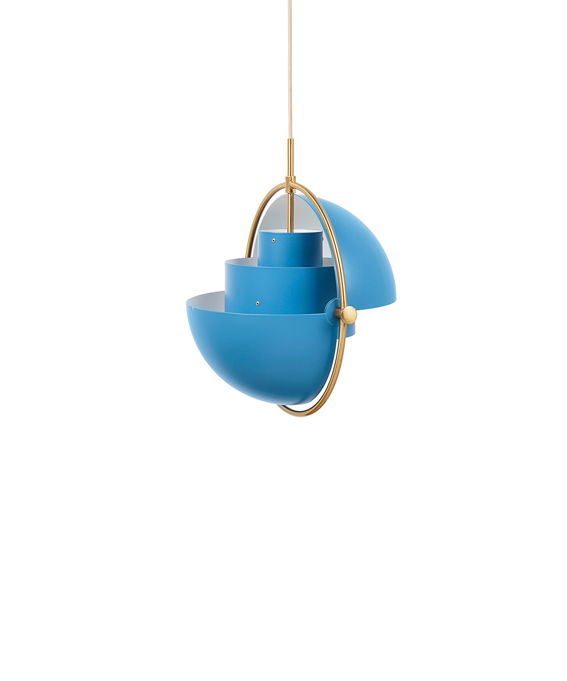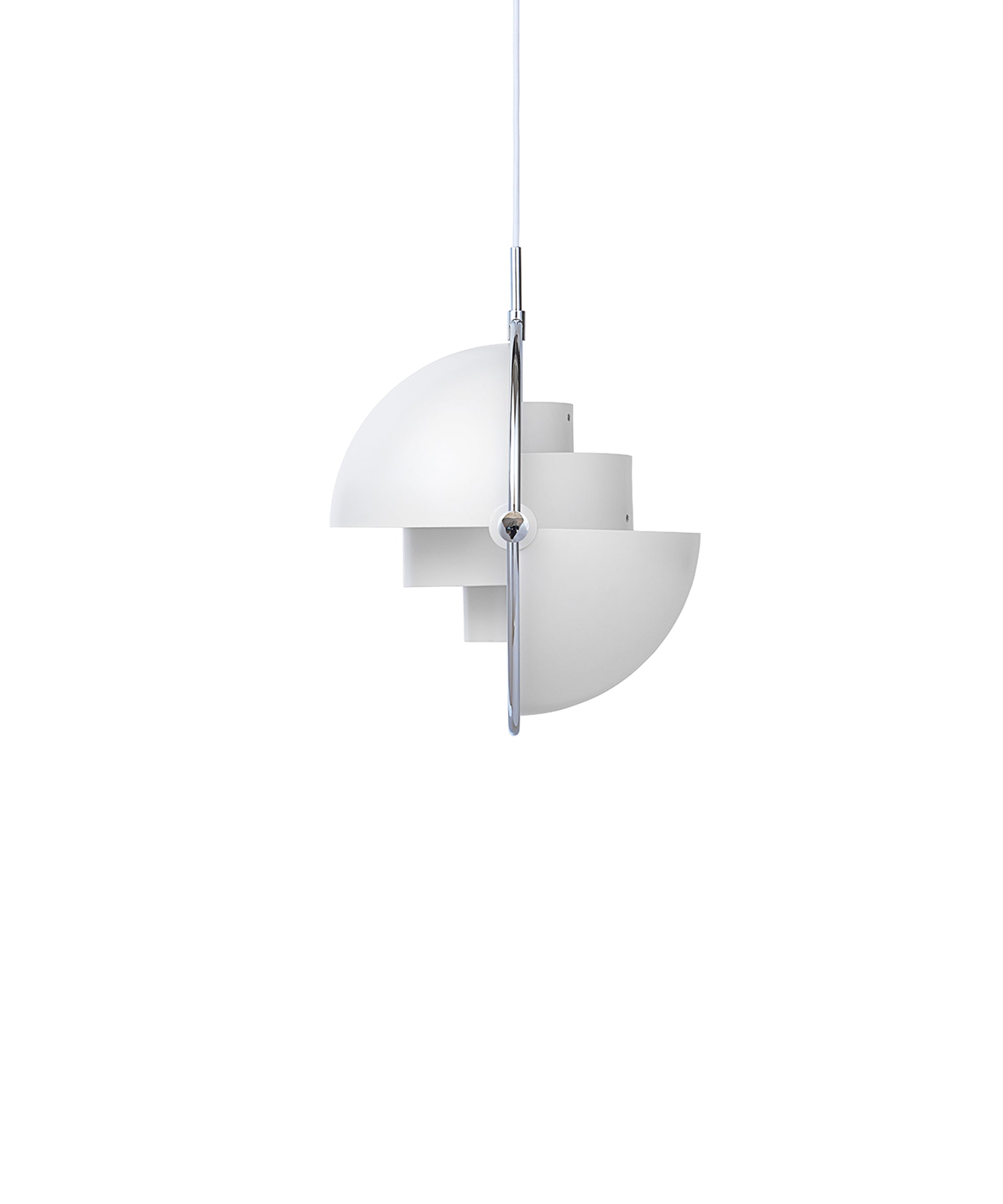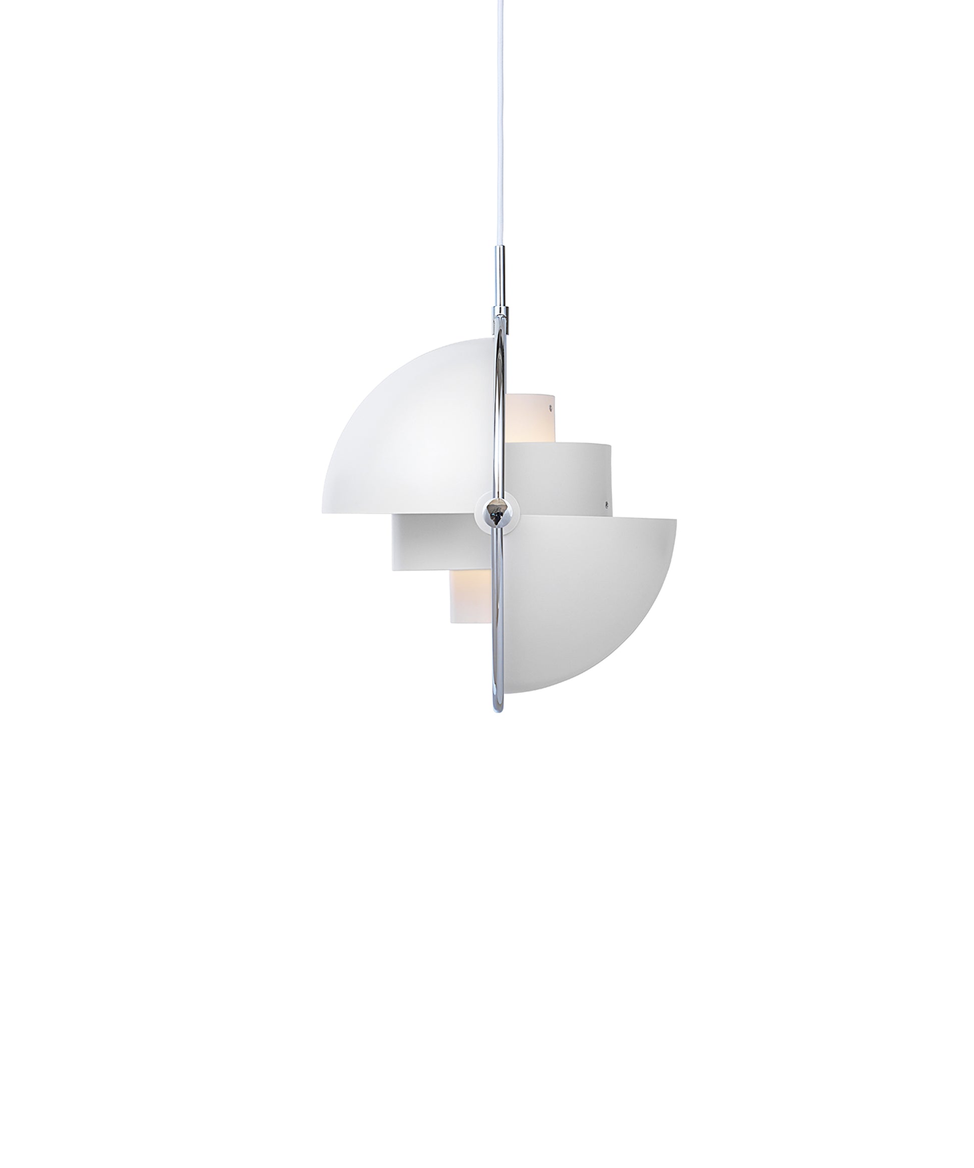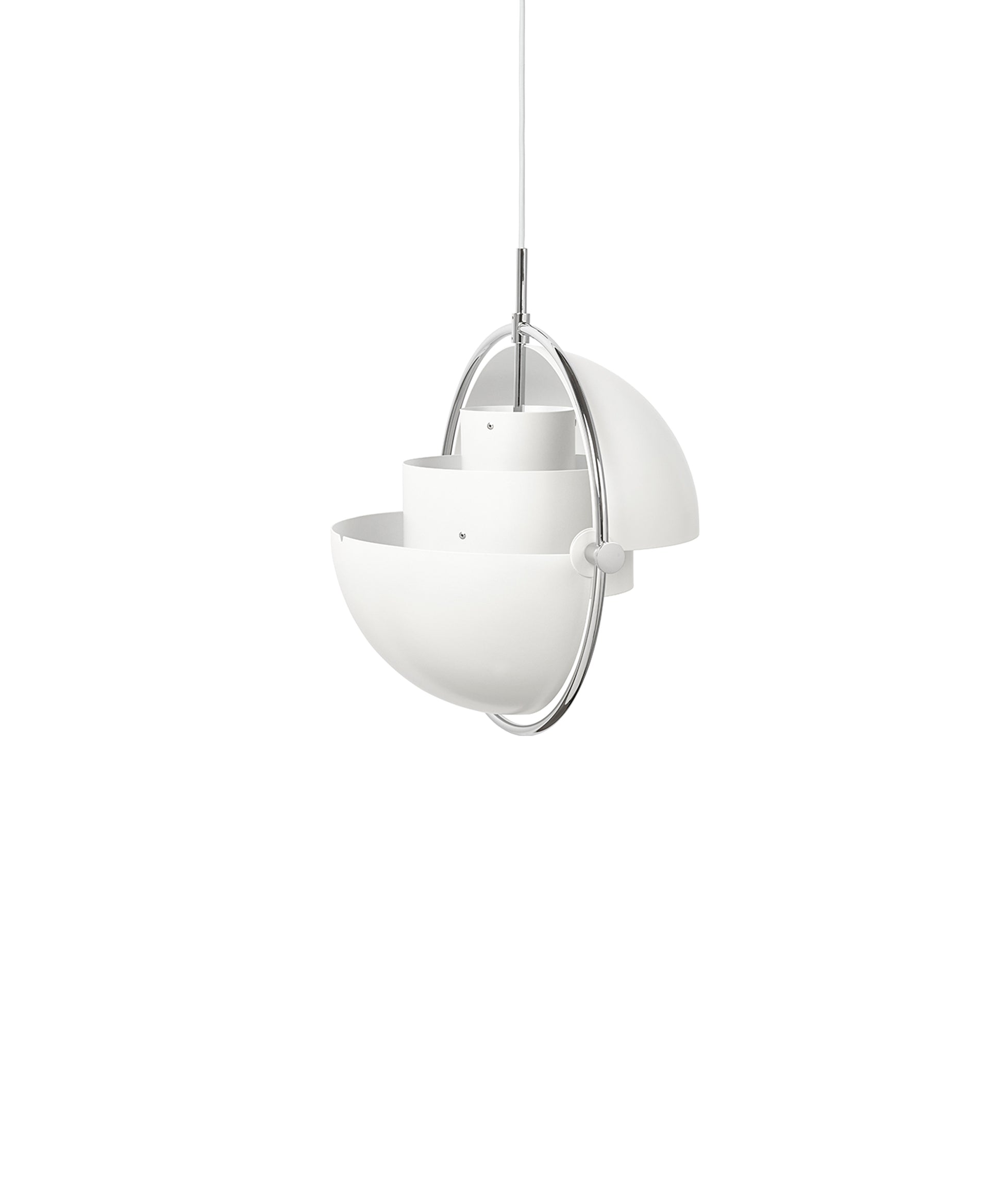 Composed of two individual rotating shades, the Multi-Lite pendant and can be transformed into multiple combinations for different directionality. The lamp is available in several colors, but all the shades are white lacquered inside.