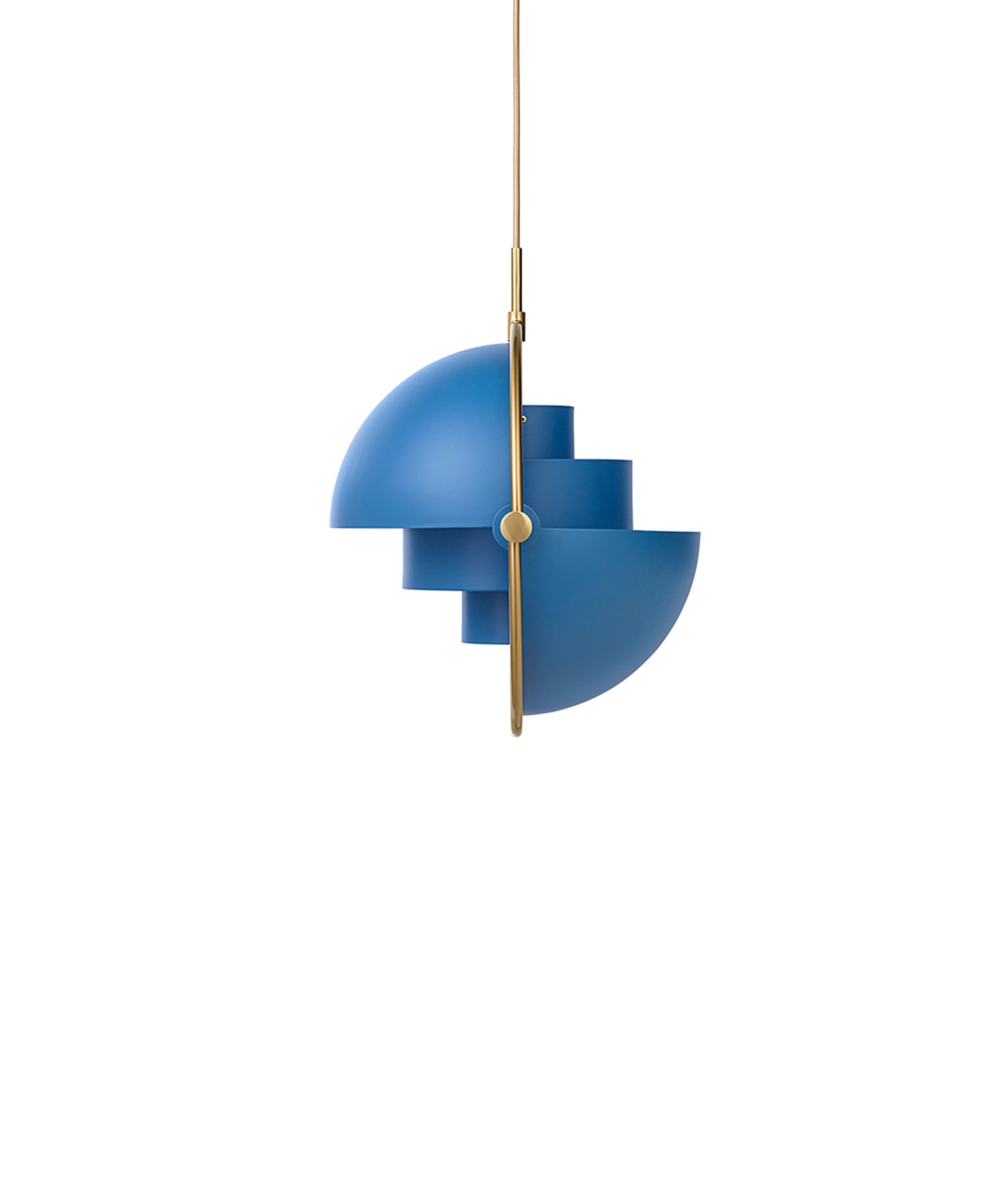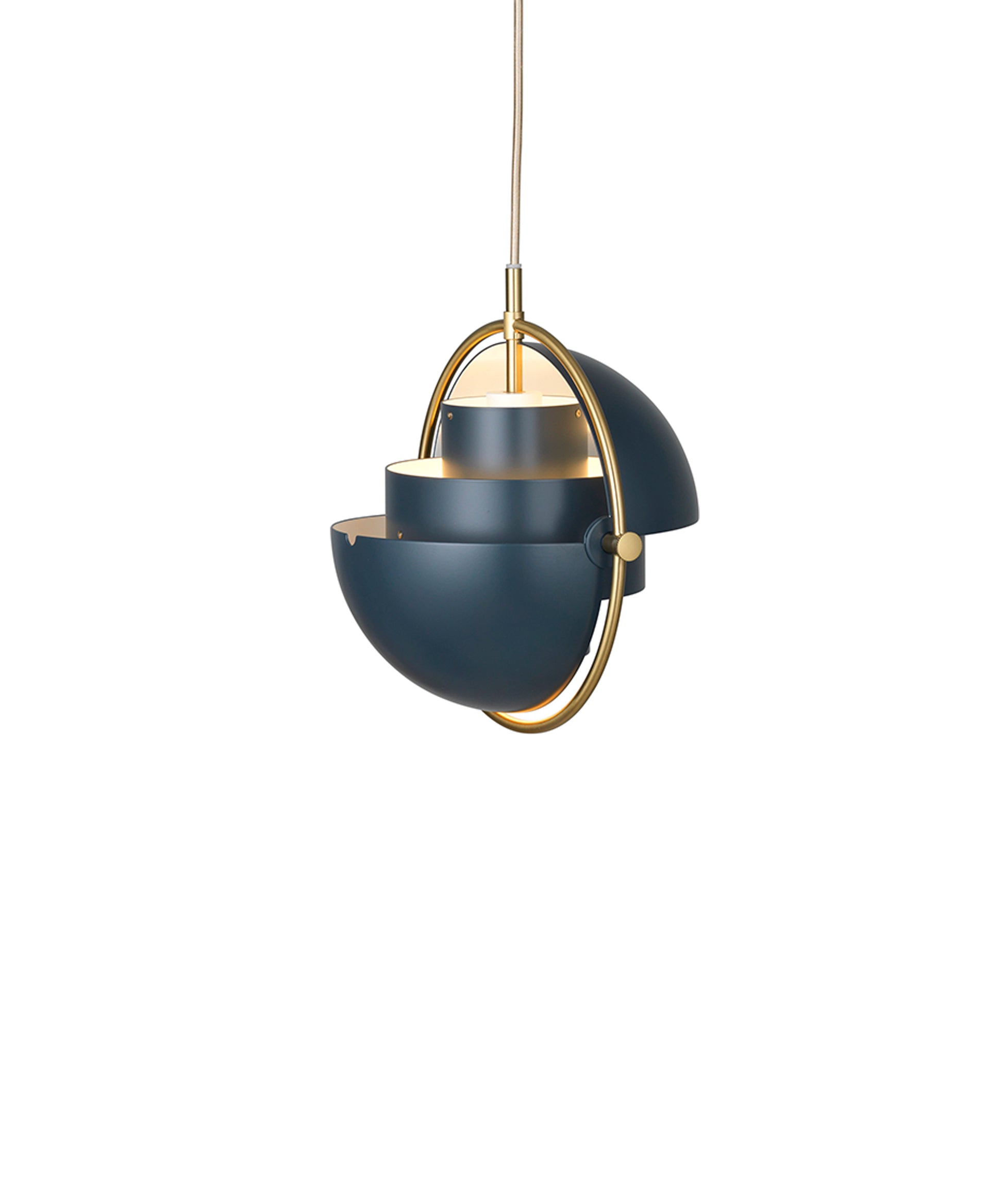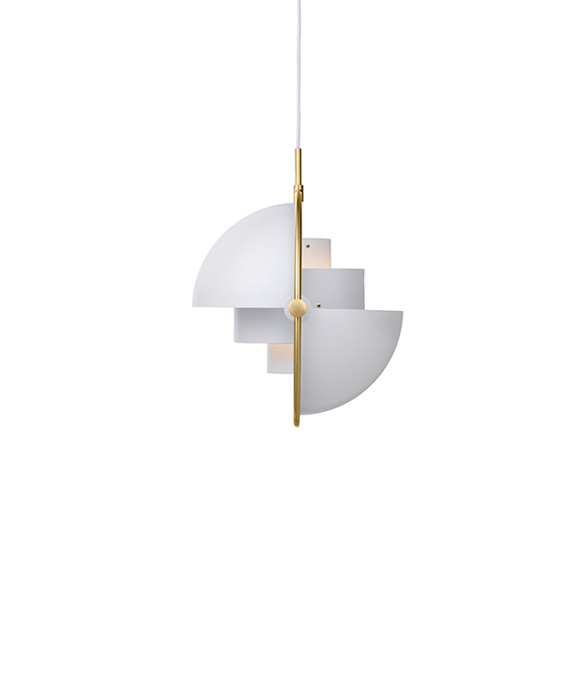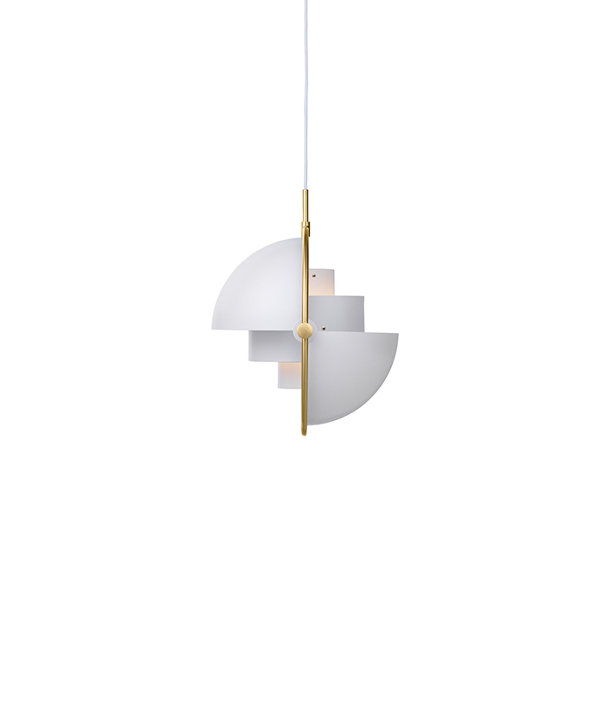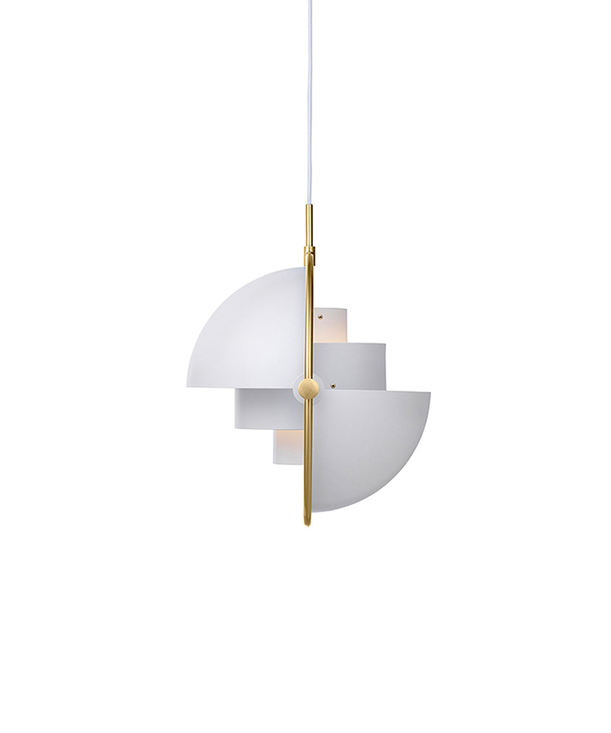 Composed of two individual rotating shades, the Multi-Lite pendant and can be transformed into multiple combinations for different directionality. The lamp is available in several colors, but all the shades are white lacquered inside.