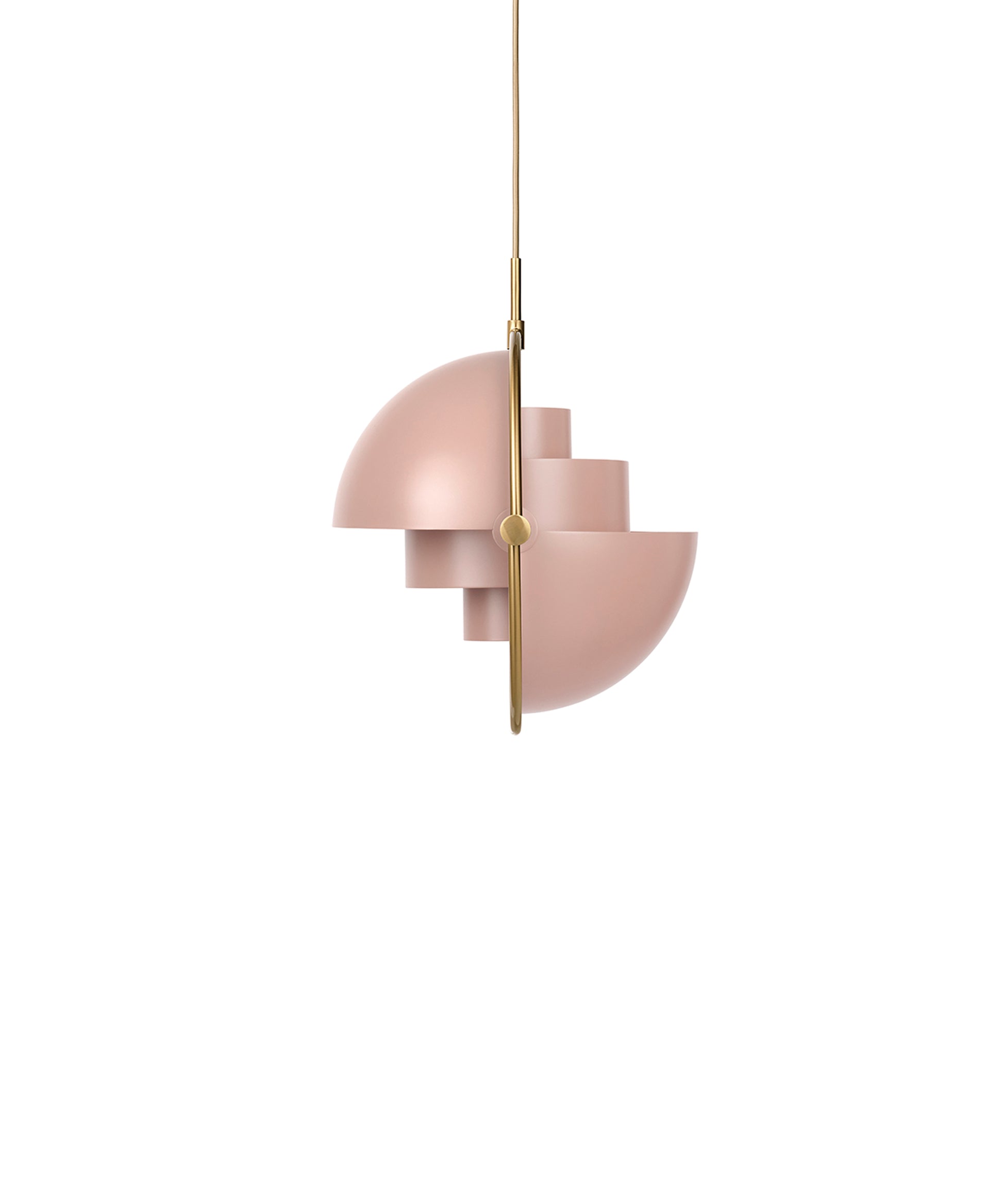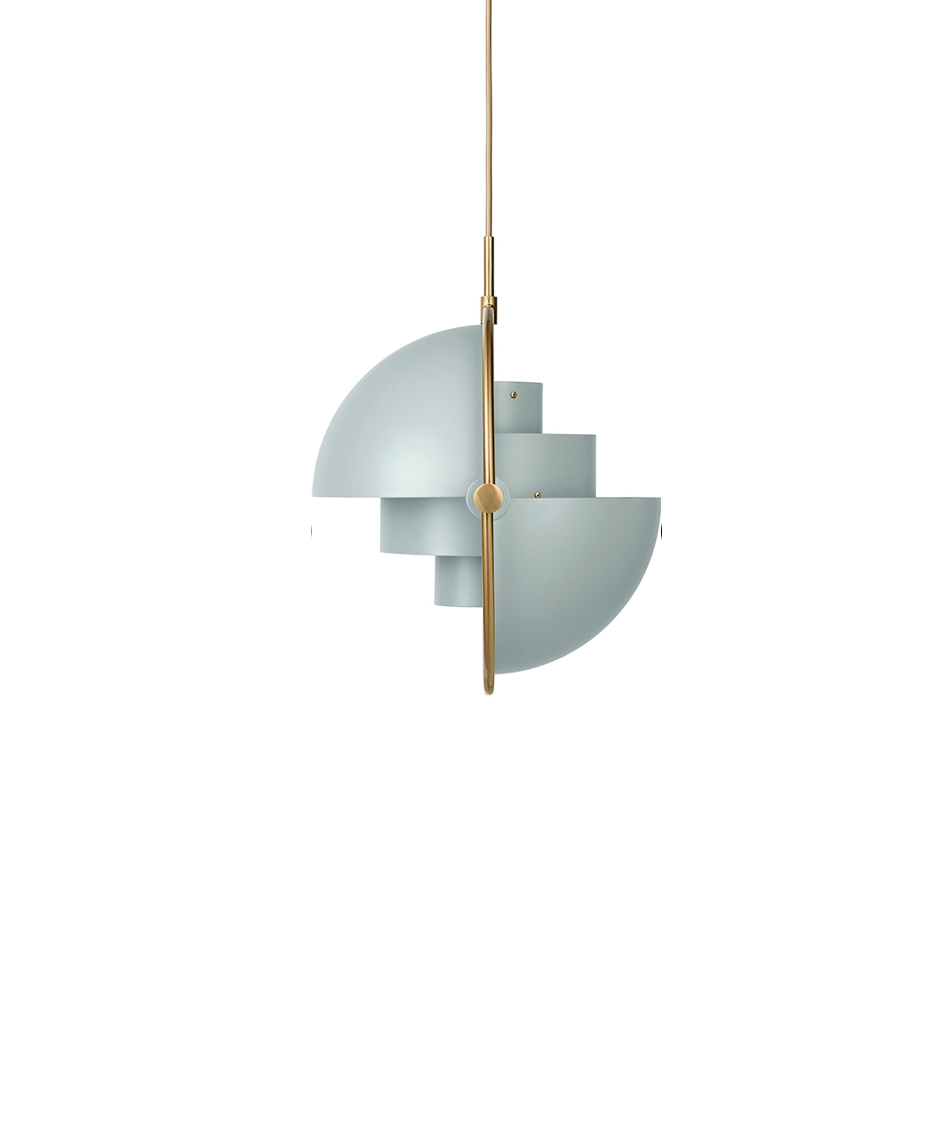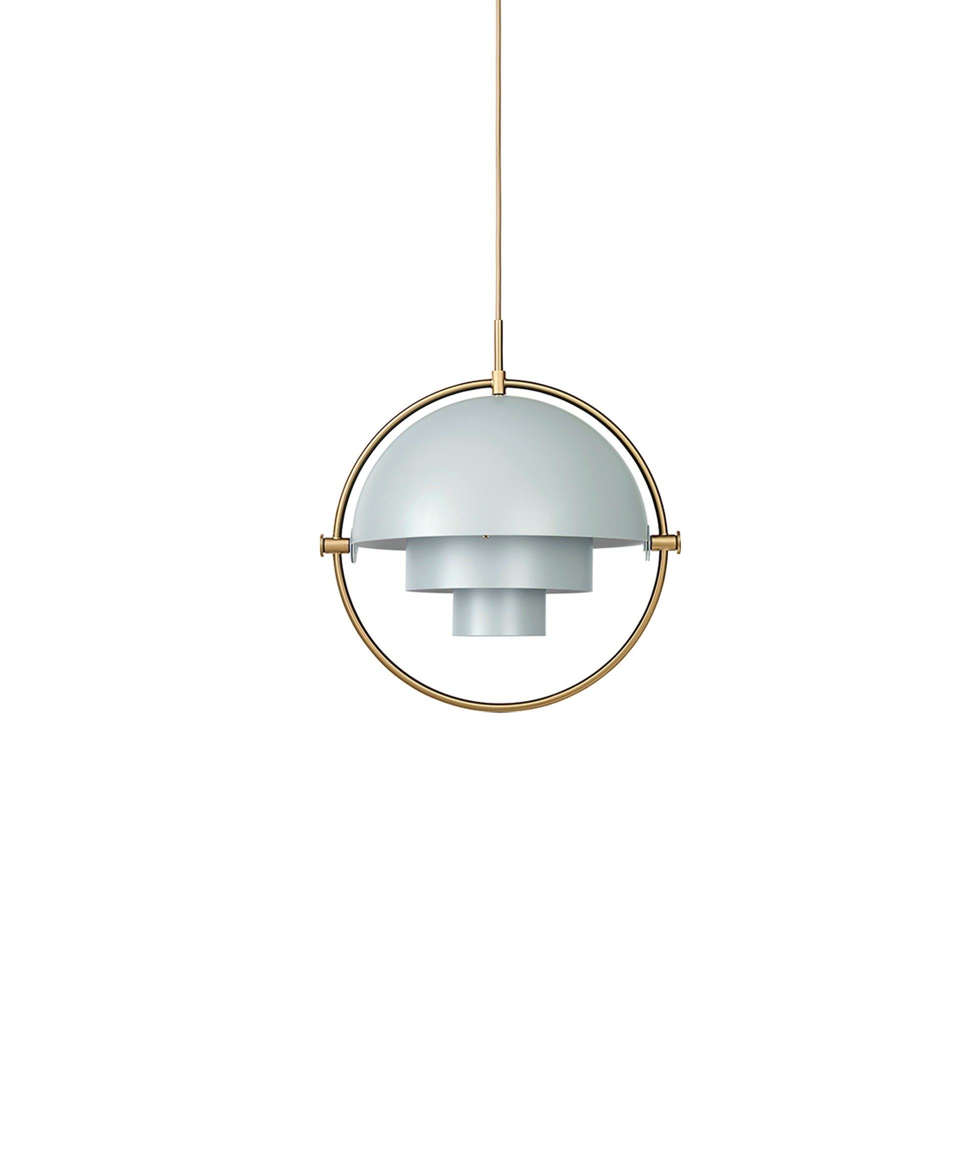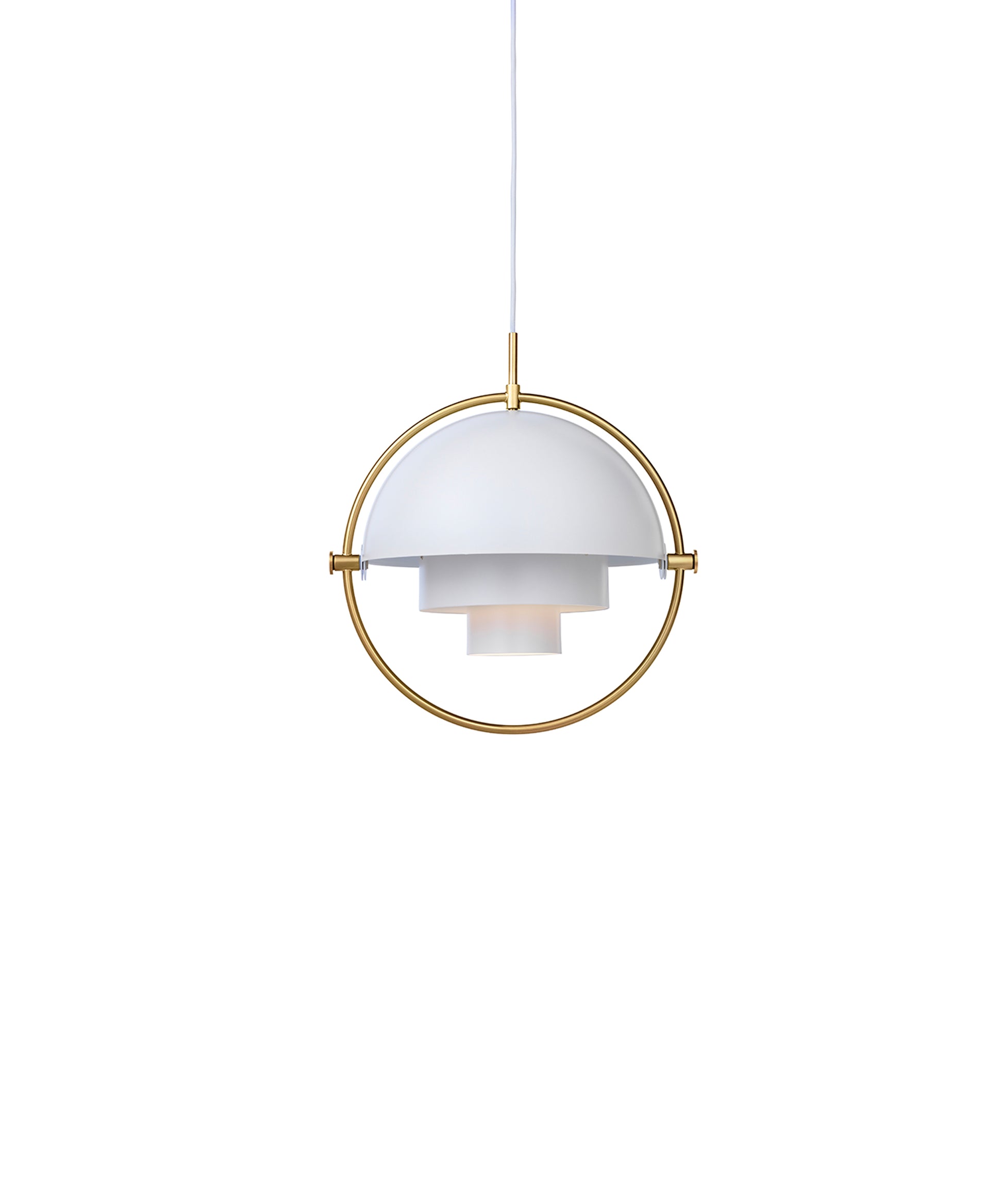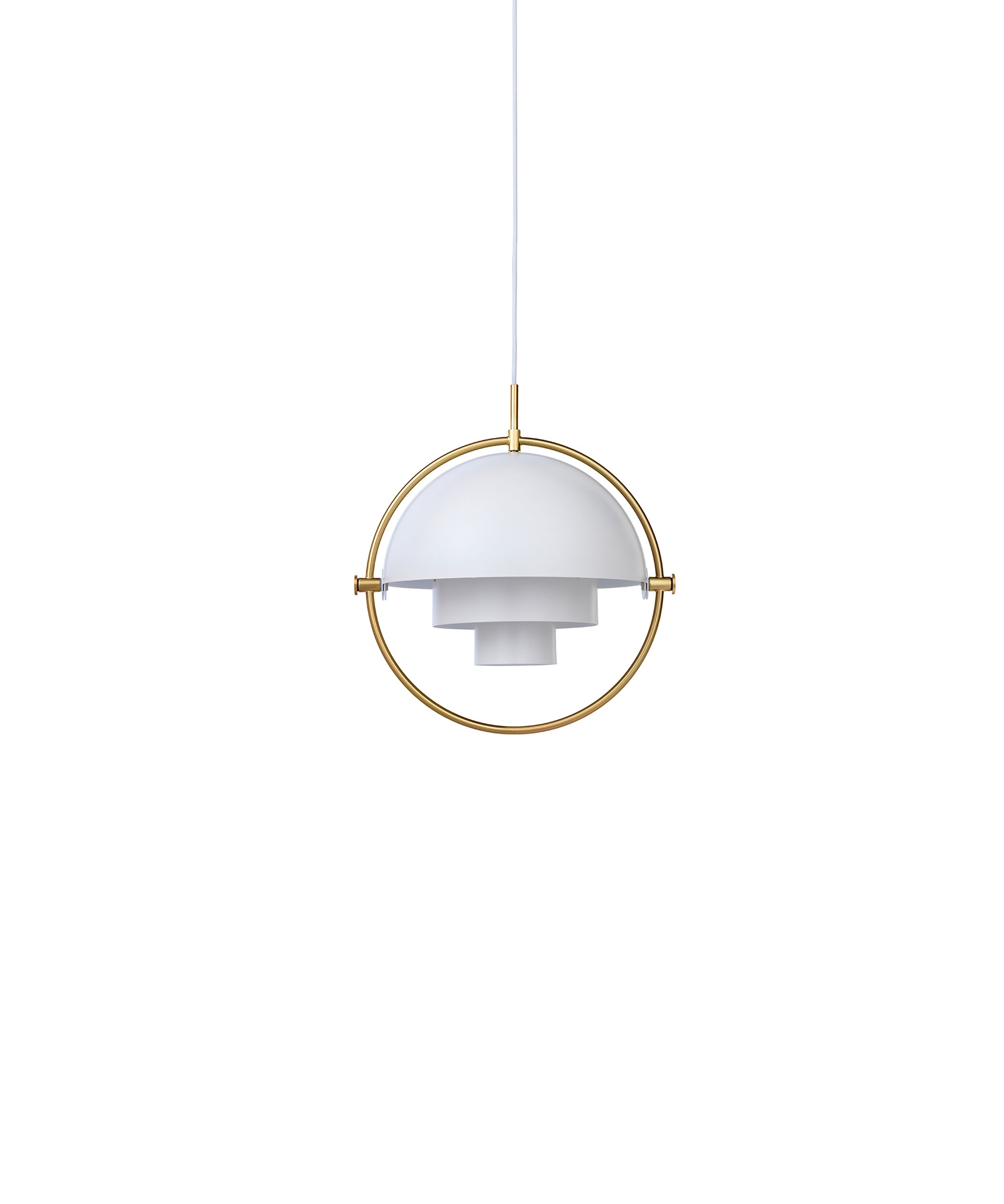 Composed of two individual rotating shades, the Multi-Lite pendant and can be transformed into multiple combinations for different directionality. The lamp is available in several colors, but all the shades are white lacquered inside.