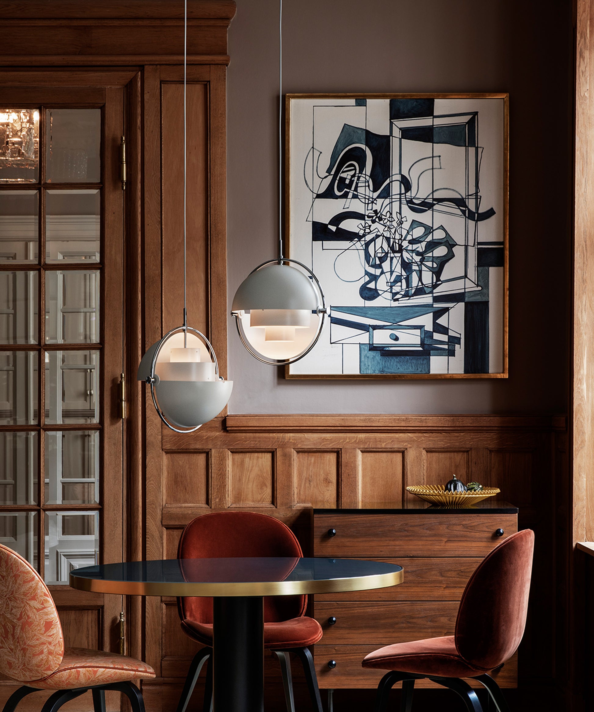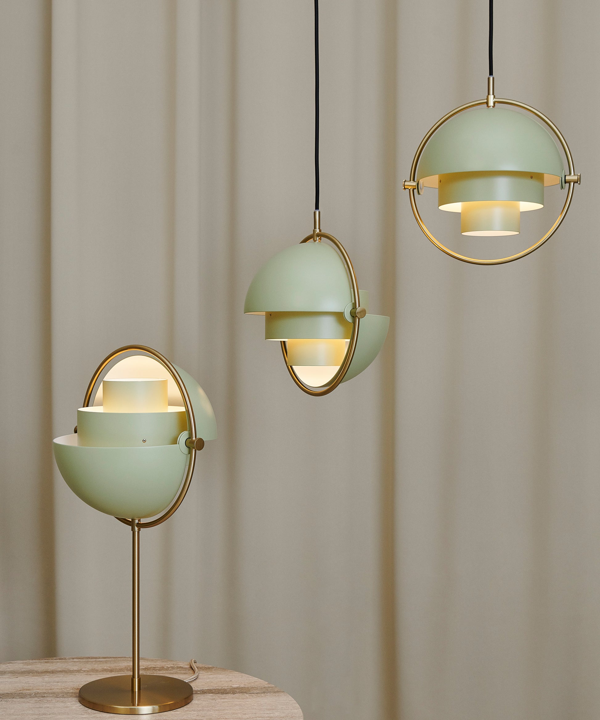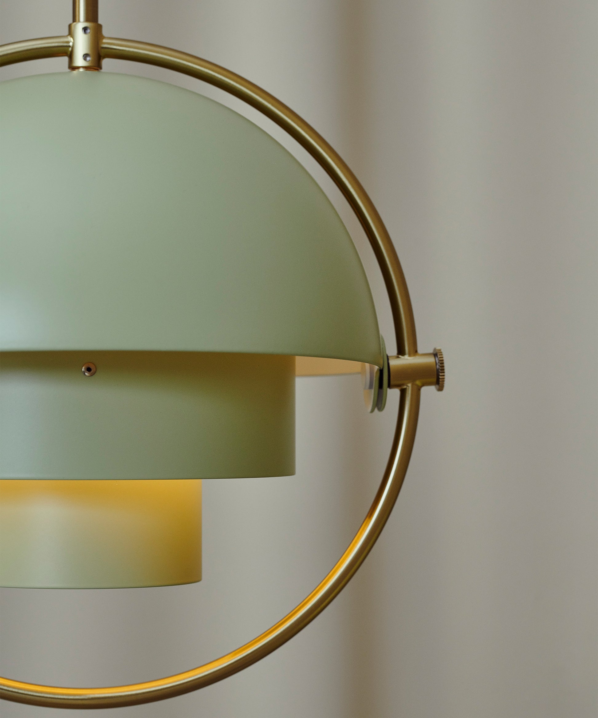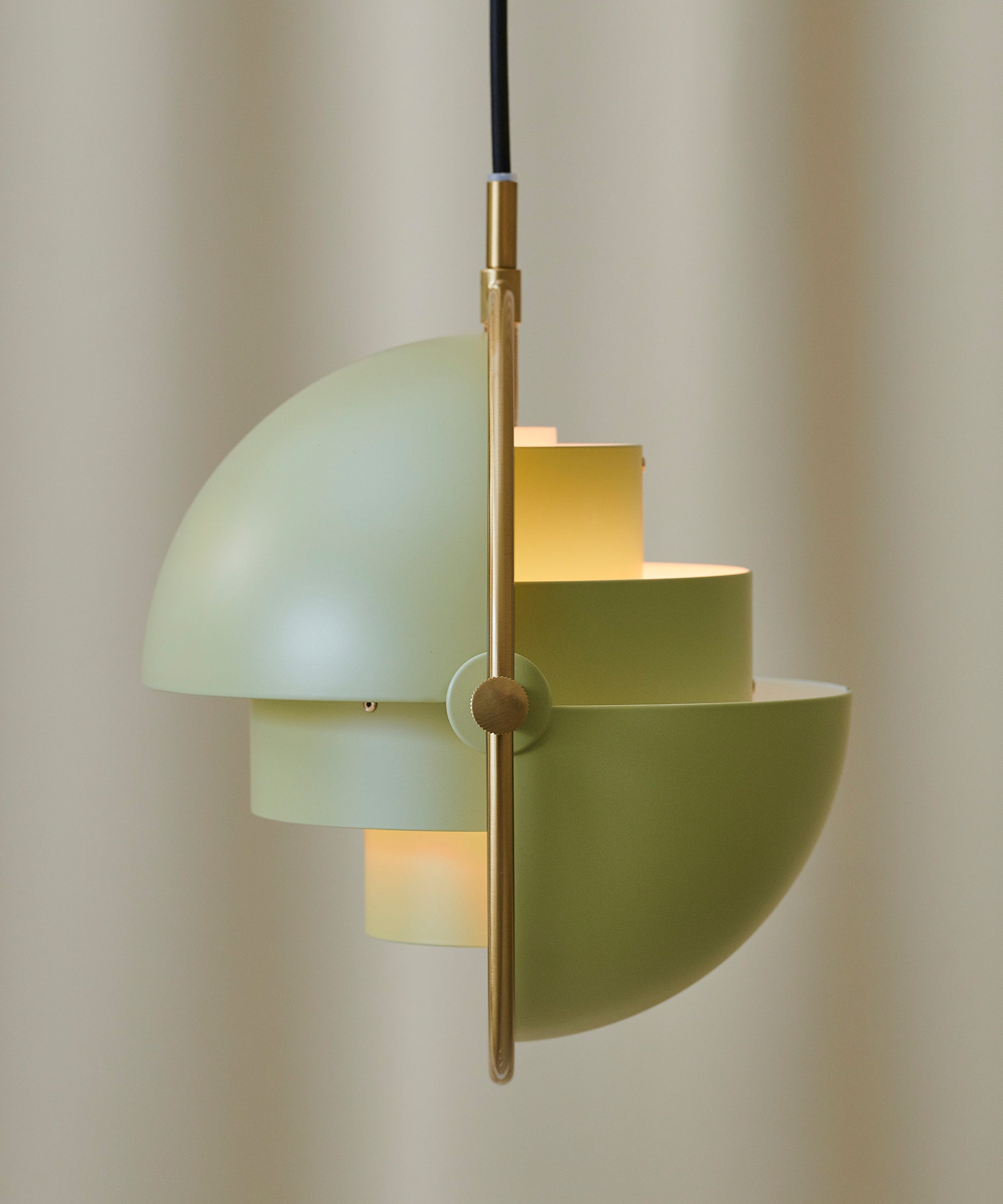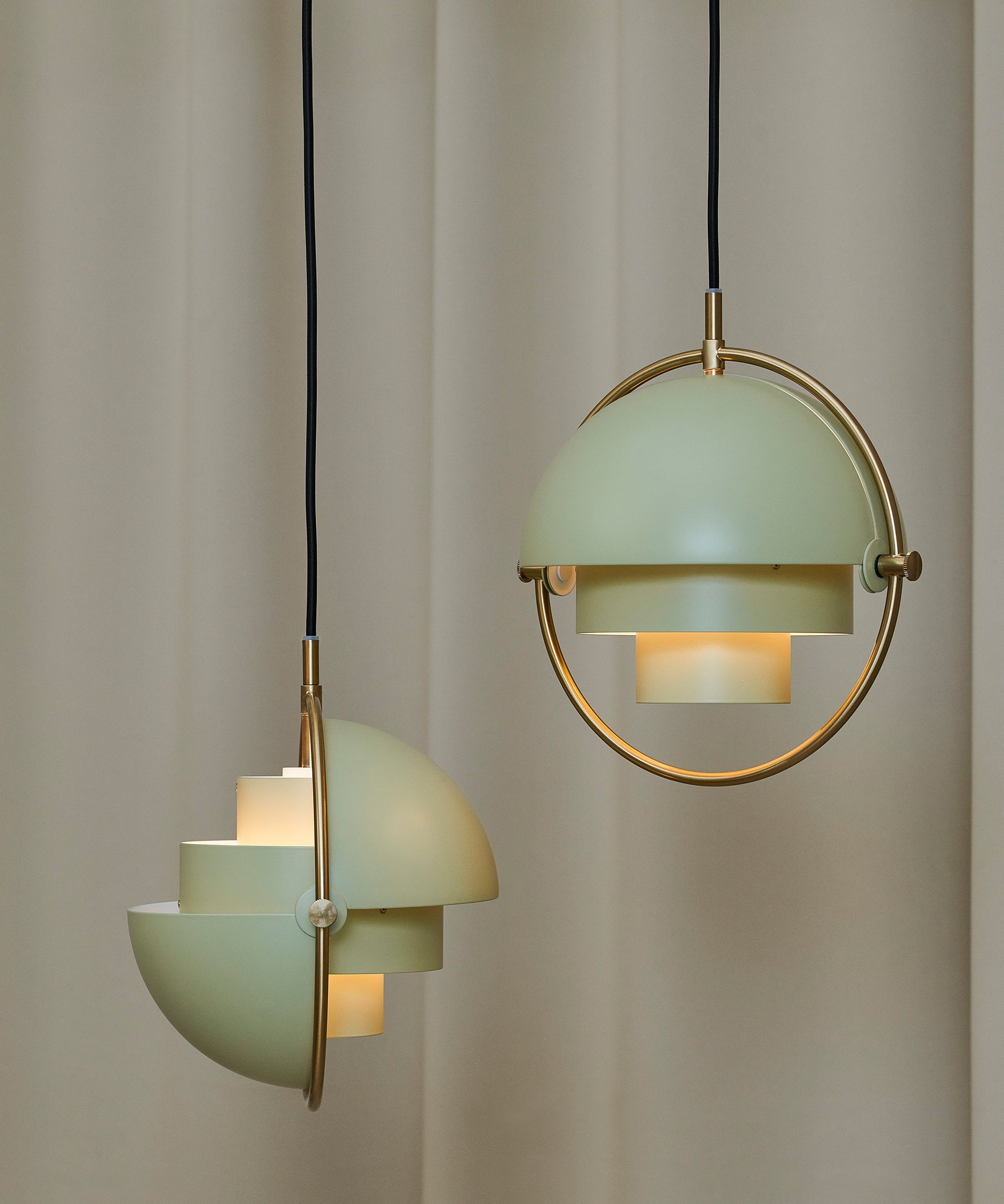 Composed of two individual rotating shades, the Multi-Lite pendant and can be transformed into multiple combinations for different directionality. The lamp is available in several colors, but all the shades are white lacquered inside.