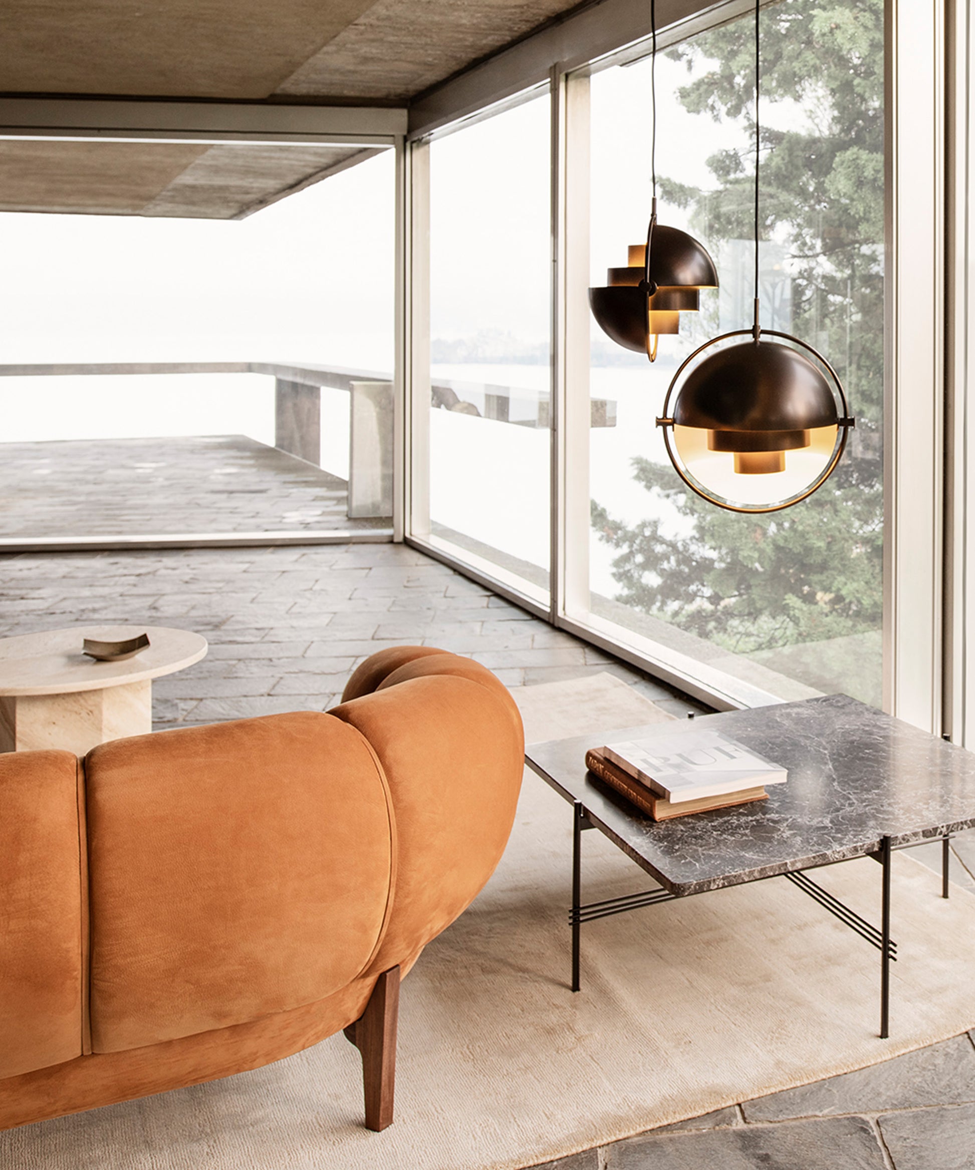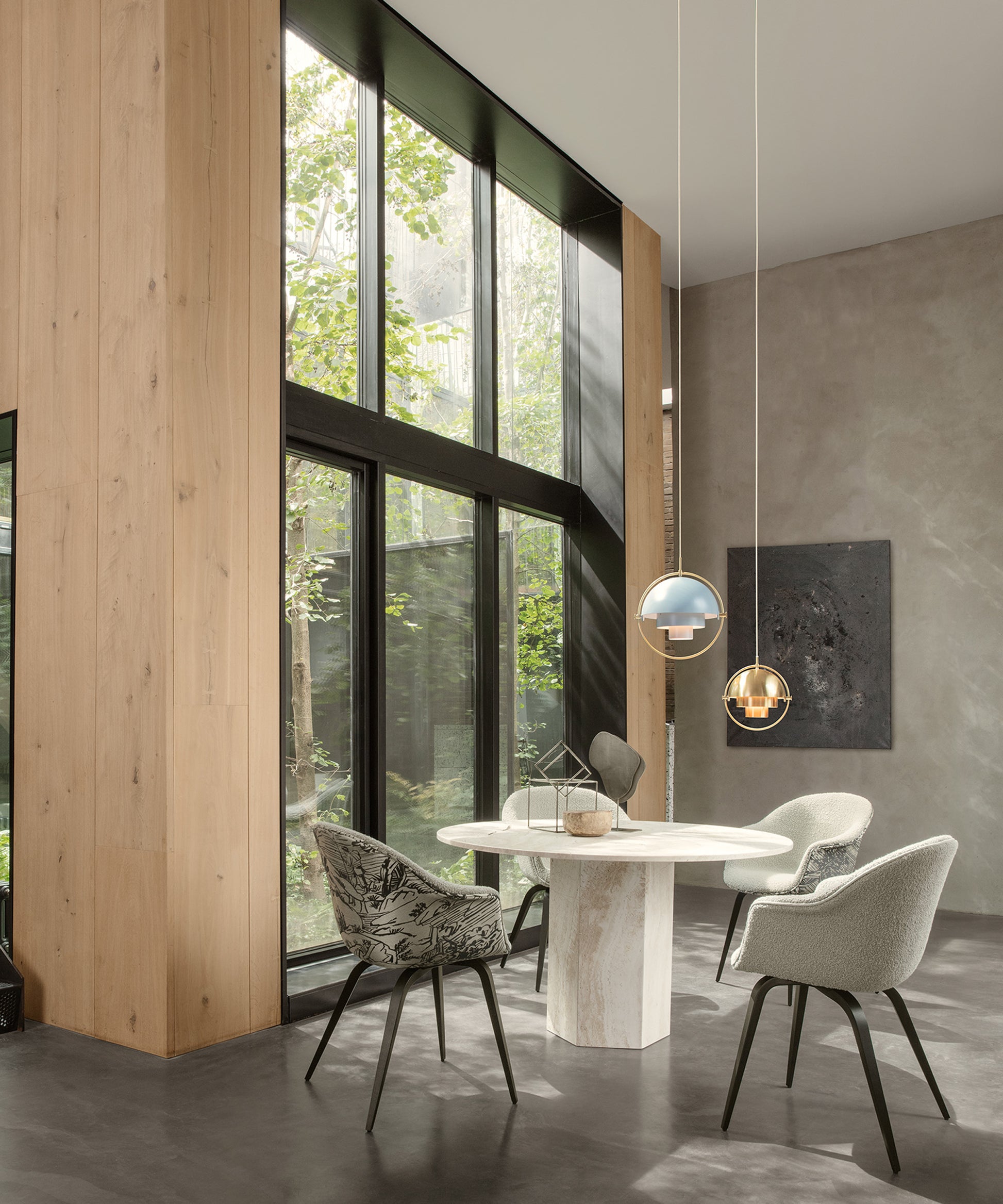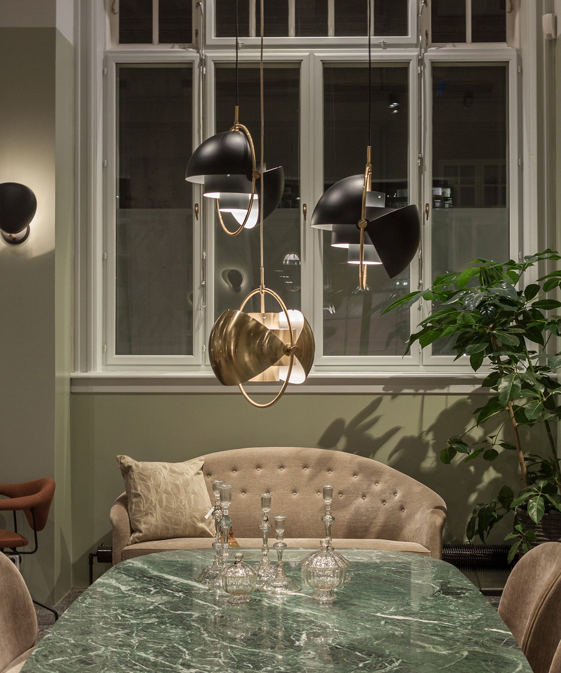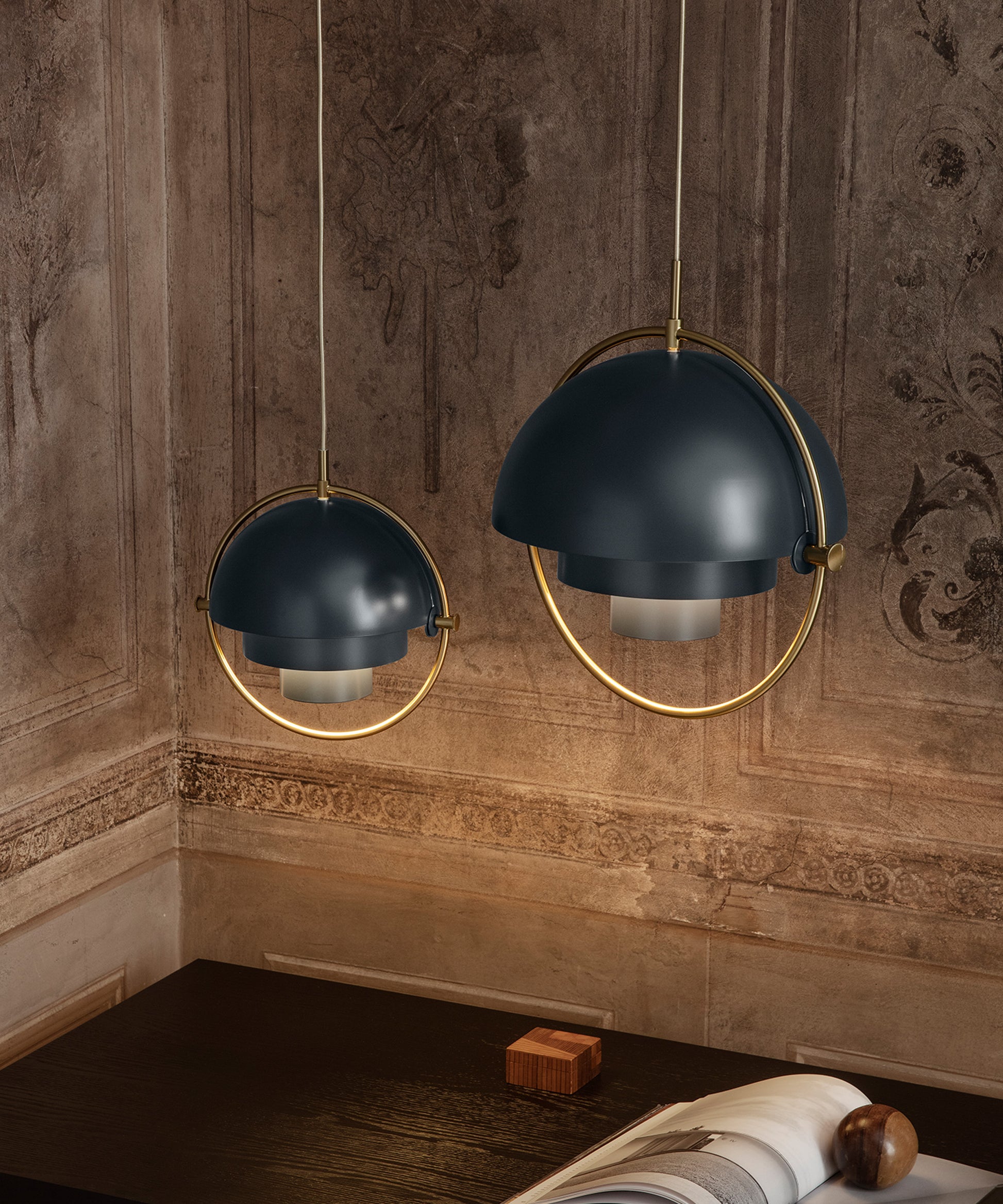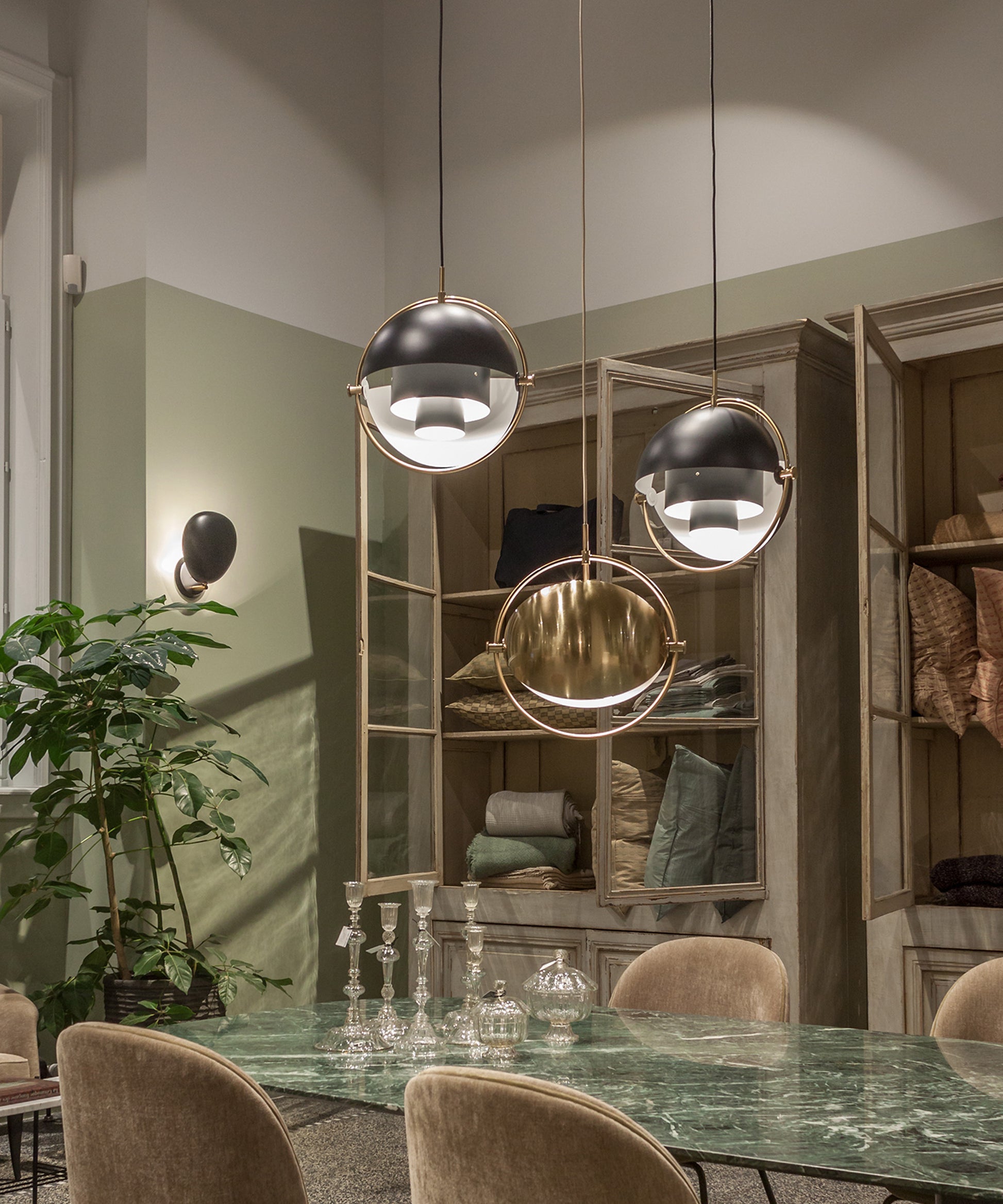 Composed of two individual rotating shades, the Multi-Lite pendant and can be transformed into multiple combinations for different directionality. The lamp is available in several colors, but all the shades are white lacquered inside.