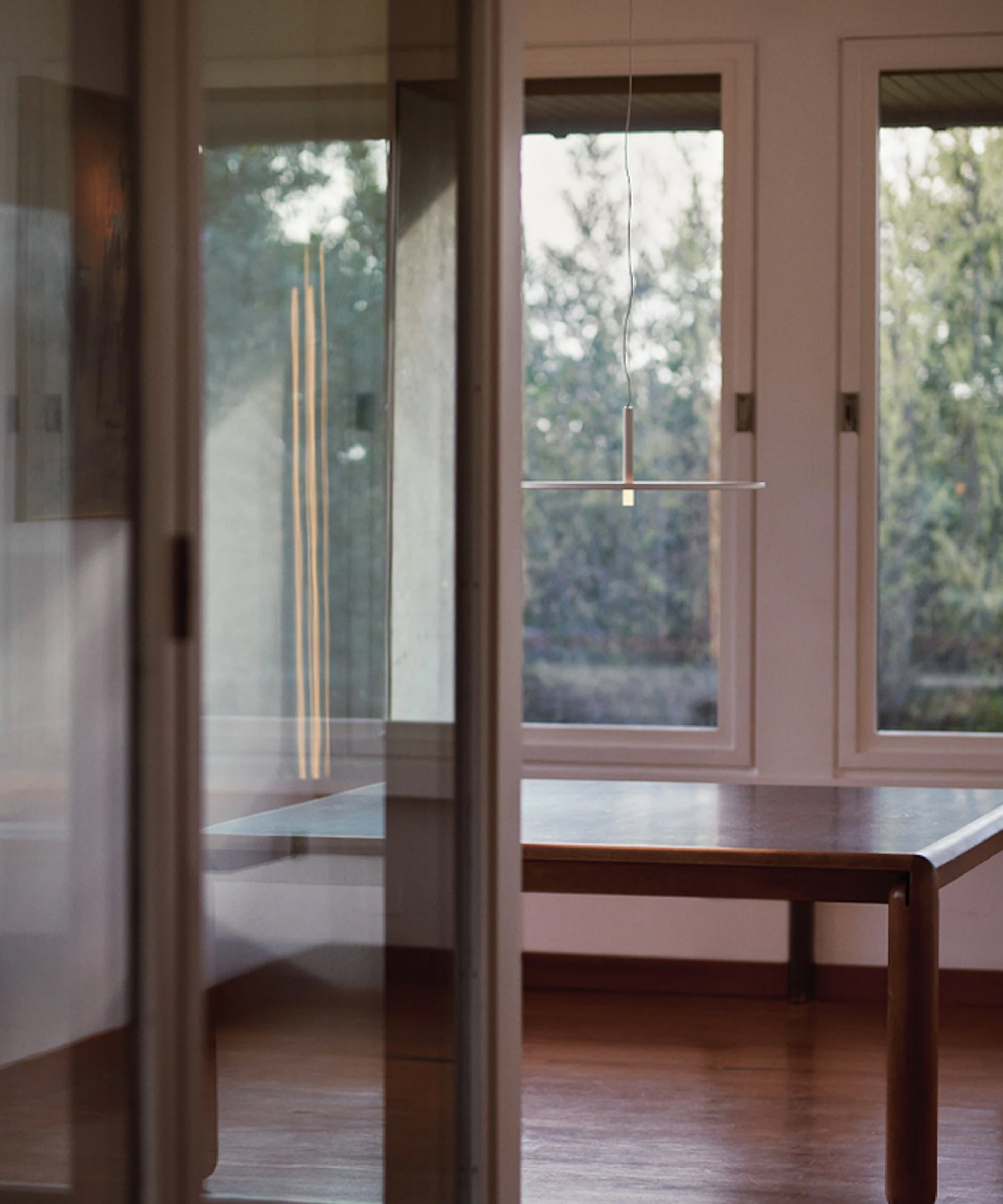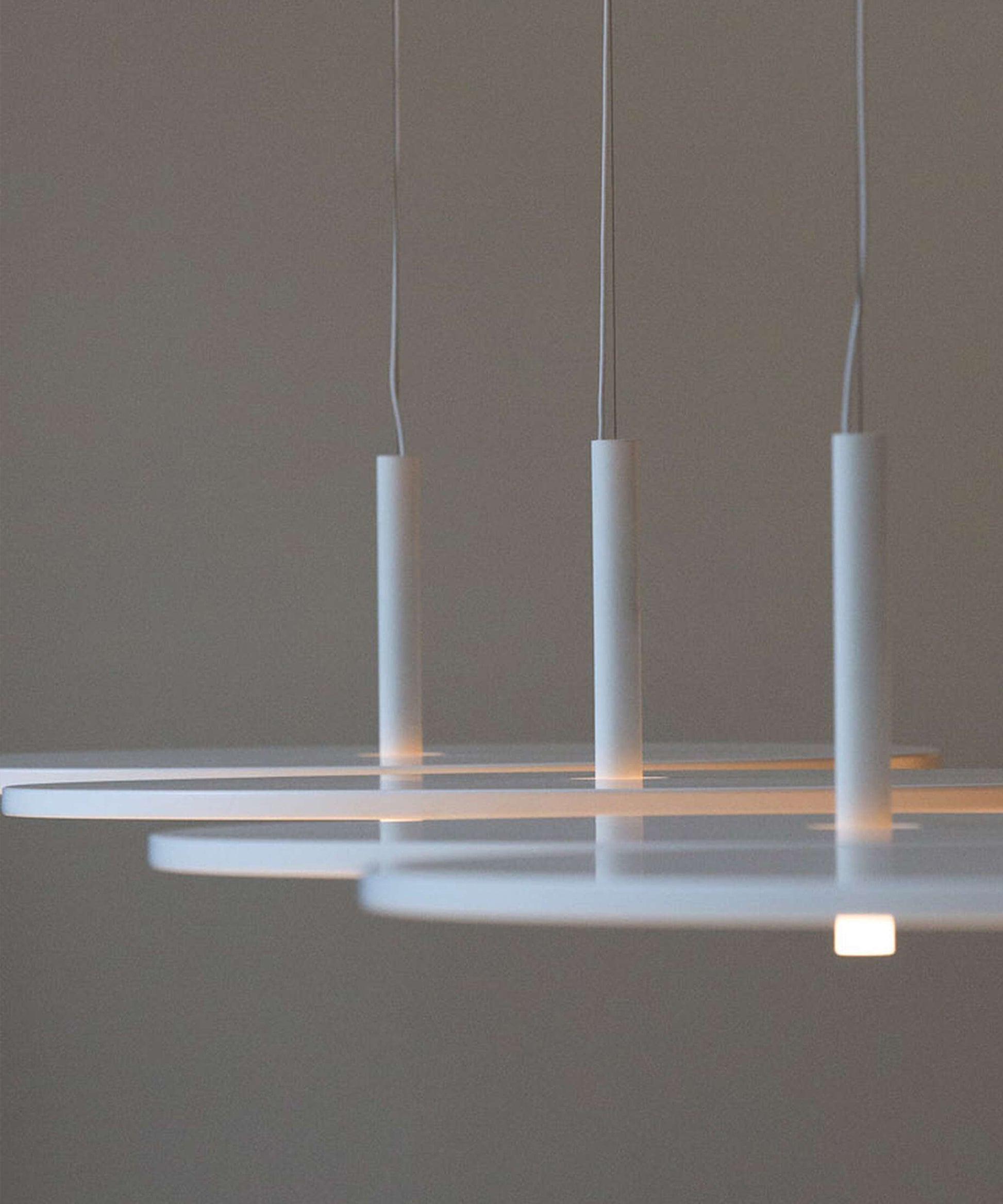 Matte white painted aluminum body with polycarbonate stem. Silk-screened PMMA diffuser. Edge Lighting technology light source (CRI 95 90) and adjustable brightness 10–100%. Usable power cable length of 300 cm to be connected to a canopy with a matte white finish. The canopy has to be ordered separately, the electronics integrated with the canopy enable the use of dimming systems: PUSH dimming, 1-10V, and DALI.