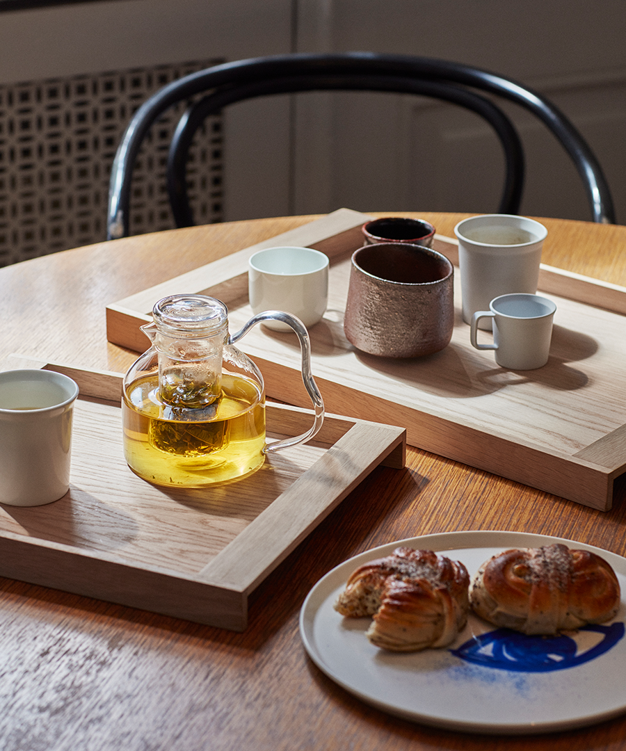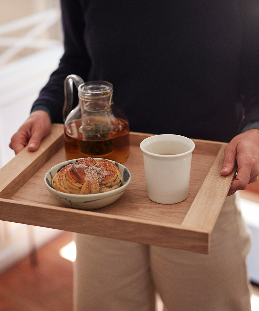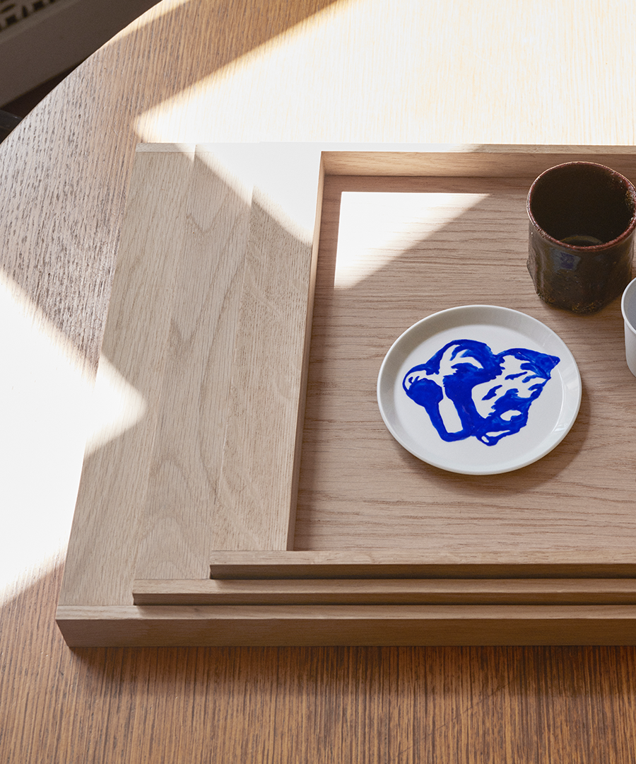 No.10 is inspired by the original Japanese banjyu trays, which are used to transport and serve the traditional confection manjū. The name, No.10, is a play on words based on the pronunciation of ban and jyu. Use it as a serving tray or set it directly on the table as a platter with small bowls of food.