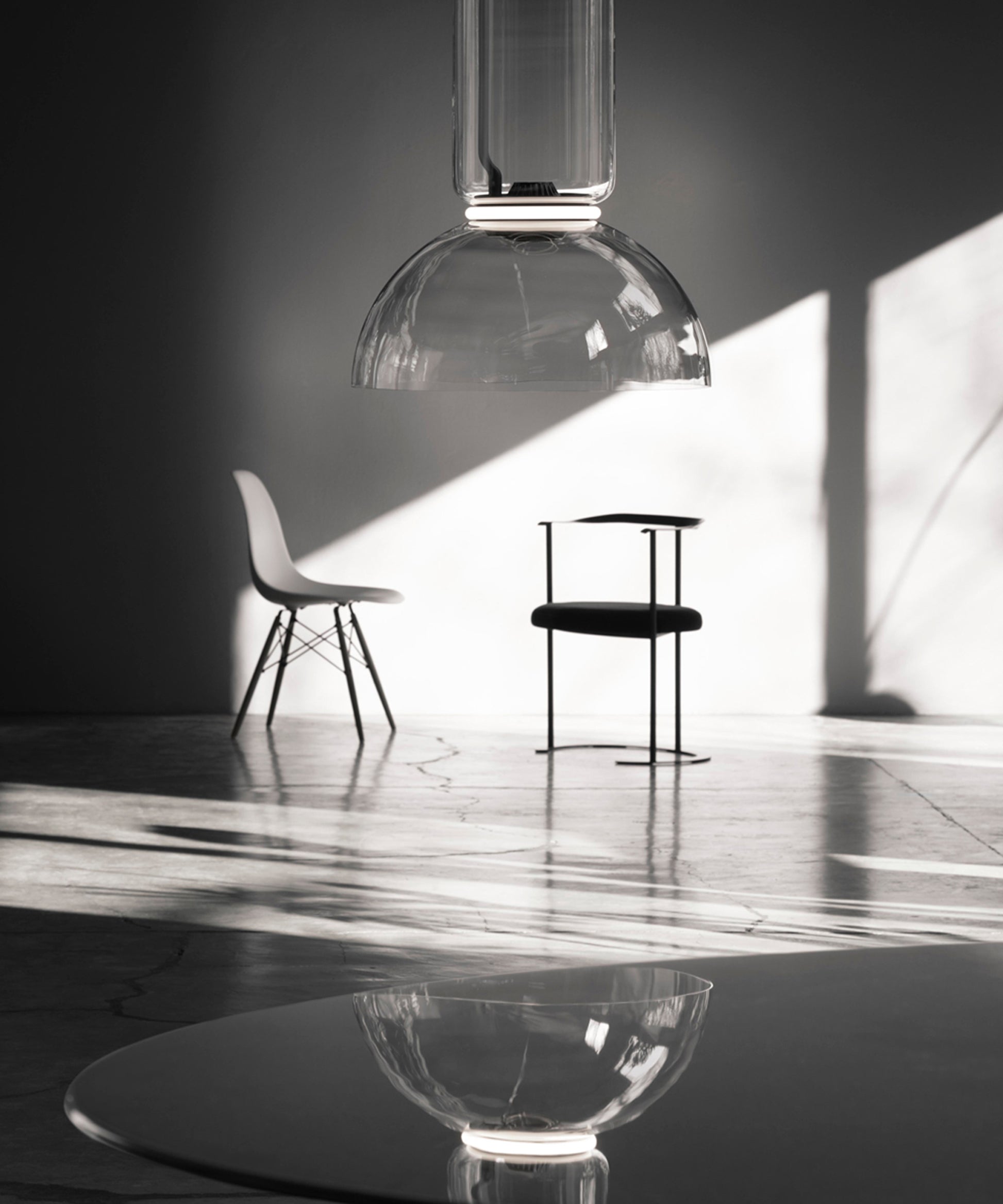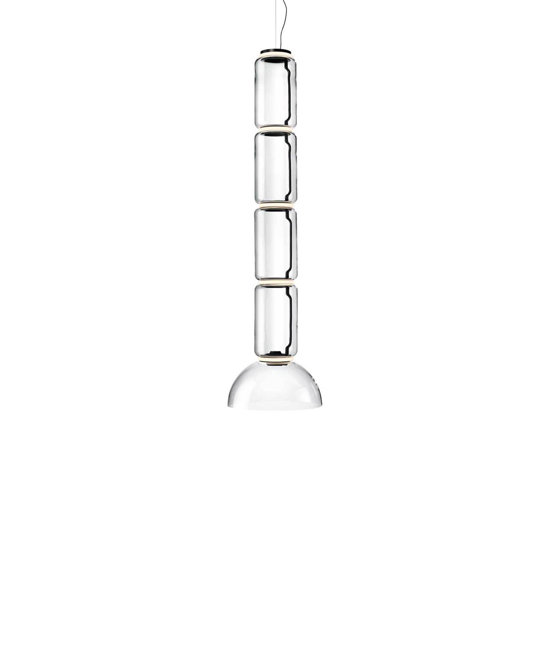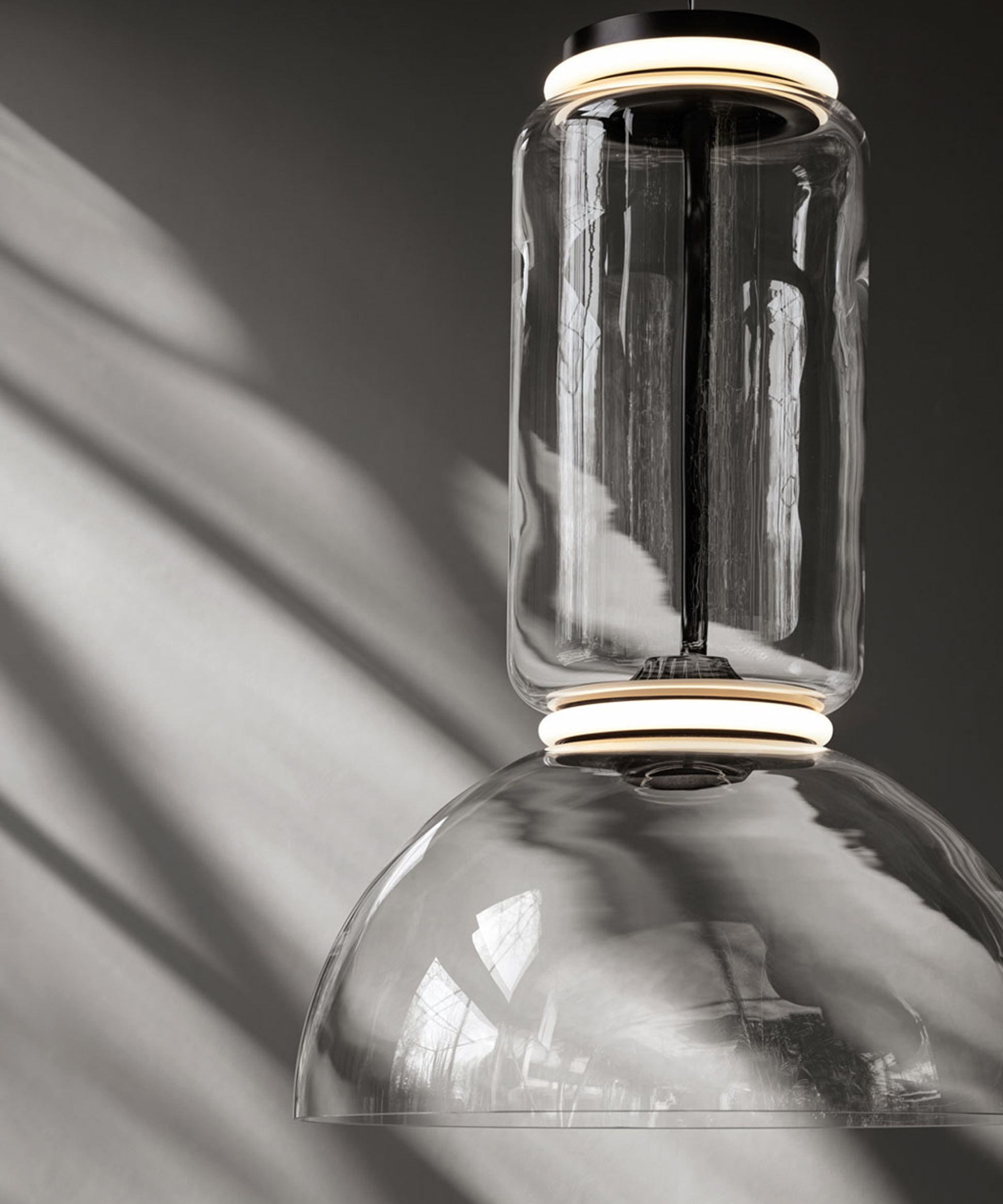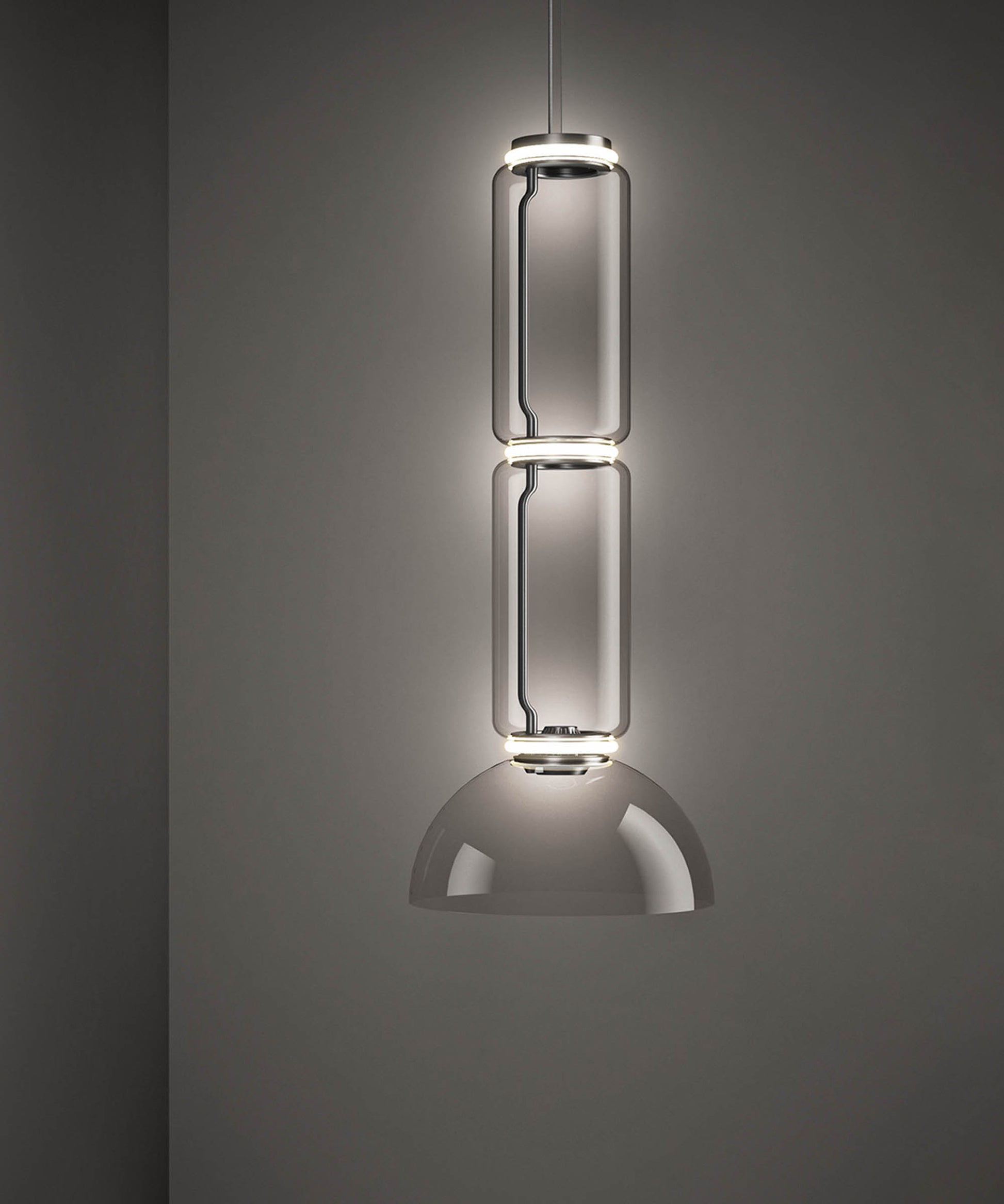 A transparent hand-blown glass cylinder, surrounded on both top and bottom by discrete LED technology, is the foundation of this product. The fixtures built from these units form columns of light at varying heights that illuminate at the intersection between each module. Configurable as a hanging or standing lamp, the Noctambule pendant lamp features additional components that allow for numerous options. The cylindrical body is available at a low and high heights, and a dome- or cone-shaped head can be selected if a more direct light source is desired. Dimming capabilities can be configured in the power supply unit within the ceiling rose or as a pedal panel on the power cord. The inspiration behind the design: Inspired by night owls, Noctambule features a transparent body that almost blends into a room when unlit, but makes its presence known when it illuminates at night. Discover the entire collection of this magical award-winning collection of cylindrical LED dimmable modern lights.