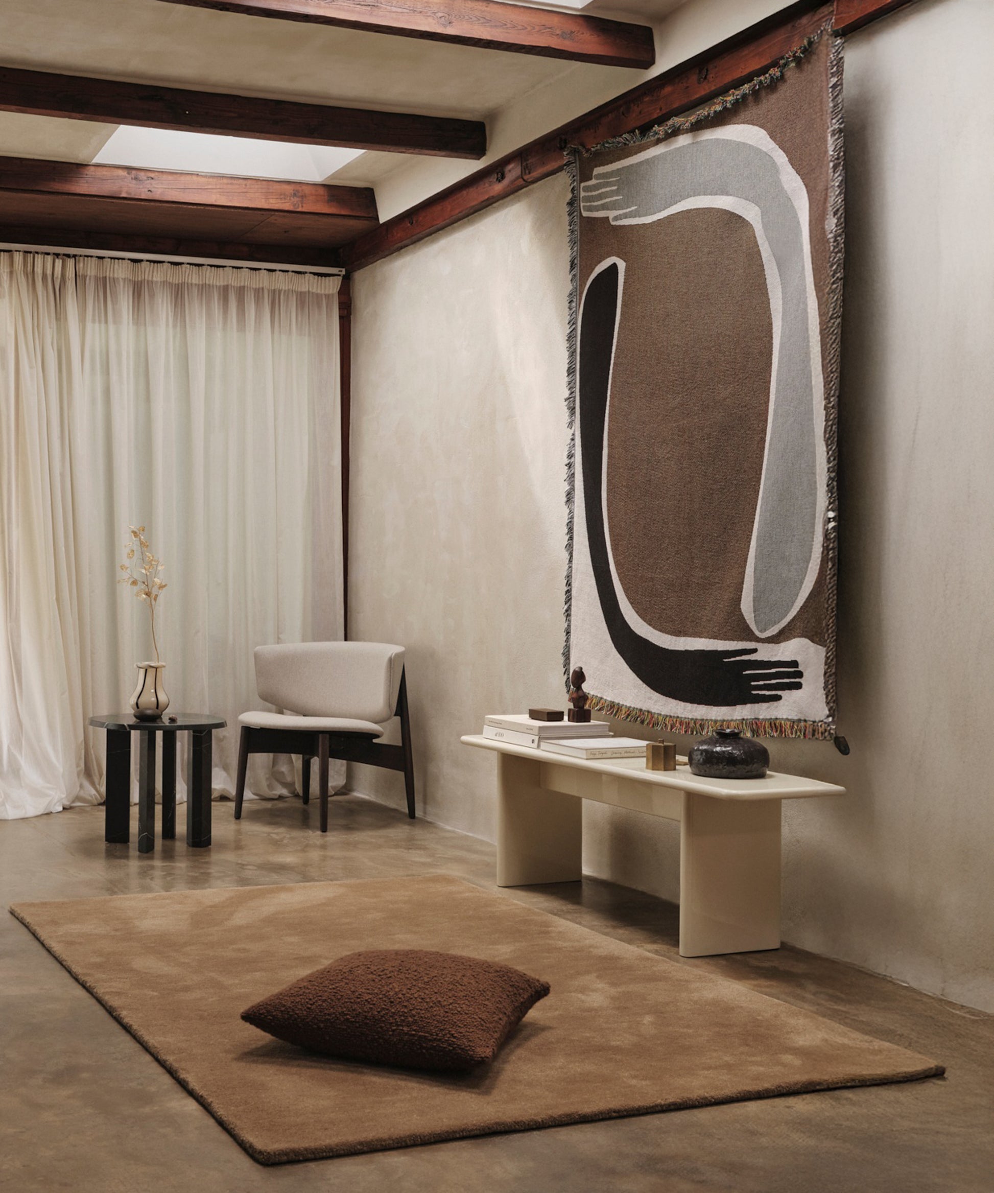 • The Pose Tapestry Blanket features stylised arm motifs inspired by ancient ‘clappers’: percussion instruments shaped like forearms that symbolise human connection, creativity, and expression.