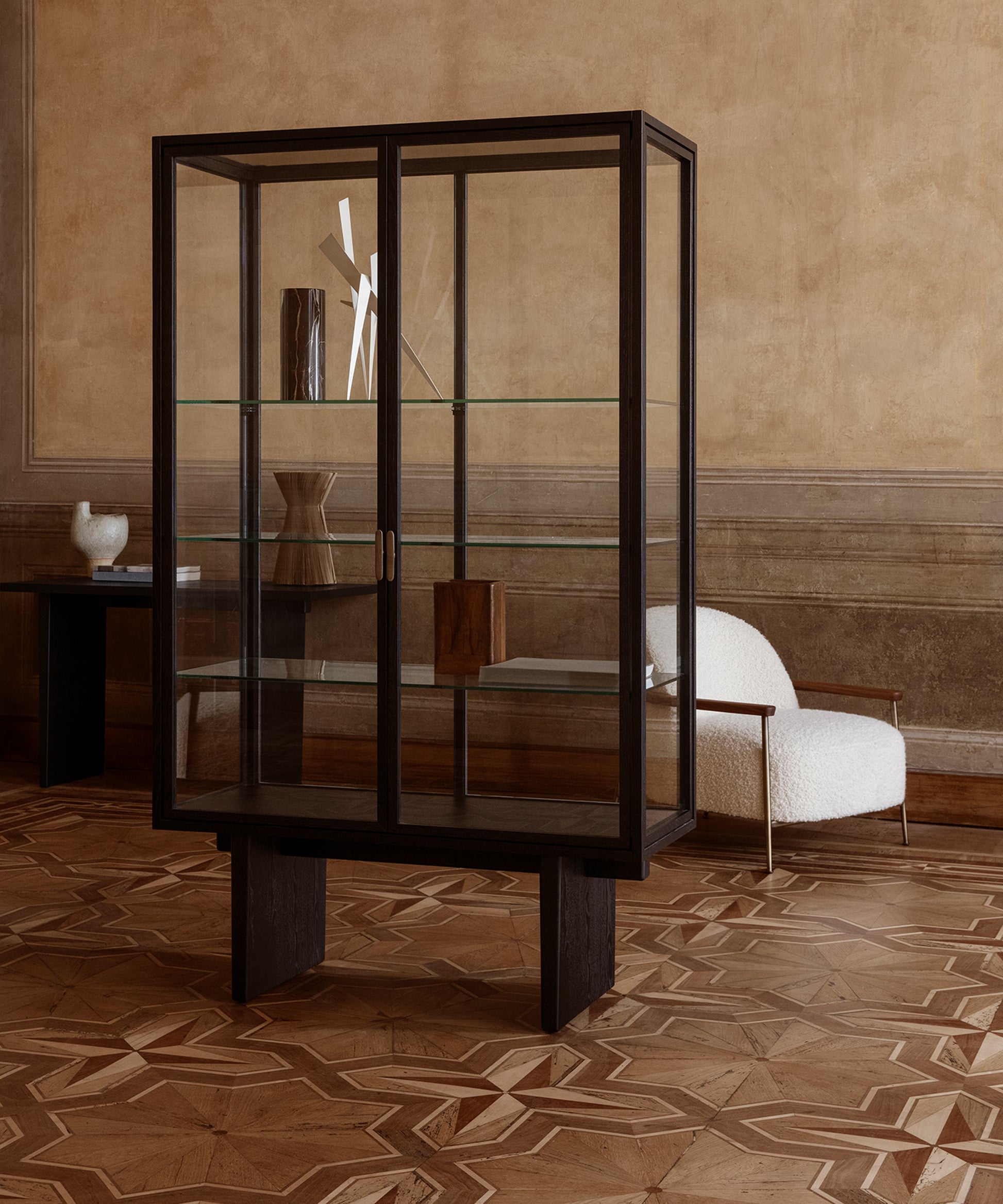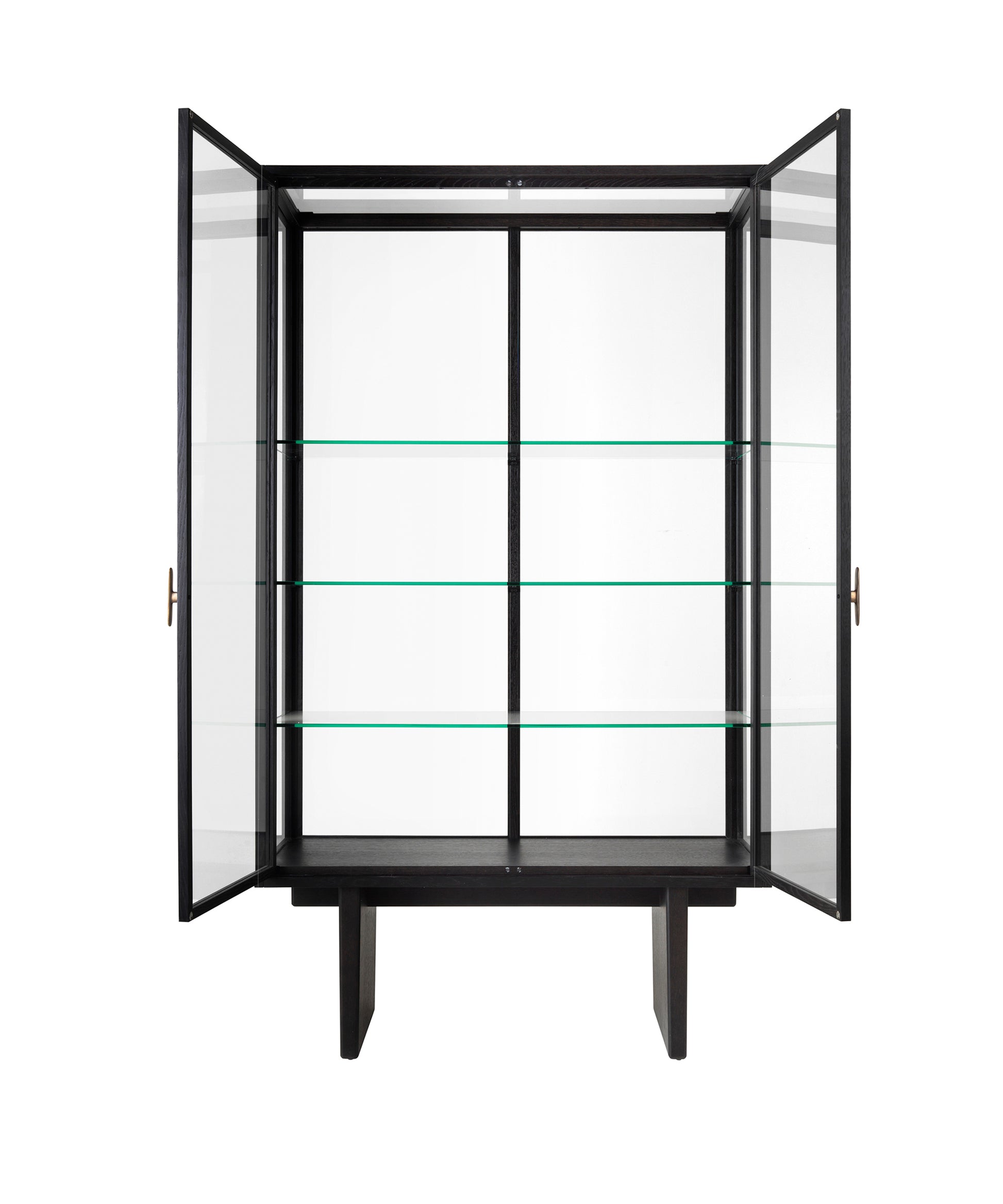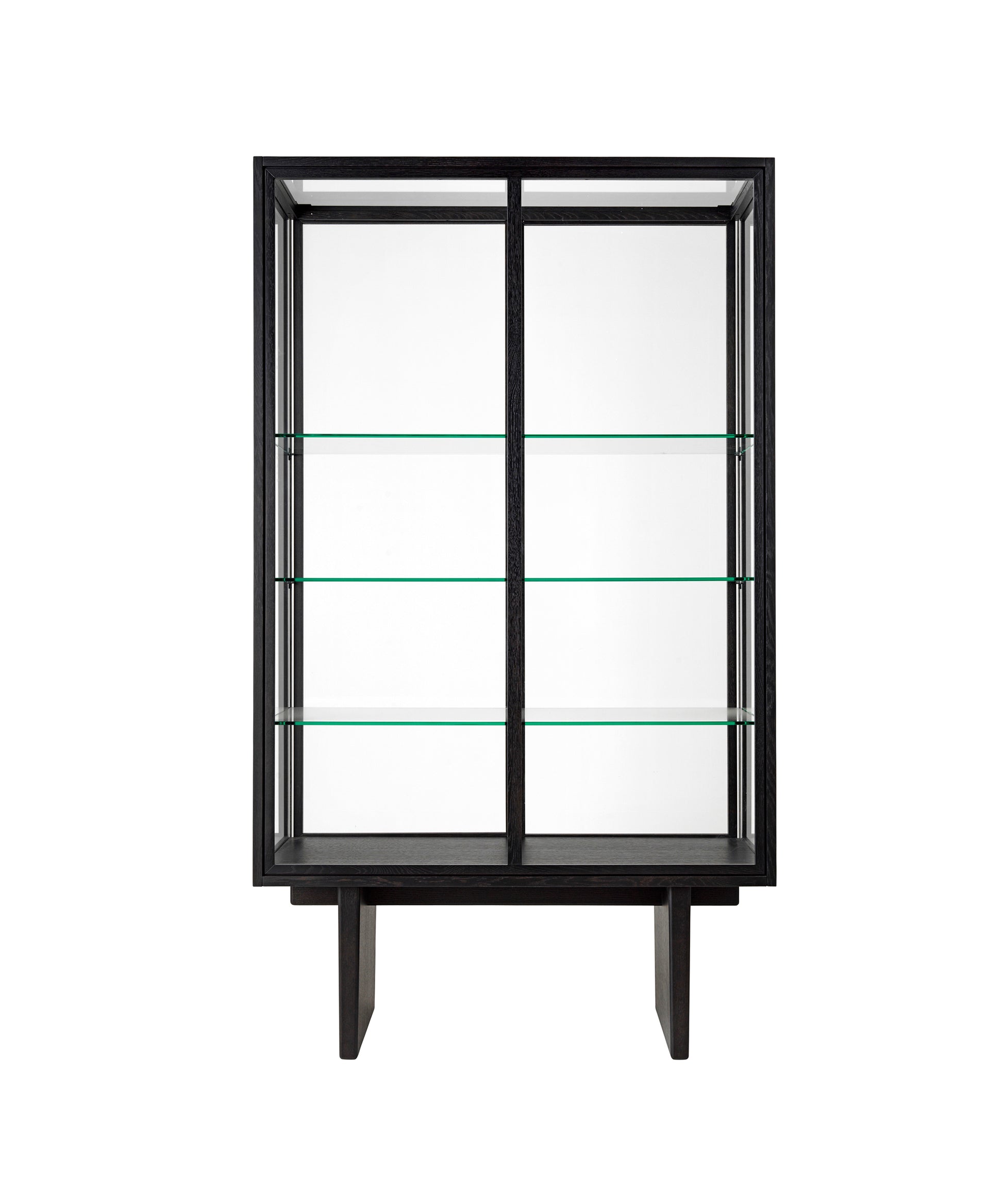 Inspired by antique Japanese furniture in both style and craft, this oak-veneered cabinet is elevated by two vertical legs, providing a lightness to its appearance and an understated elegance to its form. The frame secures a tall glass case, with three glass shelves, and two perfectly-aligned glass doors, completing the overall impression of lightness and transparency. Its very simplicity means the Private Vitrine can be used to store and display many types of possessions, from books to precious ornaments.