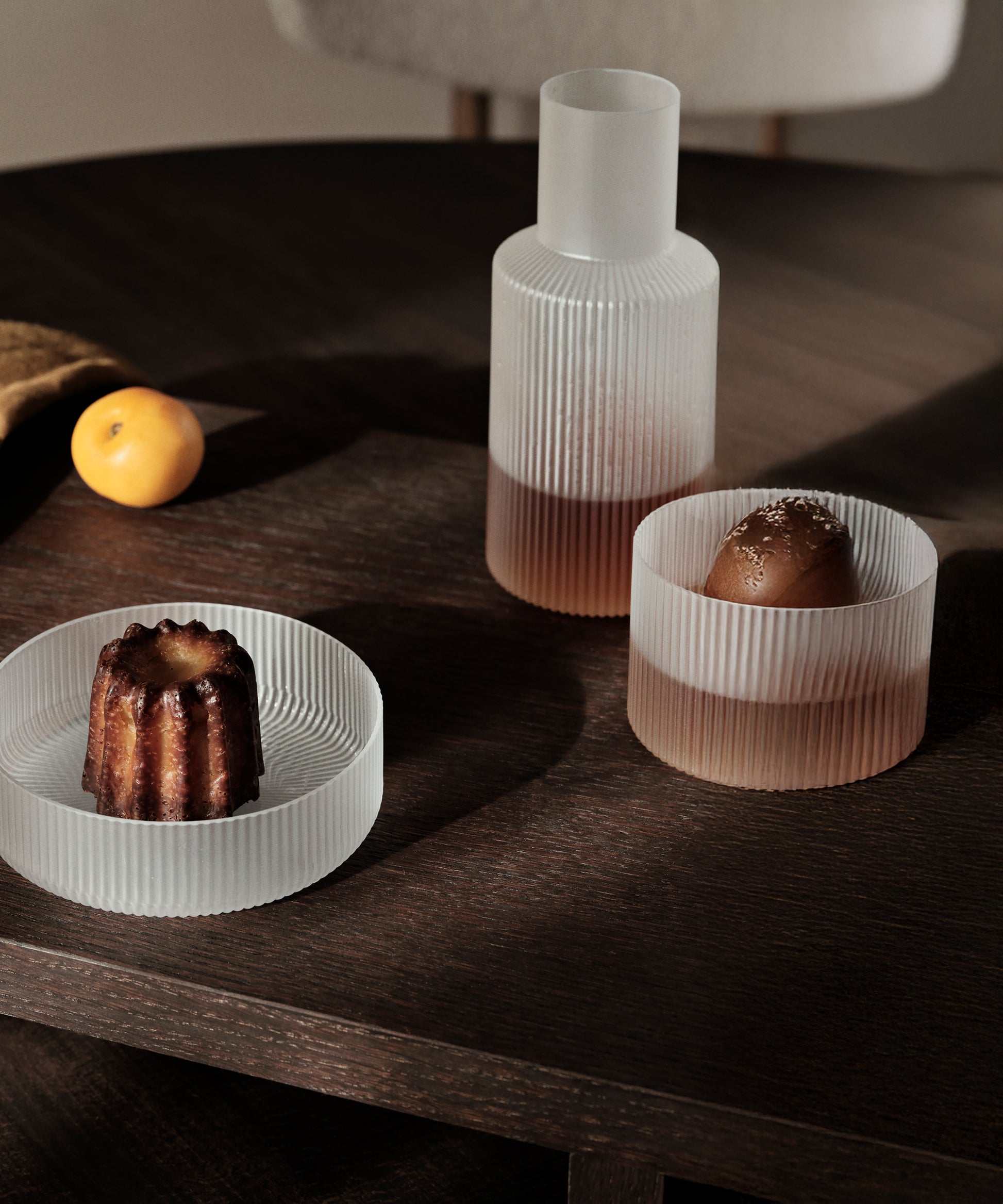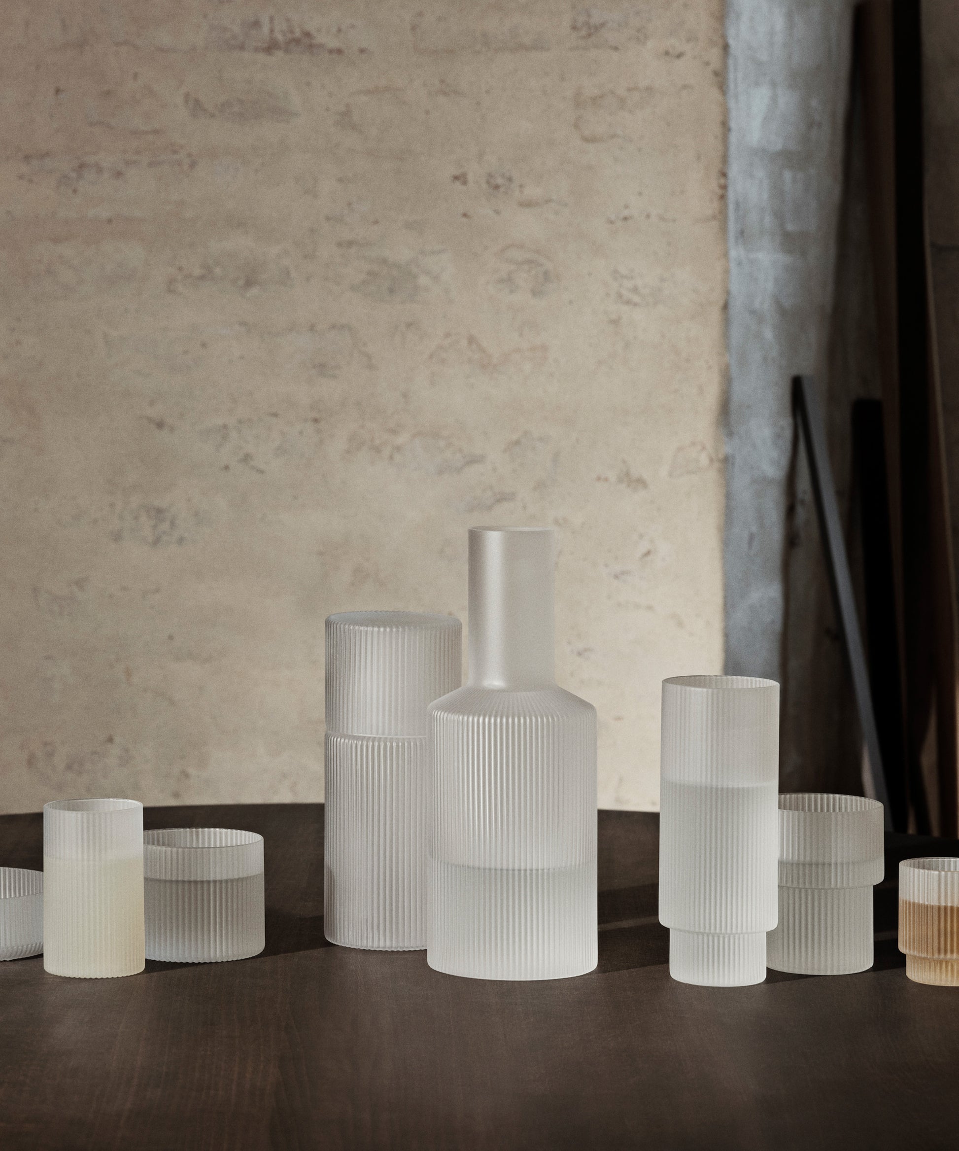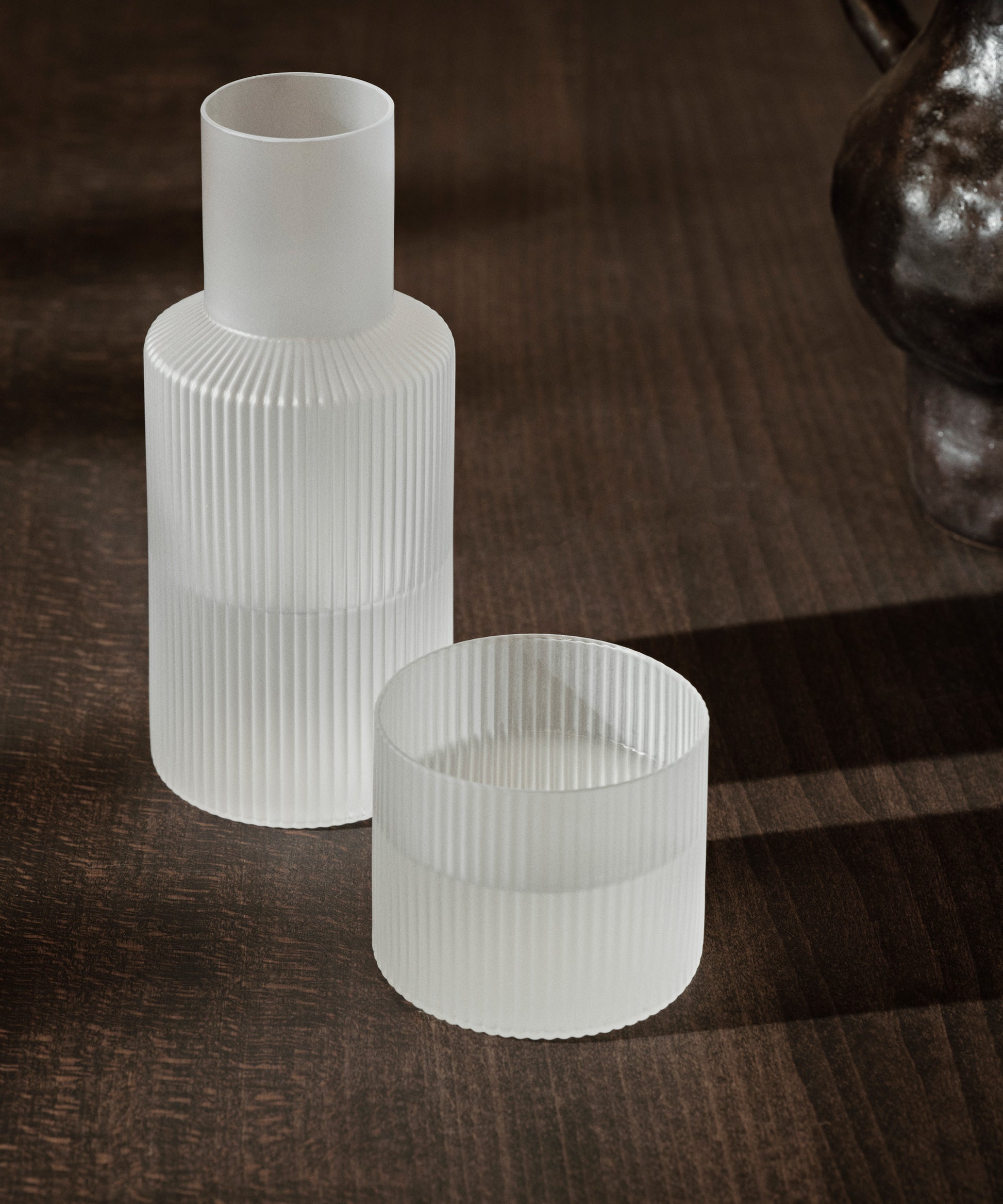 The Ripple Carafe Set has a rare combination of delicate design, artisanal craftsmanship, and durability. The cup serves double duty as the carafe's lid, creating a beautiful crystalline cylinder when placed atop the carafe. Equally at home on your desk or nightstand, this set is a wonderful addition to the Ripple Glassware series. Dishwasher safe.