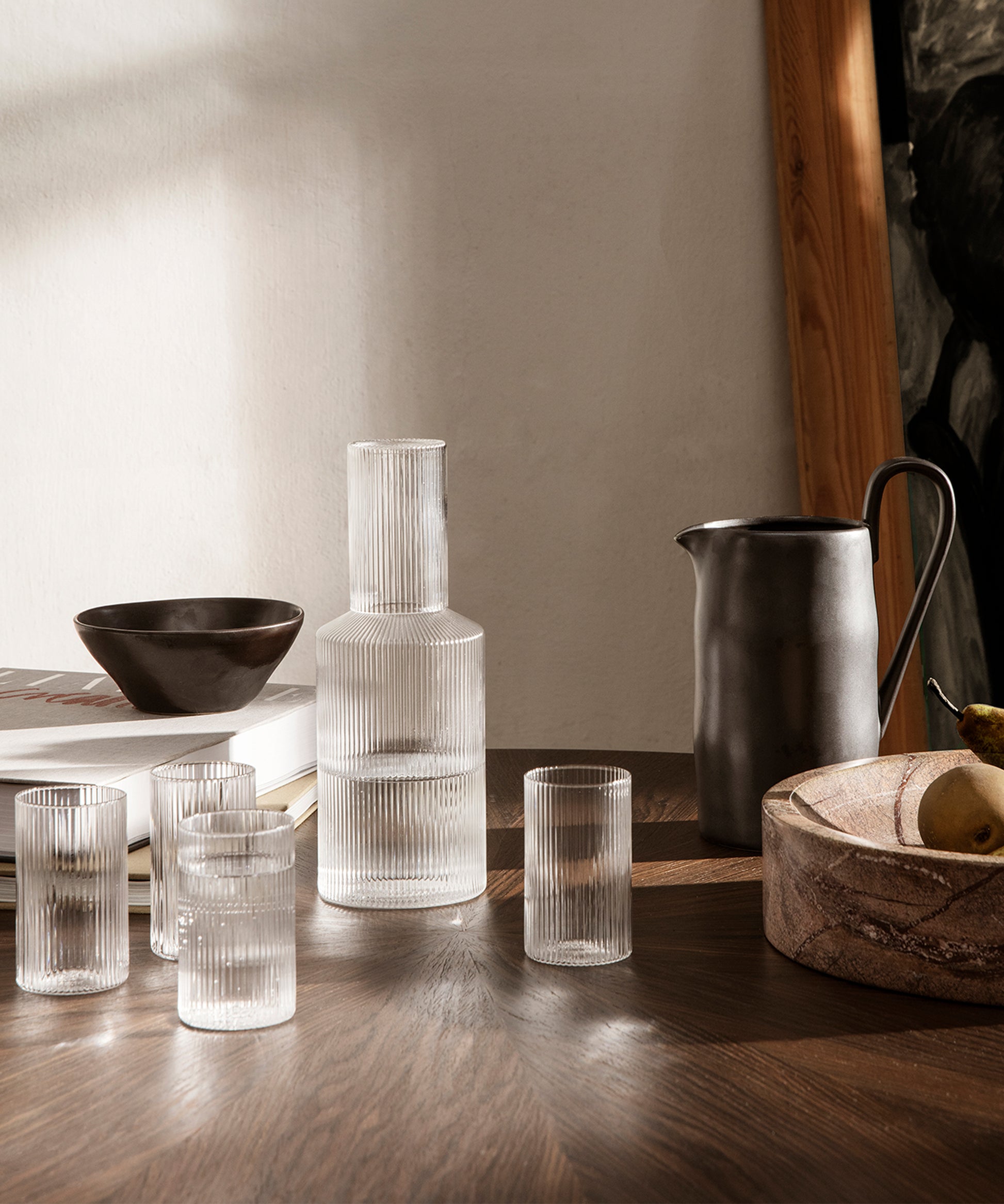 Inspired by small, delicate glasses traditionally used in French cuisine to serve little appetizers and desserts, the mouth-blown glass has a rippled surface that is distinctive to the series.