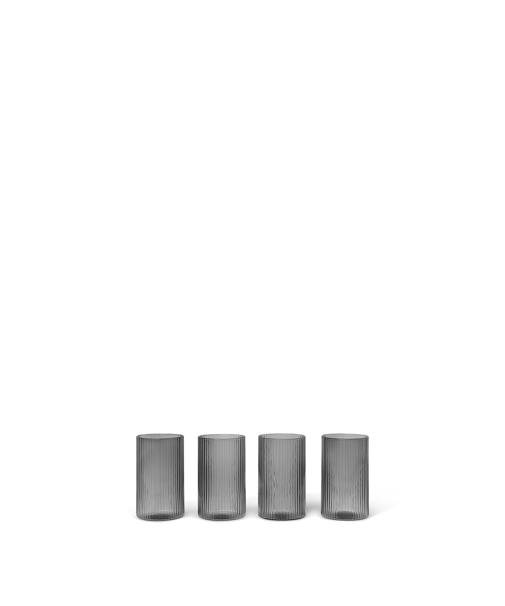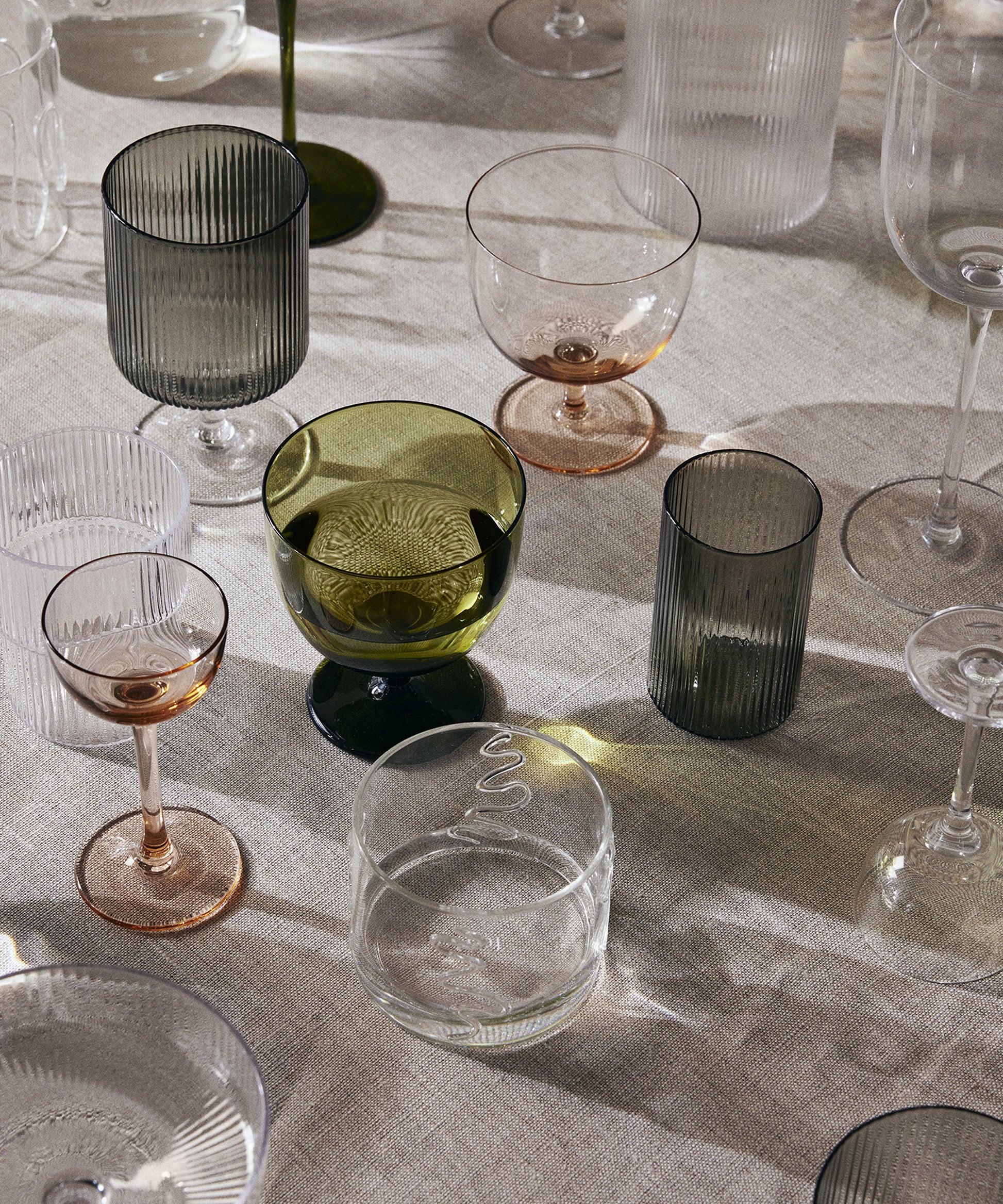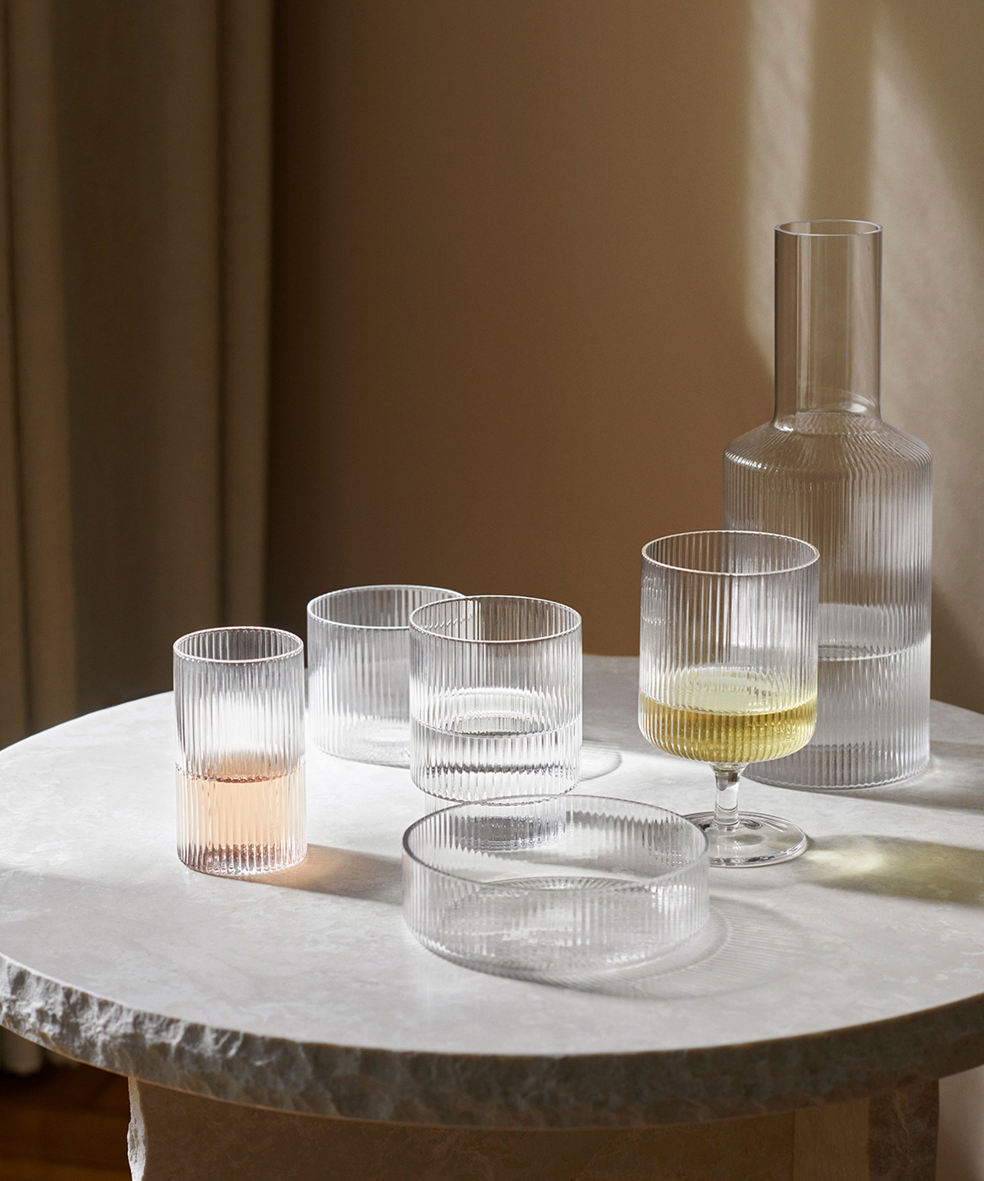 Inspired by small, delicate glasses traditionally used in French cuisine to serve little appetizers and desserts, this set of four mouth-blown glasses have a rippled surface that is distinctive to the series.
