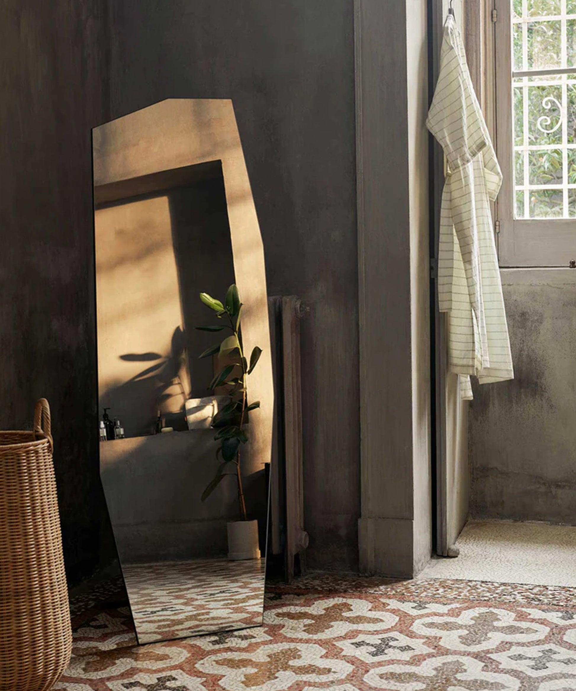 Its name references the inspiration behind the mirror, which rose from looking at the sharp, raw edges of pieces of broken ceramic, glass, and rock. The powder-coated steel frame allows you to hang your favorite clothing pieces or coats on the back of the mirror, making the asymmetrical Shard Mirror the ideal decorative and functional piece for any room of the home, be it in the bathroom, hallway, or bedroom.