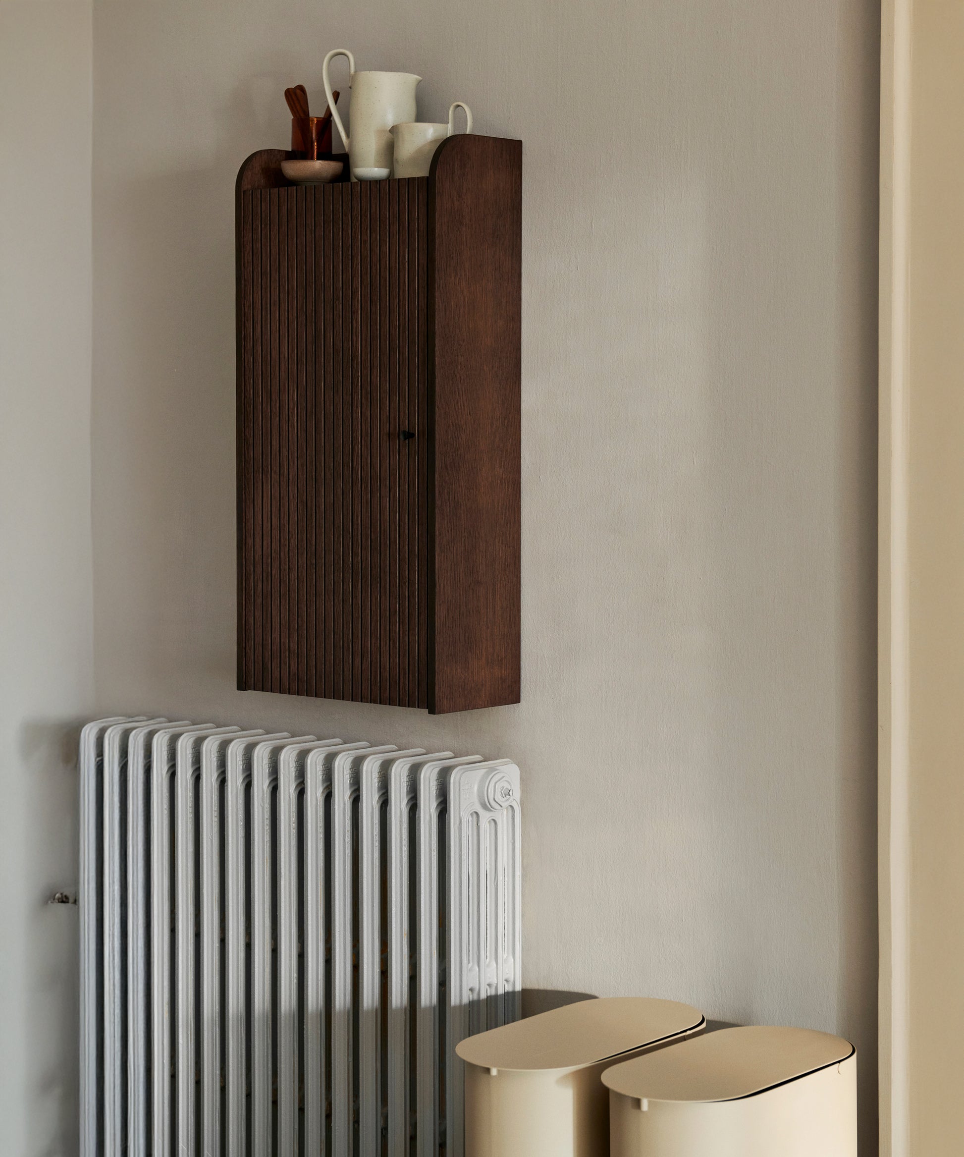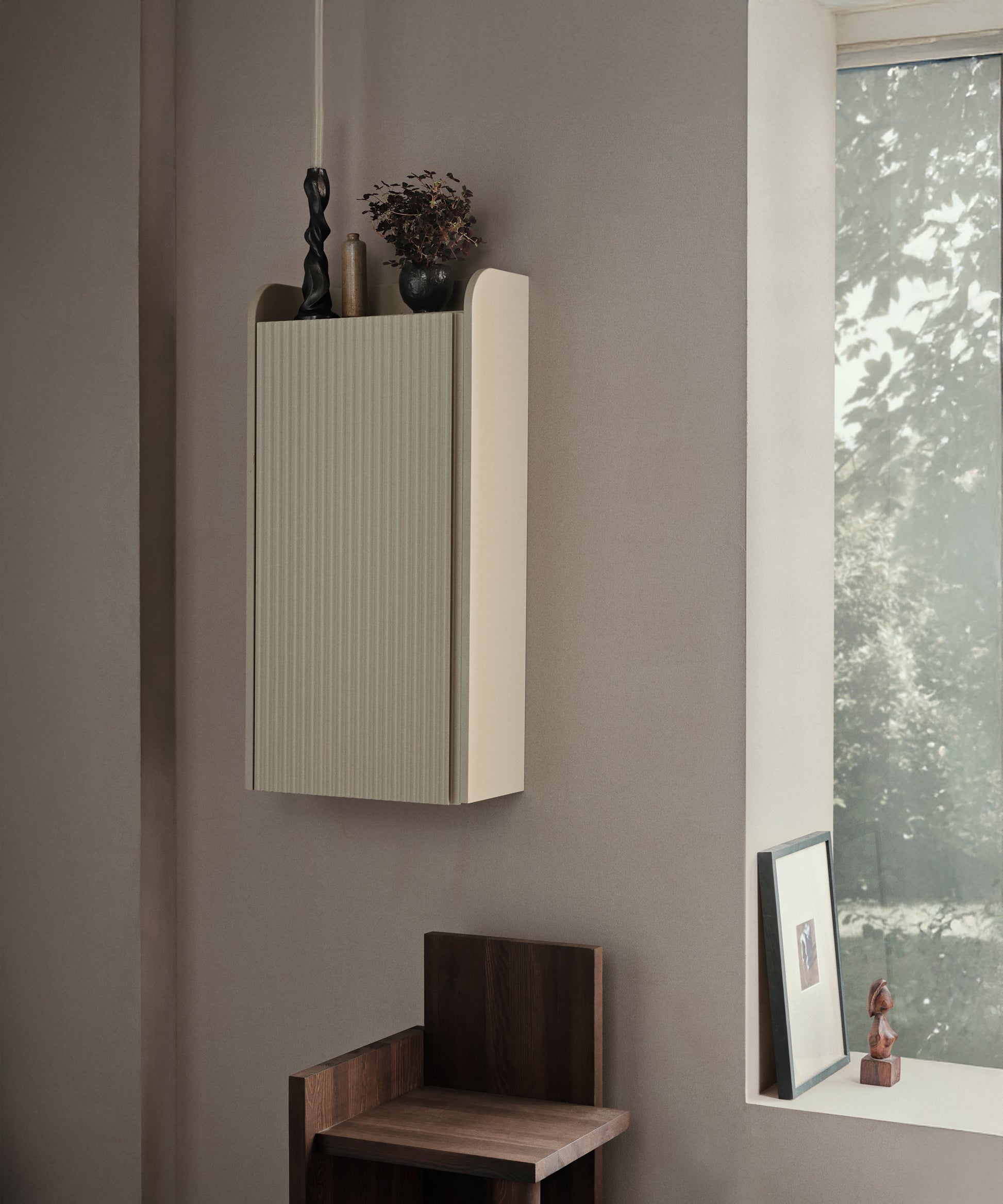 The name Sill stems from the French sillon, meaning carved grooves, which adorn the doors of the wall cabinet. Use the versatile and functional Sill Wall Cabinet throughout your home for your favorite cups in the kitchen, for your most cherished treasures in the living room or for keys and other miscellaneous items in the hallway.