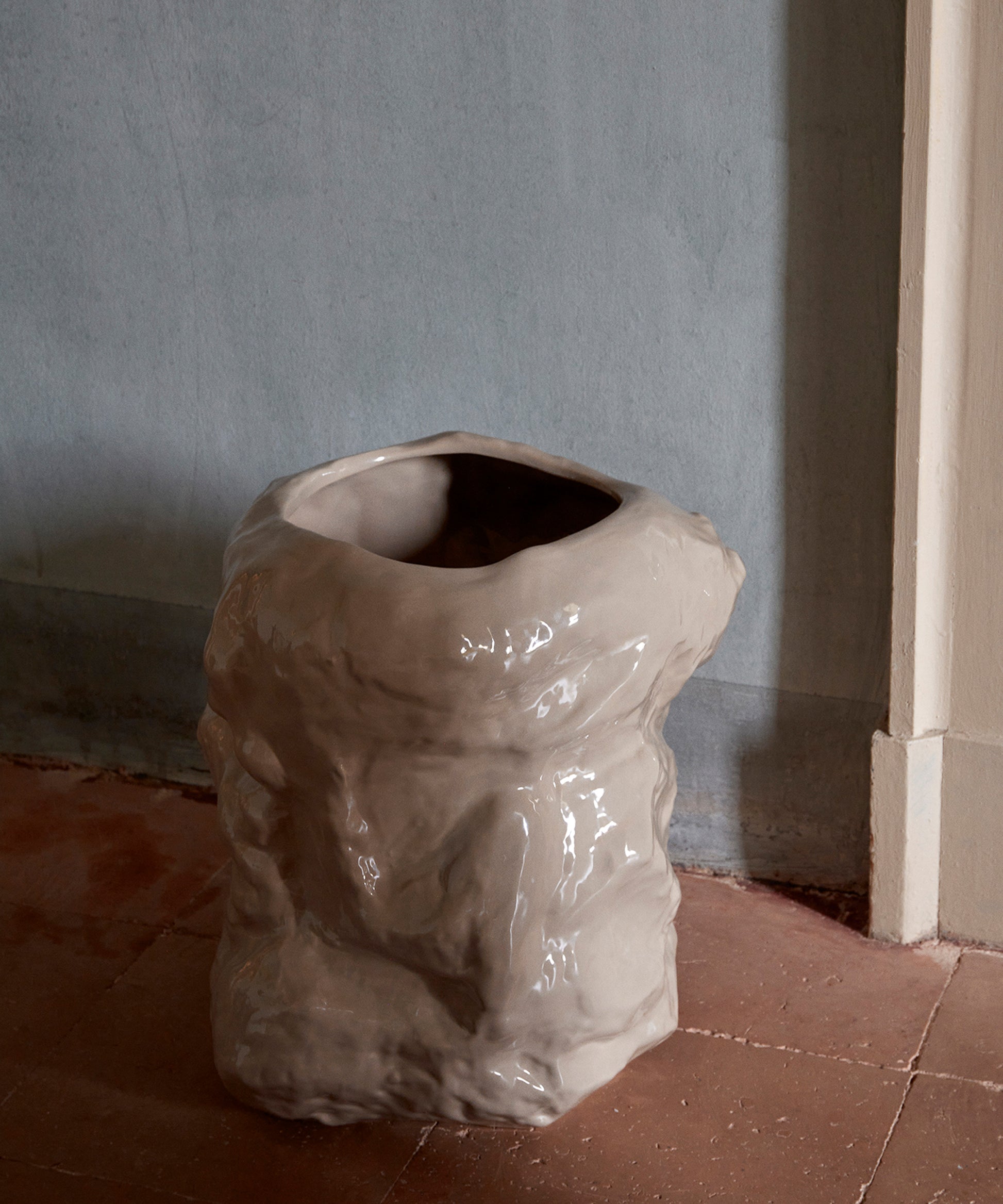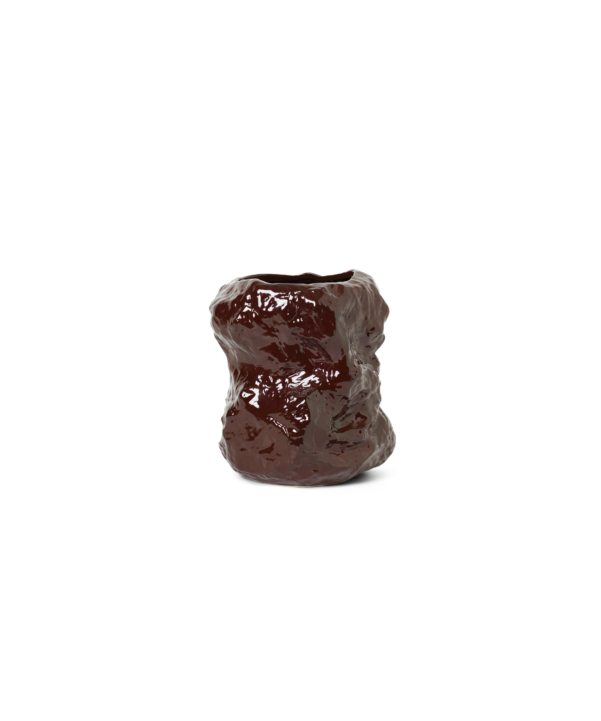 The artistic piece is layered with a high-shine glaze for a light-reflecting finish that highlights its furrowed surface. Fill it with flowers or branches, or let it make a solo statement on a surface in your home. Available in three colors - cashmere, blue, and red-brown.