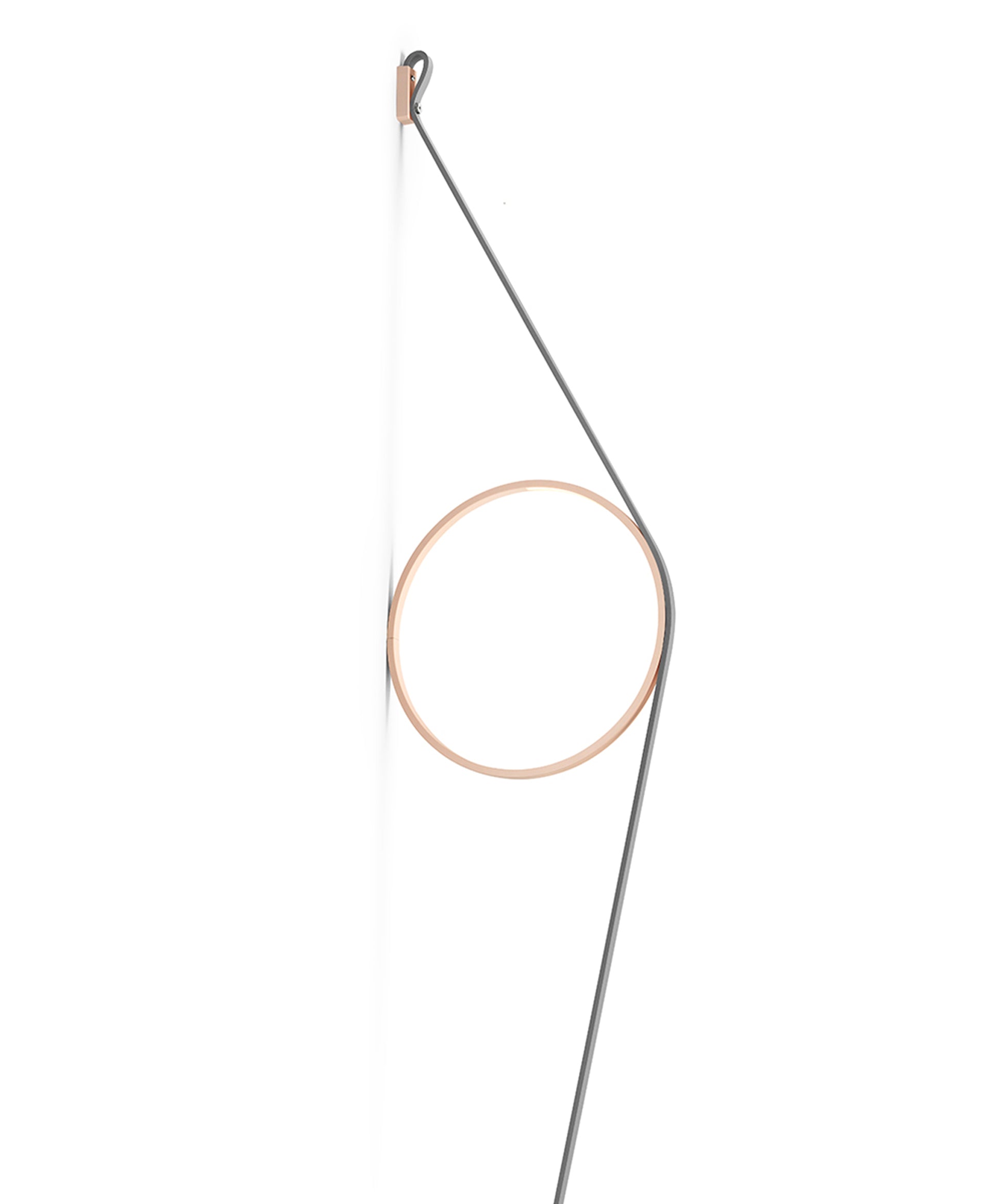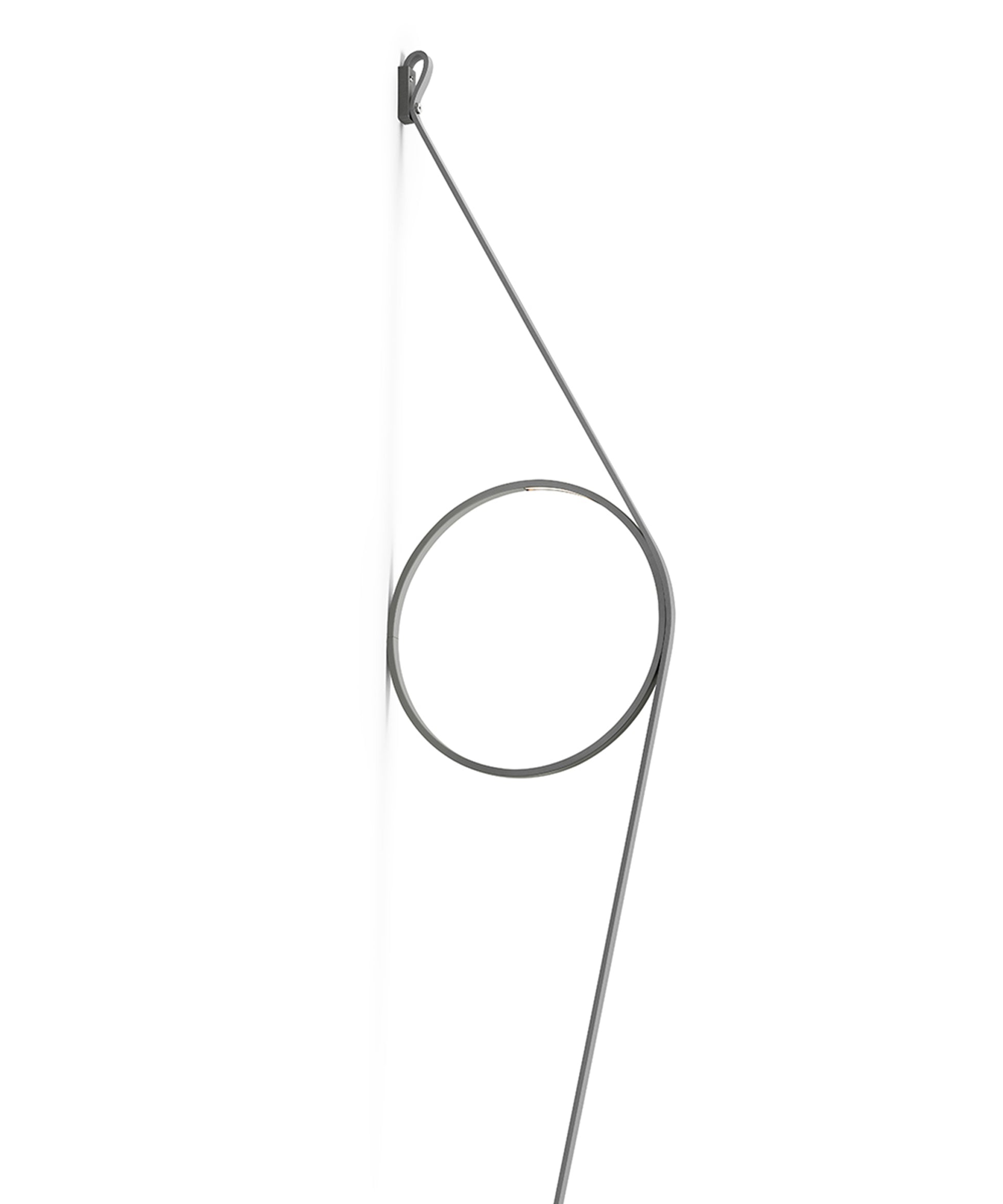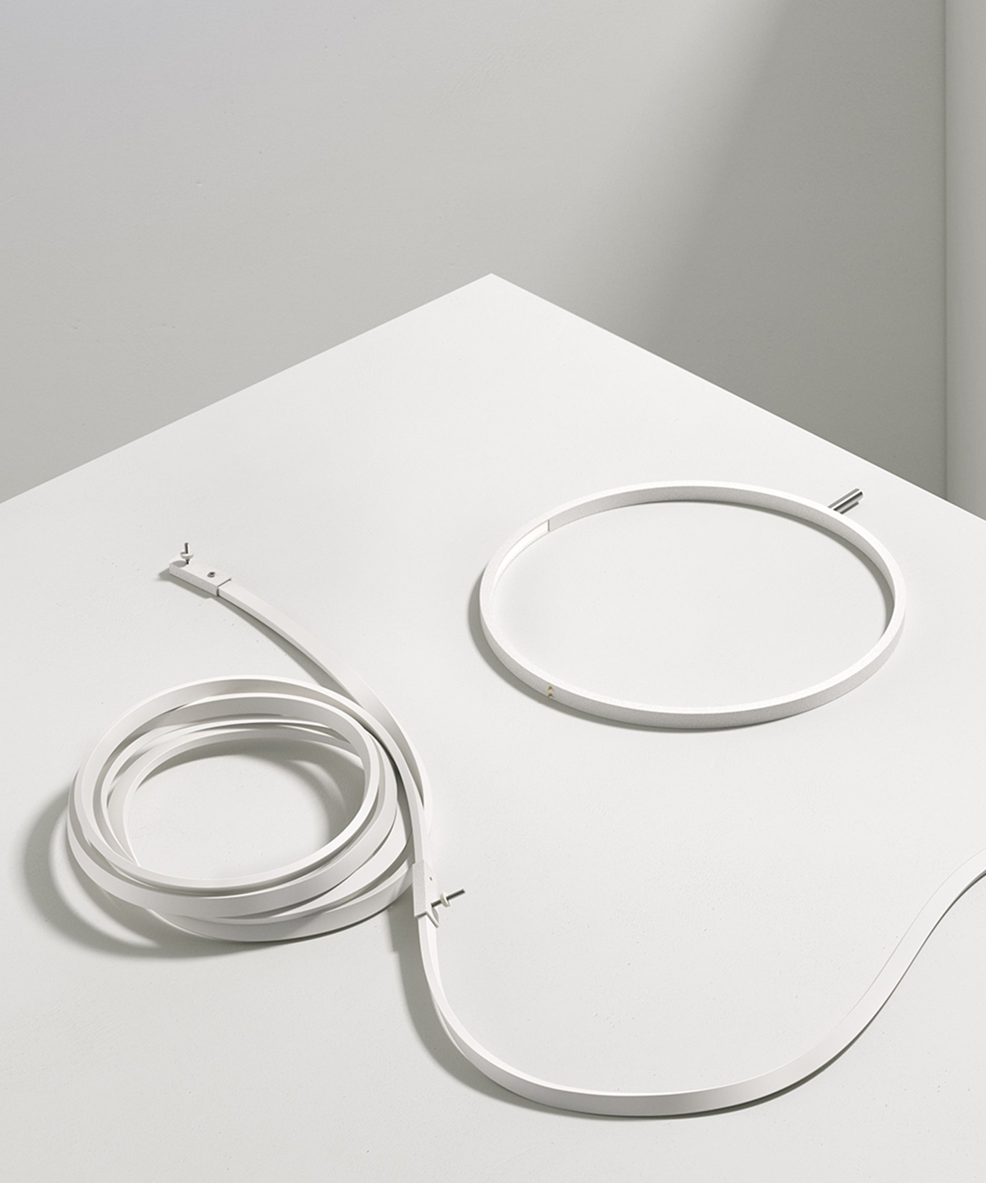The wire holds a simple ring fitted with an LED strip. The cable and ring are available in different color combinations and a range of finishes. Inspiration behind the design: Elevating what is hidden, and showcasing the lamp's wire, we appreciate its sculptural beauty.