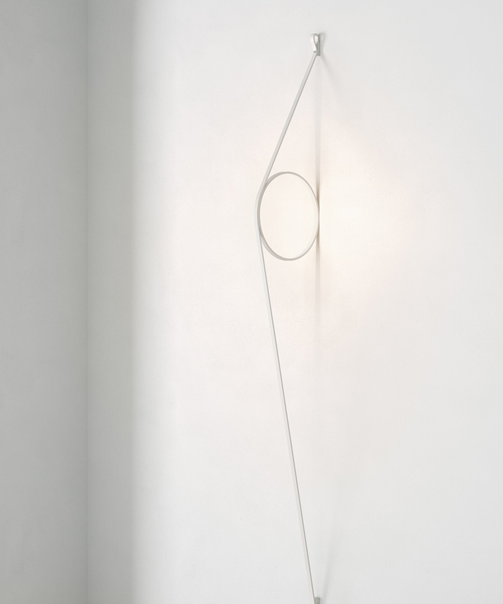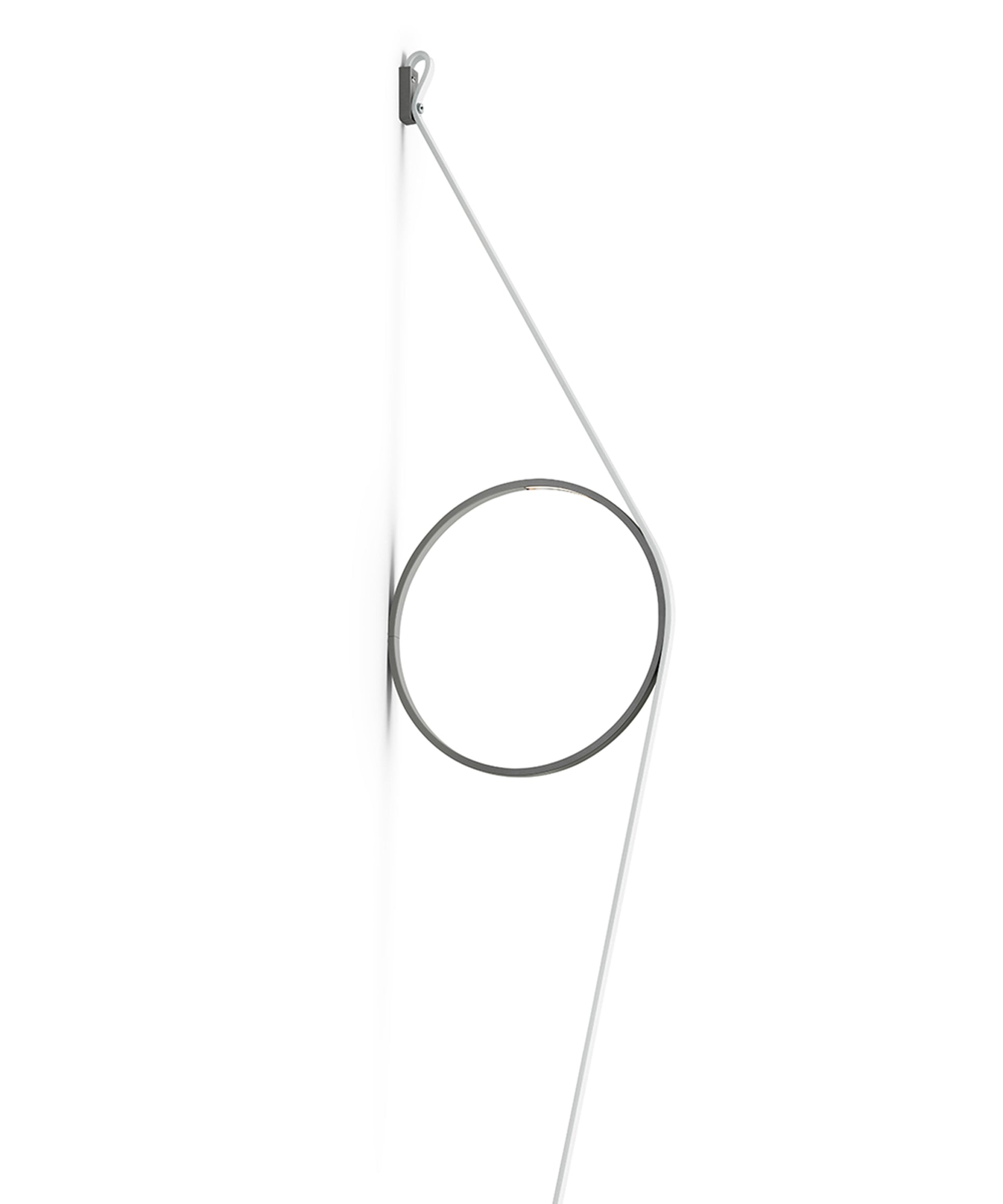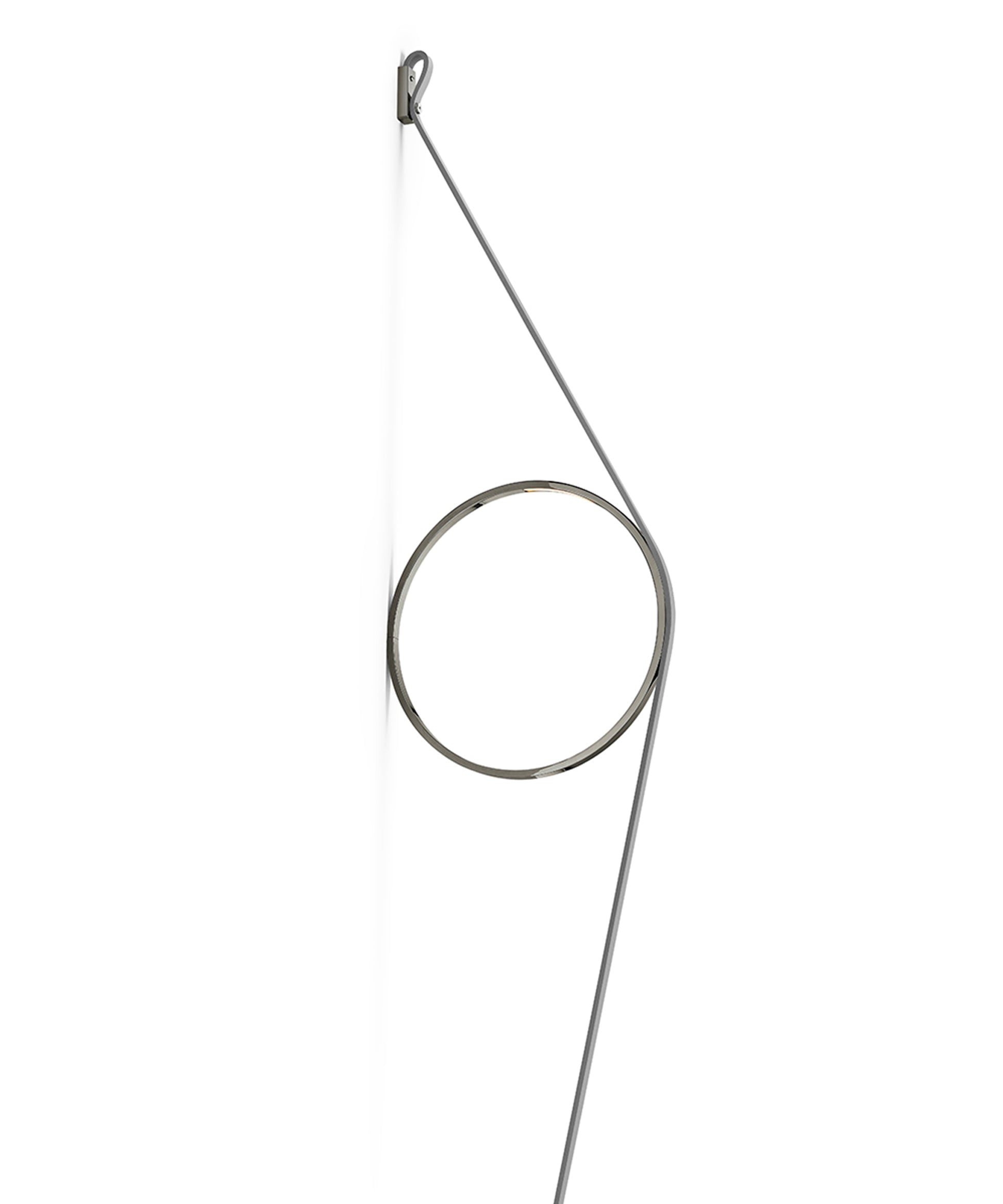 The wire holds a simple ring fitted with an LED strip. The cable and ring are available in different color combinations and a range of finishes. Inspiration behind the design: Elevating what is hidden, and showcasing the lamp's wire, we appreciate its sculptural beauty.