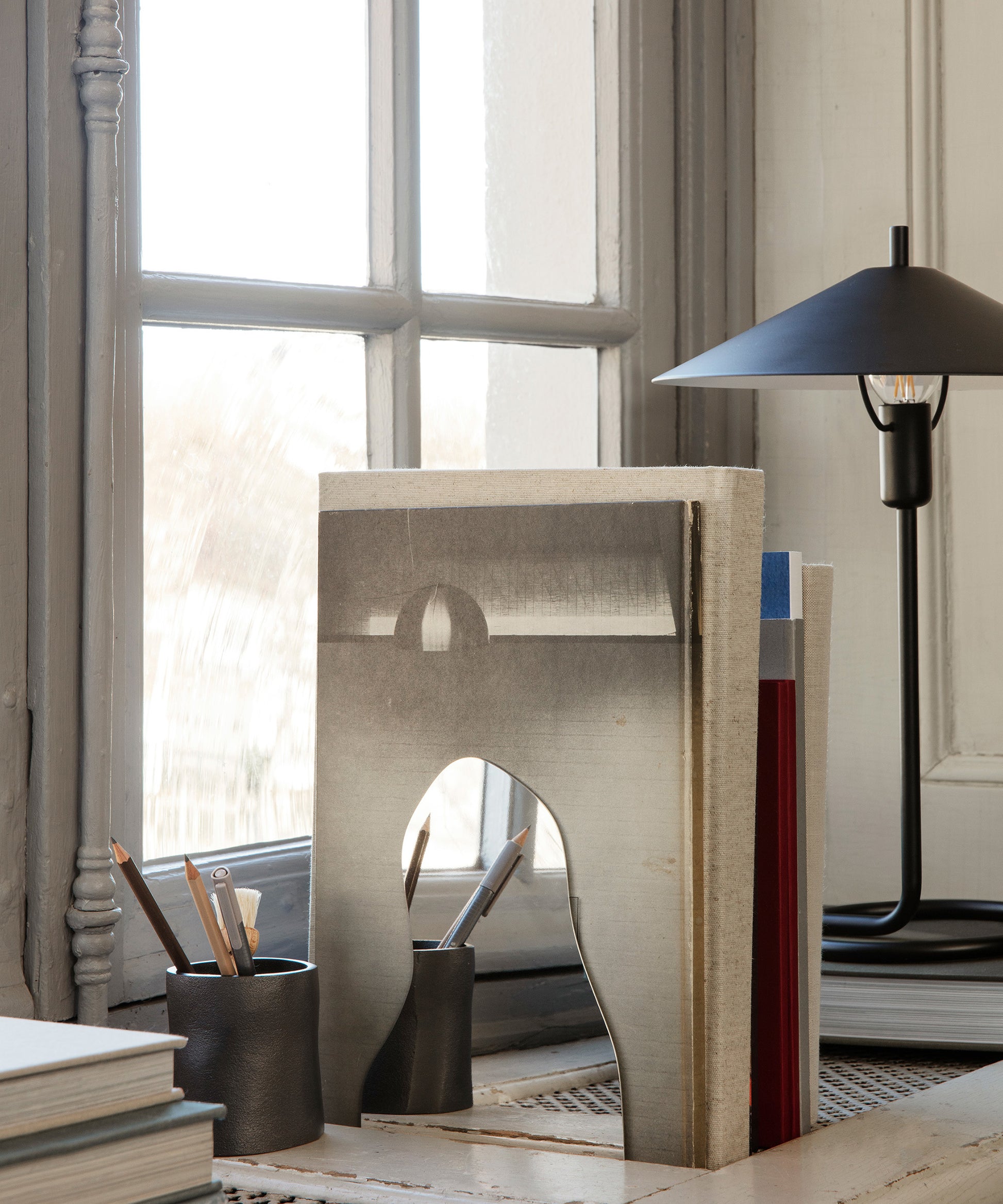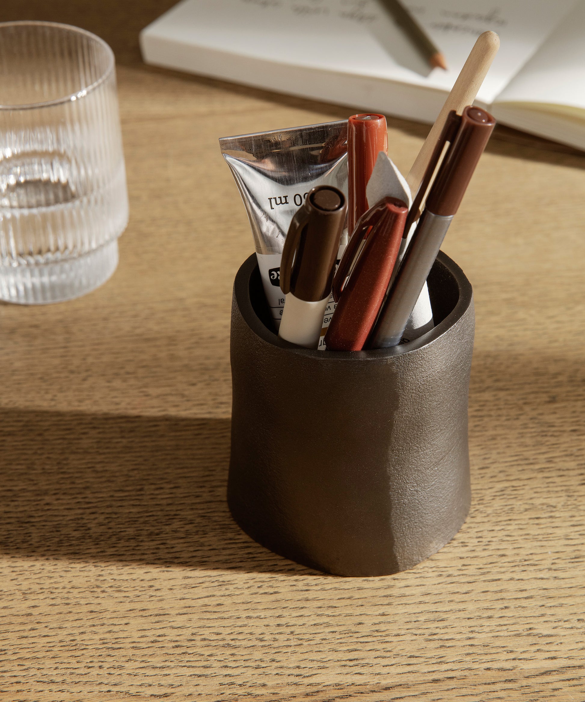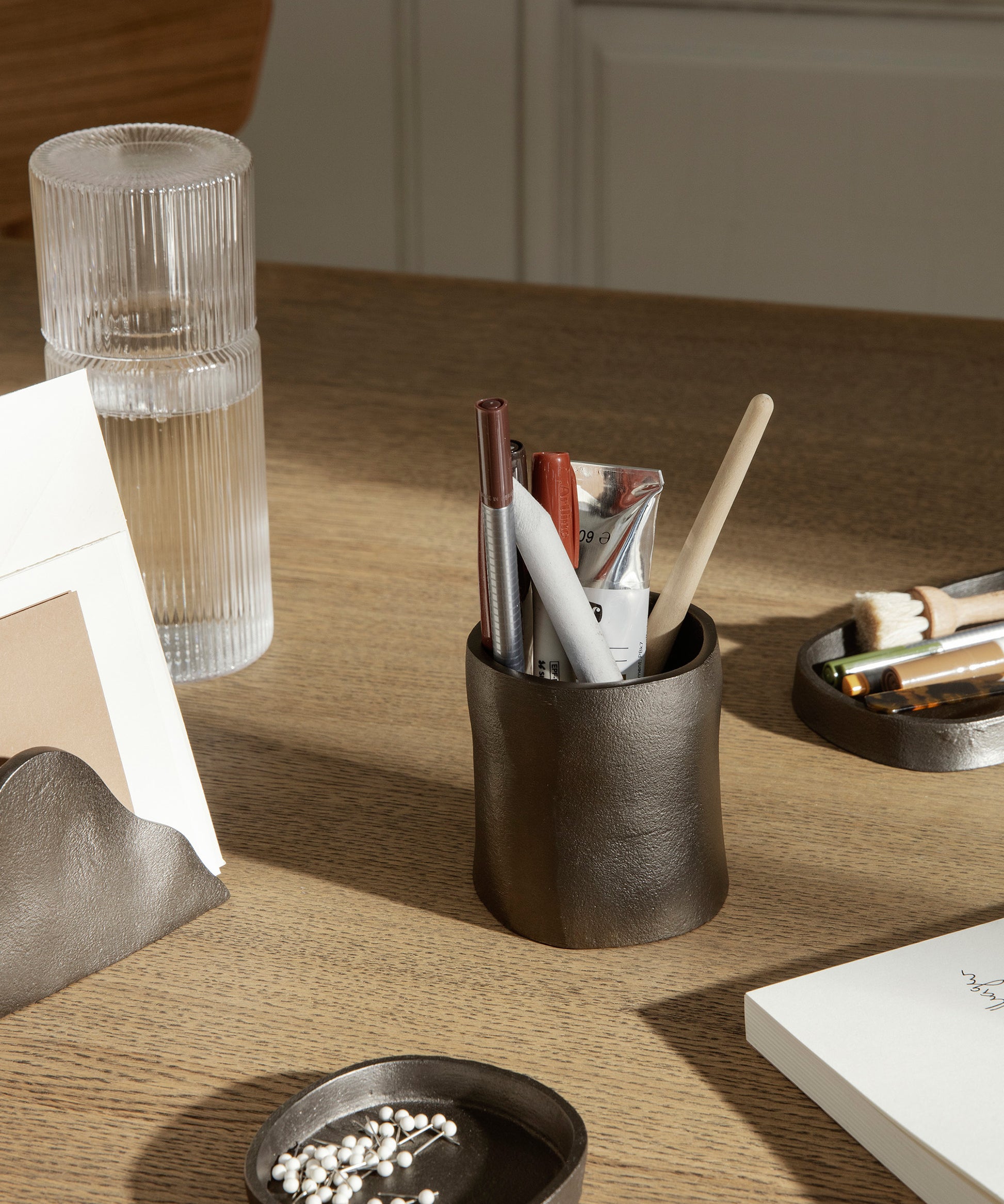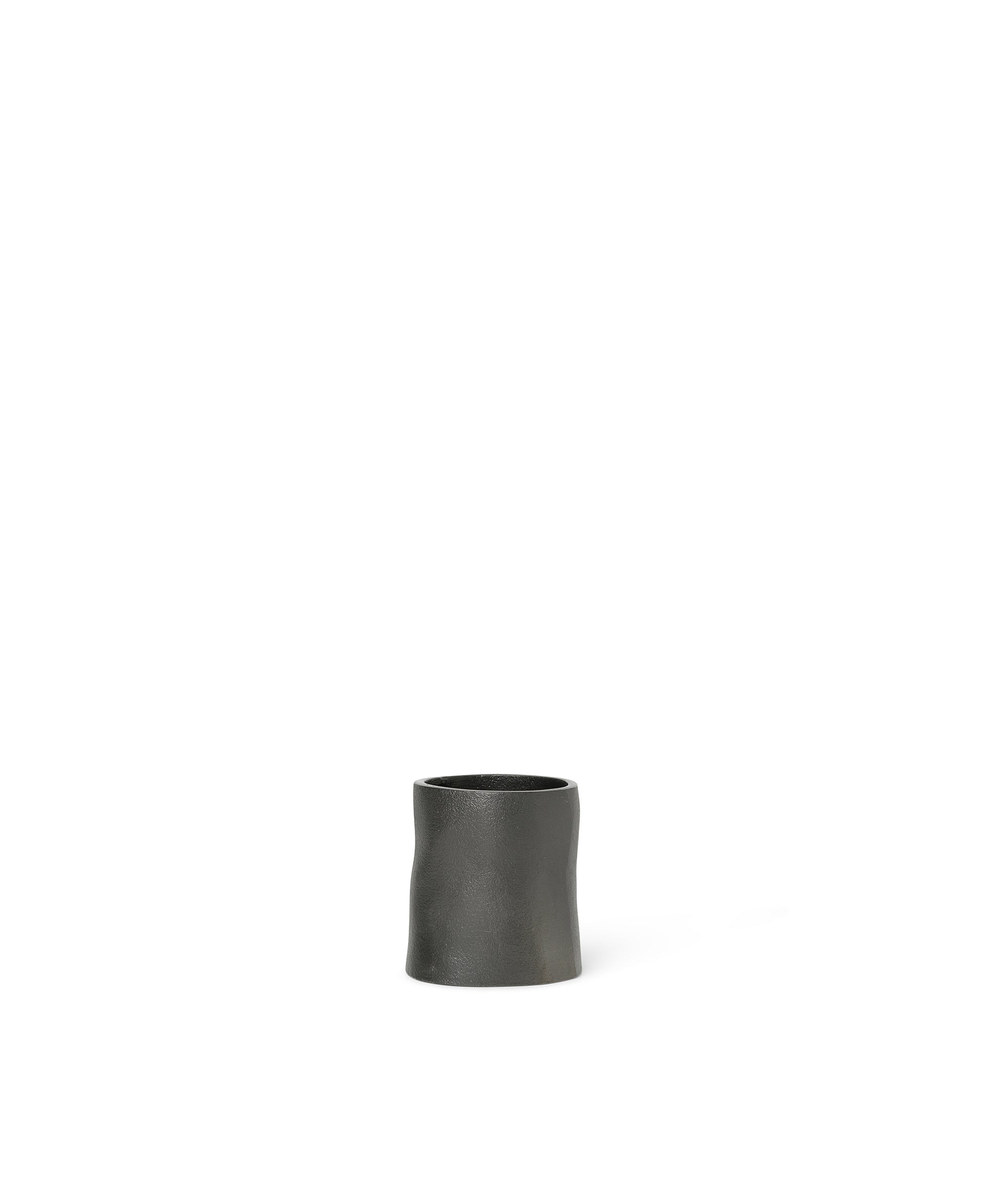 Made from recycled casted aluminium and featuring a rough, matte, and blackened finish that contrasts its fluid and organic silhouette, the decorative cup is ideal for storing pens and pencils in your home office or for makeup and other daily essentials in the bathroom. Fits inside the Yama Tray Oval.