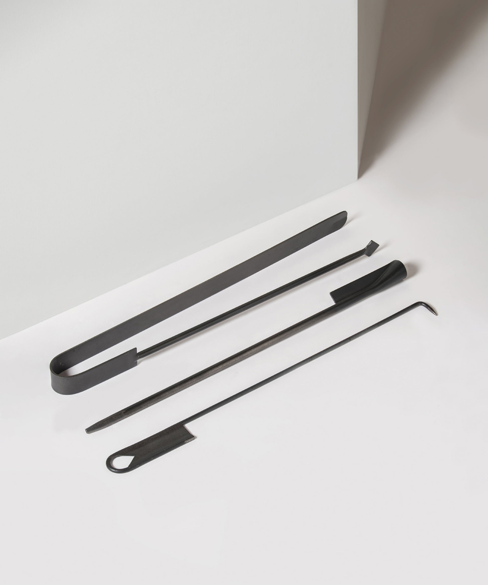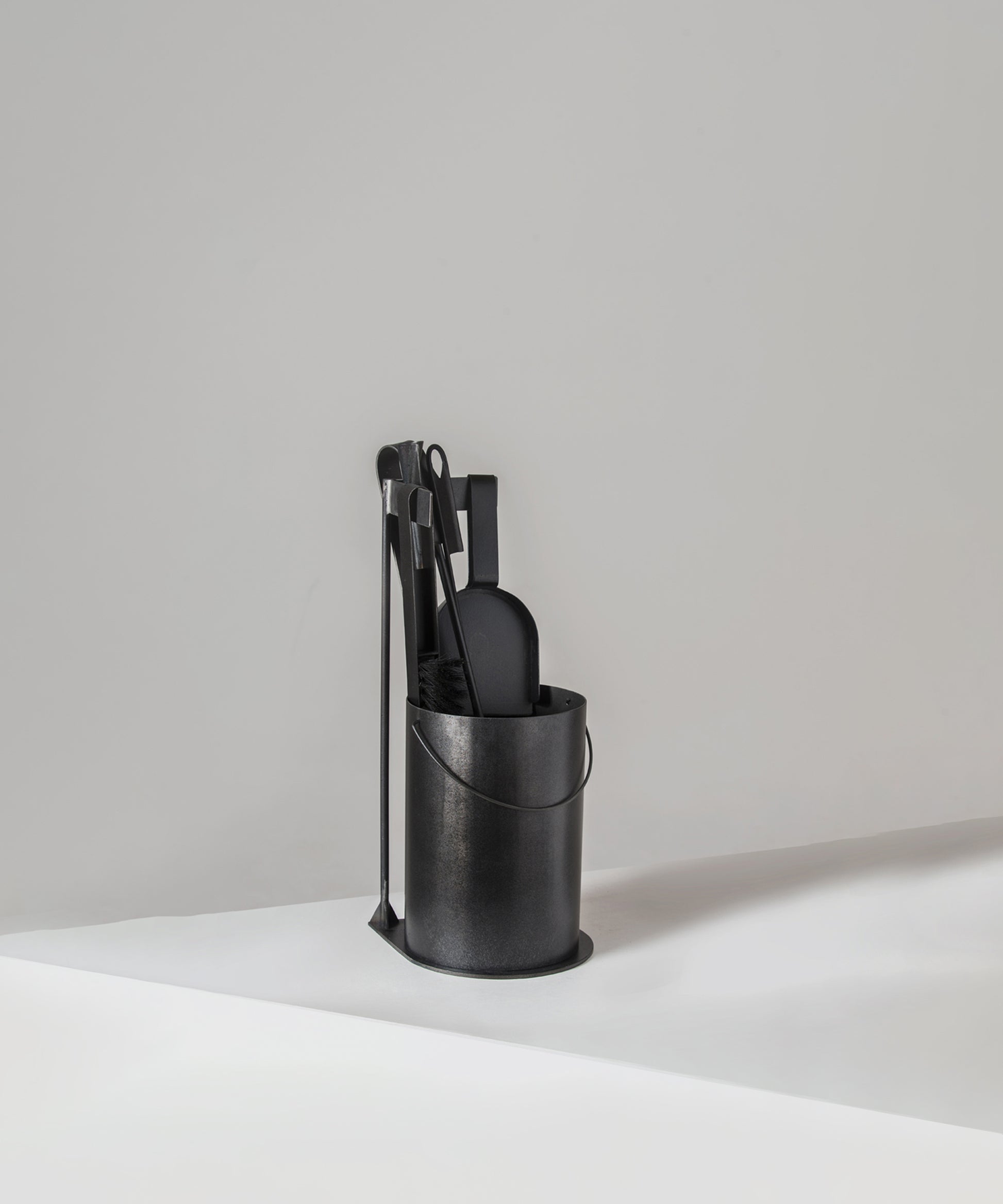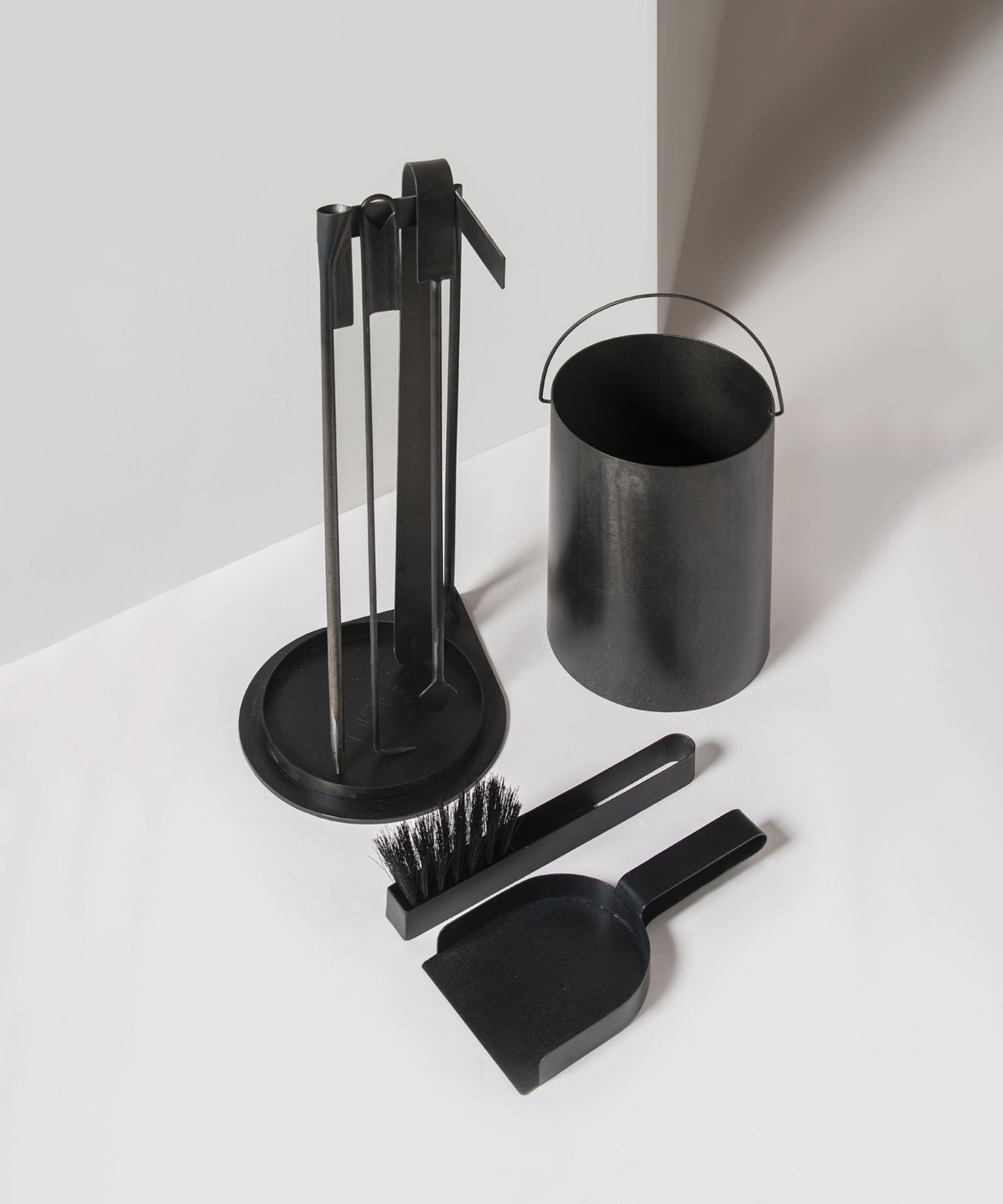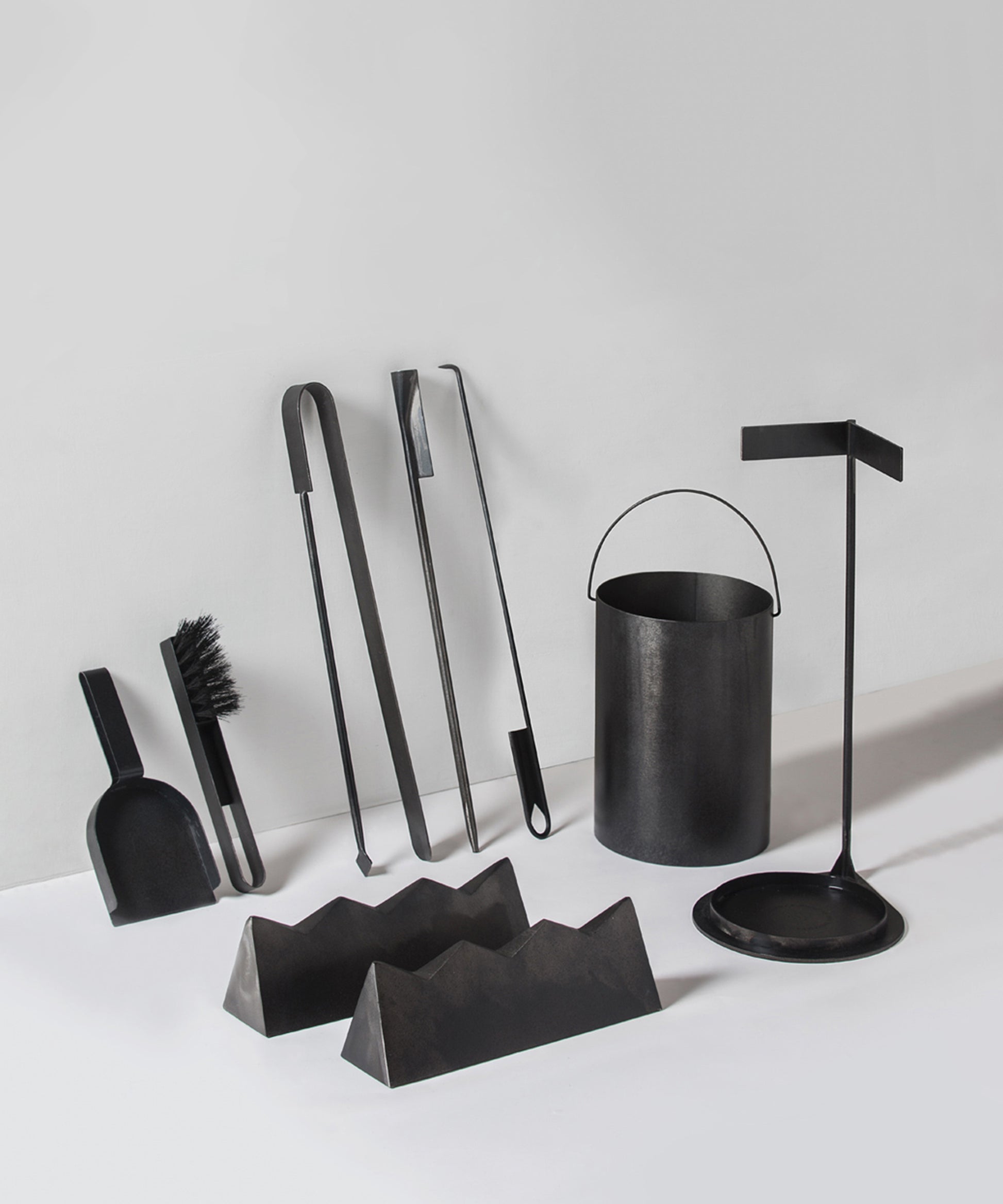 Using the rough style of antique pieces as his guide, Maggiar has reinvented the essentials, wasting no space on unnecessary flour. The set’s clean, modern lines contrast beautifully with the hand-welding and rough finish crafted by Fratelli Argiolas. Includes poker, tongs, bellows, broom, shovel, ash bucket, tool stand, and two andirons.