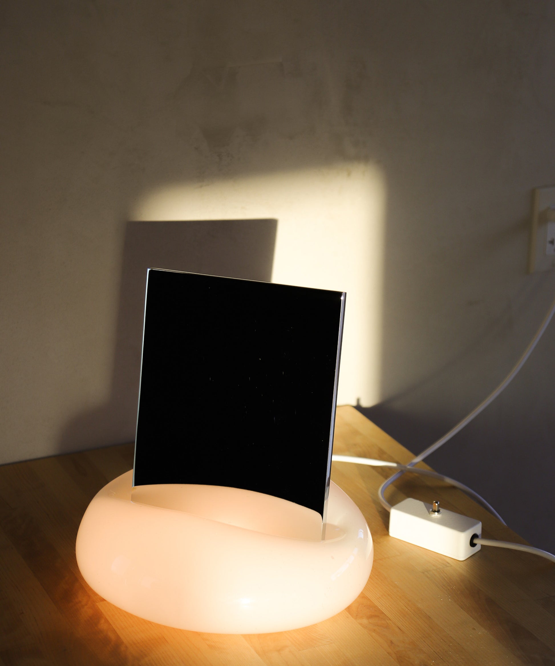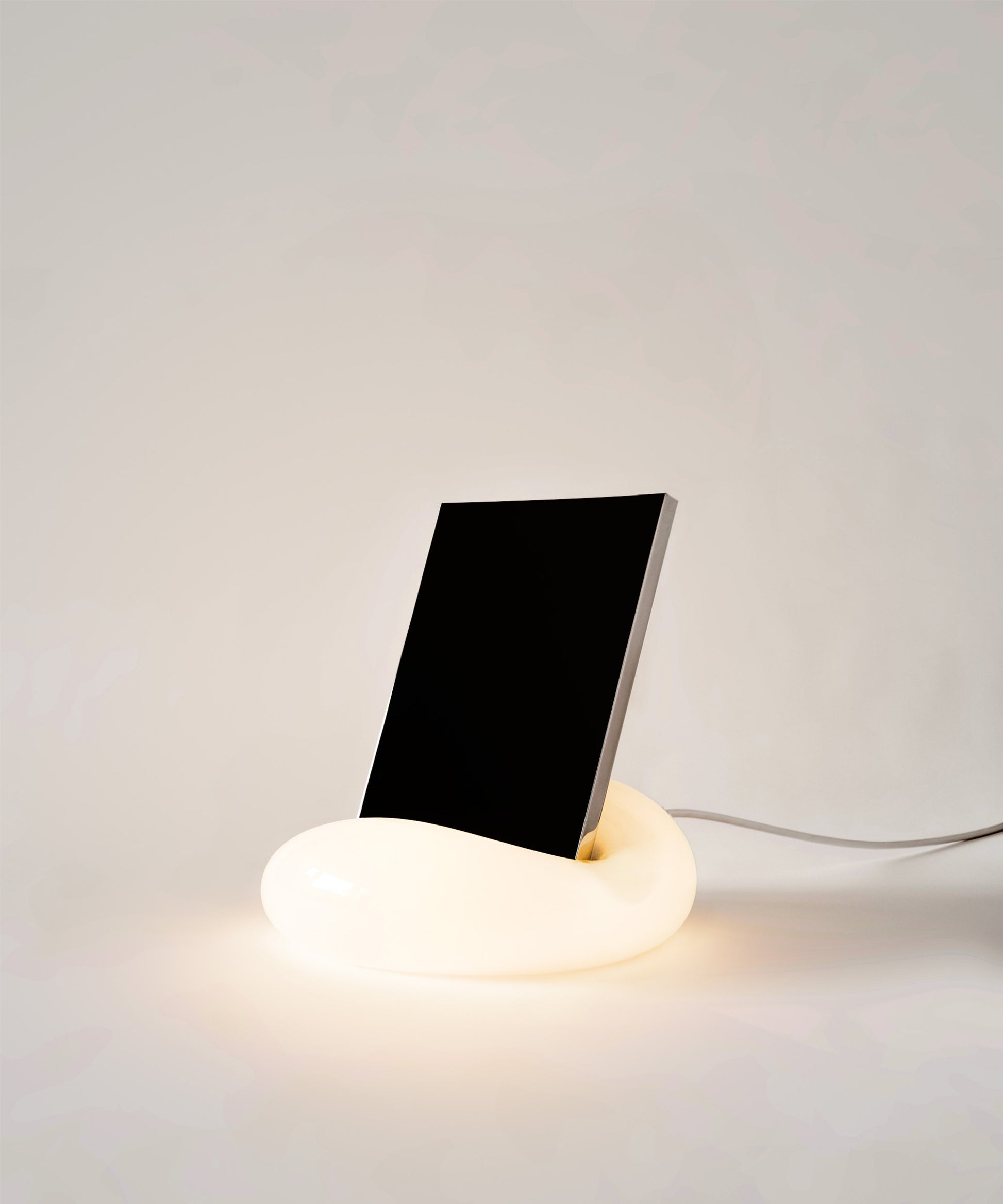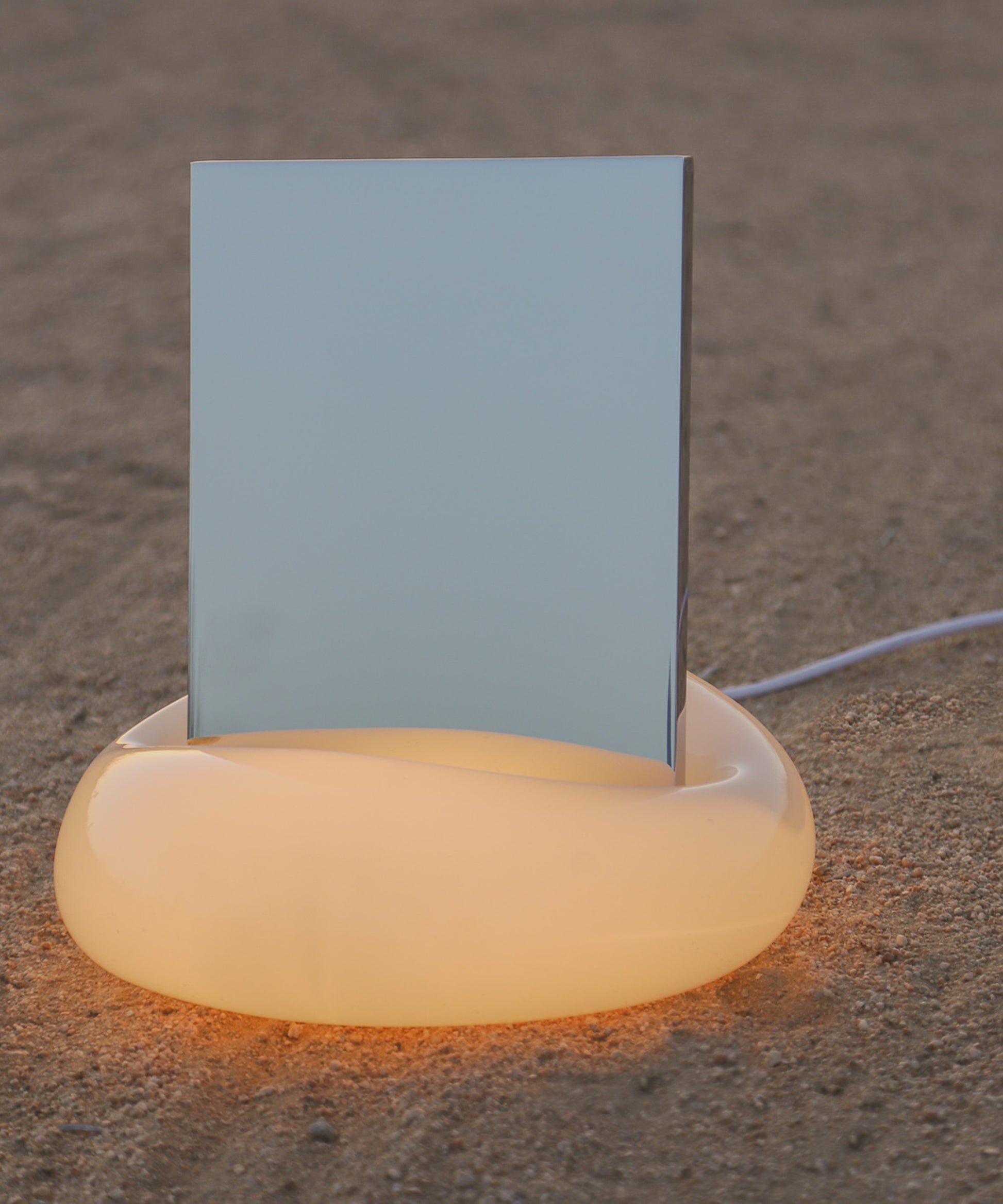 The “Pillow Mirror” is a multi-utility piece. Functioning as both a mirror and a light, the fixture is a conceptually elevated item that is meant for everyday use. These pieces rest in each other and are not attached.