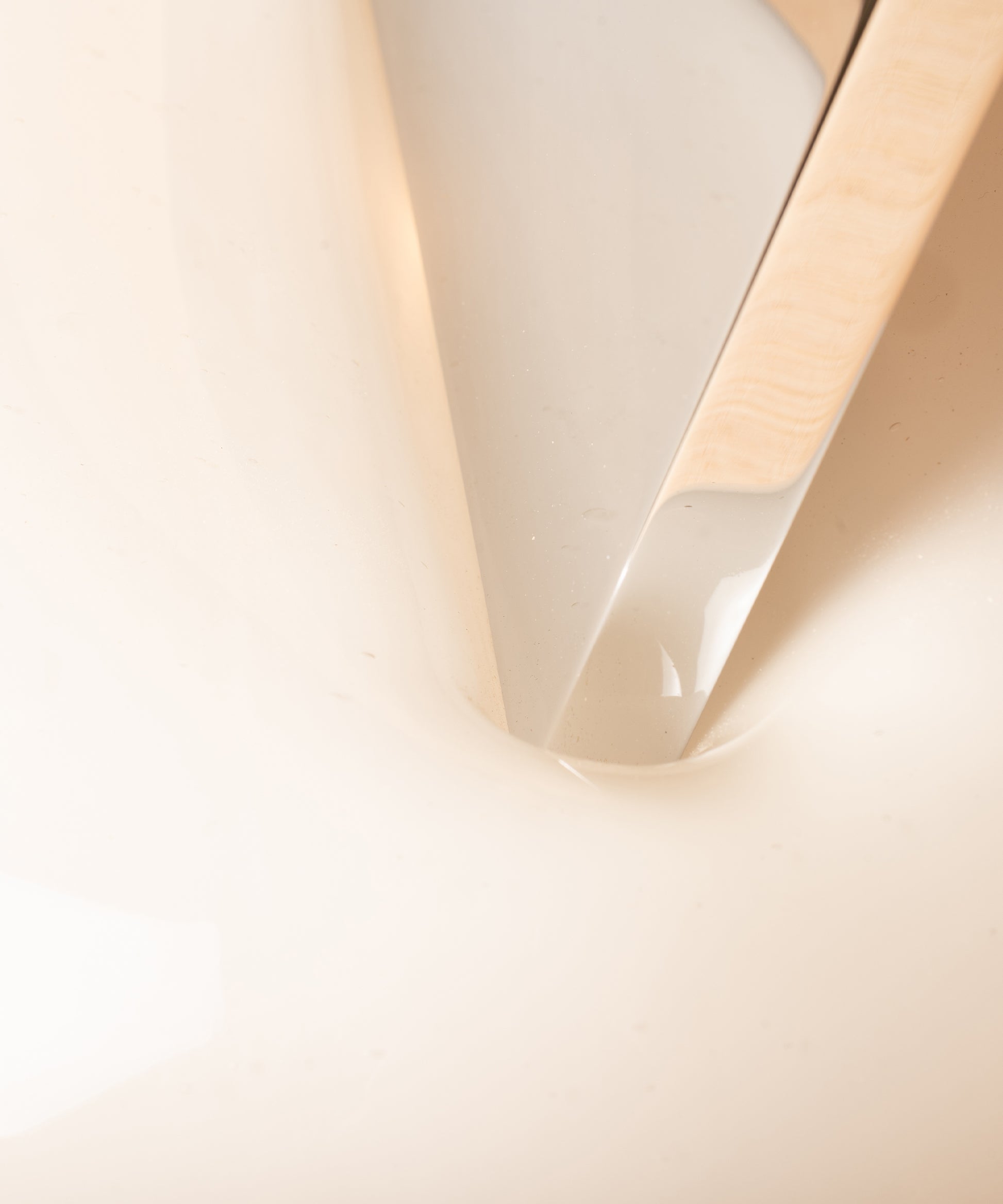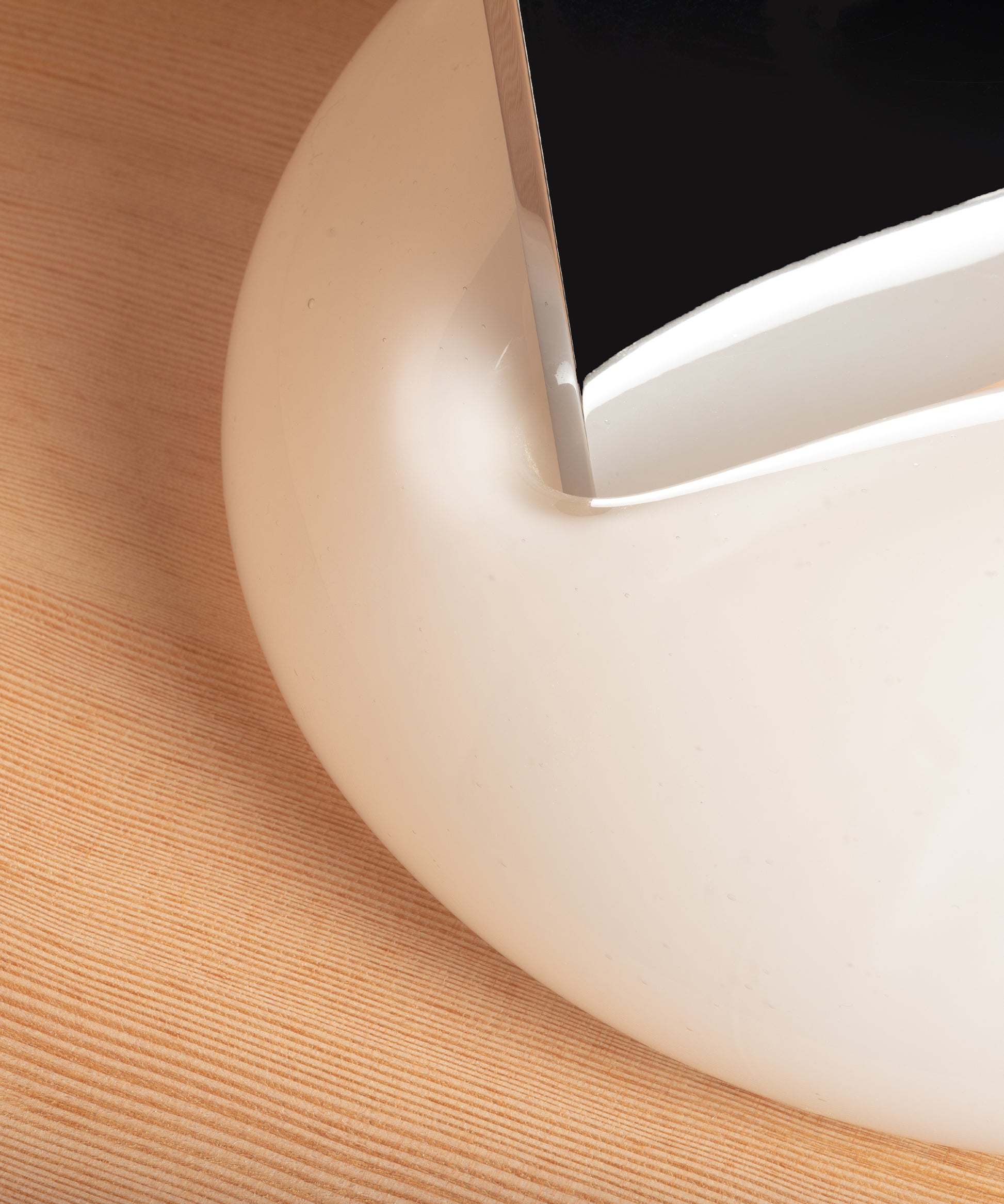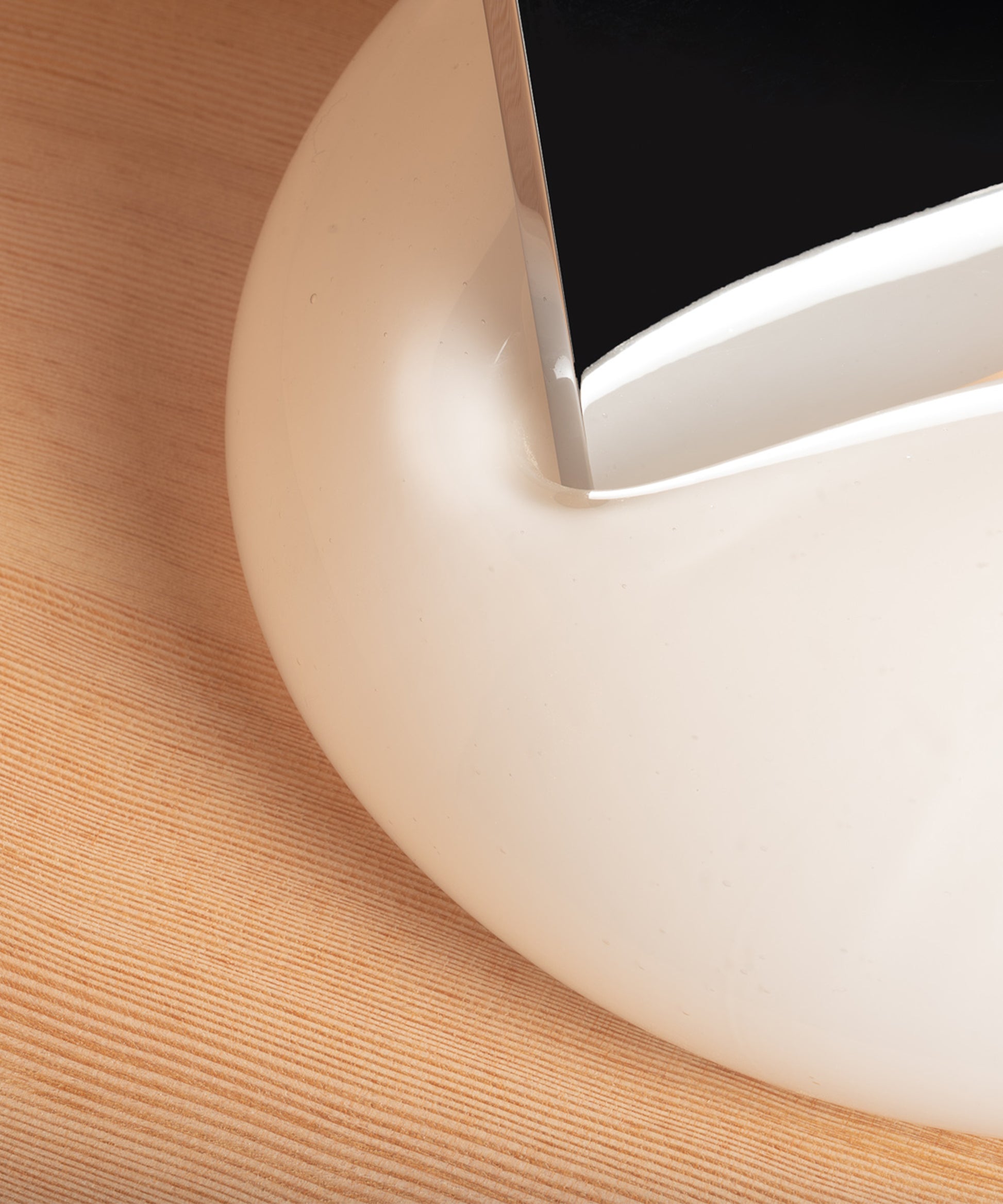 A mirrored aluminum plate rests in a hand-blown glass base.