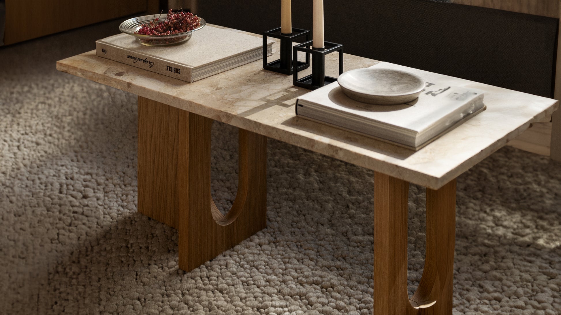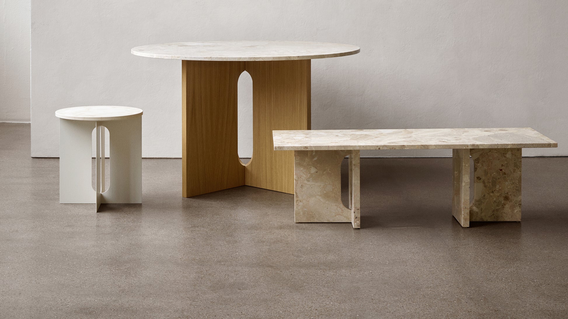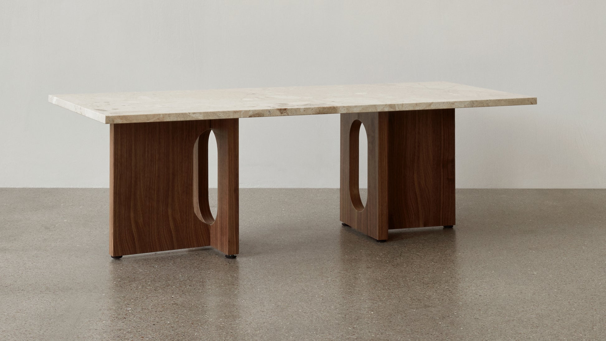 Originally developed by Norwegian architect and designer Danielle Siggerud as a modern and versatile table for MENU’s former showroom café, the Androgyne Collection profiles simple silhouettes and refined materials. Celebrating craftsmanship and wood, the Androgyne Lounge Table is versioned in natural oak or dark stained oak or walnut, as well as with the option of a kunis breccia stone tabletop.