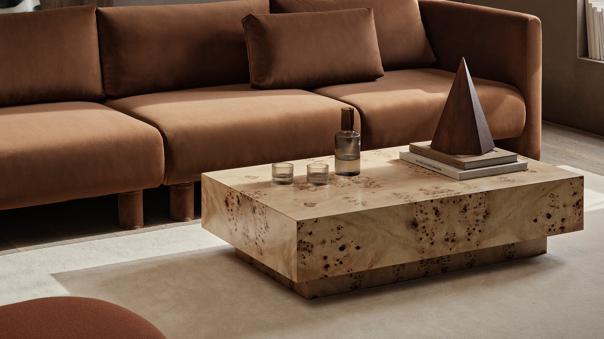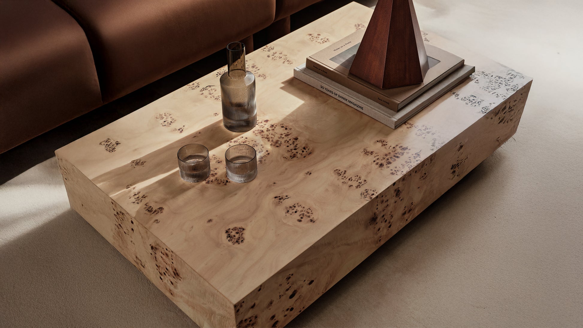 The Burl Coffee Table marries the rich textures of burl wood with the stark, simple lines of brutalist shapes.