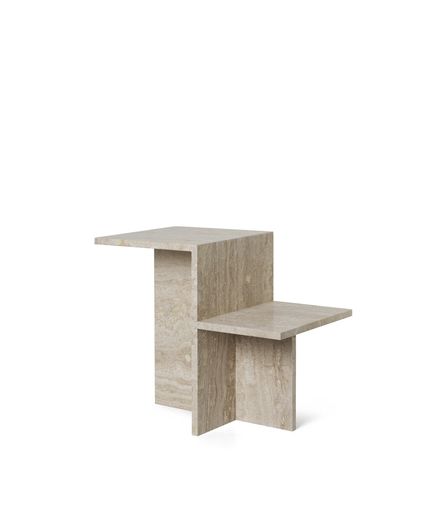 The minimalist construction creates a contrast to the richness of the travertine's earthy textures. With the natural and diverse qualities of the sand-colored limestone, it provide rawness and tangibility that highlight the architectural character of the furniture piece.
