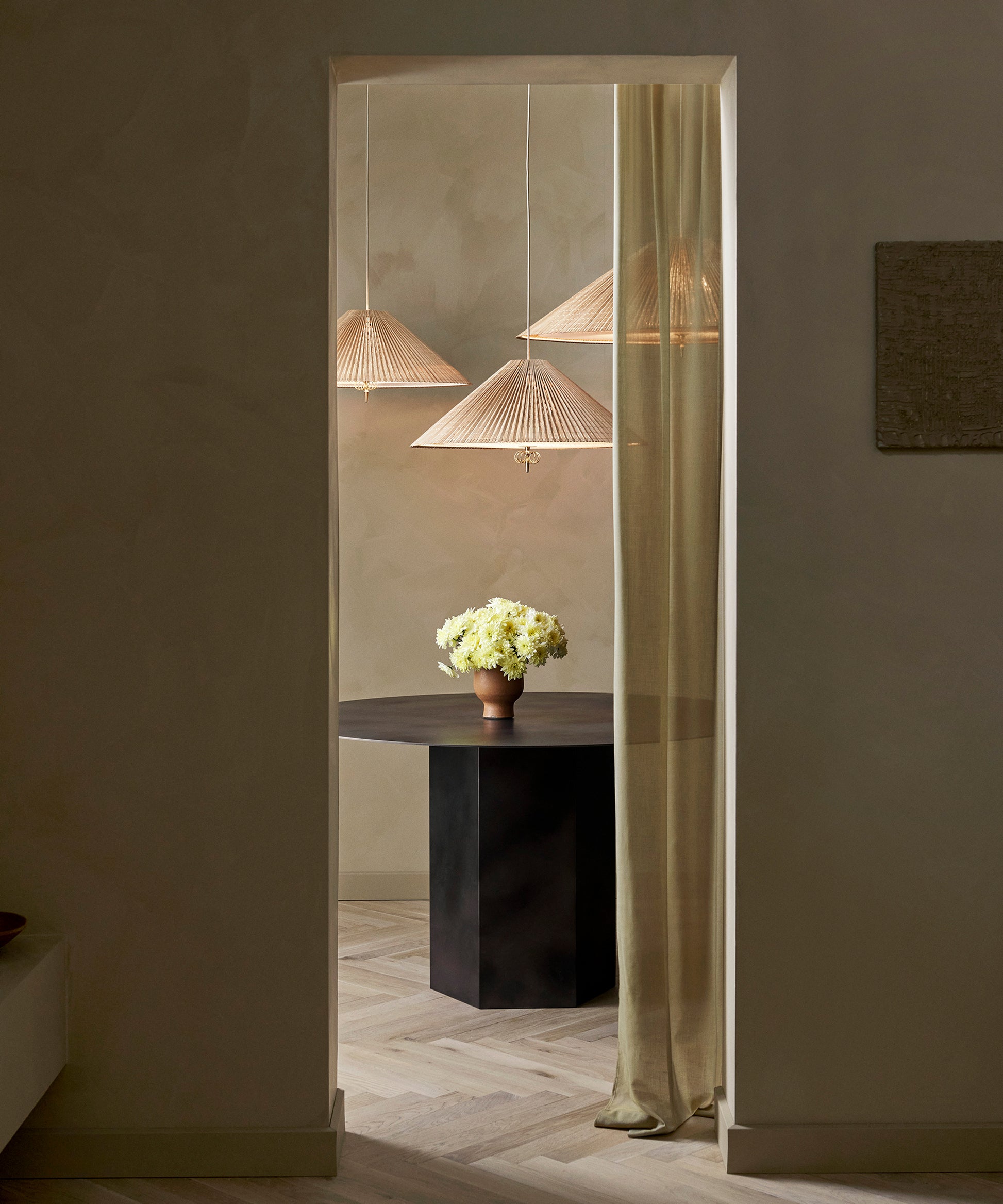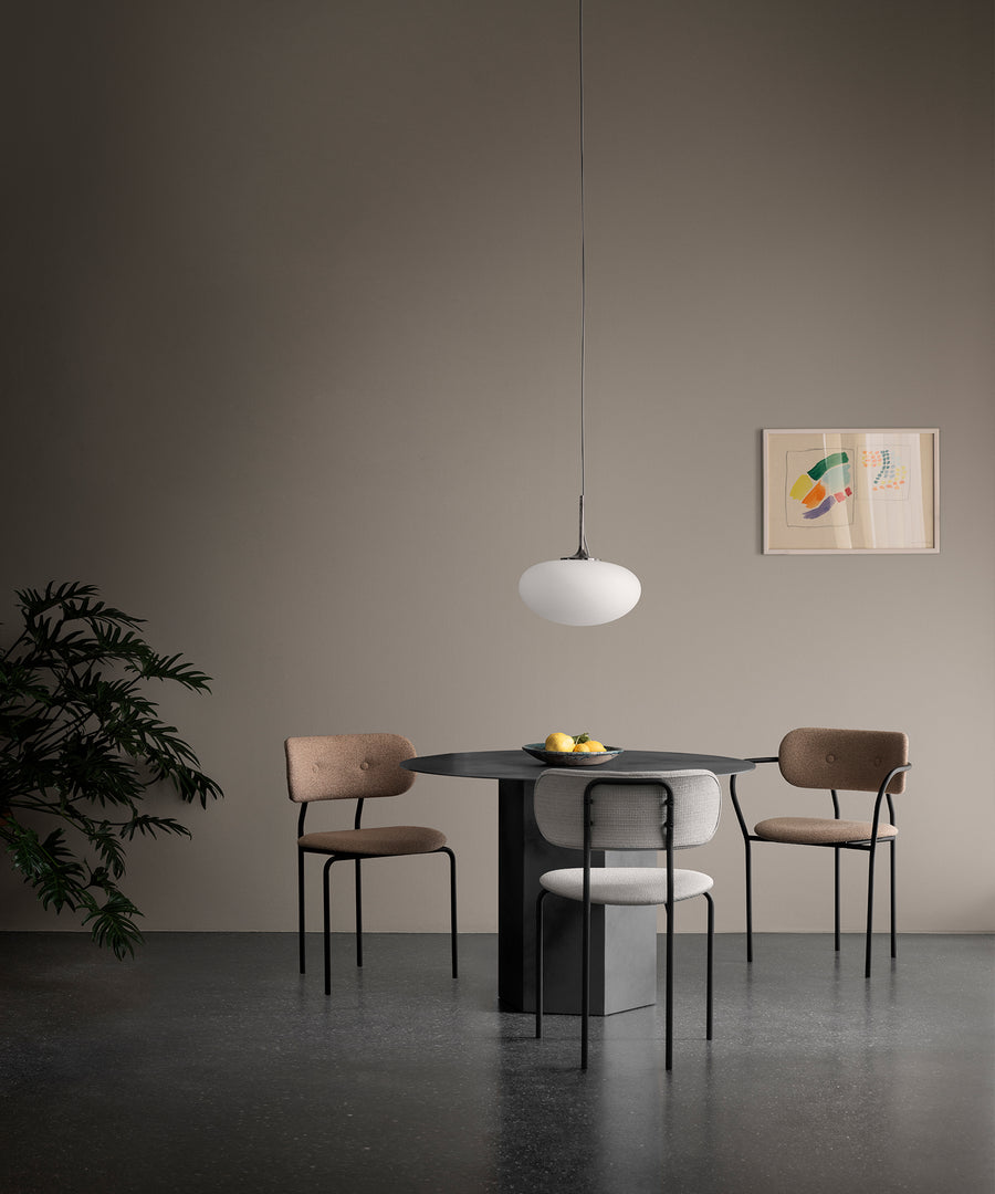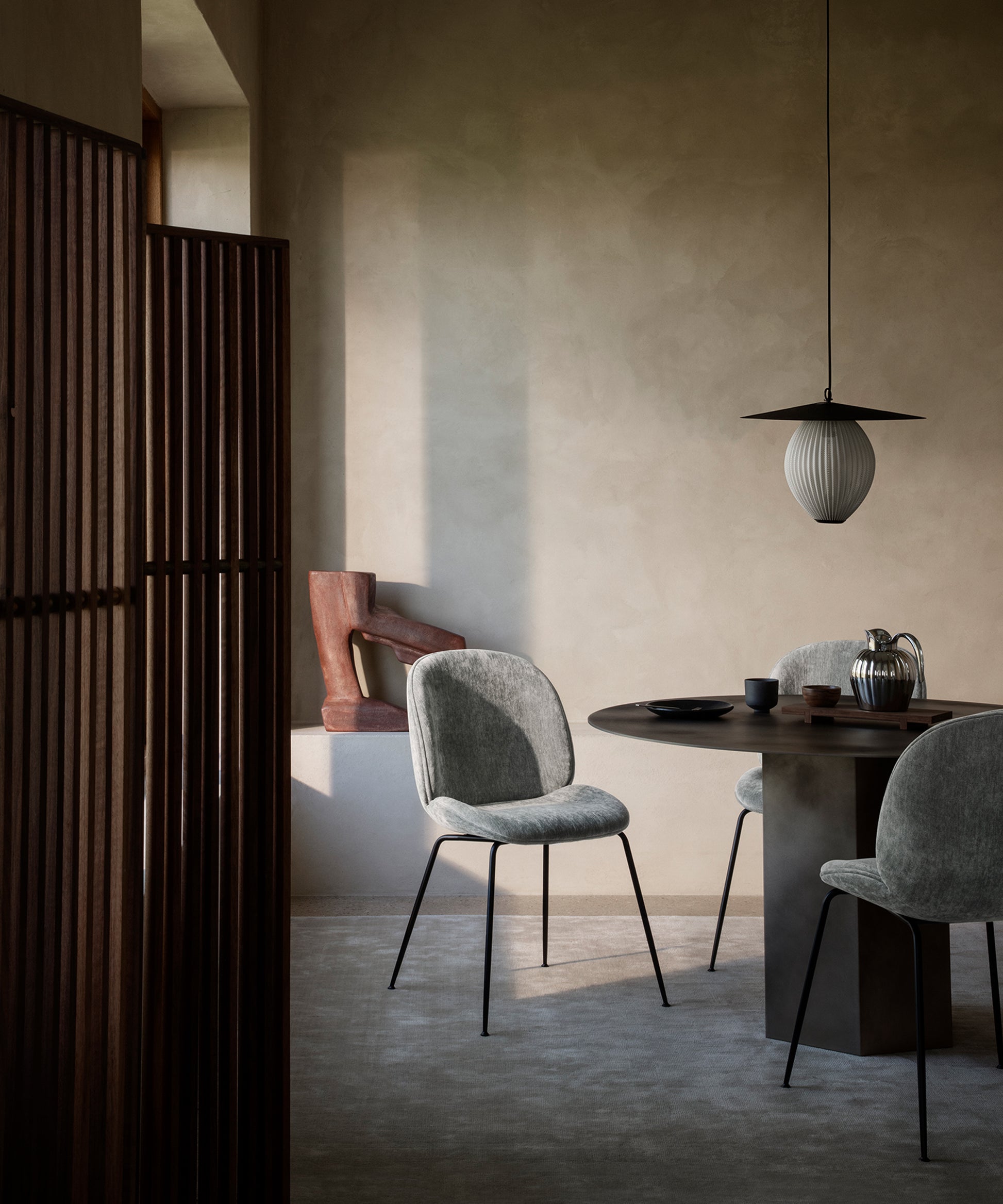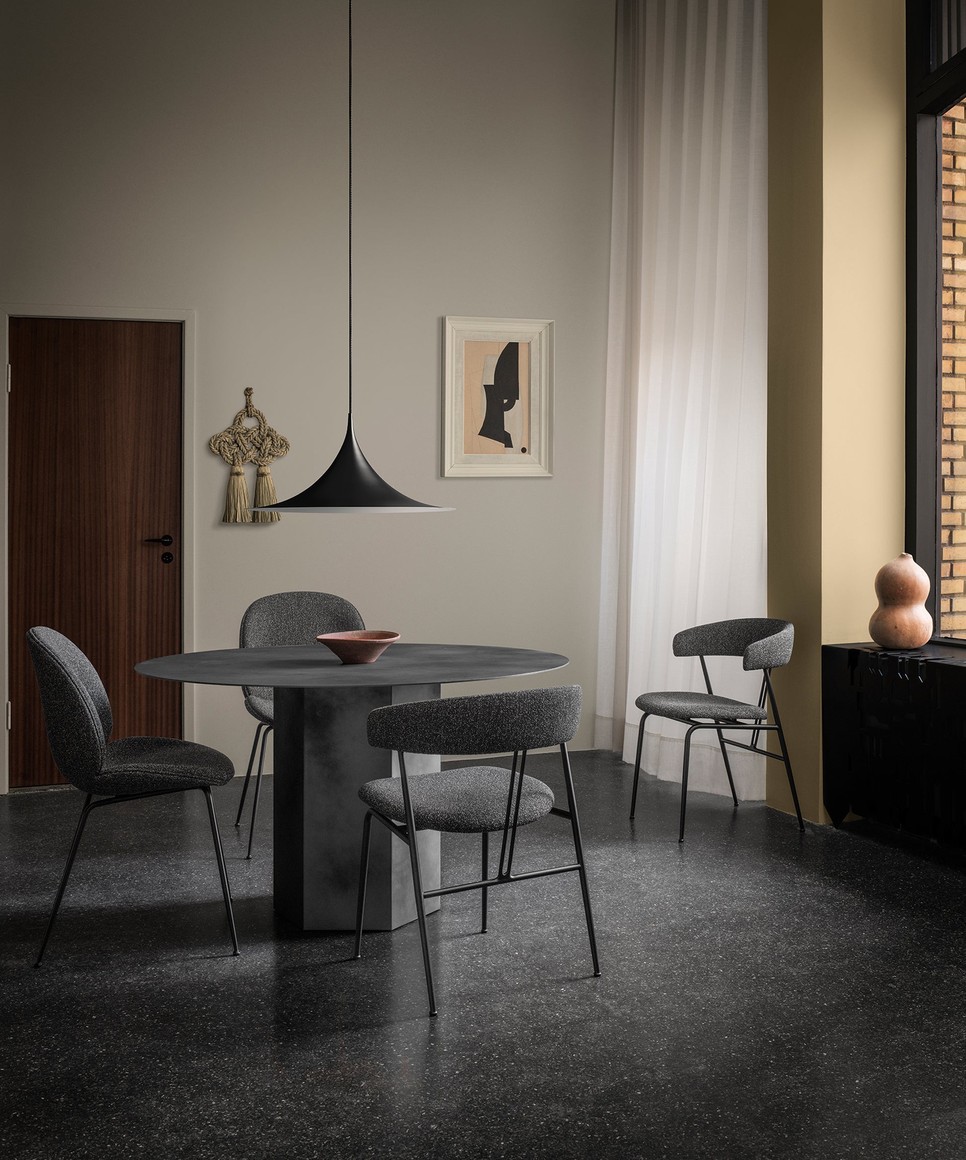 GamFratesi designed the Epic Dining Table for GUBI as a sculptural piece of furniture inspired by Greek columns and Roman architecture and named after the epic poems of ancient times.