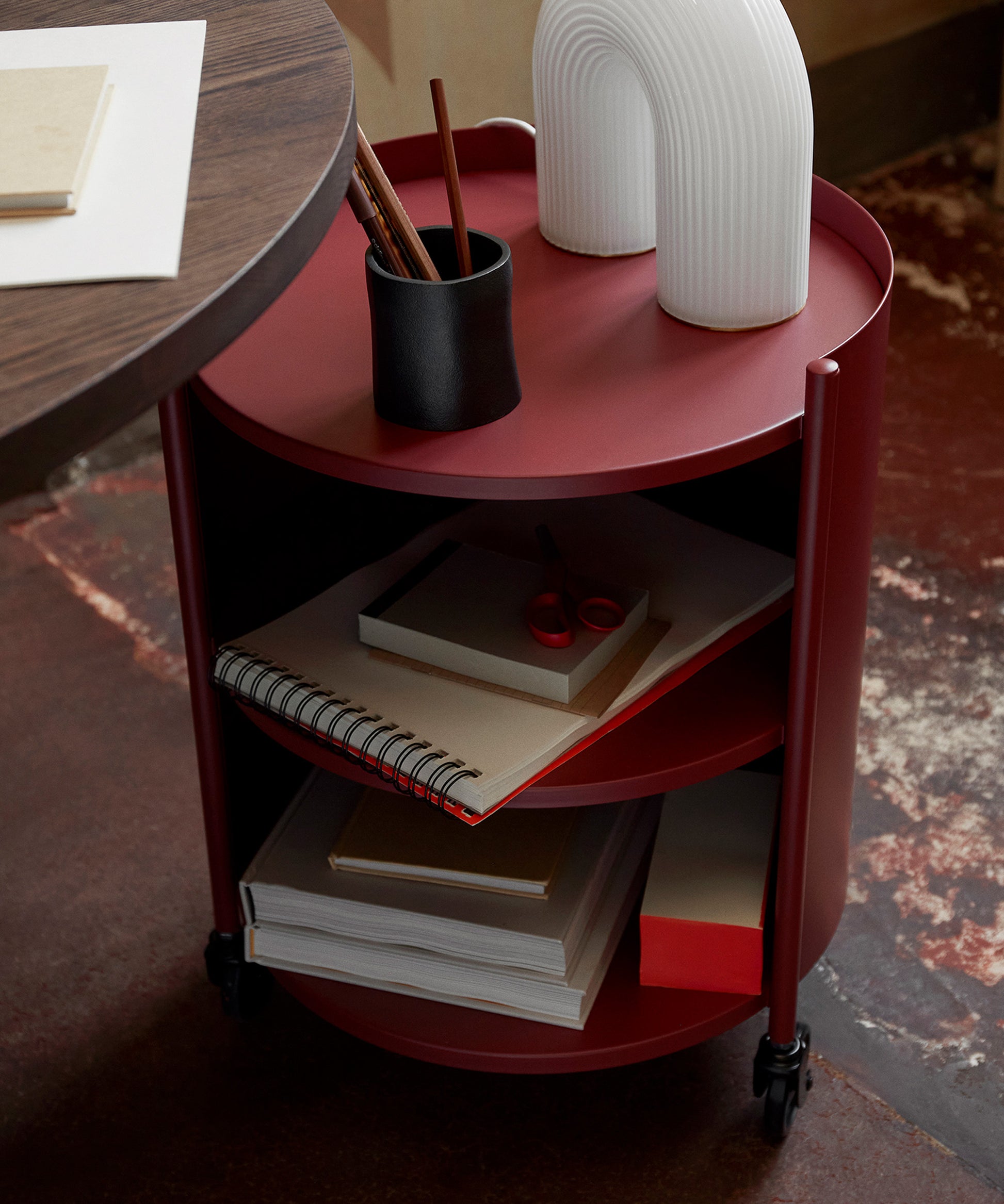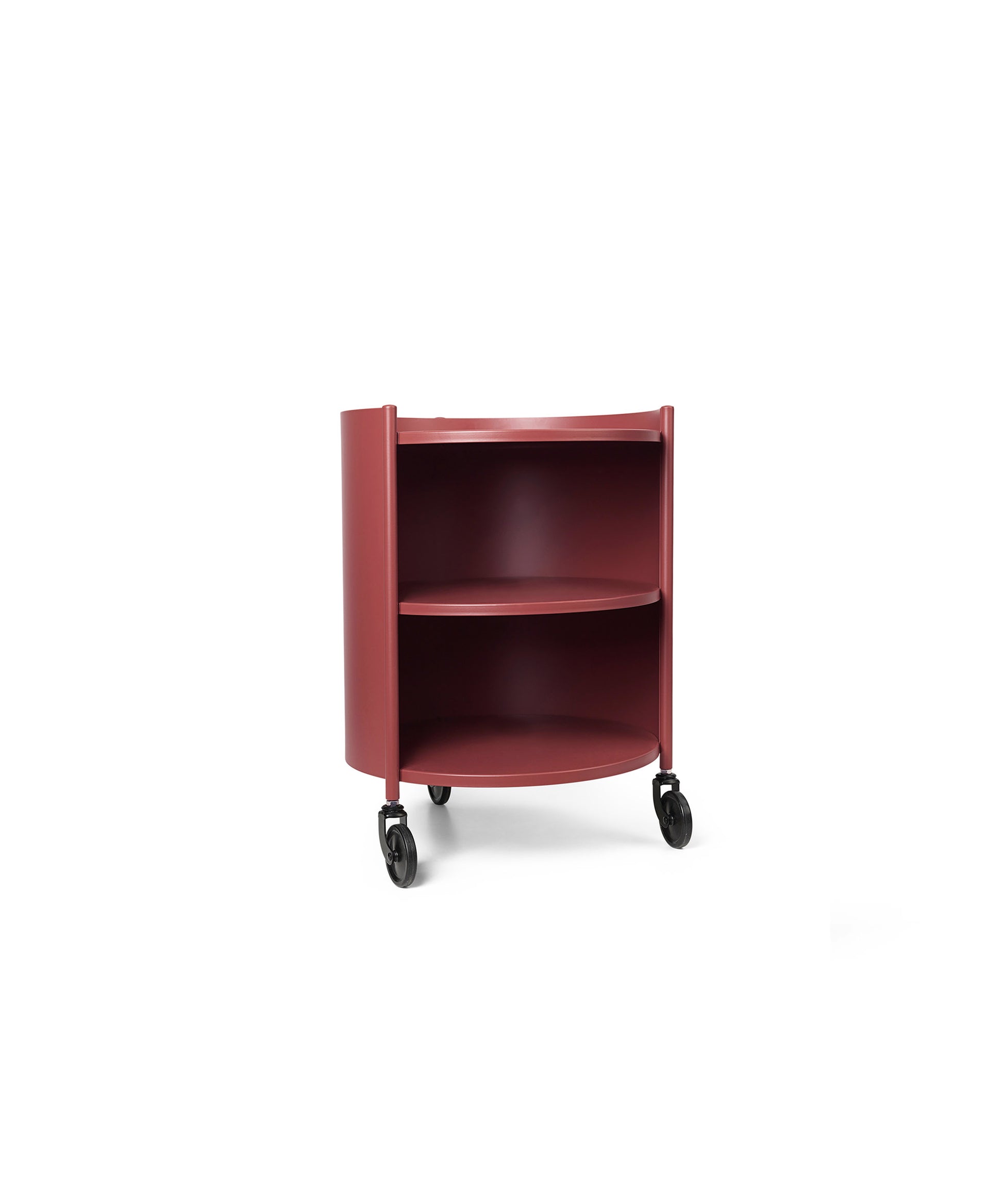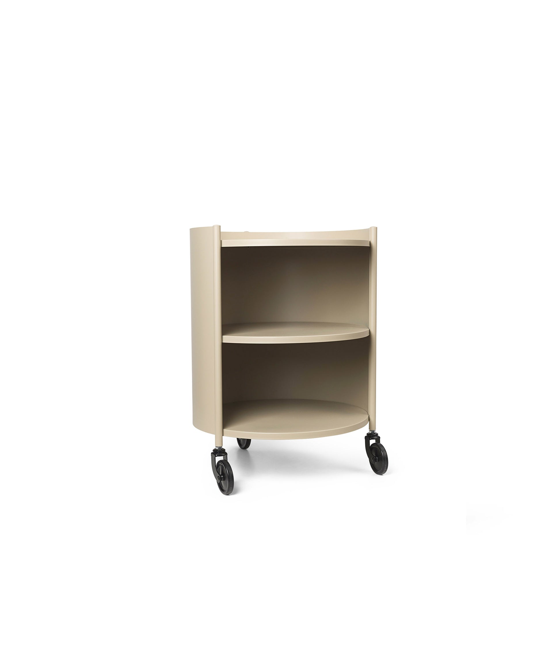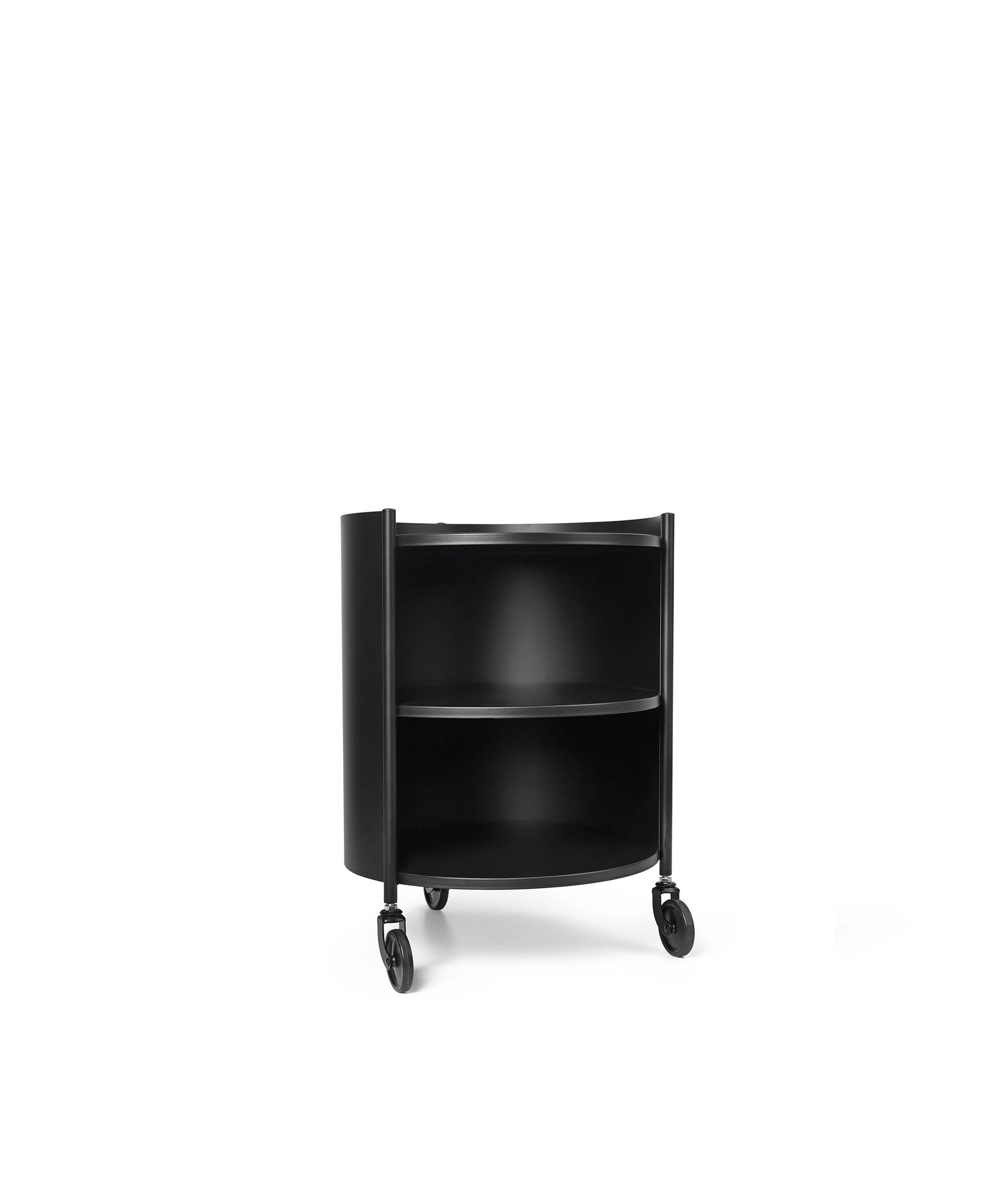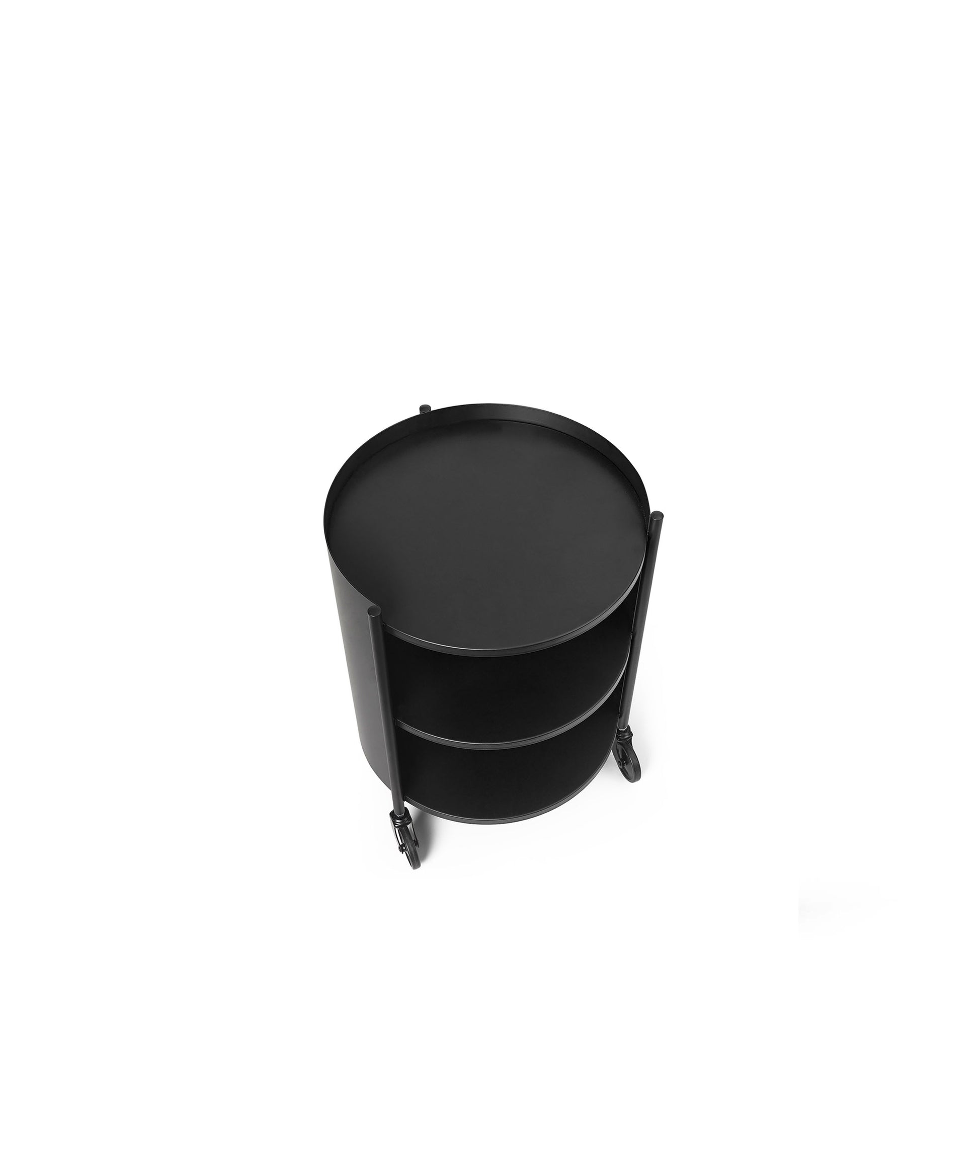 Defined by its appealing cylinder shape and three large wheels, the Eve Storage is a versatile piece made from durable, powder-coated steel with three shelves, two of which are partially hidden behind the sleek frame.