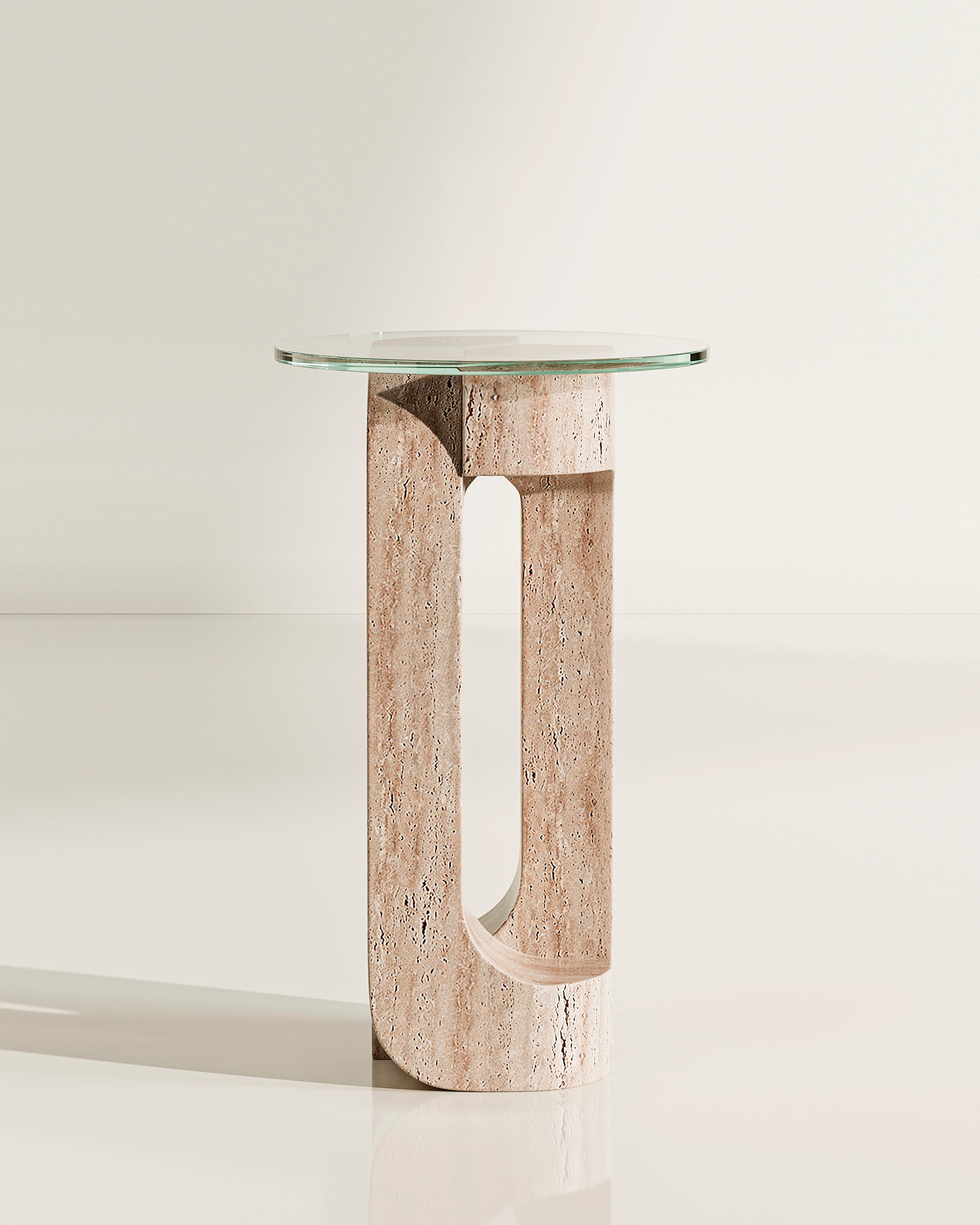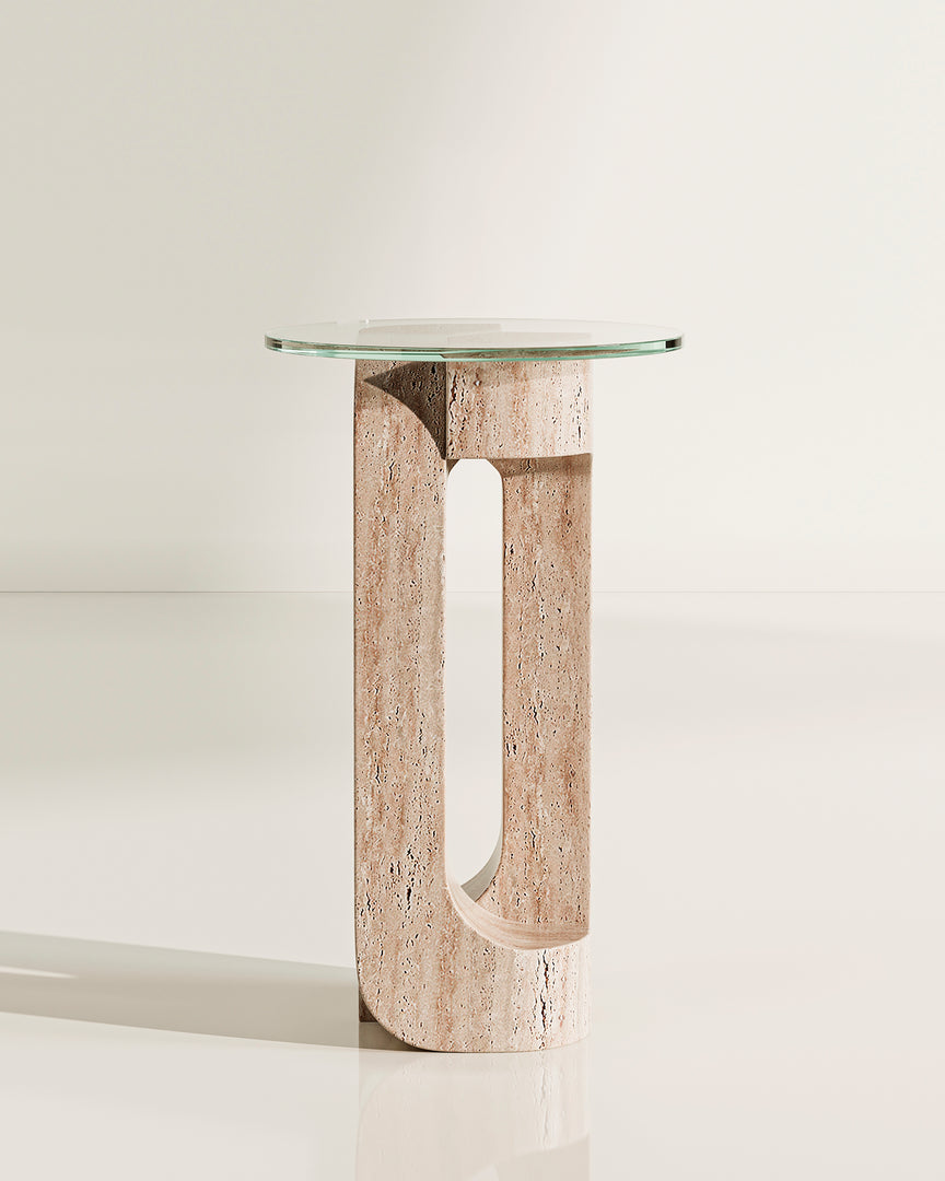 Pictured in Grey Travertine Base and Clear Tempered Glass Top.