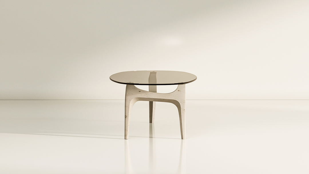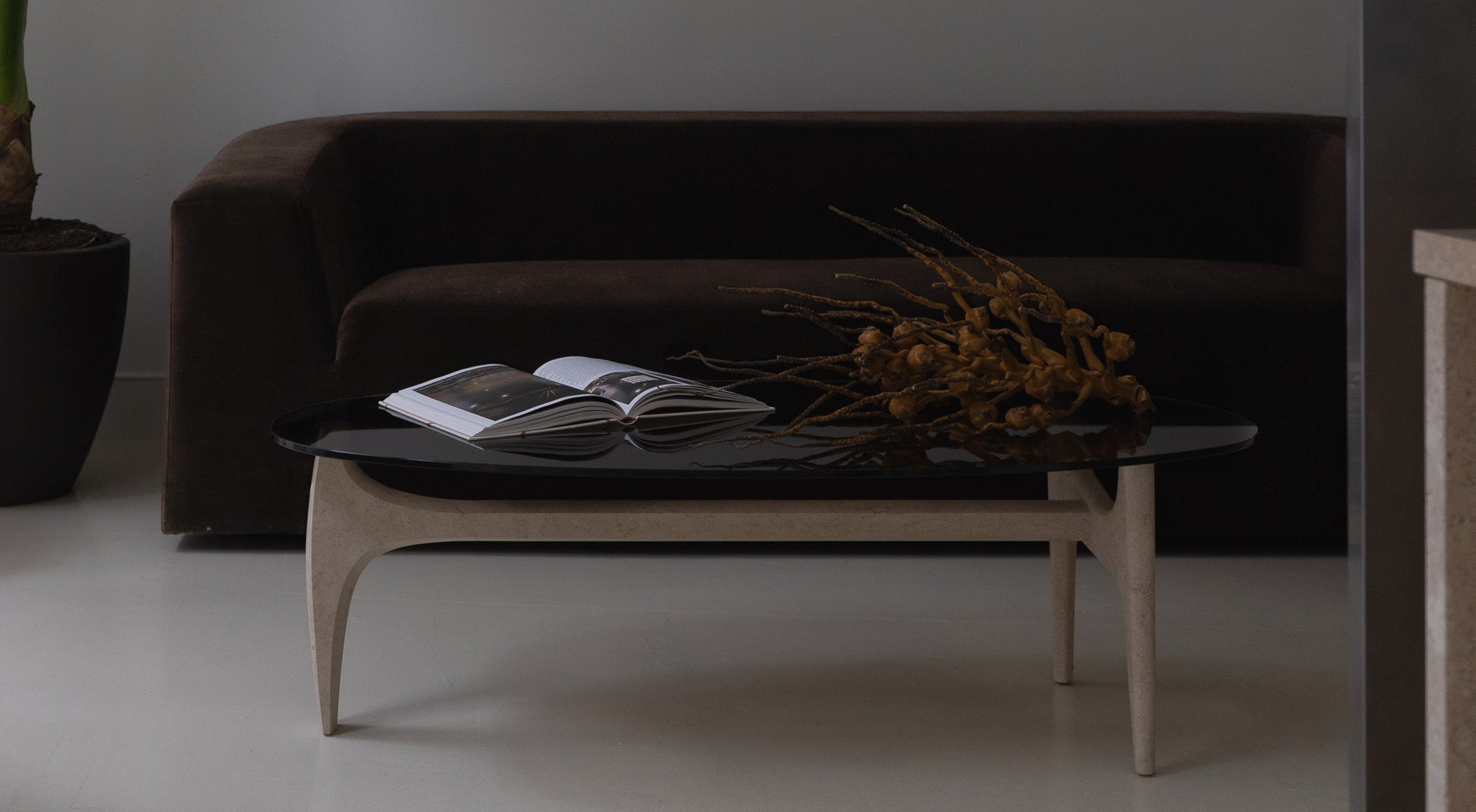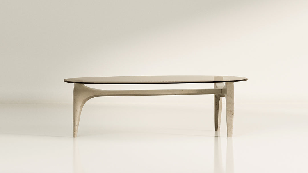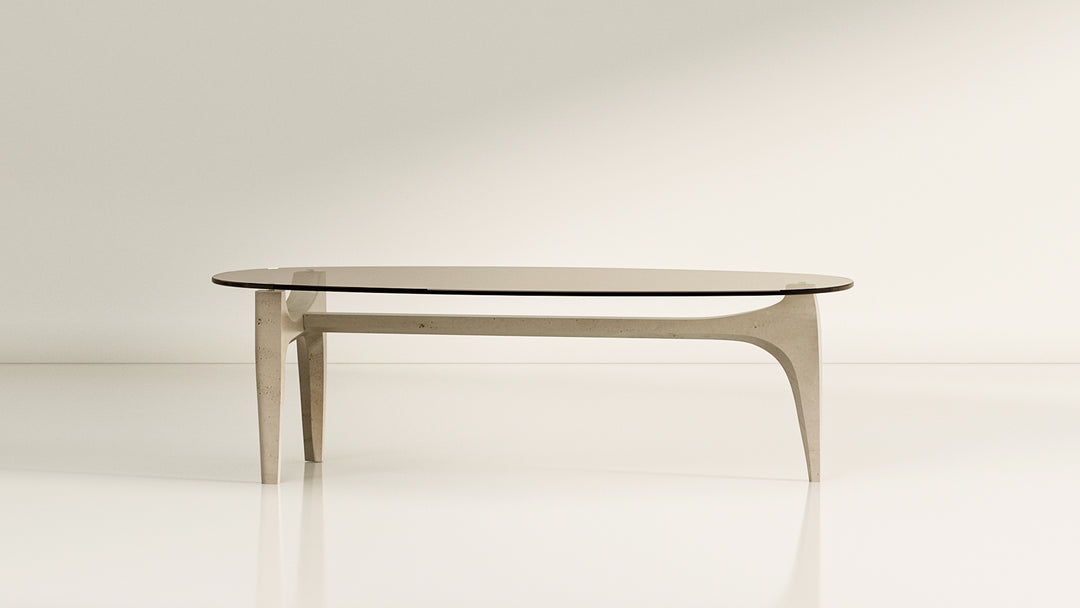 The Kyaman Coffee Table points to the gold jewelry that decorates the hair of the Kyaman women of the Ivory Coast. The pieces are made from a carved limestone base and a bronzed glass top.
