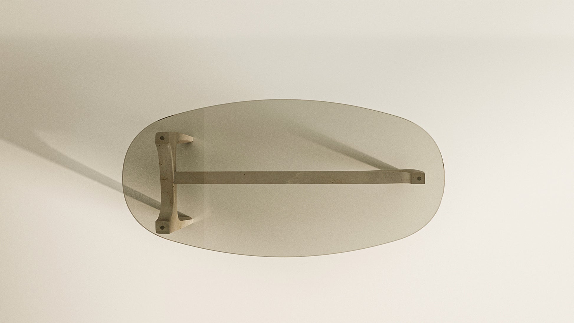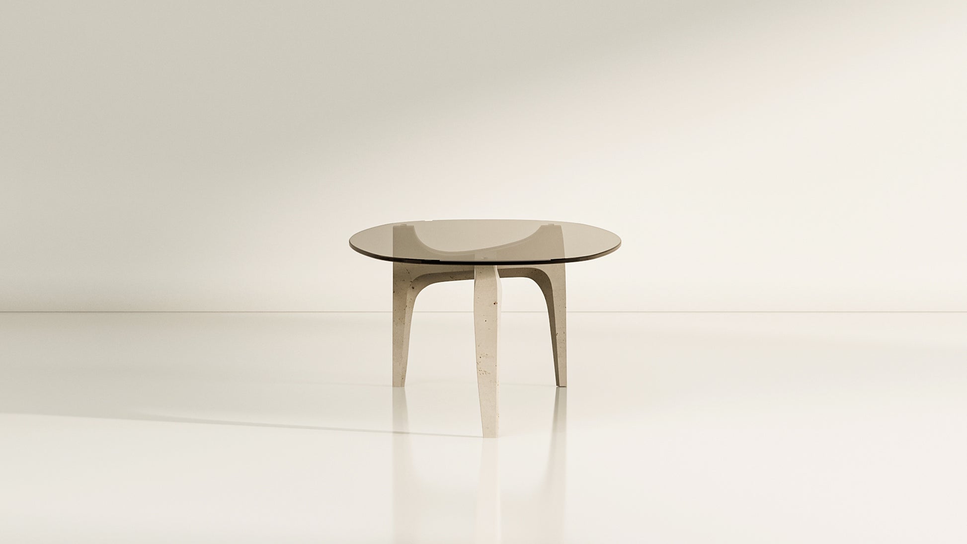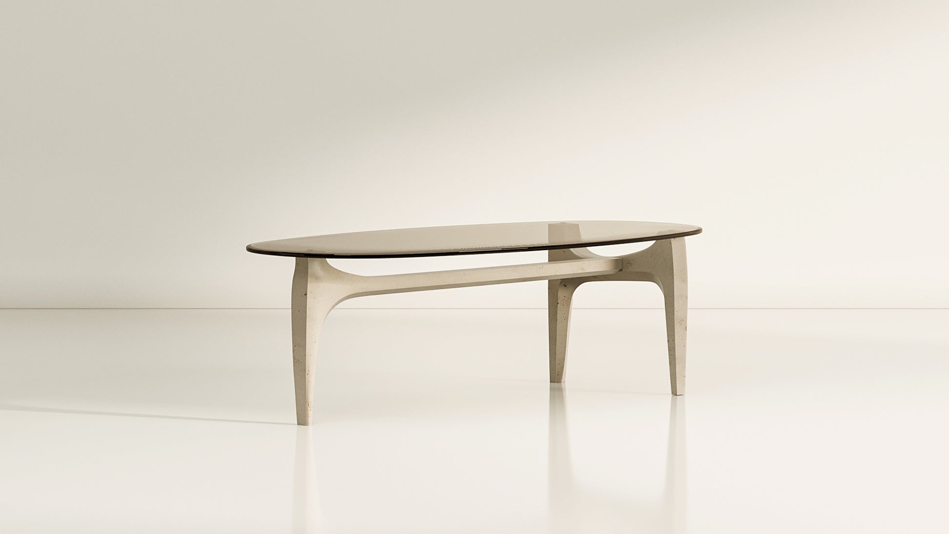 The Kyaman Coffee Table points to the gold jewelry that decorates the hair of the Kyaman women of the Ivory Coast. The pieces are made from a carved limestone base and a bronzed glass top.