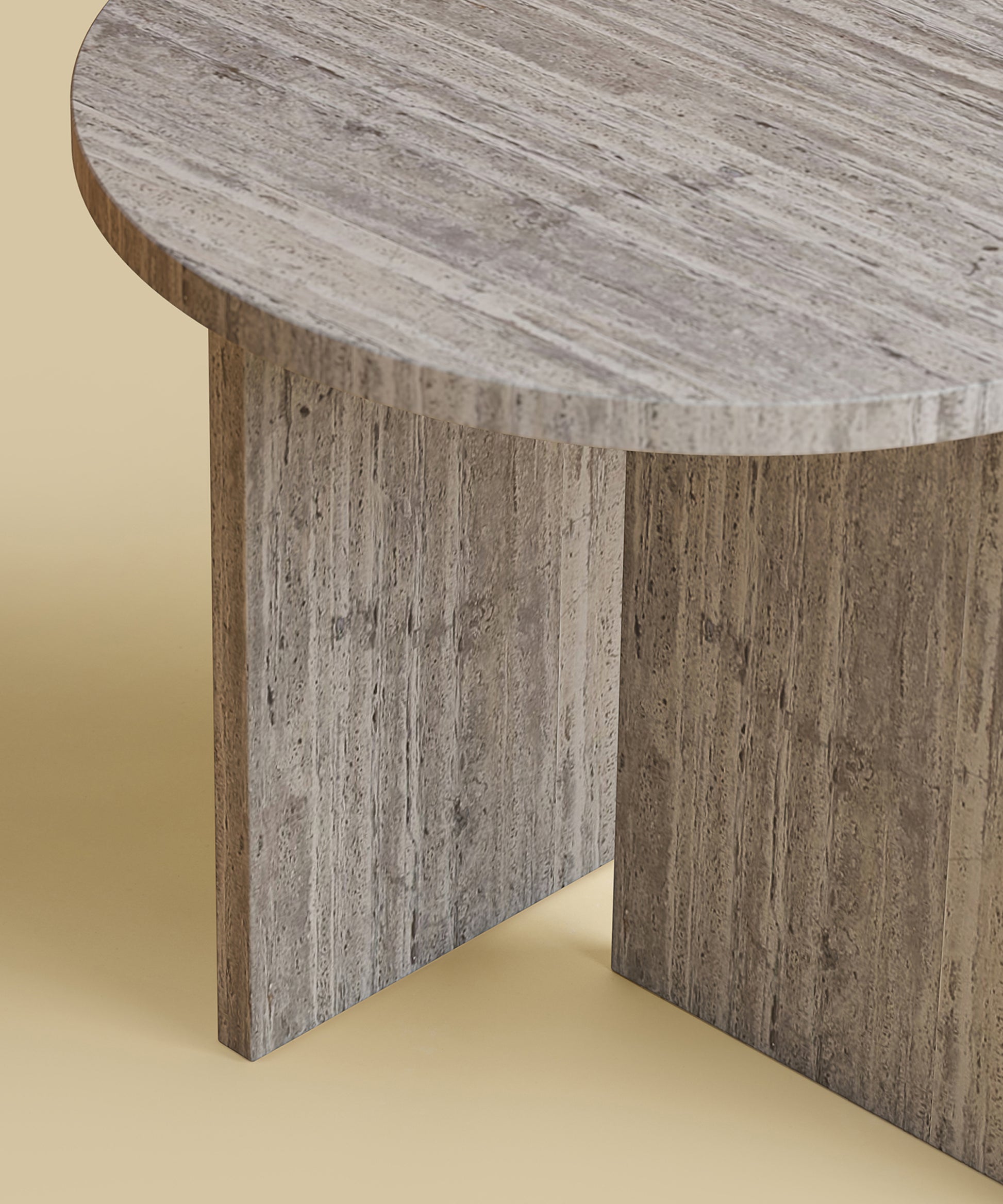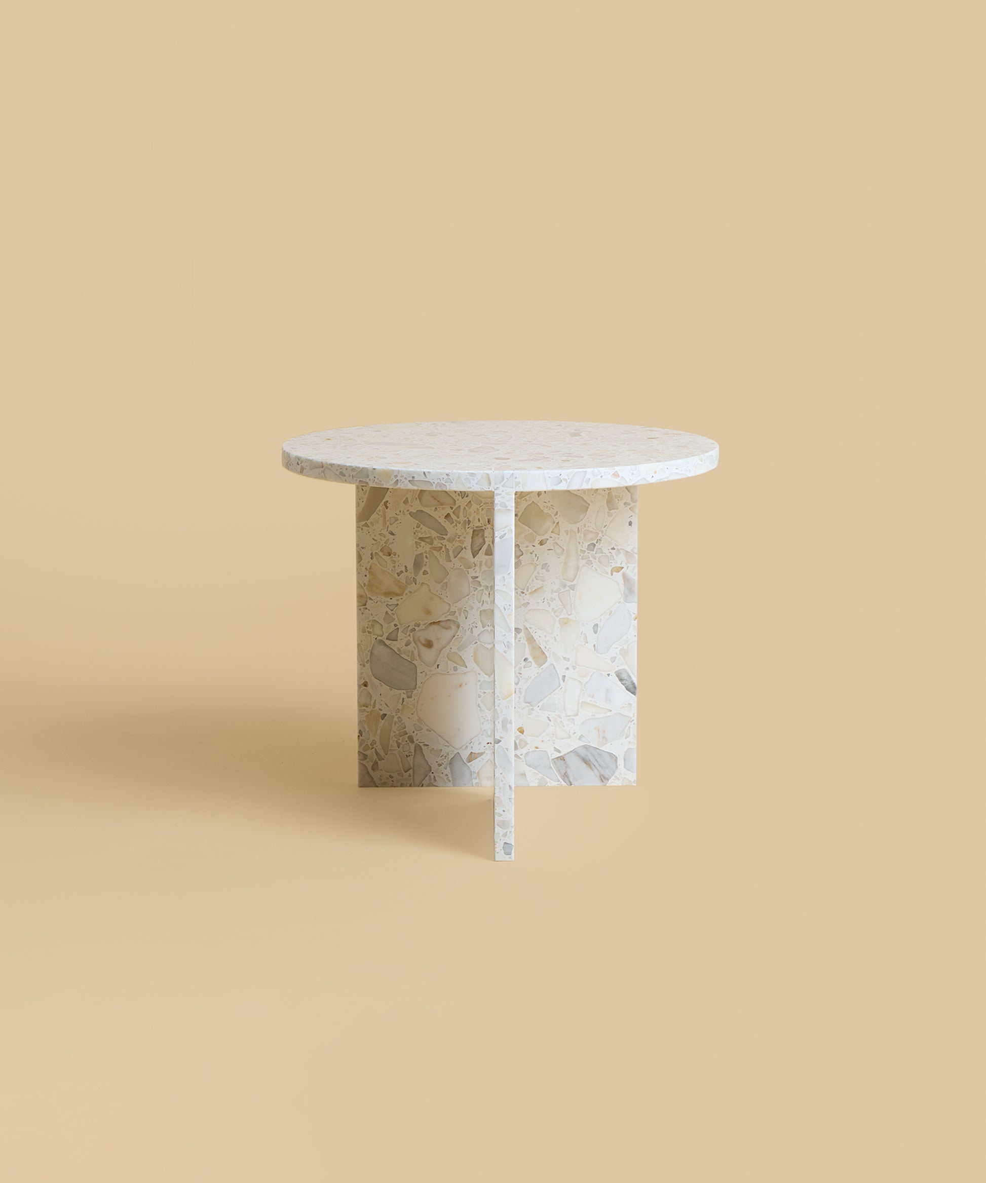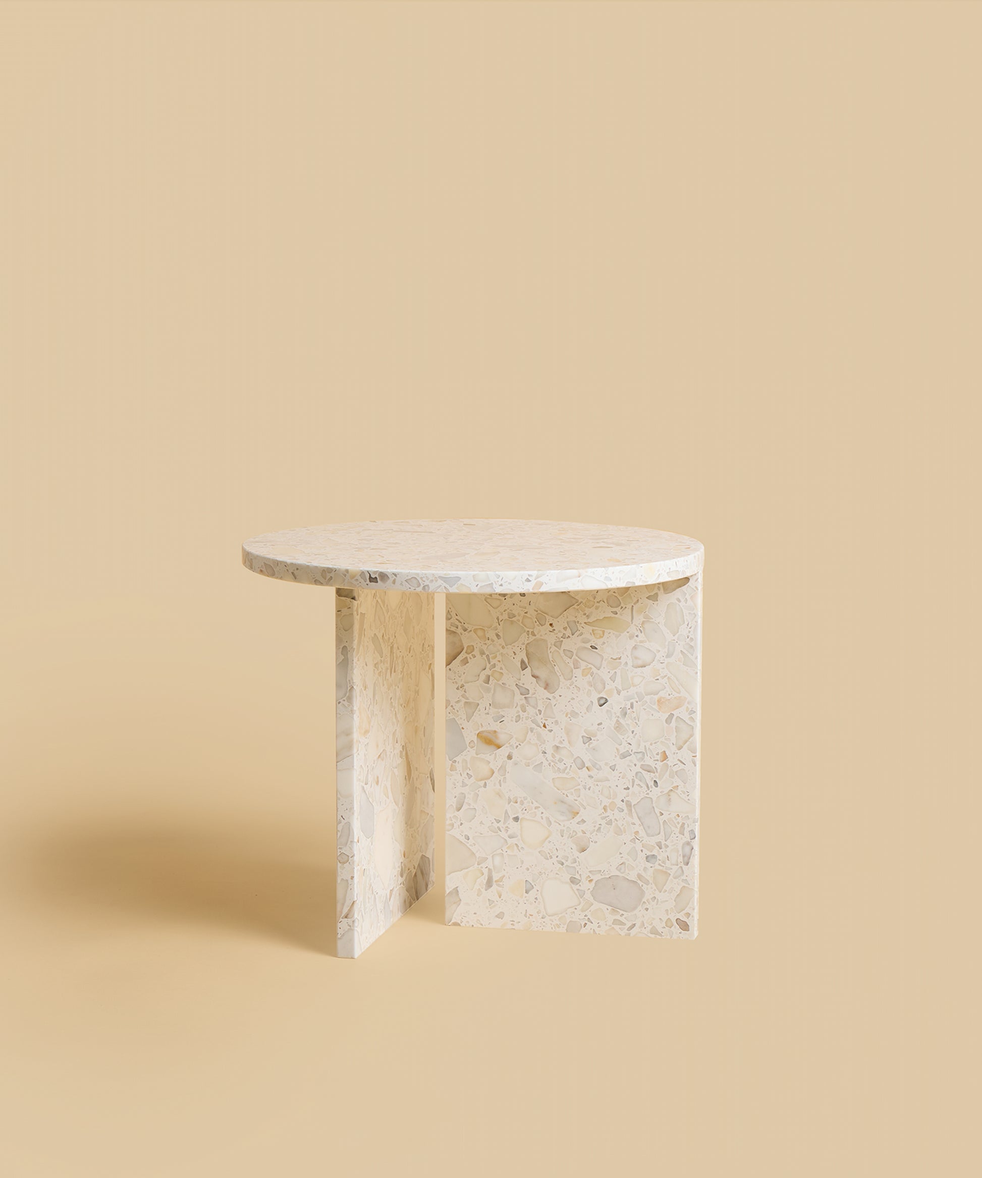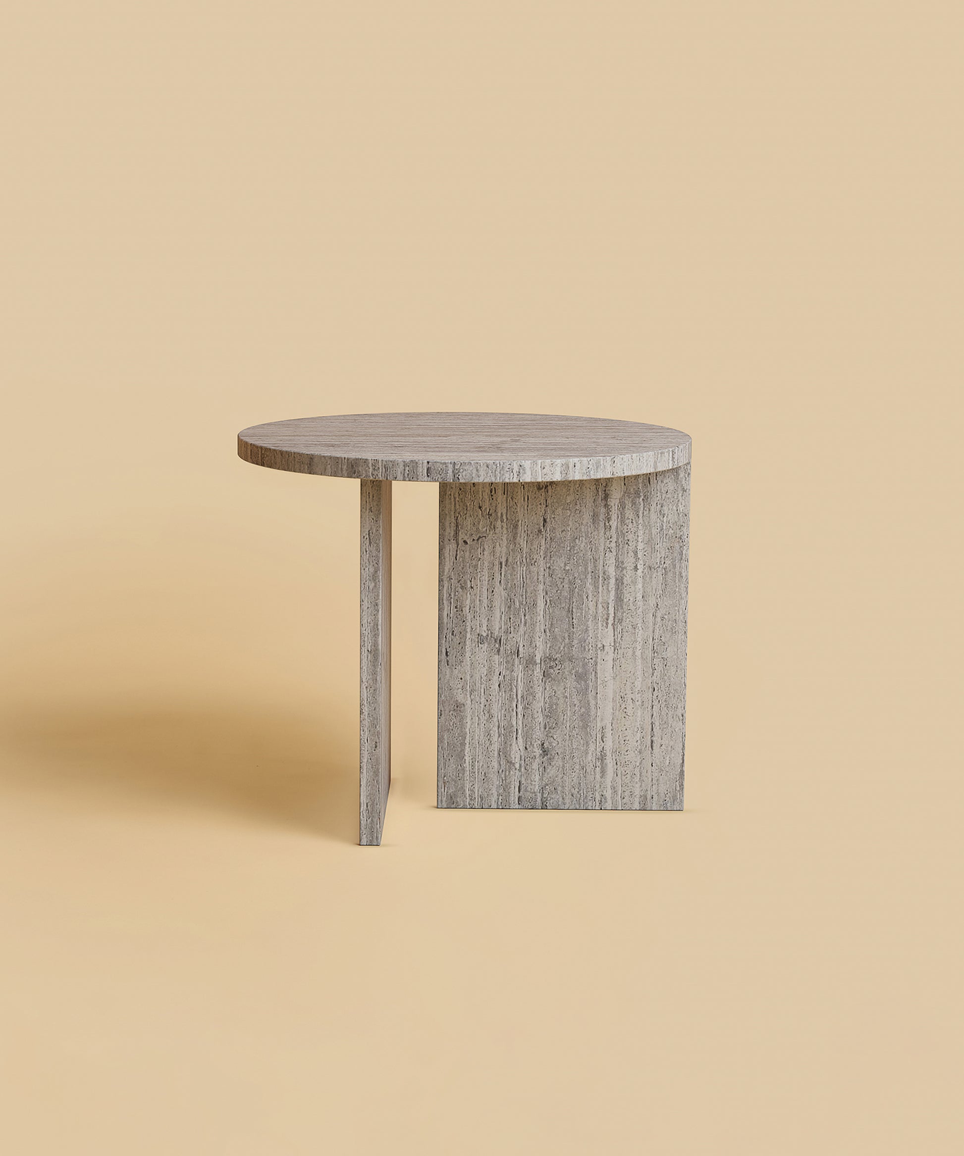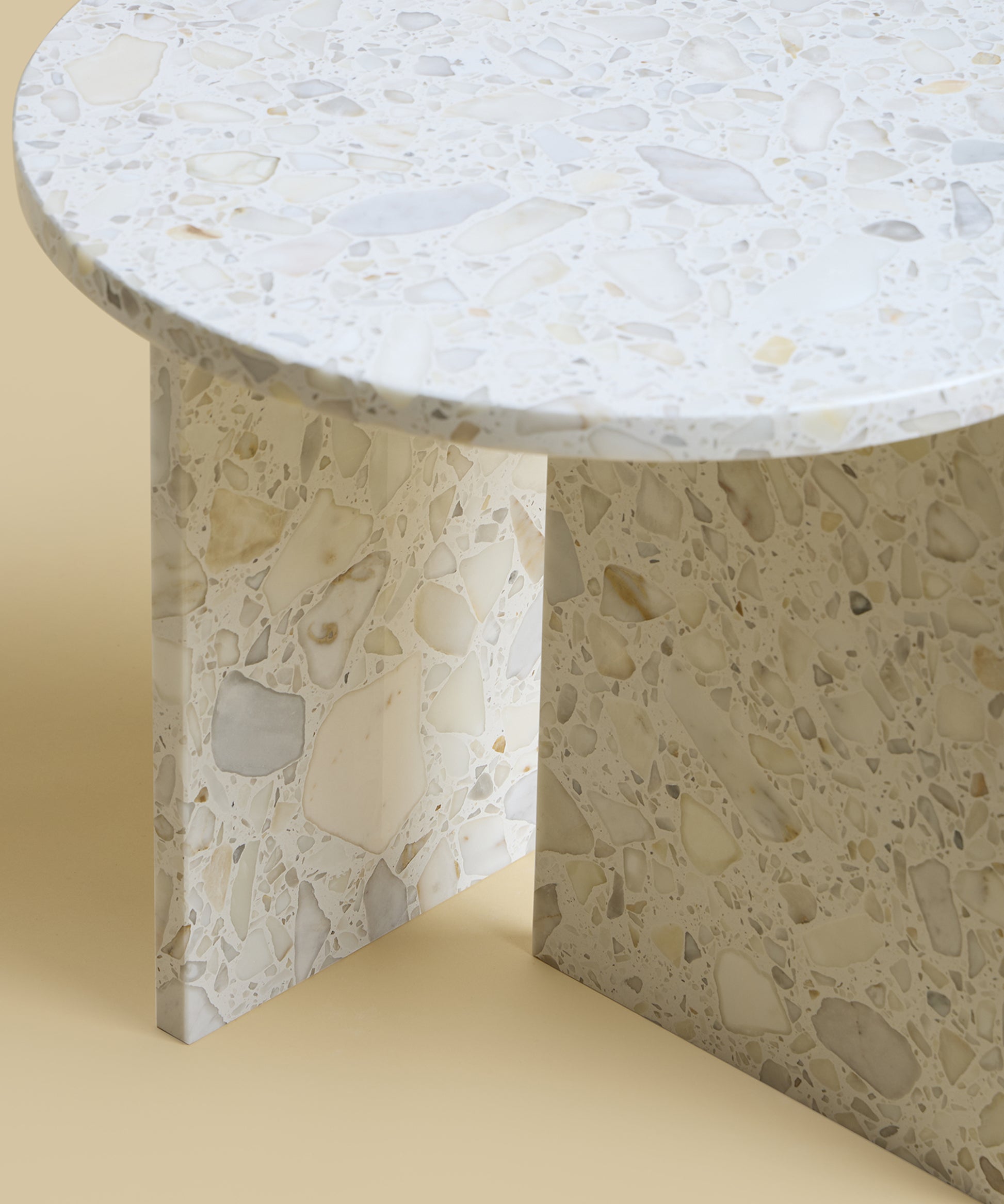 The legs are made from two travertine slabs, two Marble slabs, or, two terrazzo slabs in which one part is interlocked on the top. One part of the leg is interlocked on the top. Carrara terrazzo, a material that is obtained by mixing first-rate grits, is selected by size and color. The top is circular and has a diameter of 17.7 inches.