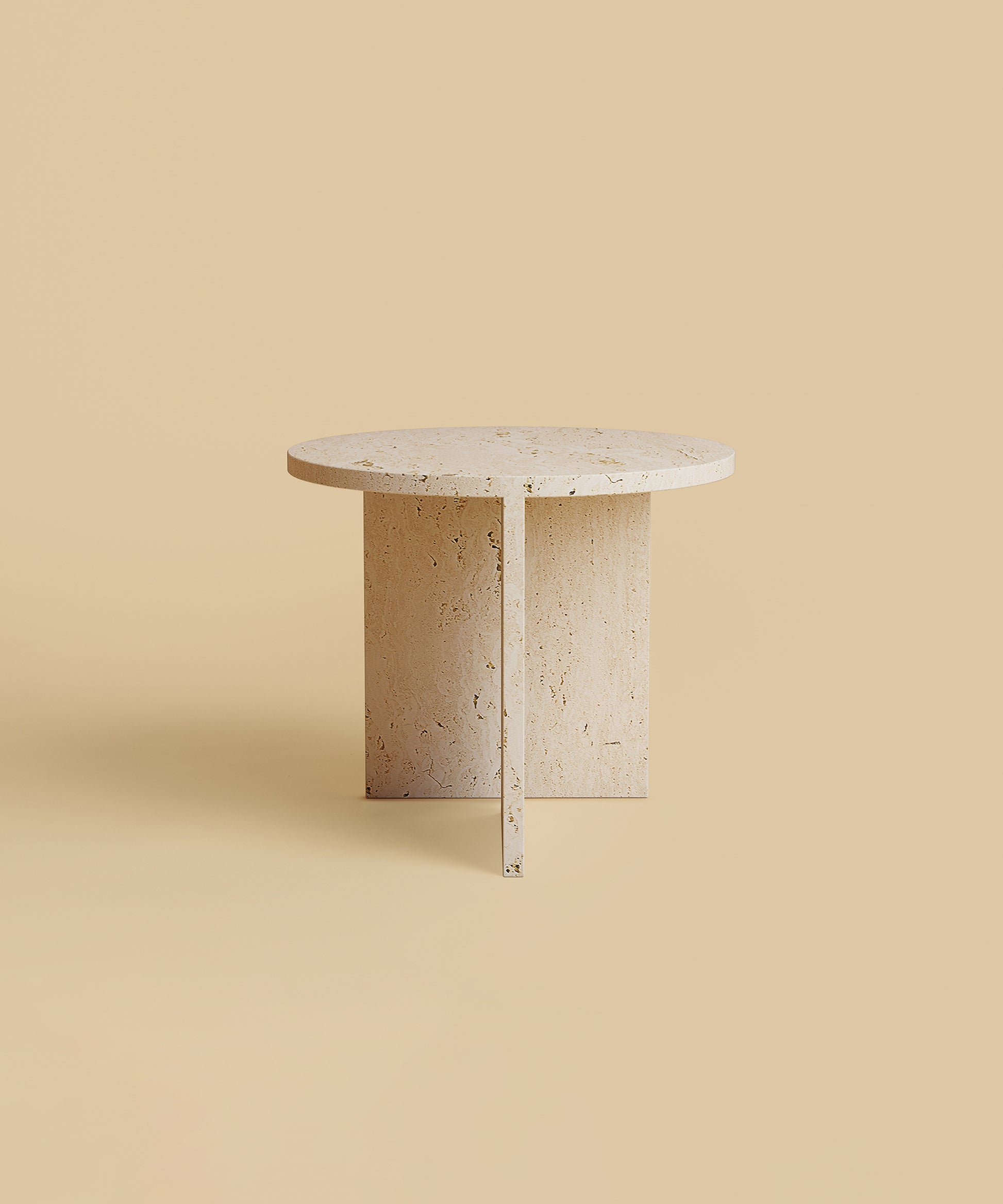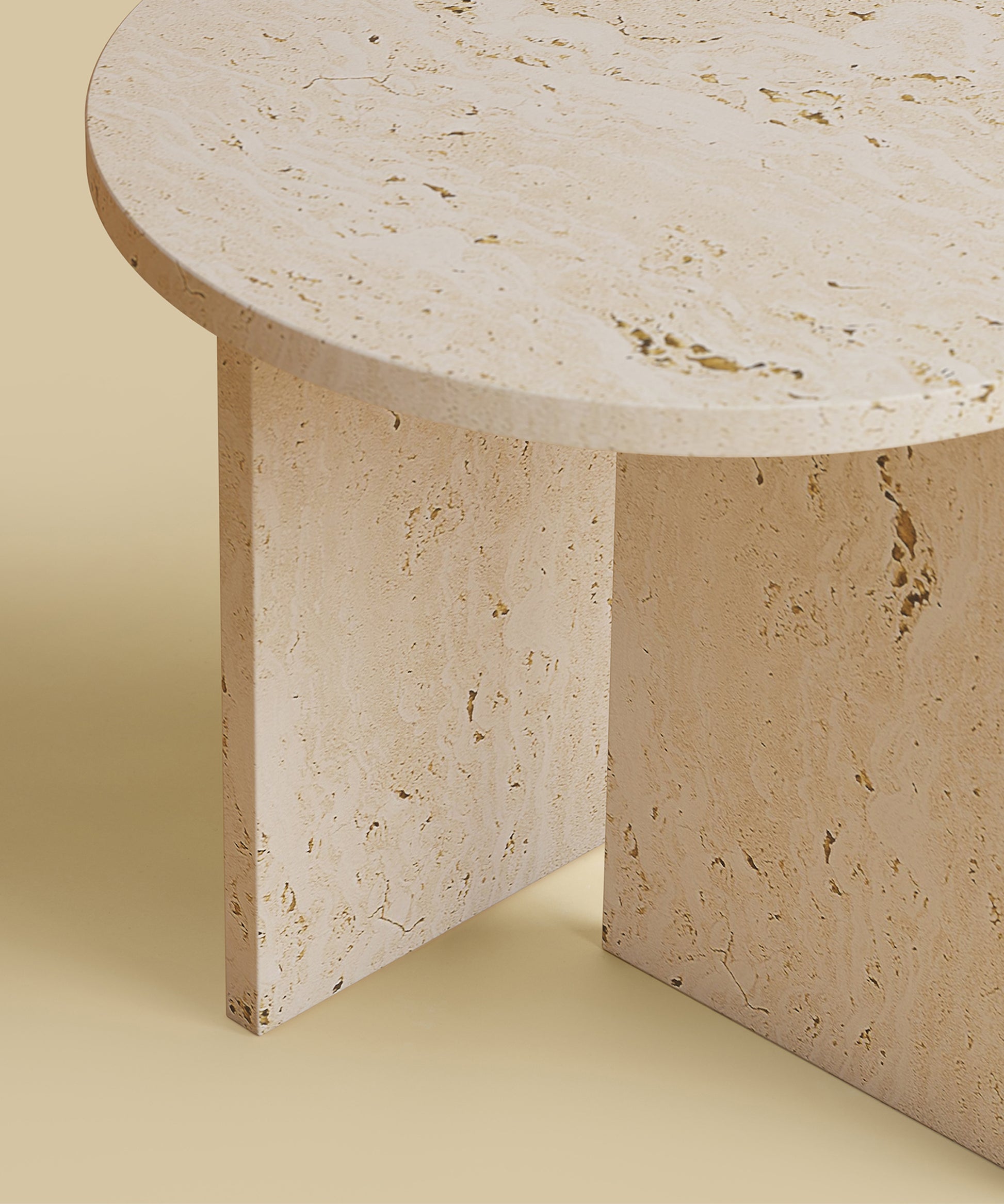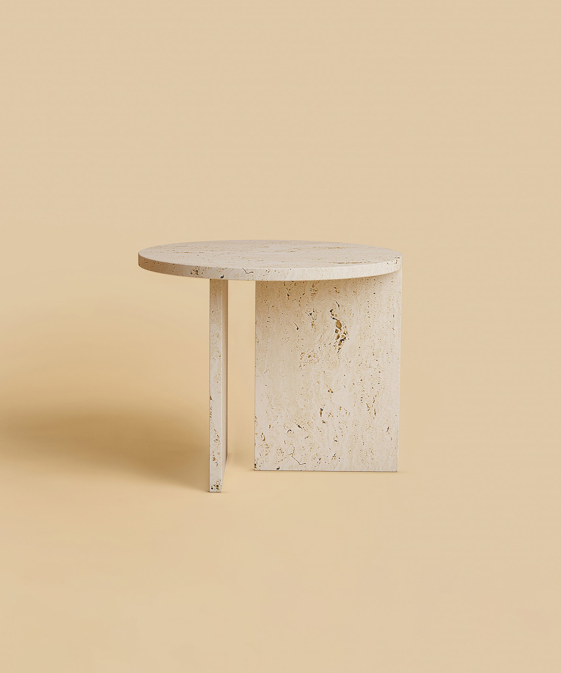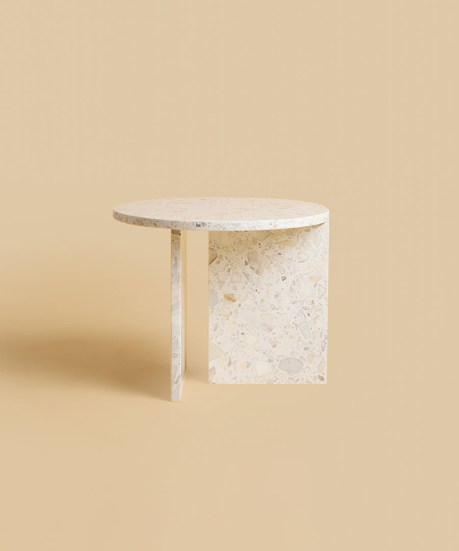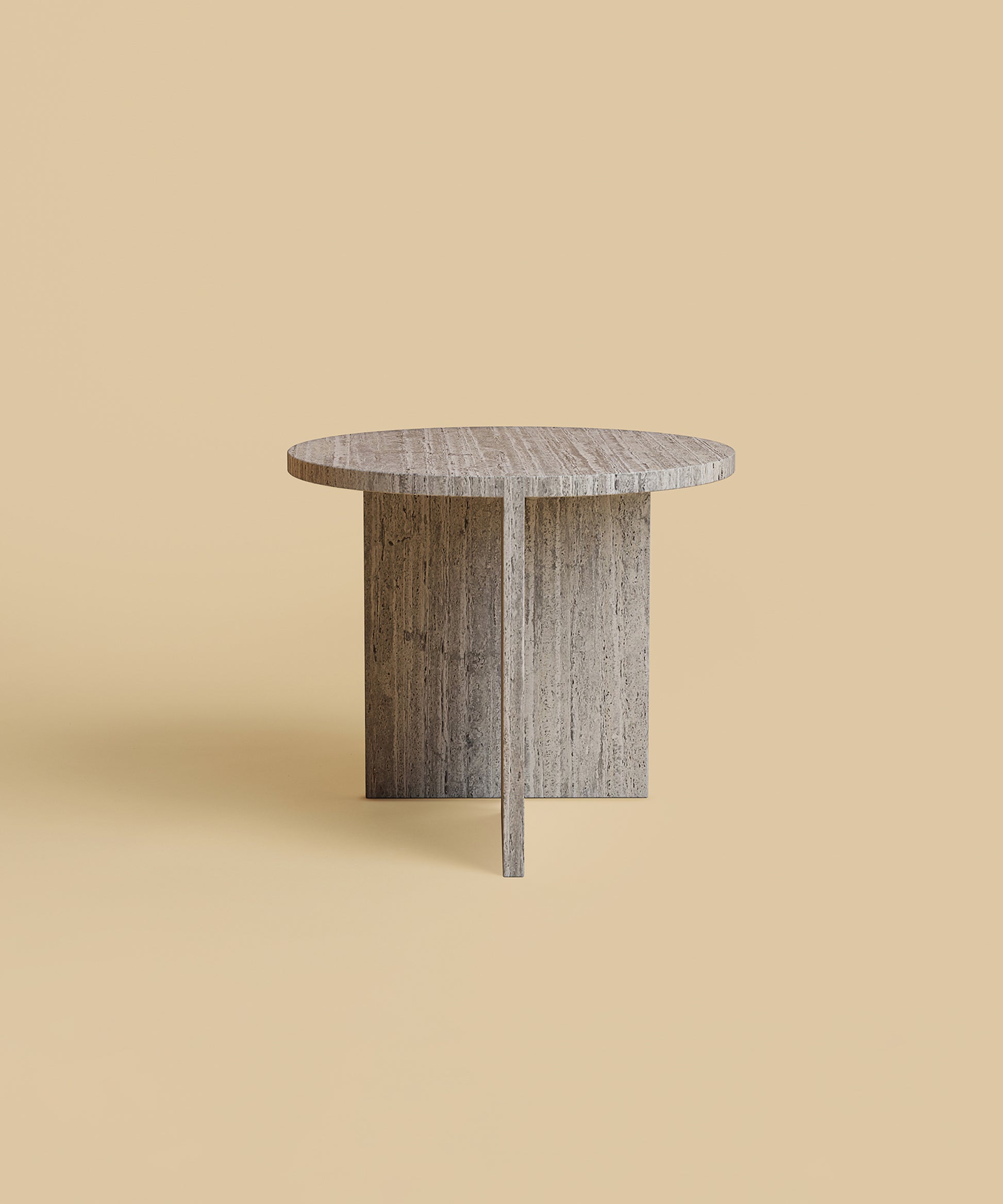 The legs are made from two travertine slabs, two Marble slabs, or, two terrazzo slabs in which one part is interlocked on the top. One part of the leg is interlocked on the top. Carrara terrazzo, a material that is obtained by mixing first-rate grits, is selected by size and color. The top is circular and has a diameter of 17.7 inches.