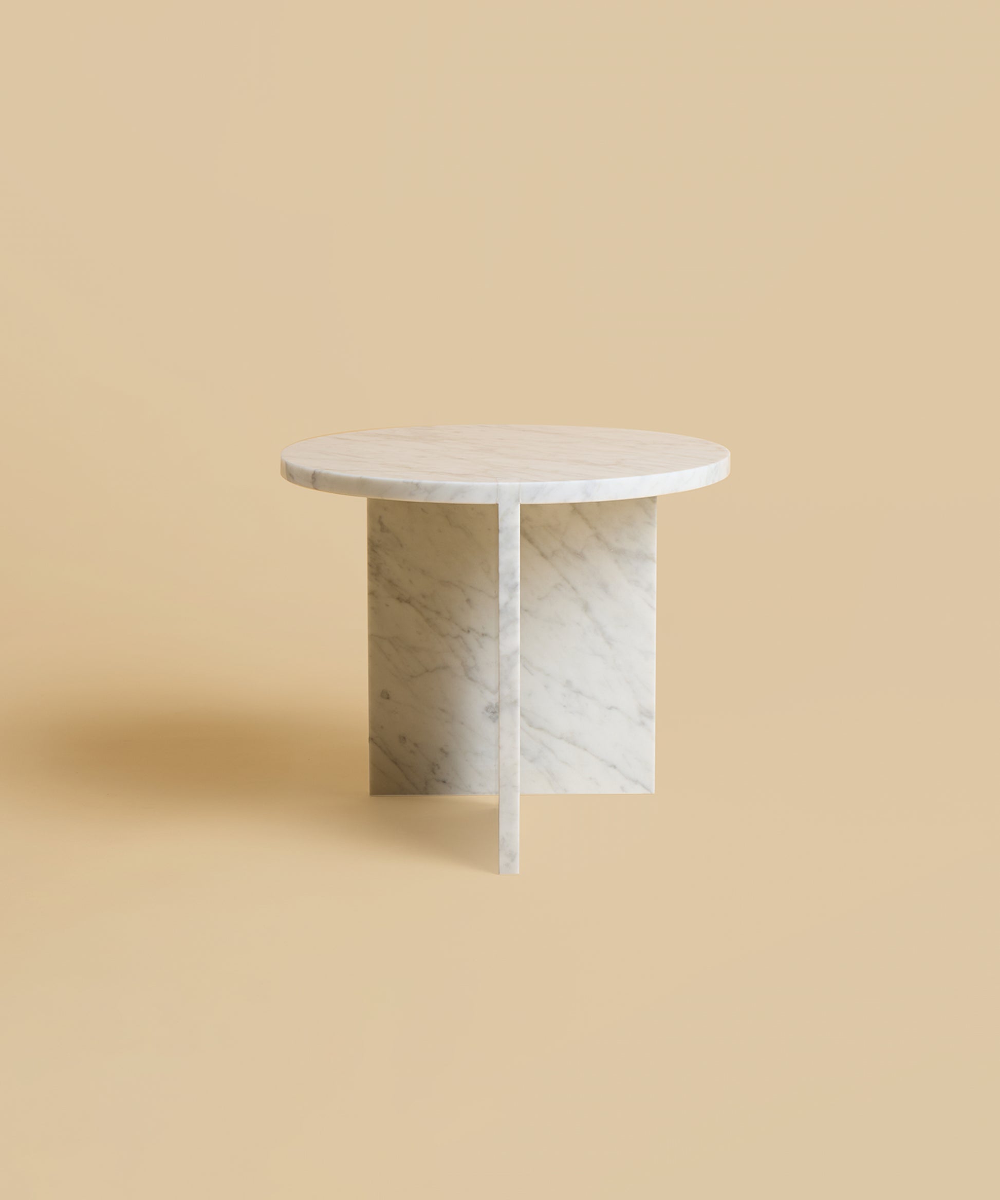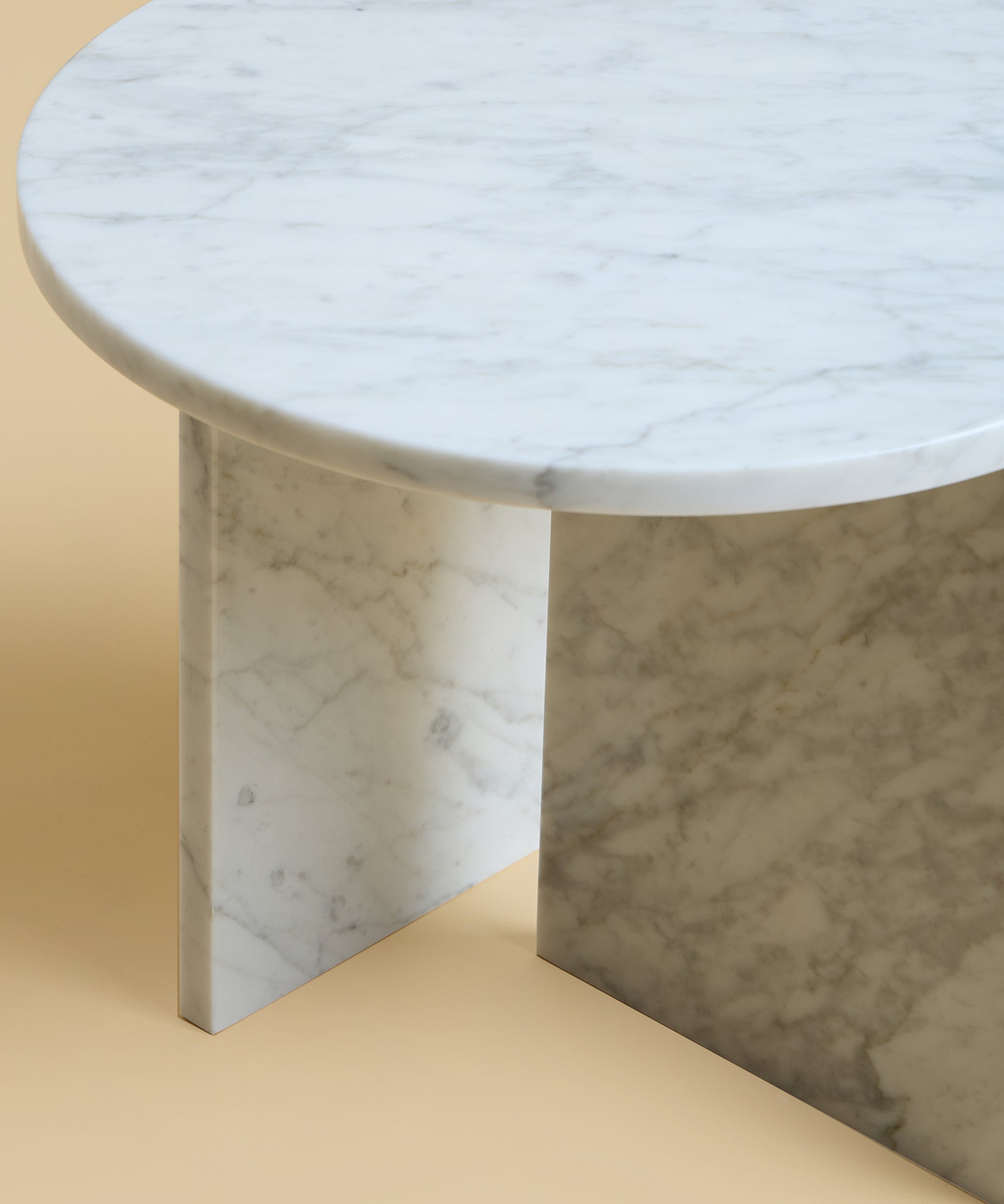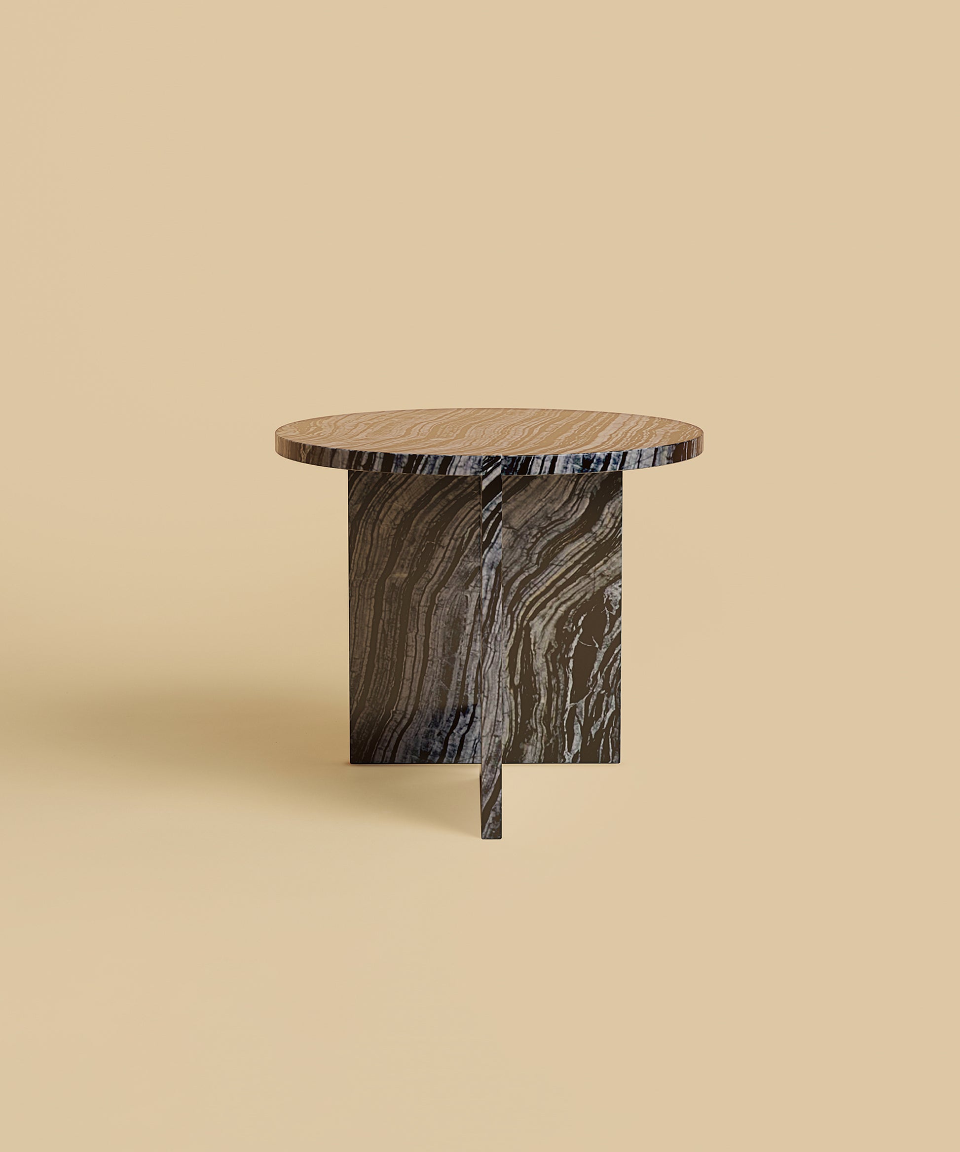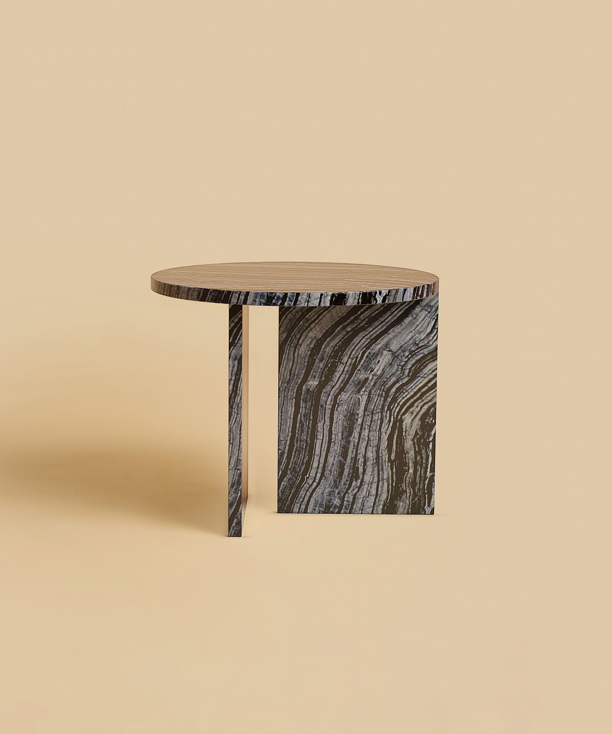 The legs are made from two travertine slabs, two Marble slabs, or, two terrazzo slabs in which one part is interlocked on the top. One part of the leg is interlocked on the top. Carrara terrazzo, a material that is obtained by mixing first-rate grits, is selected by size and color. The top is circular and has a diameter of 17.7 inches.