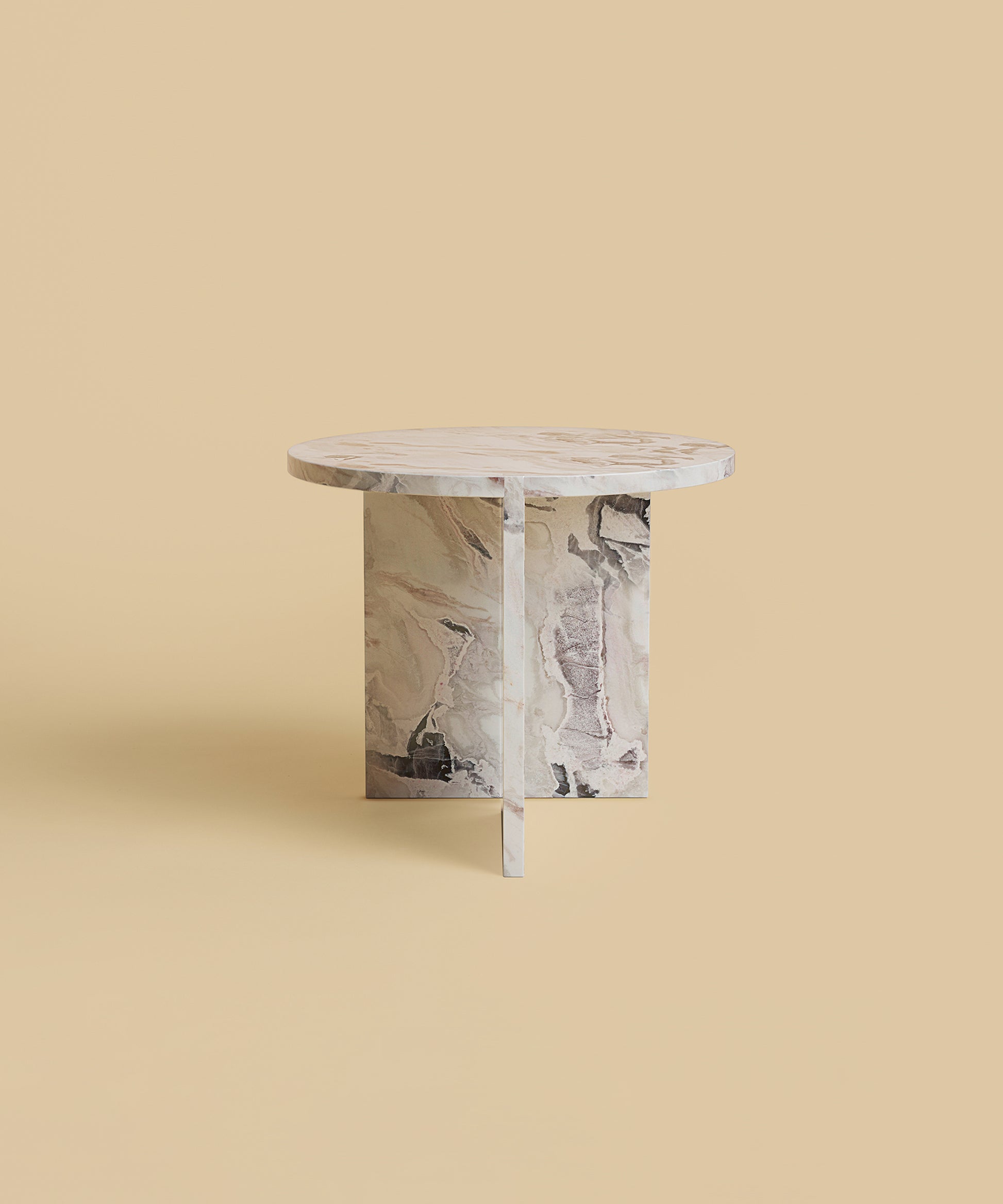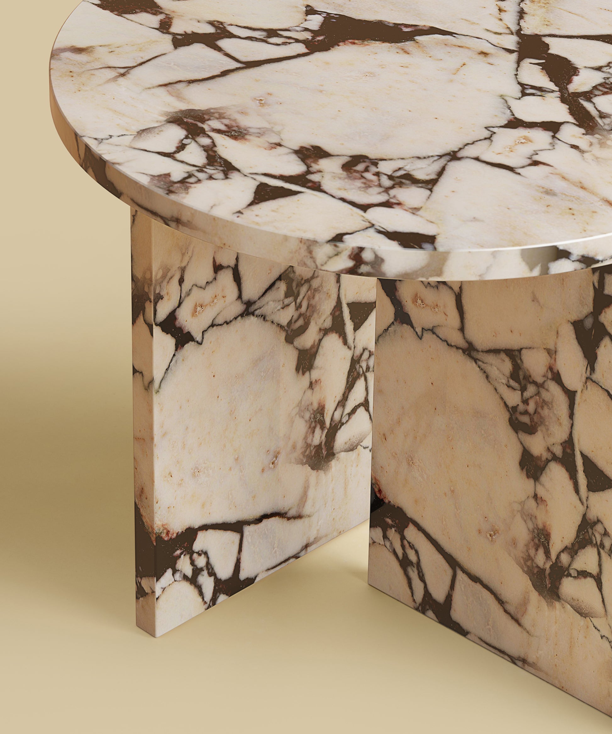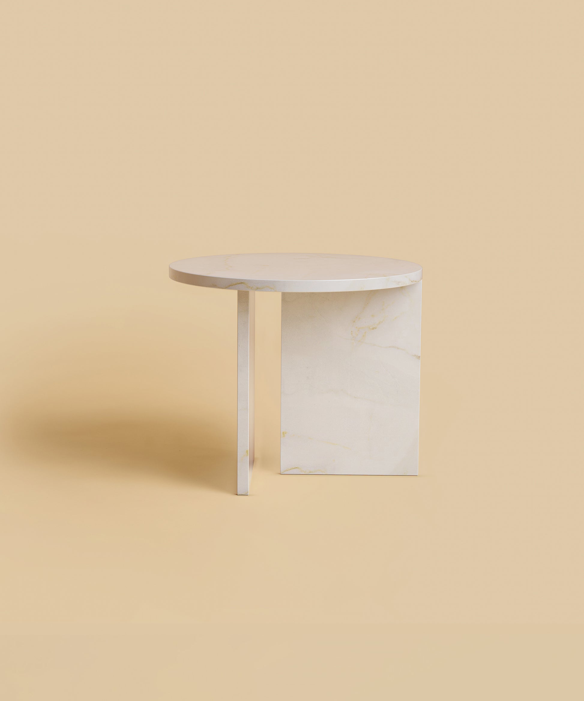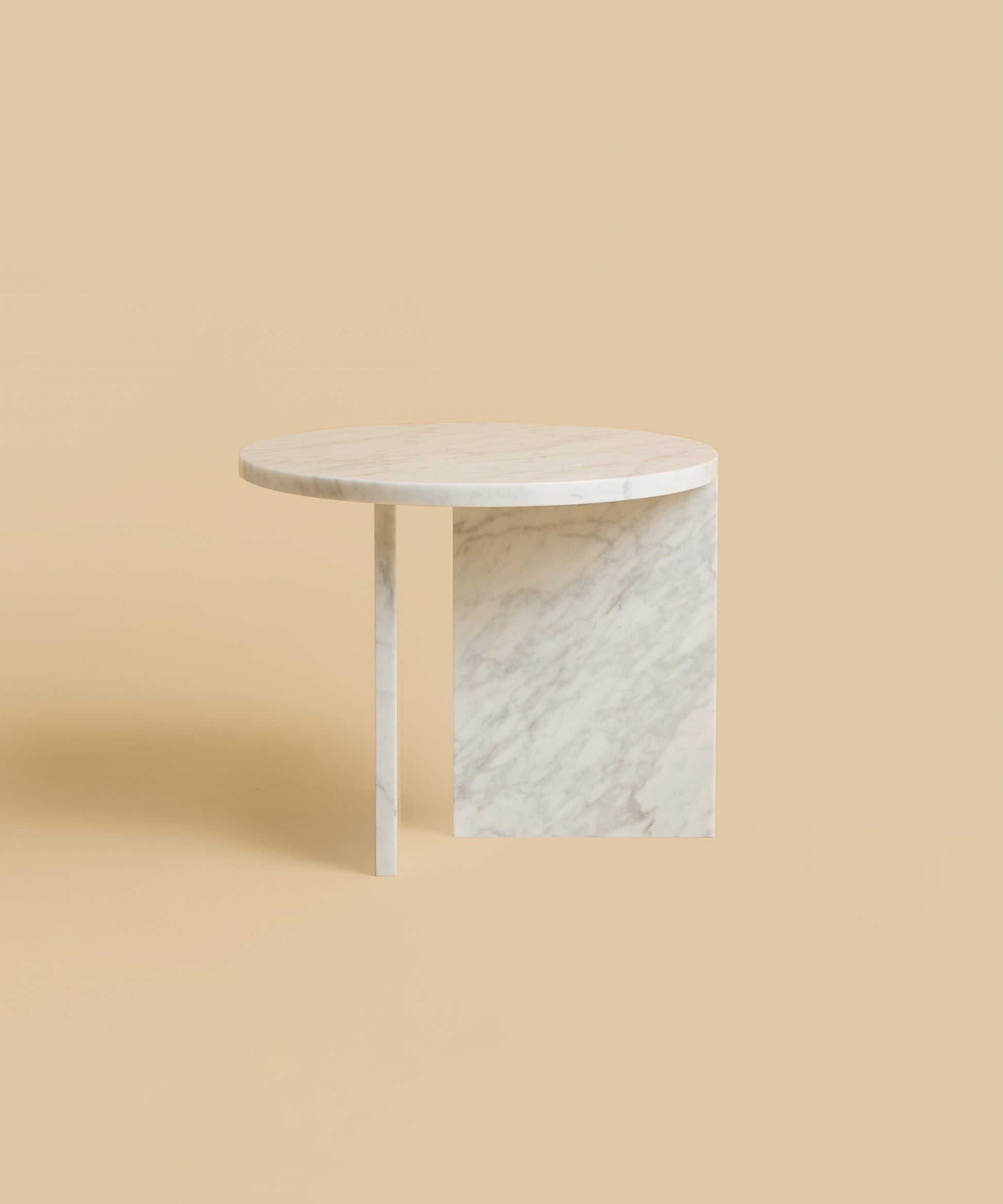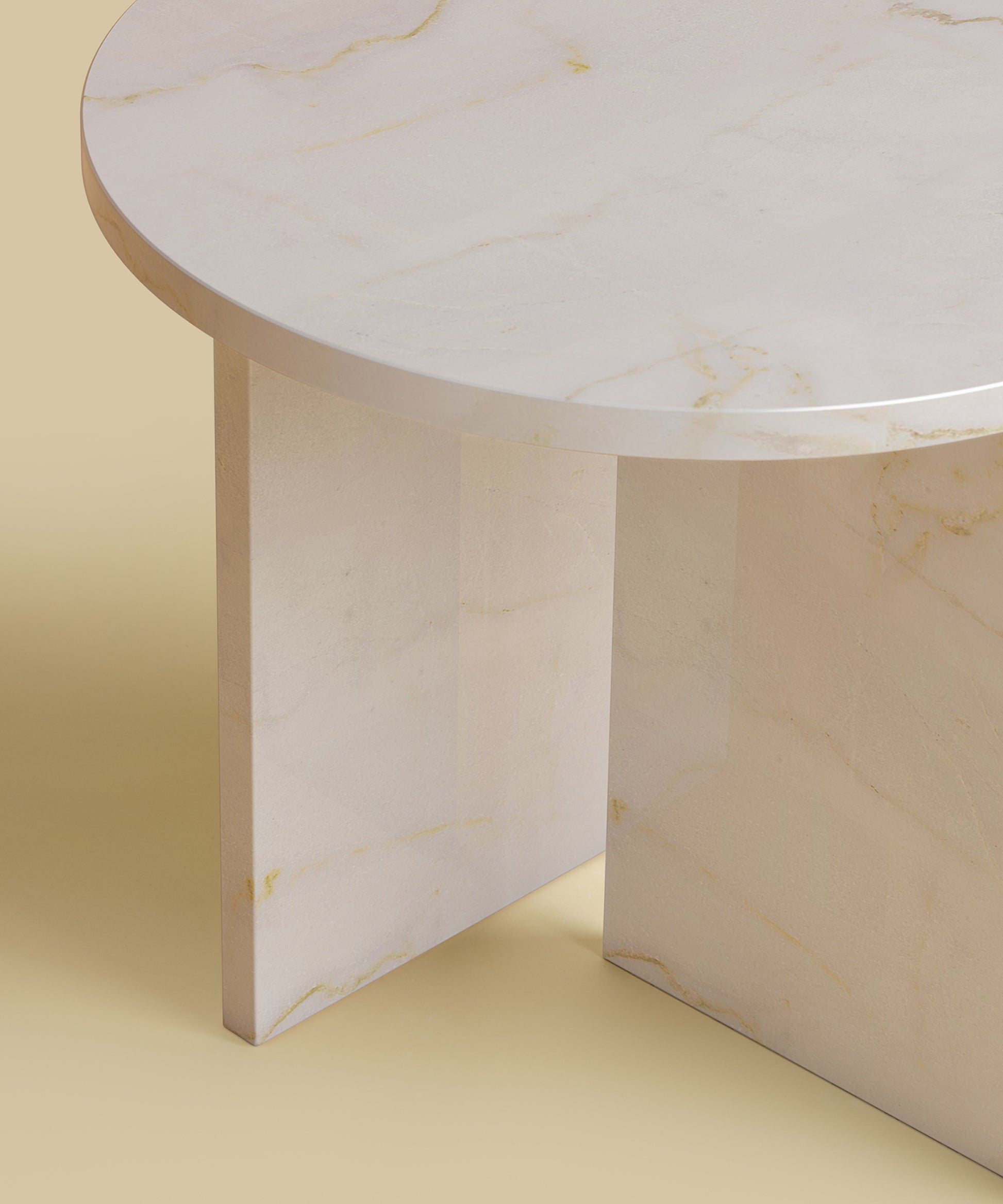 The legs are made from two travertine slabs, two Marble slabs, or, two terrazzo slabs in which one part is interlocked on the top. One part of the leg is interlocked on the top. Carrara terrazzo, a material that is obtained by mixing first-rate grits, is selected by size and color. The top is circular and has a diameter of 17.7 inches.